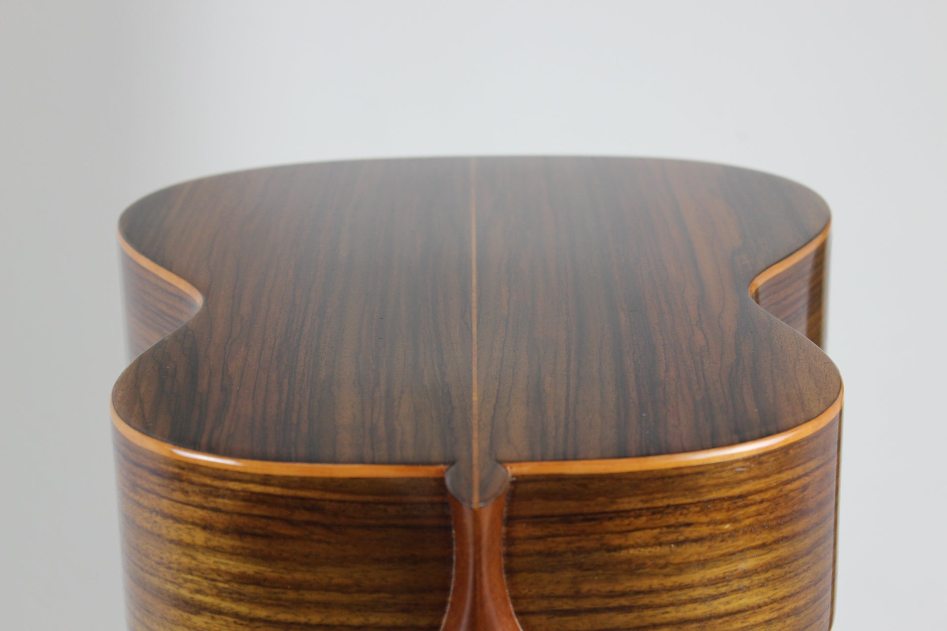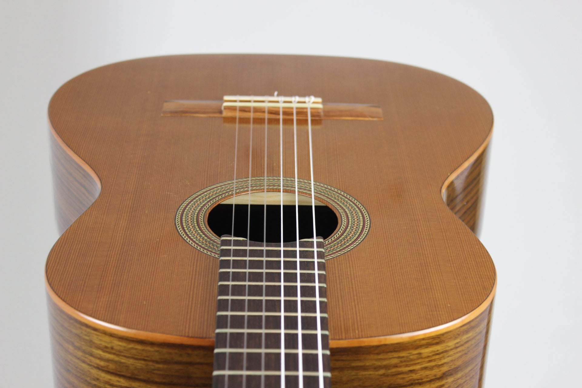 Diese Nicolaus Wollf Gitarre wurde im Jahr 2000 gebaut. Sie ist sehr leicht und kräftig im Klang aber auch gleichzeitig ausgeglichen. Es ist ein sehr gelungenes Instrument und die Bespielbarkeit ist sehr komfortabel. Die Decke ist aus Zeder gefertigt - Boden/Zargen sind aus indischem Palisander. Es sind nur wenige Spielspuren sichtbar und insgesamt befindet sich das Instrument in einem sehr guten Zustand. Die Mechaniken sind von Gotoh und ein Hartschalenkoffer ist inklusive.