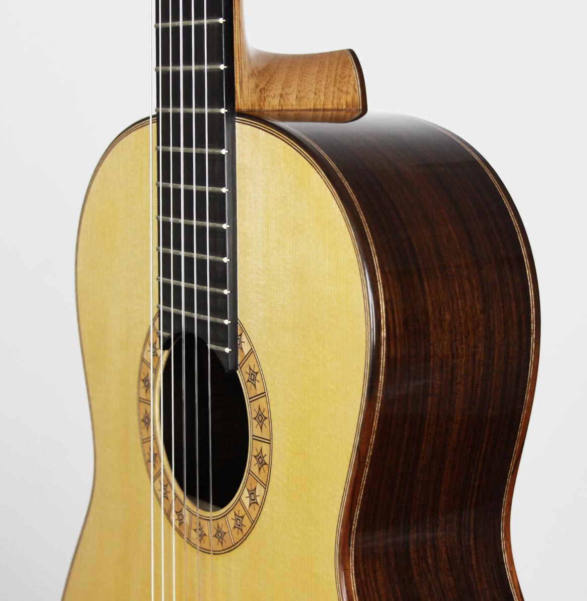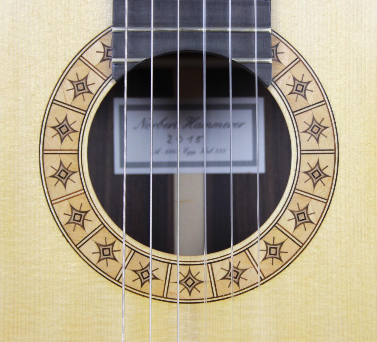 Norbert Hammerer, am 1.4.1957 in Egg (Österreich) geboren, ist eigentlich selbstständiger Tischlermeister und begann um 1990 seine ersten Gitarren zu bauen. Damals noch im Stile Walter Vogts. Anfänglich baute Norbert Hammerer für sich selbst Gitarren zu bauen. Als er schließlich im Jahr 2005 Karl-Heinz Römmich kennenlernte, wieß dieser ihn in den spanischen Gitarrenbau ein. Seit dieser Zeit baut Norbert Hammerer ausschließlich Gitarren ganz in der spanischen Tradition. Die Gitarre hat eine Fichtendecke und der Boden sowie die Zargen sind aus indischem Palisander. Das Griffbrett ist leicht gewölbt und erleichtert dadurch die Bespielbarkeit. Veredelt wurde die Gitarre mit eine Rubin Schellack Handpolitur. Die Mechaniken sind von Alessi.