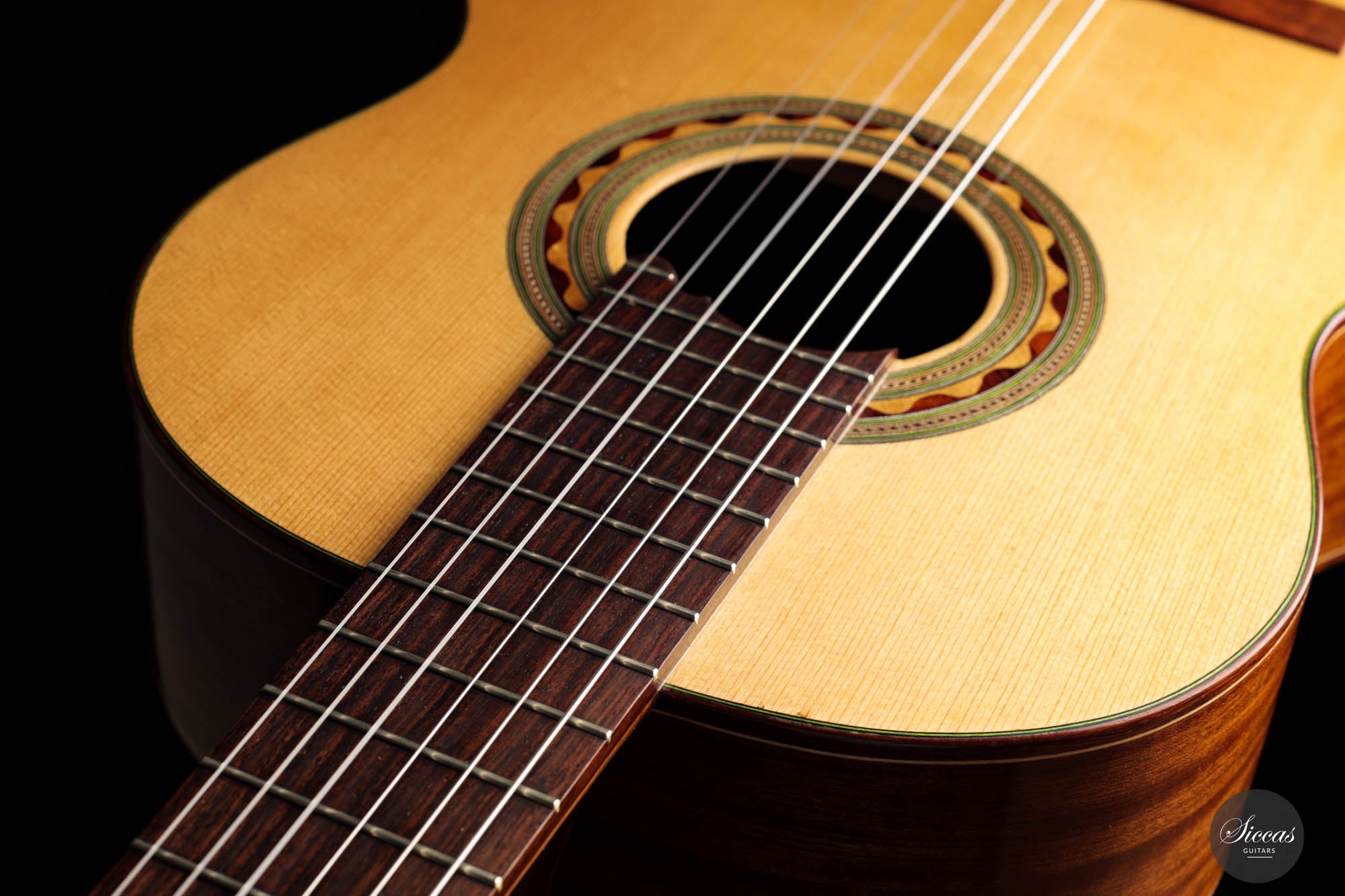 This particular guitar features a spruce top, a material esteemed in the world of guitar-making for its ability to produce bright and dynamic tonal colors. The back and sides of this instrument are lovingly crafted from breathtaking ovangkol, contributing substantially to the unique, creamy, and velvety sound characteristics of the guitar. The beautiful interplay of spruce and ovangkol results in a concert instrument that plays as beautifully as it looks.