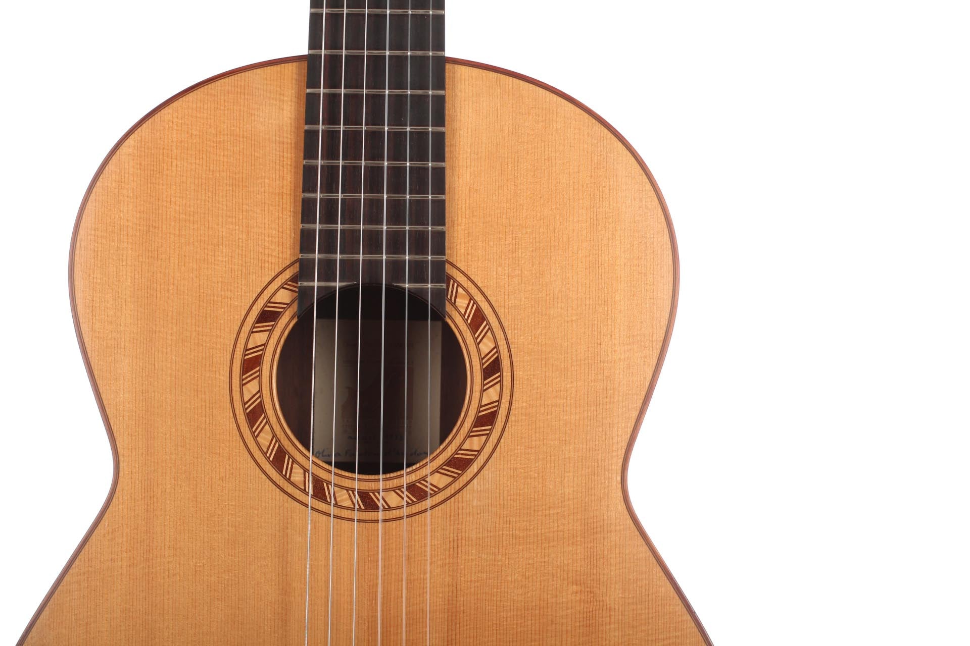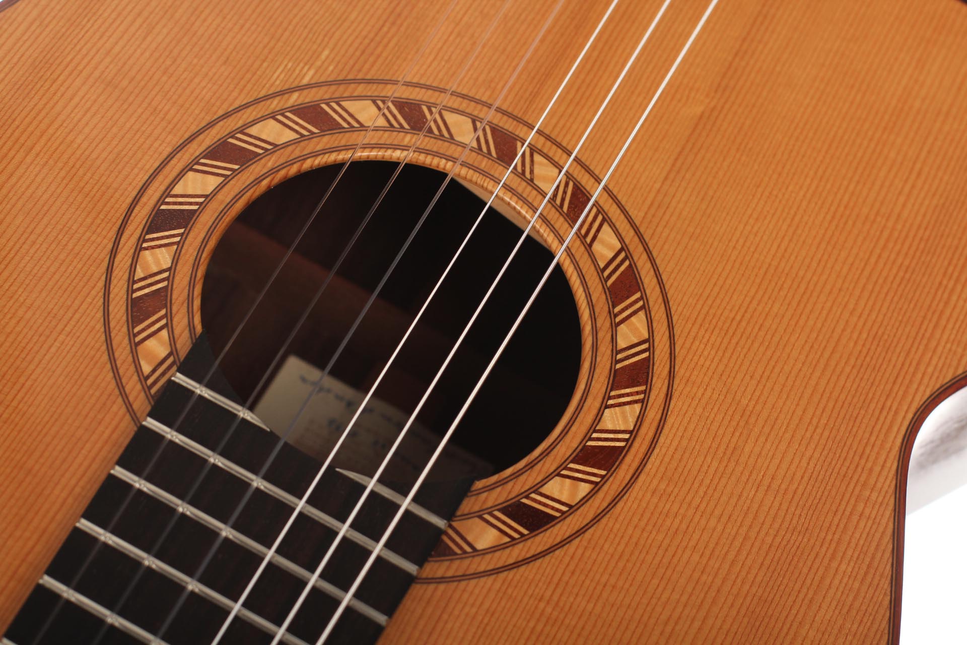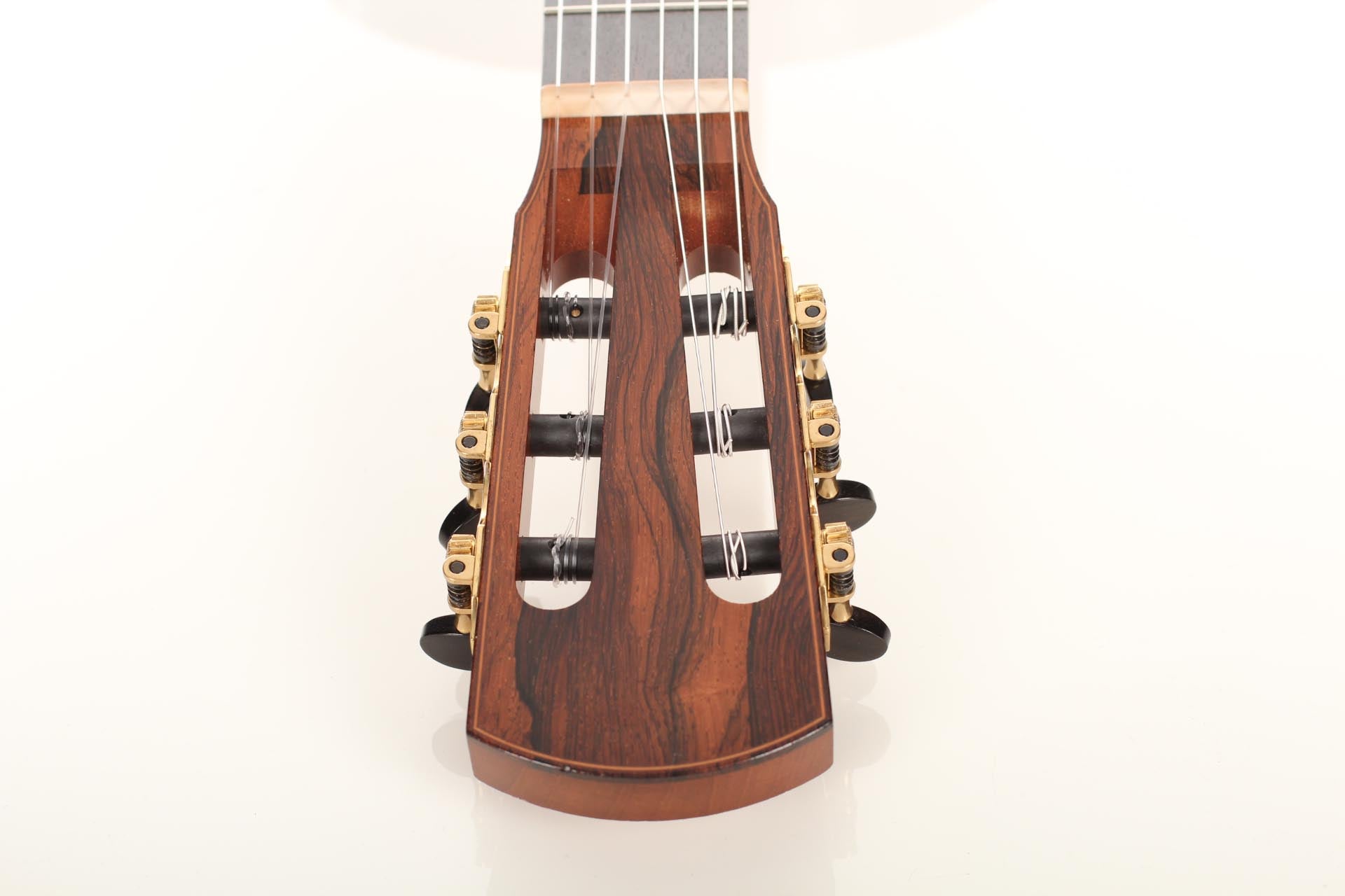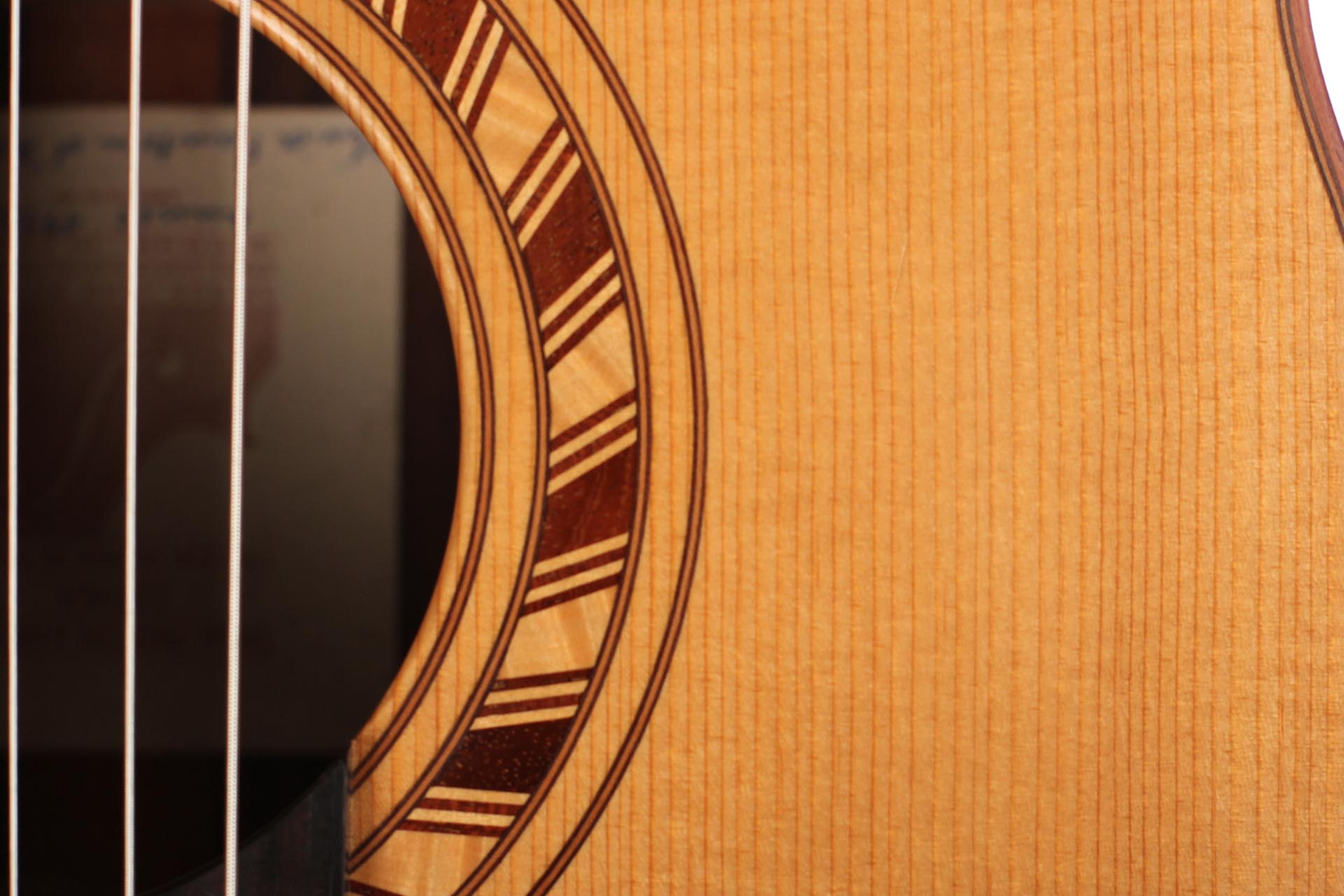 This guitar from 1998 has a modern appearance regarding the two-colored rosette and the form of the headstock. The arched top is made of spruce, back and side are Indian Rosewood. The binding, the headstock and the tuning pegs are especially beautiful. The sound is balanced with concise trebles and pleasantly warm mids and basses. The instrument shows signs of playing and spots of abrasion in the finish. The high-quality tuners are made by Rubner. A hard-shell case is included.