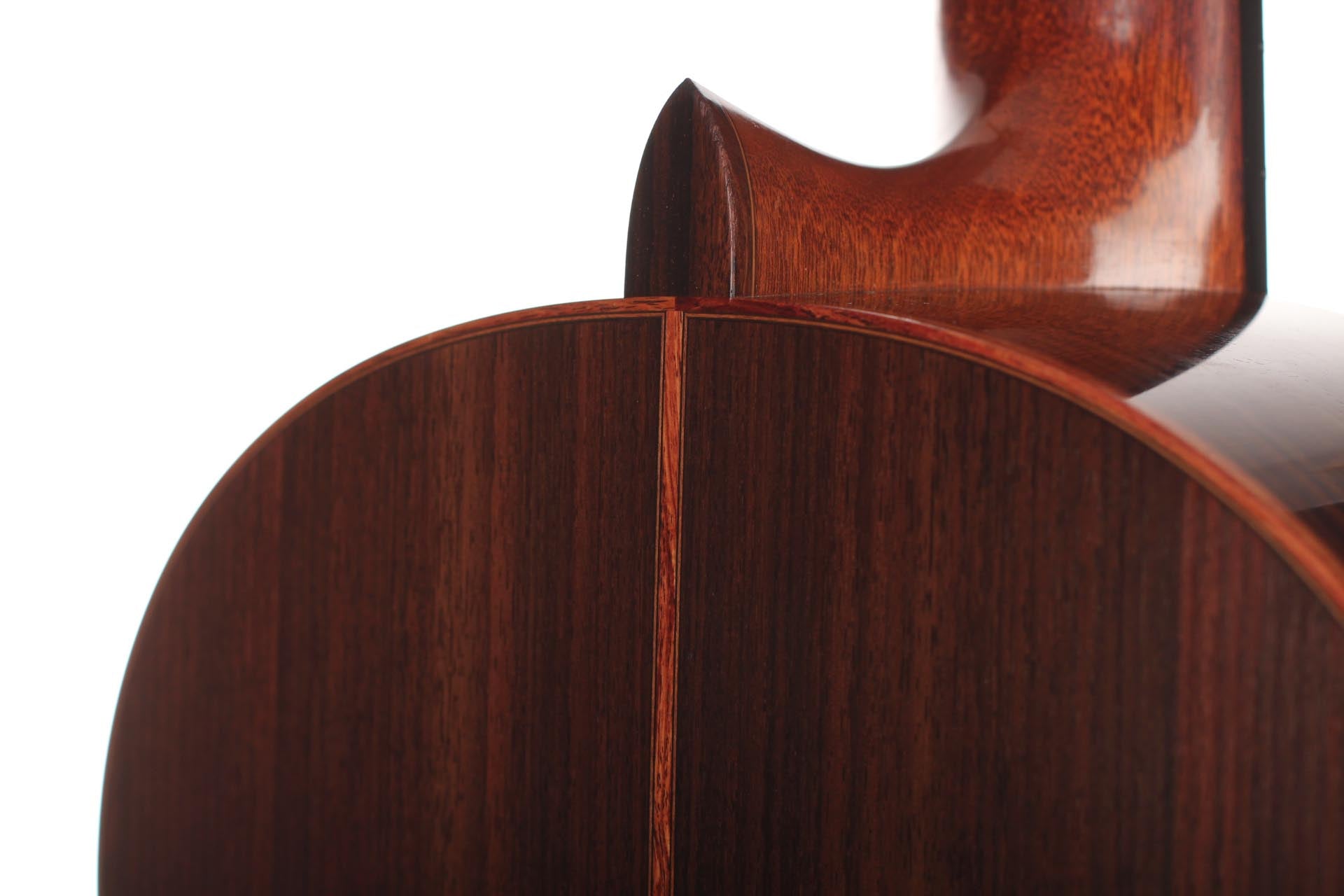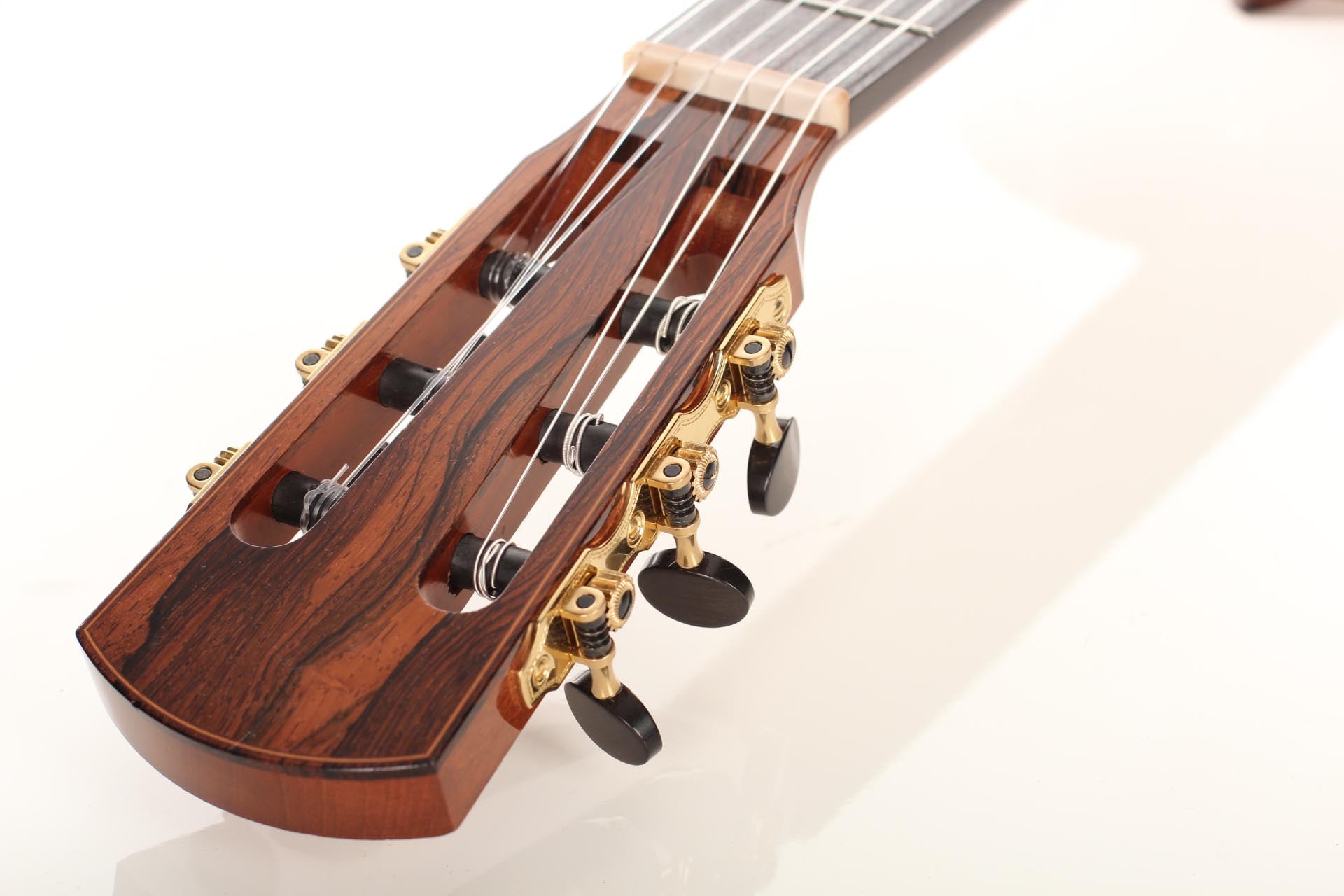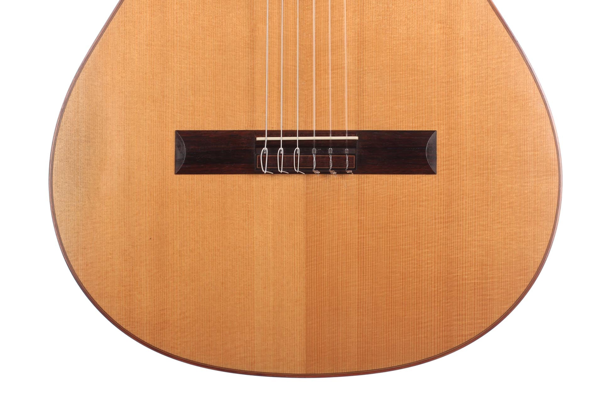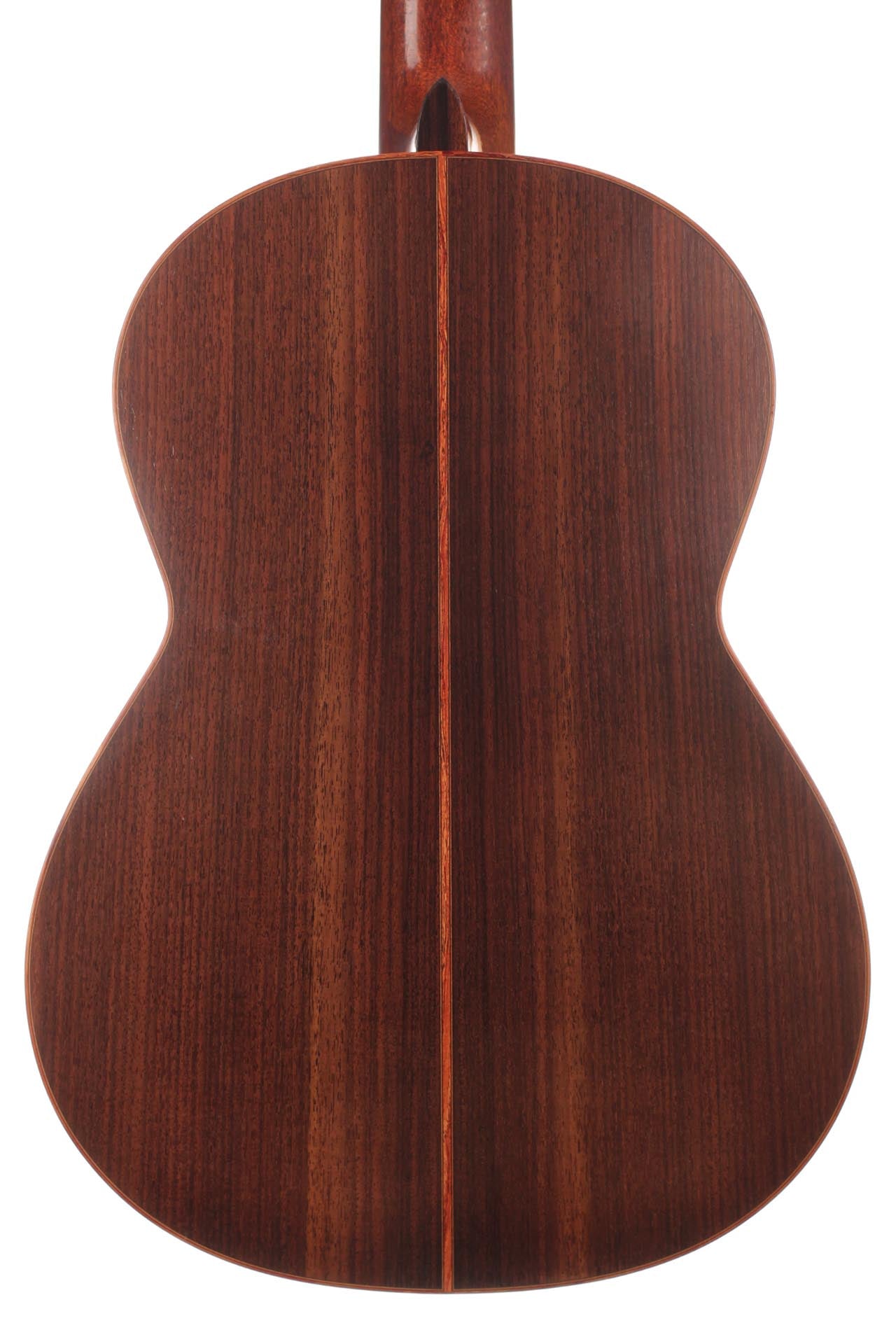 This guitar from 1998 has a modern appearance regarding the two-colored rosette and the form of the headstock. The arched top is made of spruce, back and side are Indian Rosewood. The binding, the headstock and the tuning pegs are especially beautiful. The sound is balanced with concise trebles and pleasantly warm mids and basses. The instrument shows signs of playing and spots of abrasion in the finish. The high-quality tuners are made by Rubner. A hard-shell case is included.