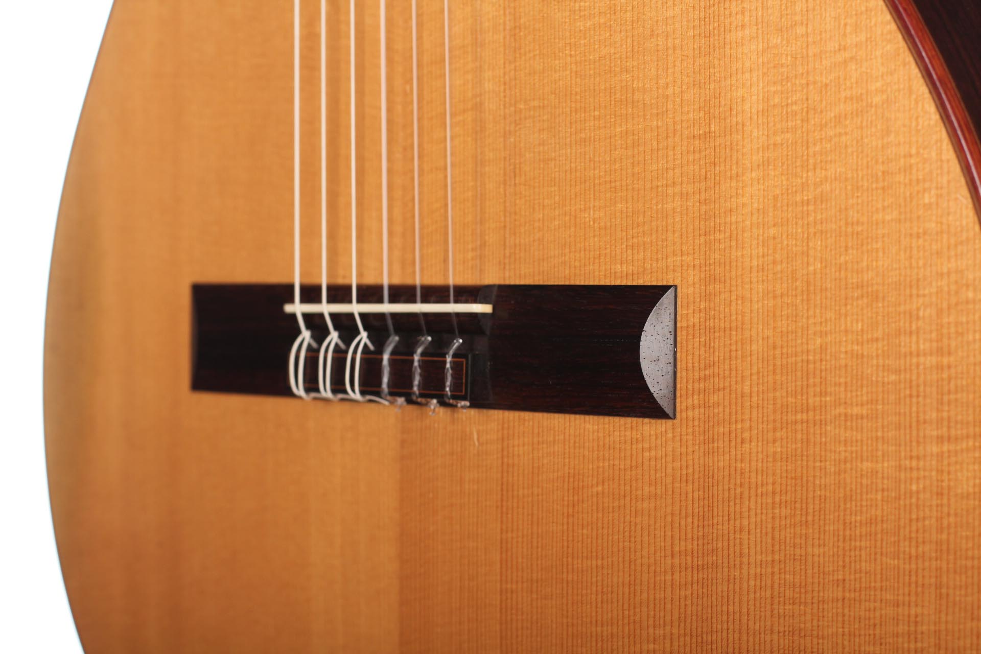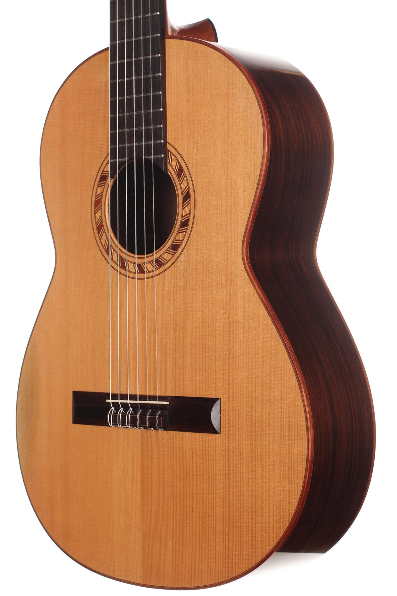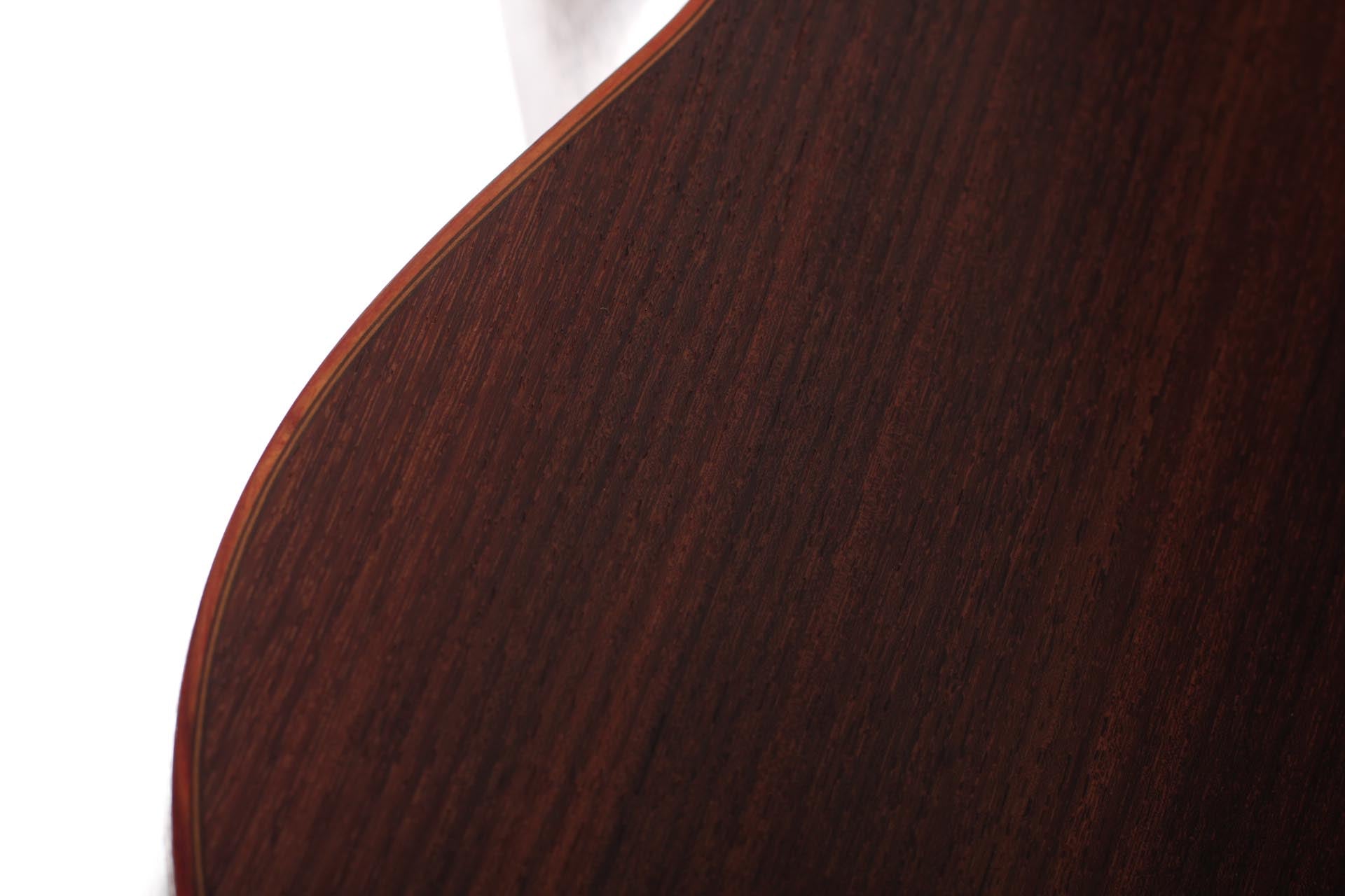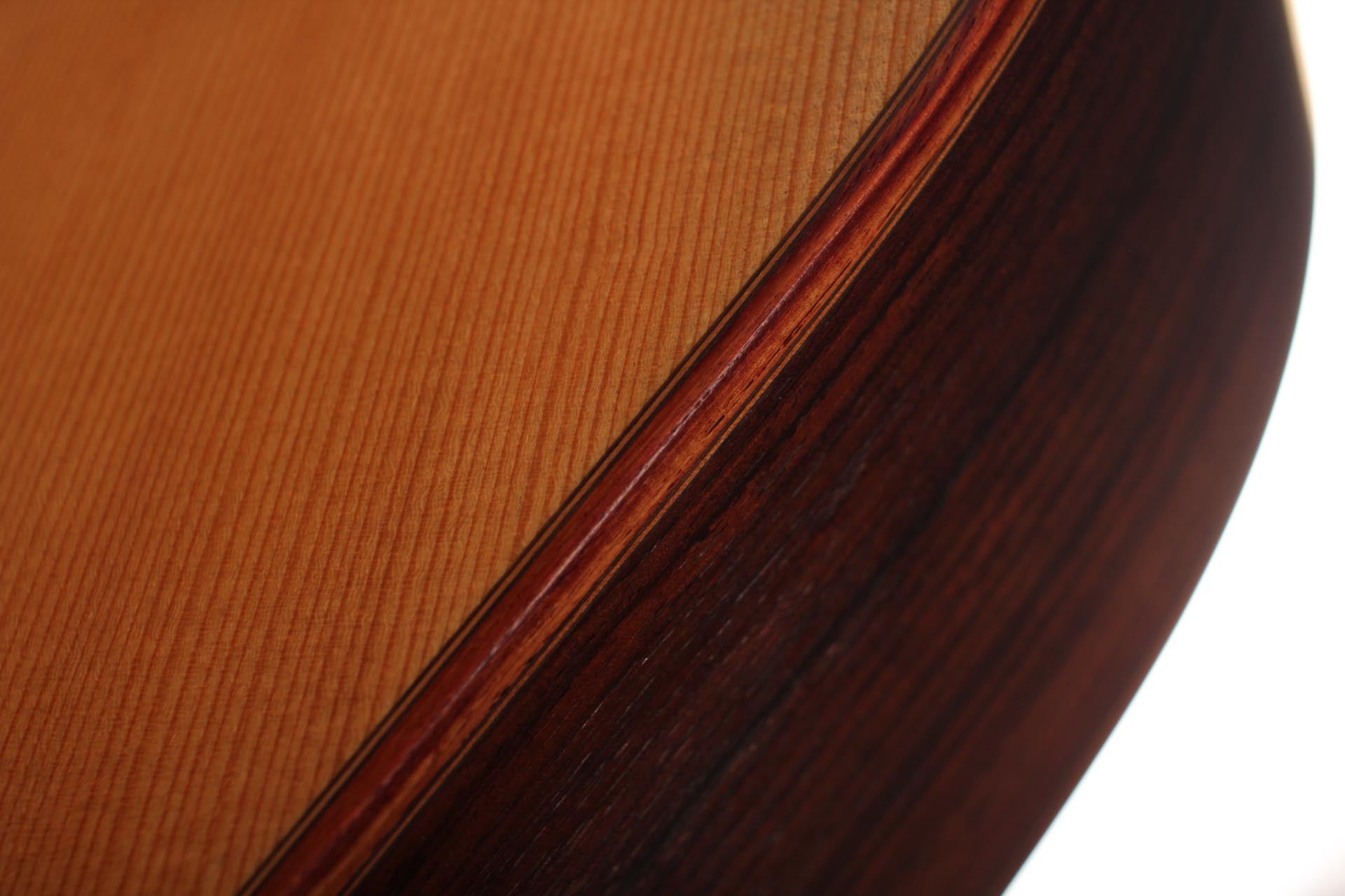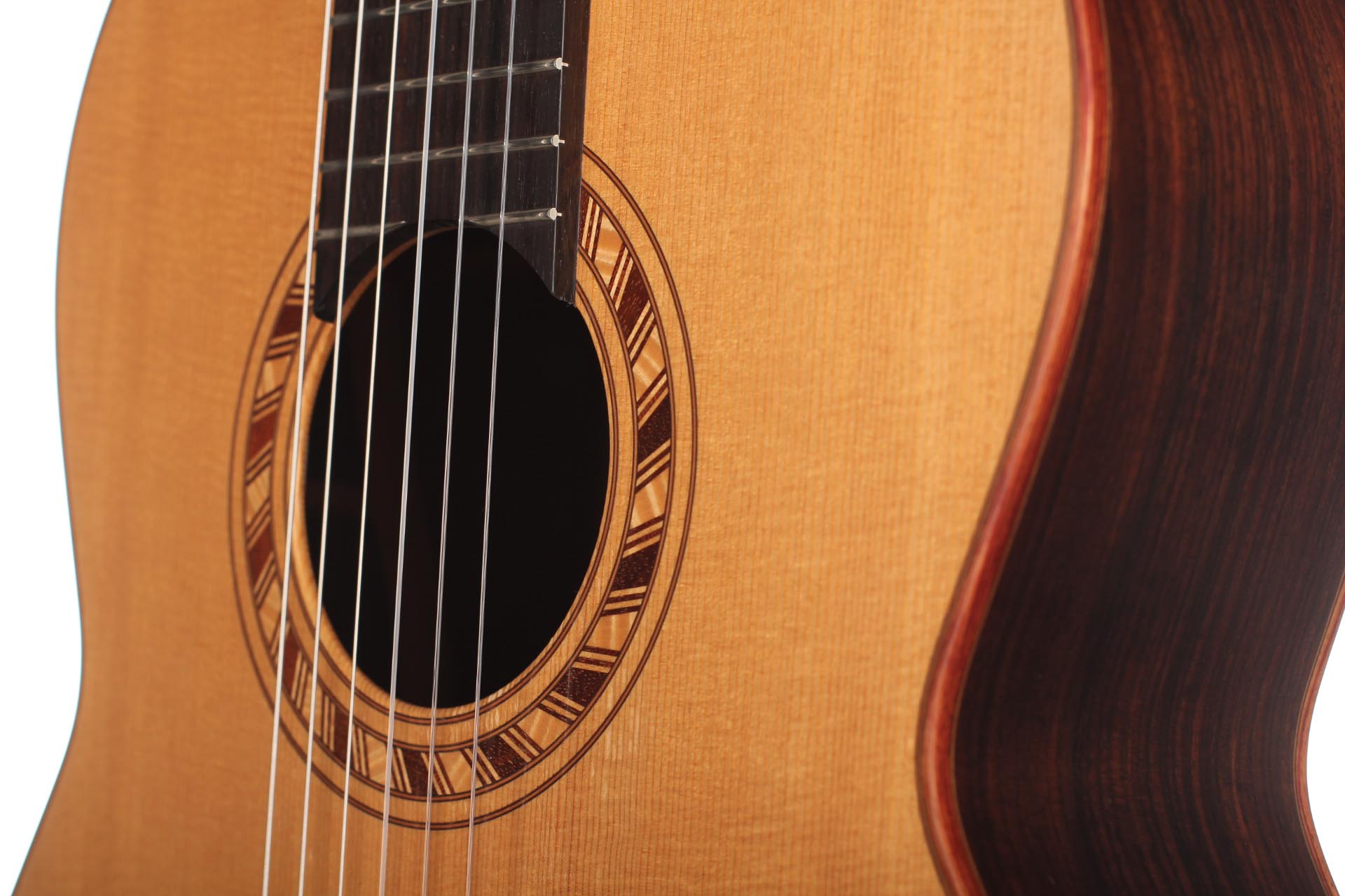 This guitar from 1998 has a modern appearance regarding the two-colored rosette and the form of the headstock. The arched top is made of spruce, back and side are Indian Rosewood. The binding, the headstock and the tuning pegs are especially beautiful. The sound is balanced with concise trebles and pleasantly warm mids and basses. The instrument shows signs of playing and spots of abrasion in the finish. The high-quality tuners are made by Rubner. A hard-shell case is included.