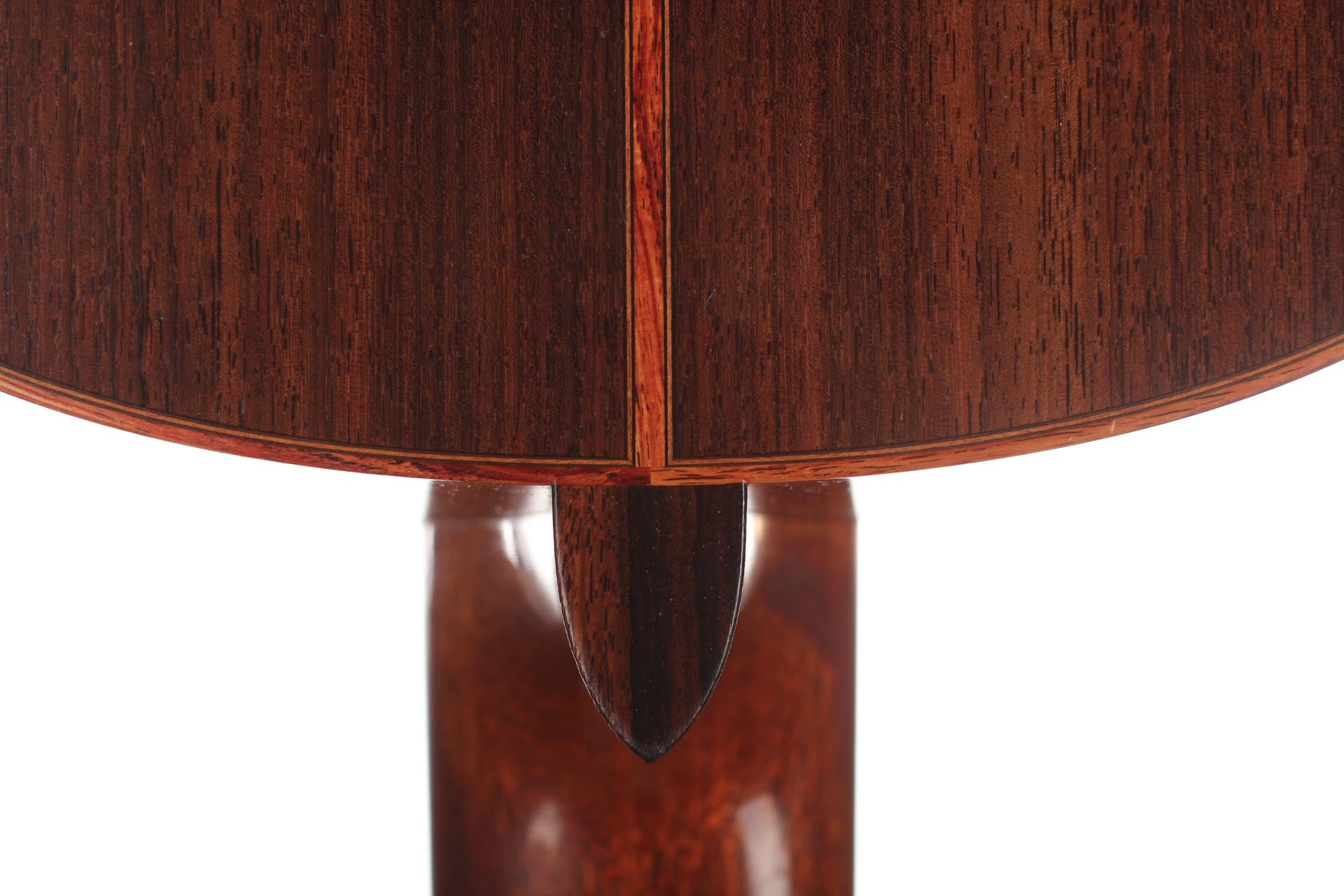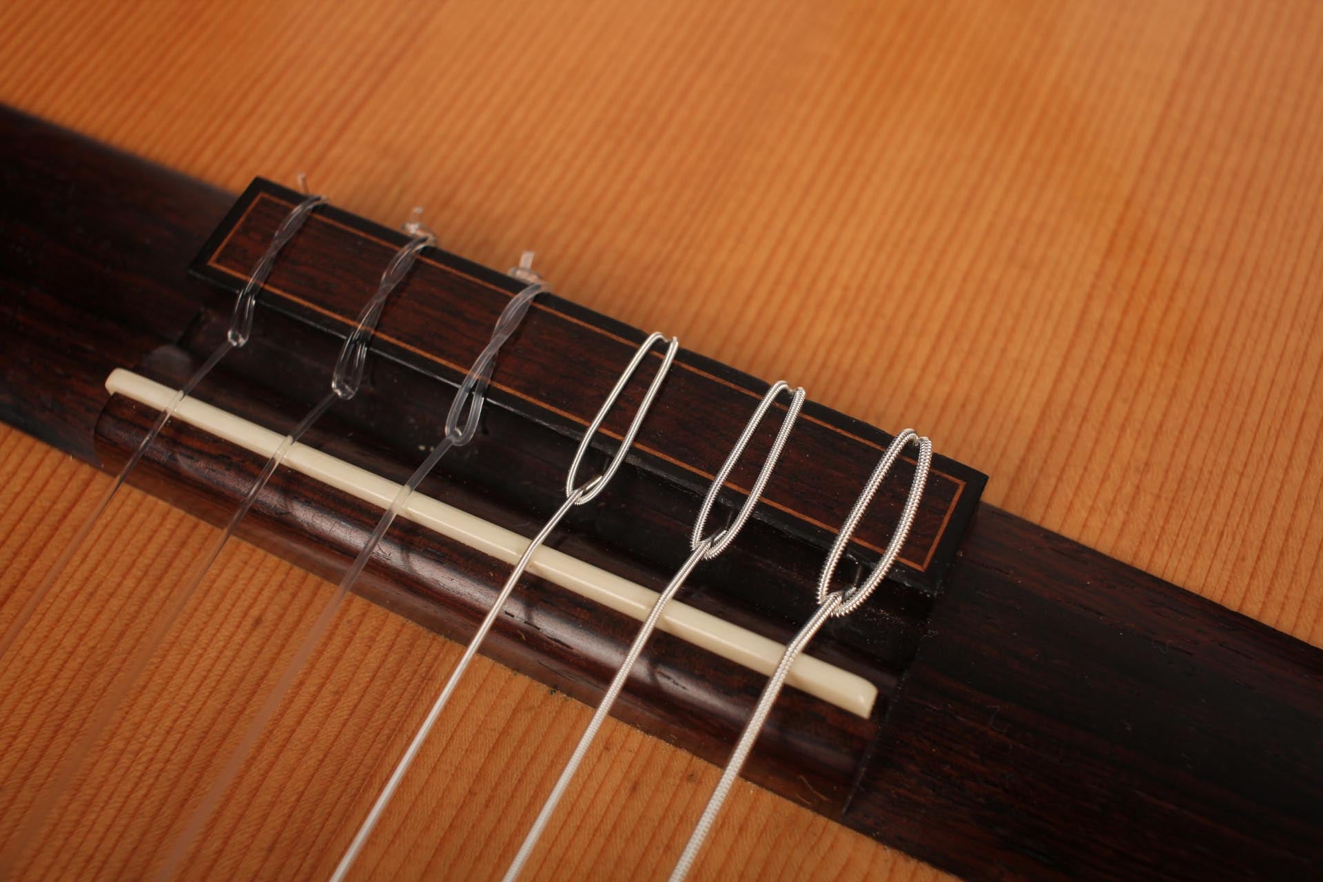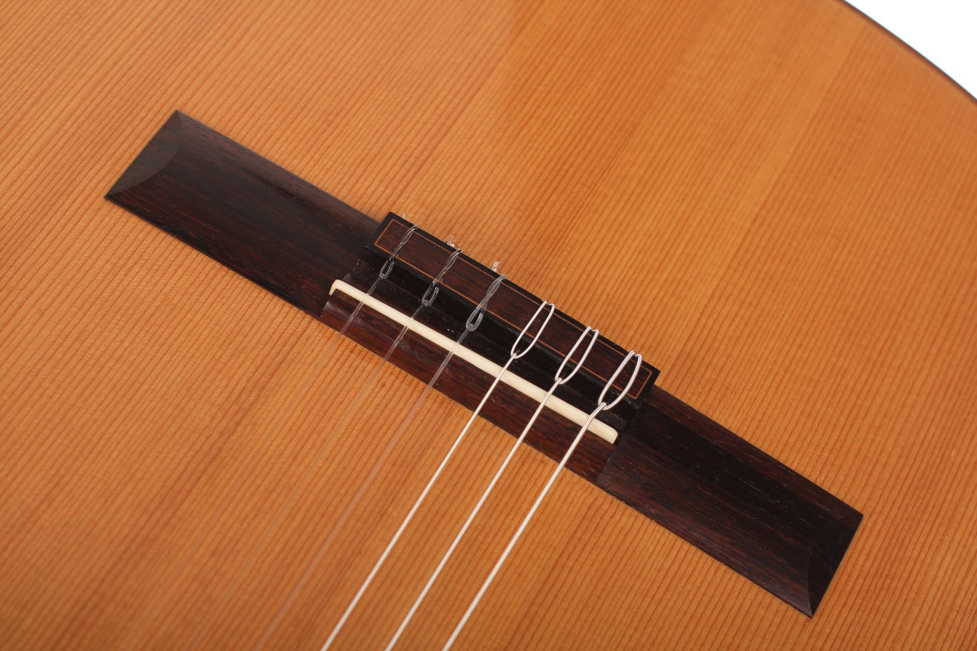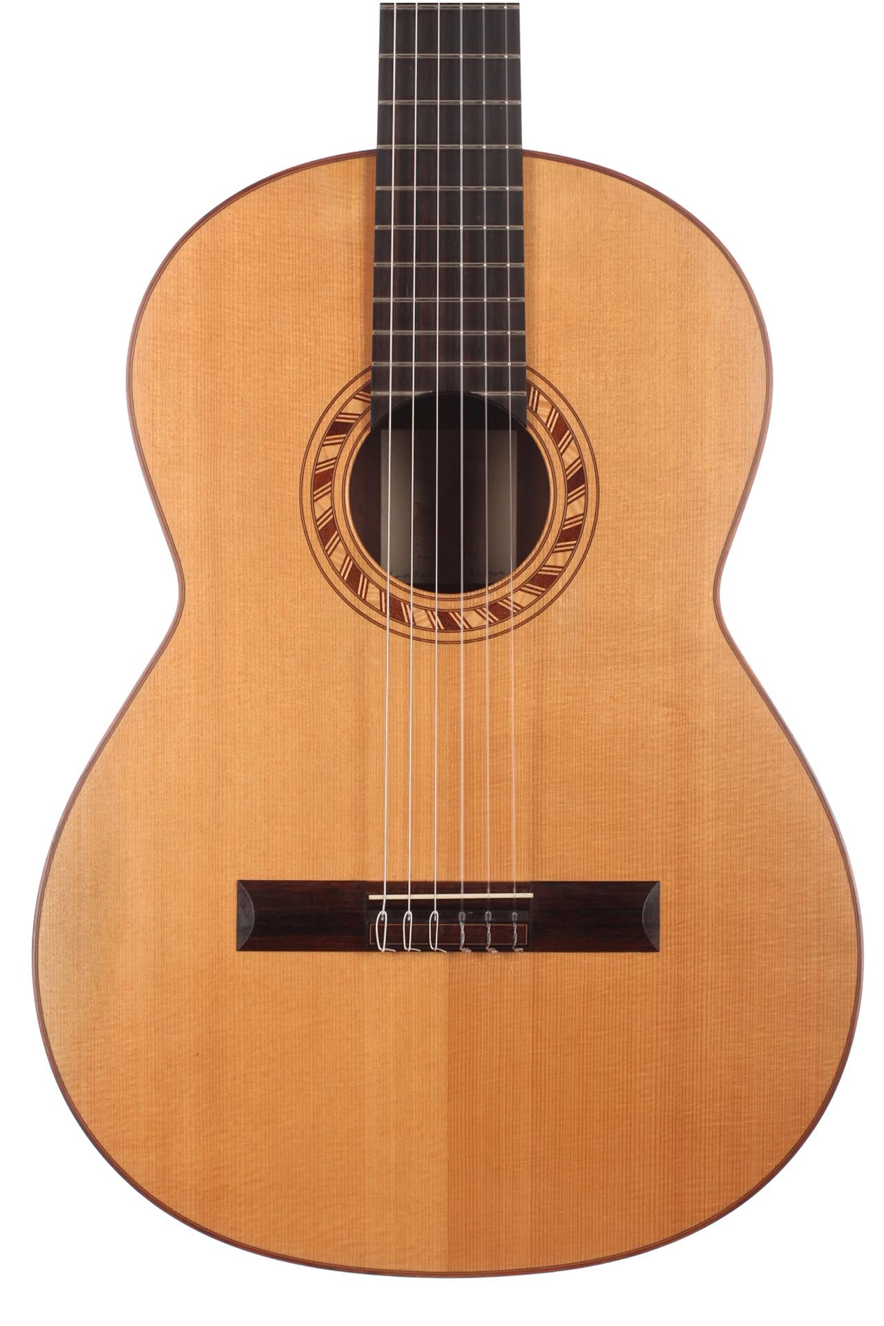 This guitar from 1998 has a modern appearance regarding the two-colored rosette and the form of the headstock. The arched top is made of spruce, back and side are Indian Rosewood. The binding, the headstock and the tuning pegs are especially beautiful. The sound is balanced with concise trebles and pleasantly warm mids and basses. The instrument shows signs of playing and spots of abrasion in the finish. The high-quality tuners are made by Rubner. A hard-shell case is included.