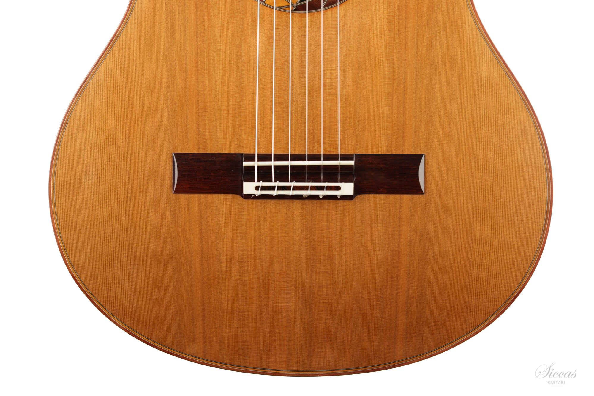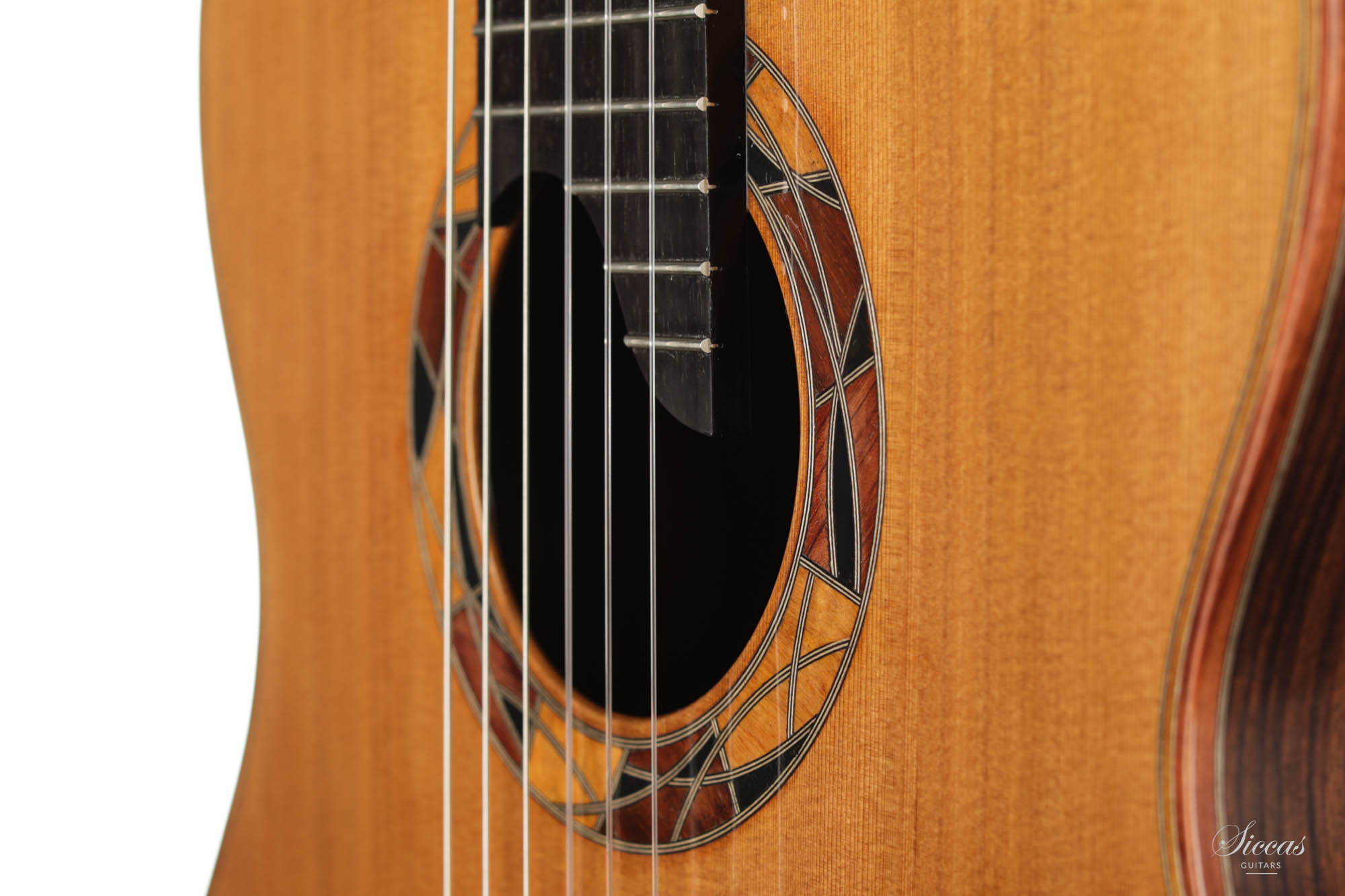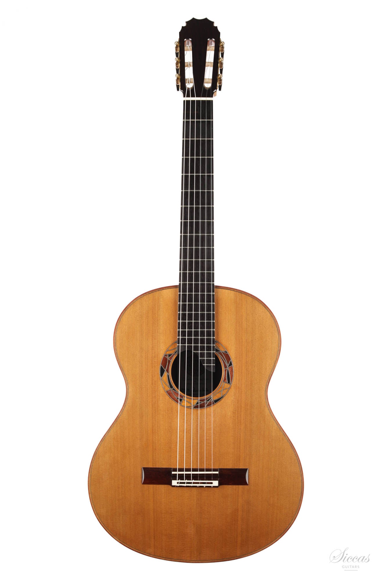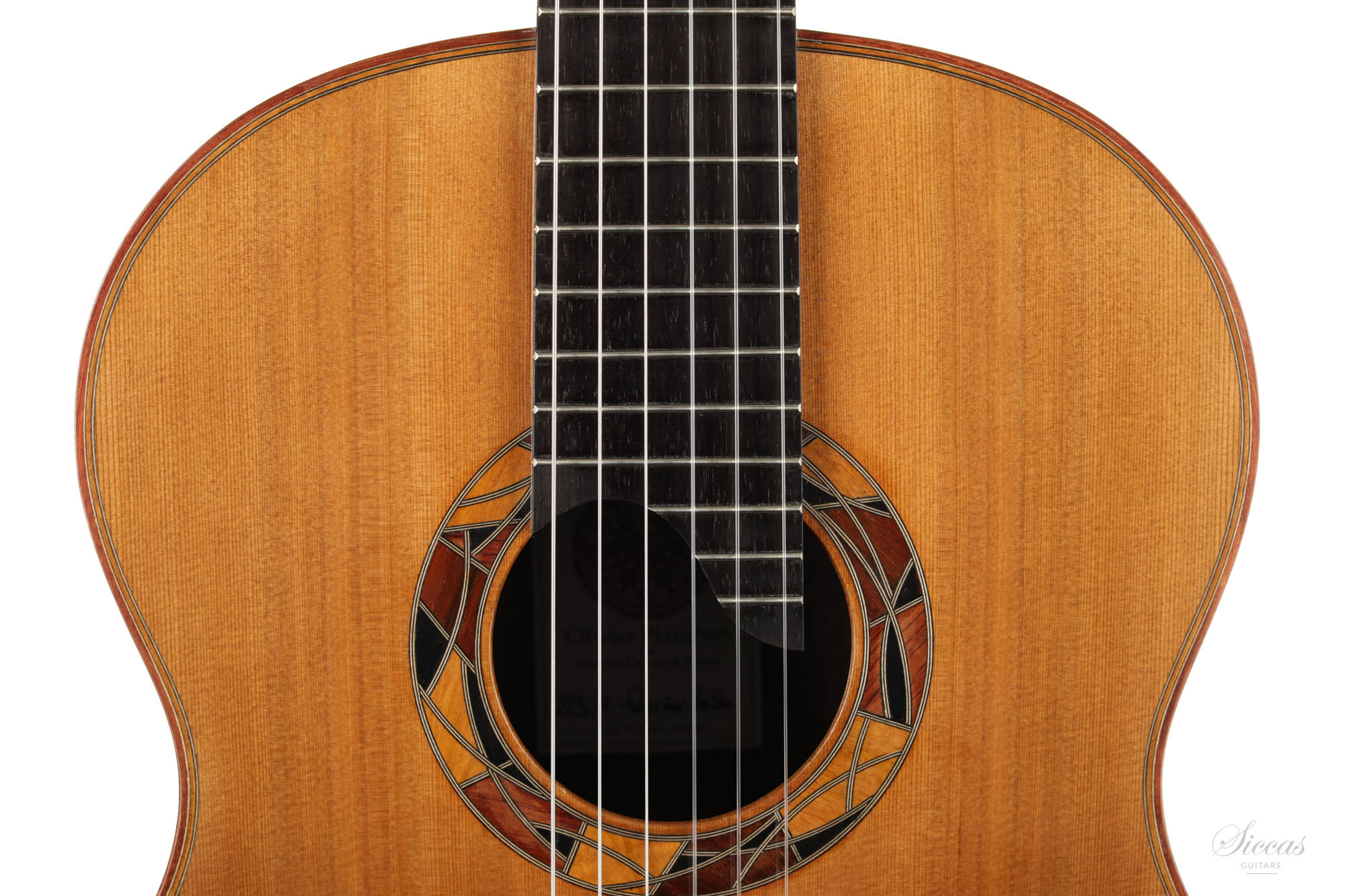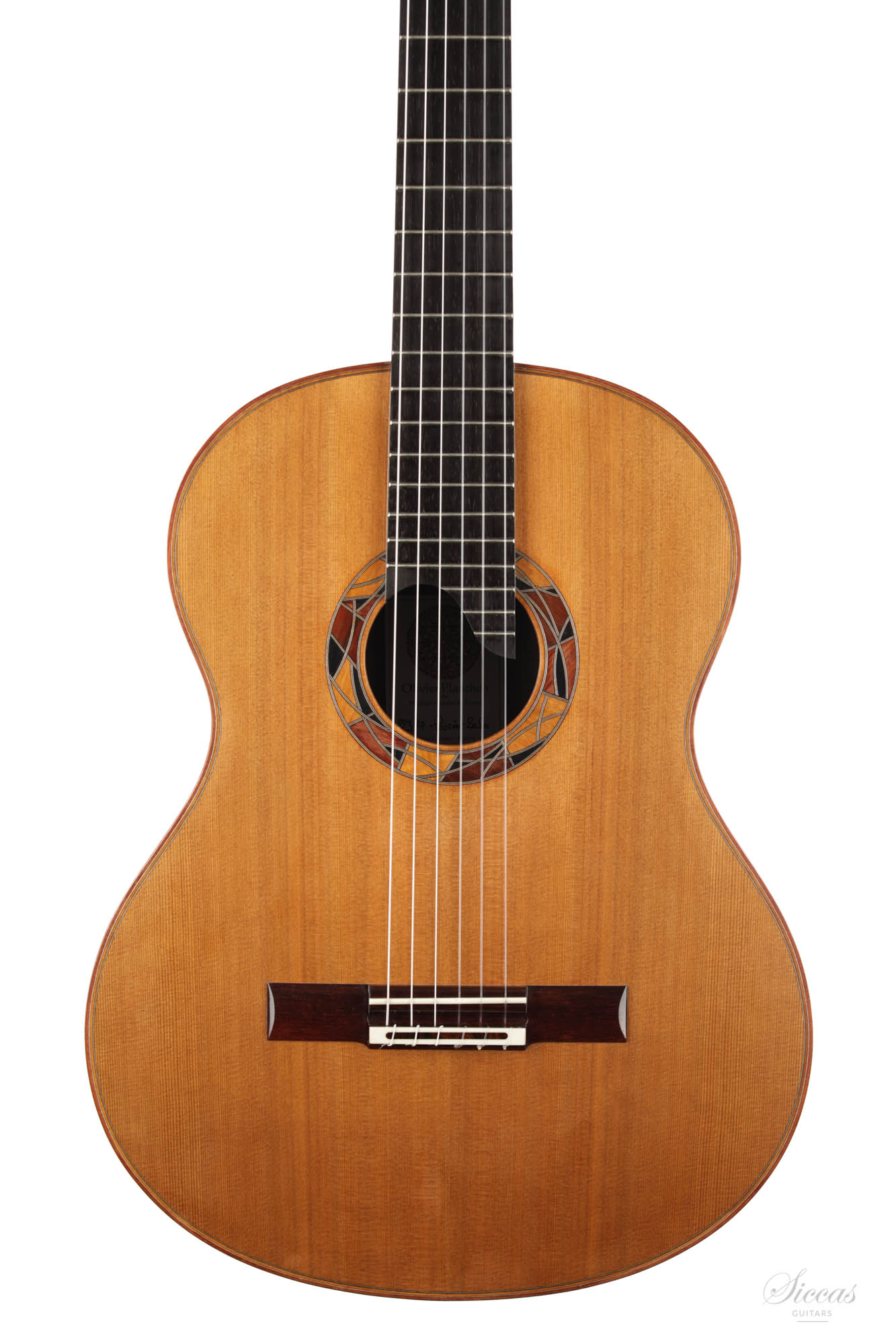 Diese Gitarre ist eine Schönheit mit einem einzigartigen Design. Die eingelegte Rosette wurde von Olivier Planchon zum Zeitpunkt des Baus vollständig improvisiert und ist daher bei jeder Gitarre unterschiedlich. Dies ist Oliviers großes Konzertmodell mit einer einzigartigen traditionellen Verstrebung, die tief in der französischen Tradition verwurzelt ist. Dieses Zederndeckenmodell hat einen vollen und runden Klang mit großem Charakter und beeindruckendem Sustain. Die Bespielbarkeit ist ausgezeichnet, und sie besitzt alle Eigenschaften, die eine große Konzertgitarre ausmachen.
