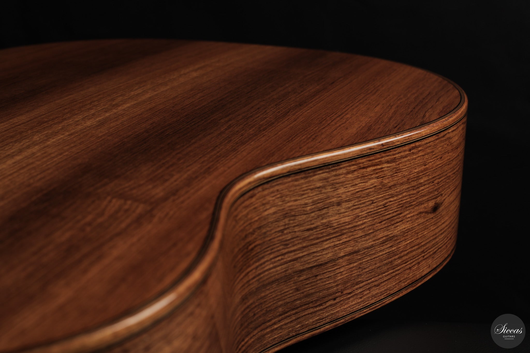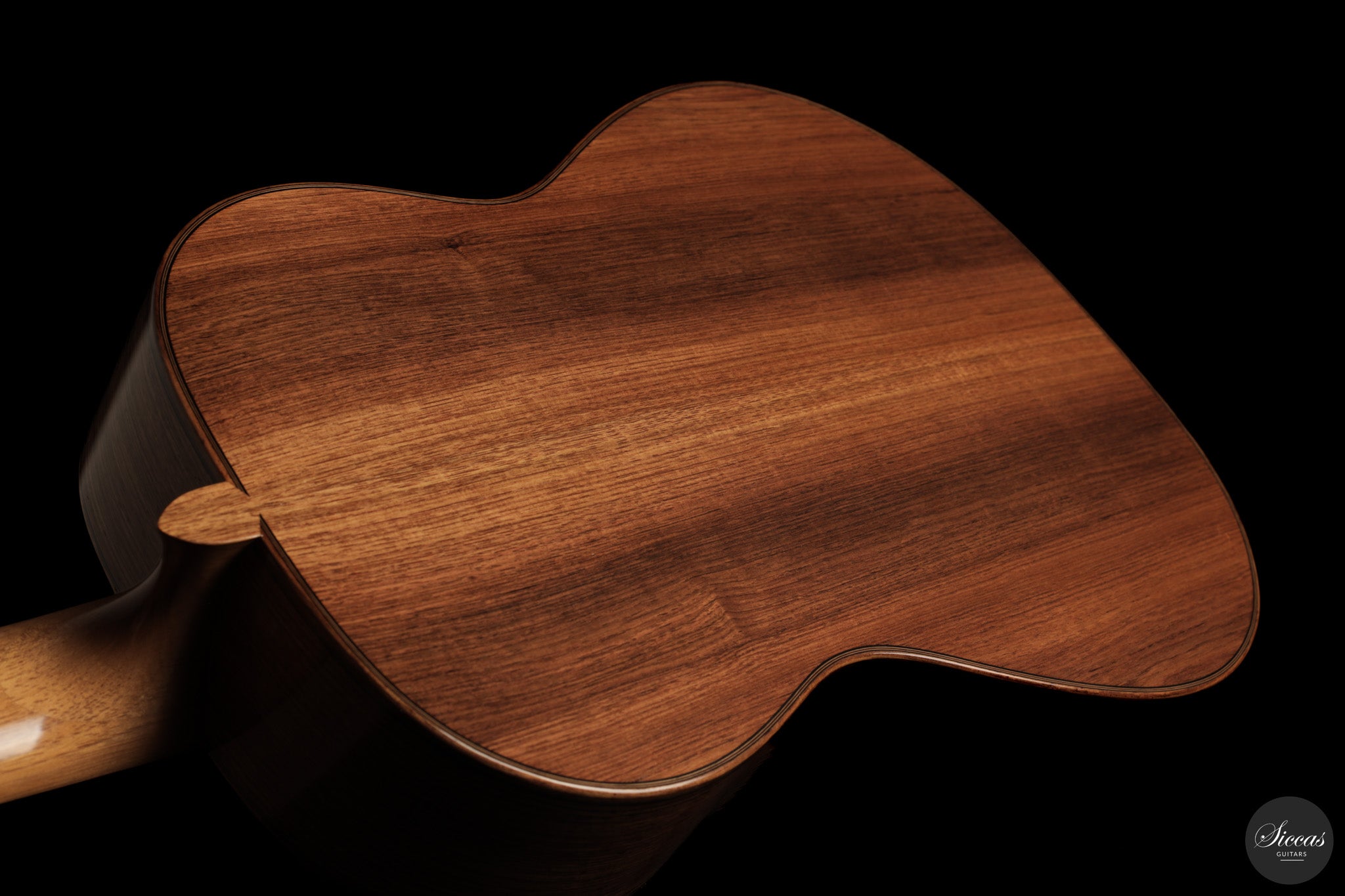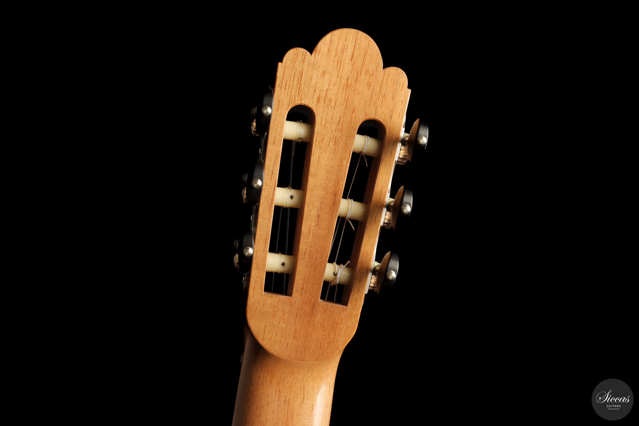Die Gitarre besitzt eine luftige und offene Stimme mit klar wahrnehmbarer Resonanz und leichter Ansprache unter der rechten Hand. Ihre Eigenresonanz um F bis Fis unterstützt ein tiefes und flexibles Bassregister, während die Fichtendecke dem Klang Definition, Transparenz und eine lebendige Ansprache verleiht. Trotz dieser Klarheit bleibt die erste Saite weich und singend und vermeidet jene übermäßige Helligkeit, die bei Fichteninstrumenten gelegentlich auftreten kann.