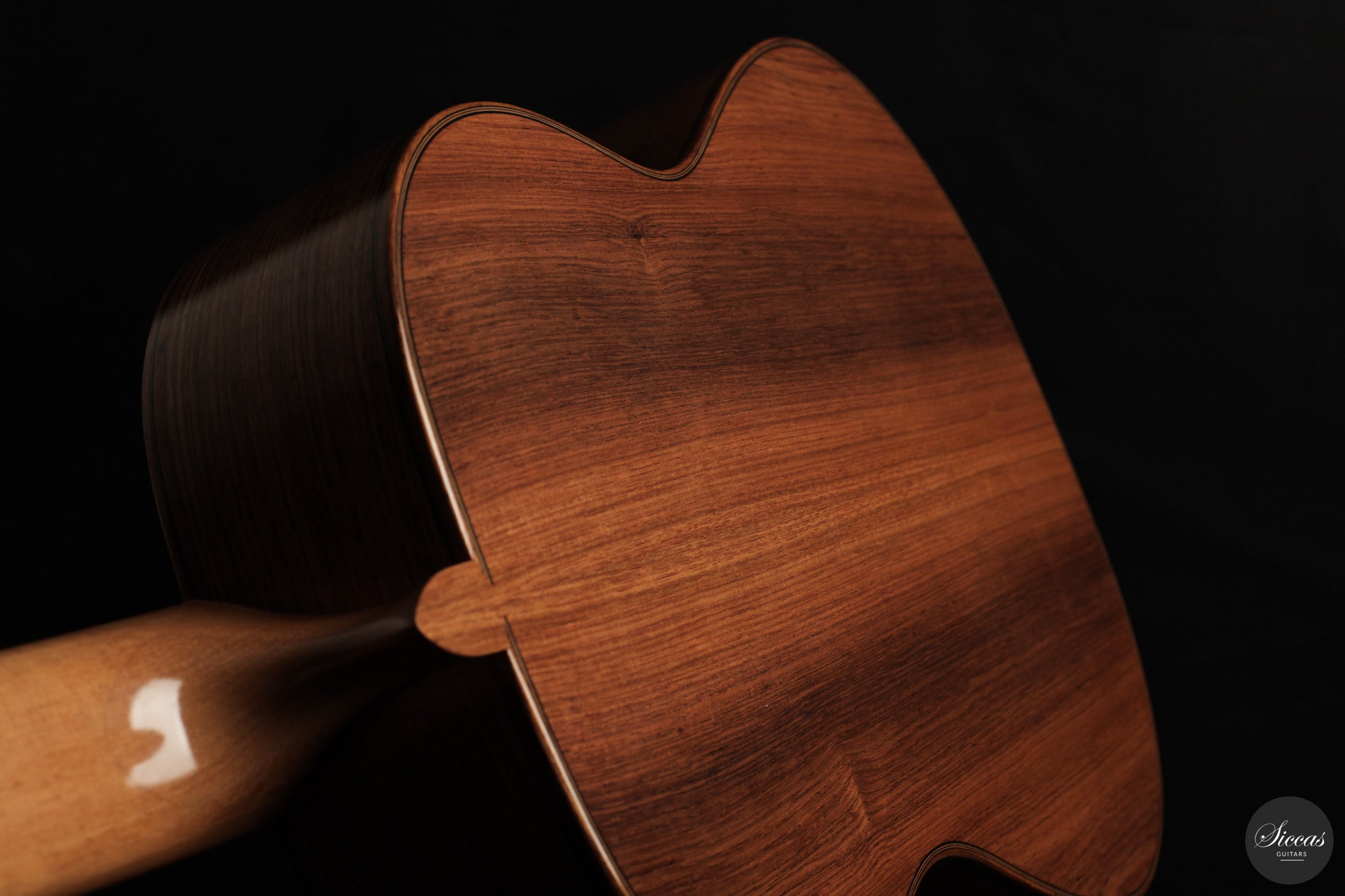 Diese neue Oreste Lohs No. 24 aus dem Jahr 2026 ist eine traditionelle Konzertgitarre mit Fichtendecke und Boden und Zargen aus Madagaskar Palisander. Sie wurde mit Warmleim gebaut und vollständig mit Schellack poliert, was ihren sorgfältigen und historisch fundierten konstruktiven Ansatz unterstreicht. Die von Romanillos inspirierte Rosette ist präzise ausgeführt, während die von Torres beeinflusste Kopfplatte dem Instrument eine ruhige und verfeinerte optische Präsenz gibt.