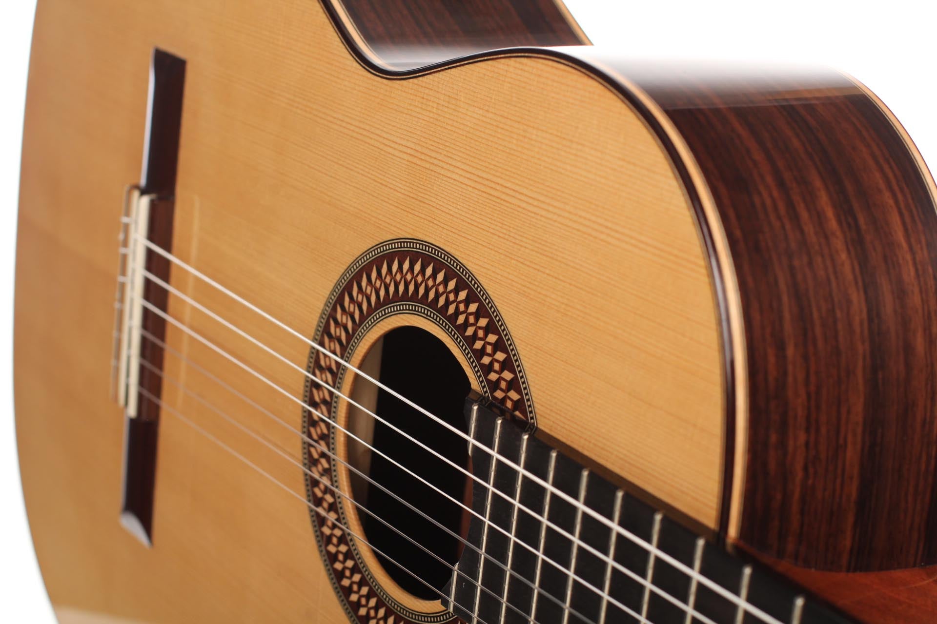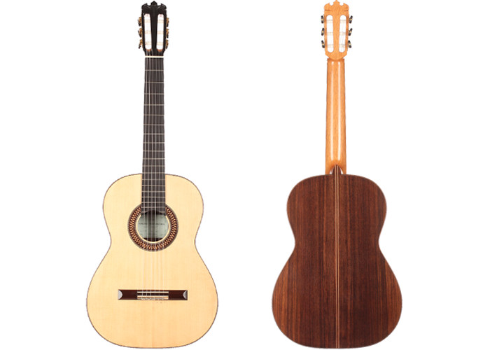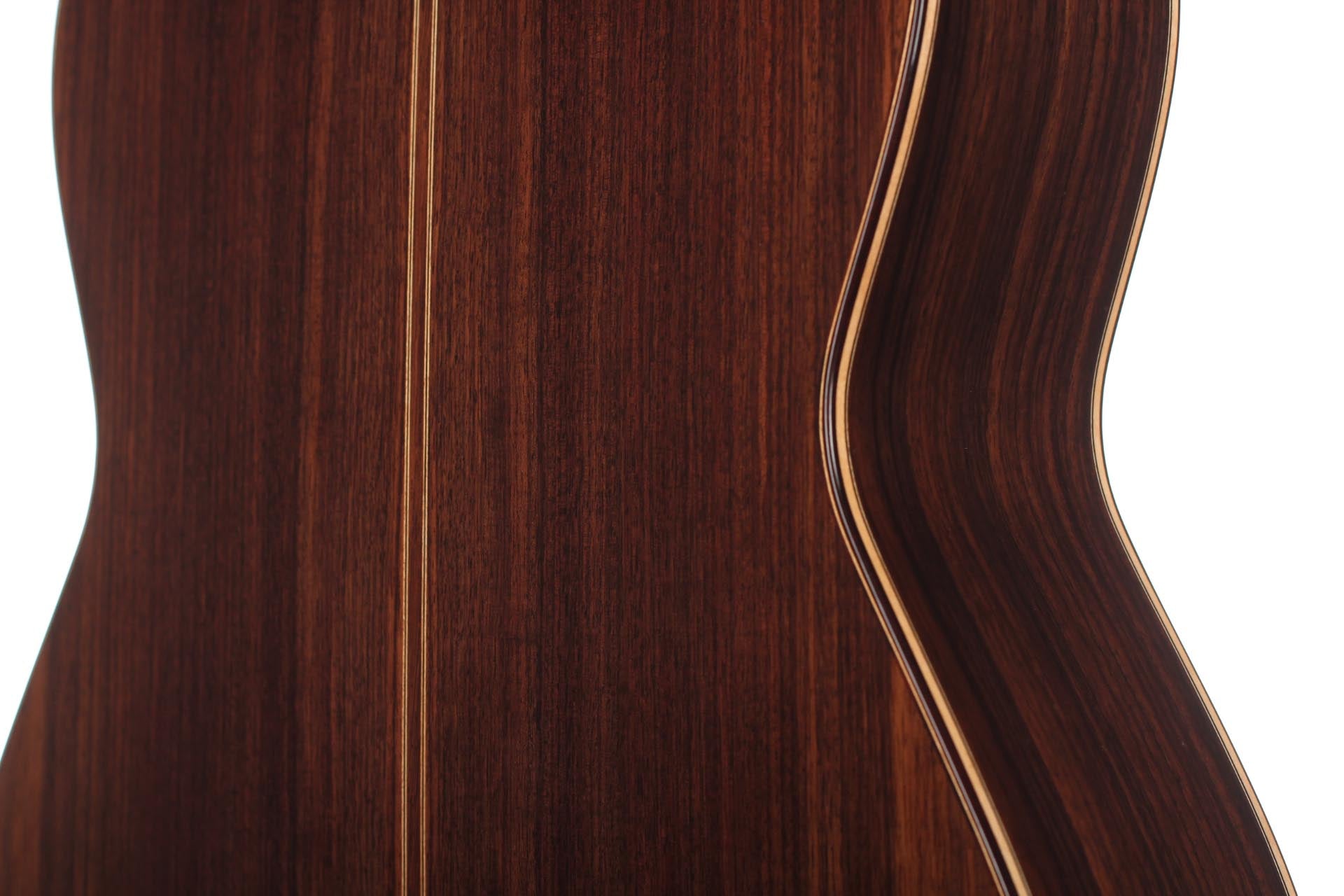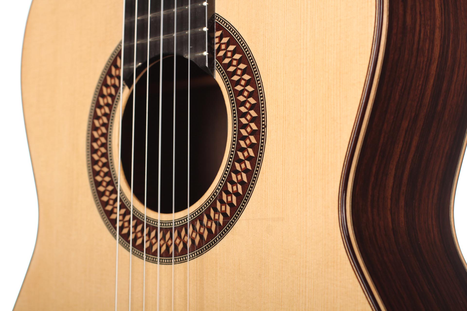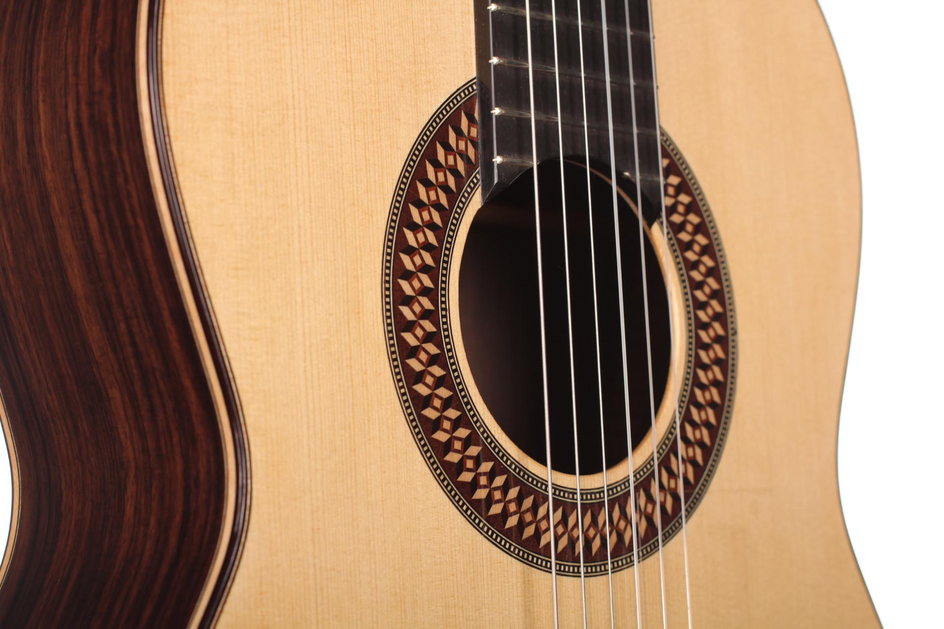 This 2015 concert model is in absolute mint condition. The book-matched spruce top is thinly worked and has a very good response. The Indian rosewood back and sides give to the guitar a great sustain and projection. A lot of marquetry details such as the bridge inlay, the rosette and the head-plate have been thoroughly thought-after and give modern and refined character to the instrument. It is overall a fine guitar with a great value for price.  A hard-shell case is included.