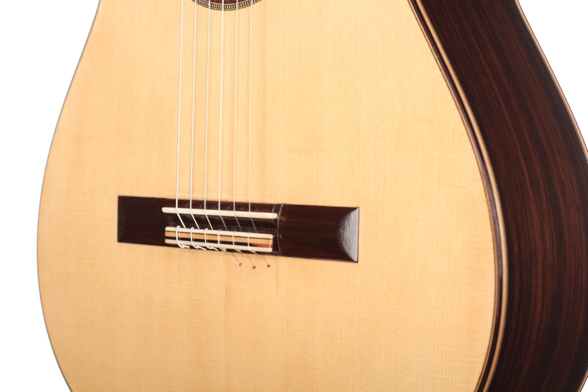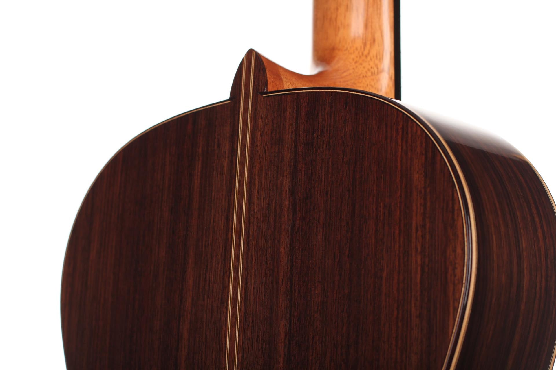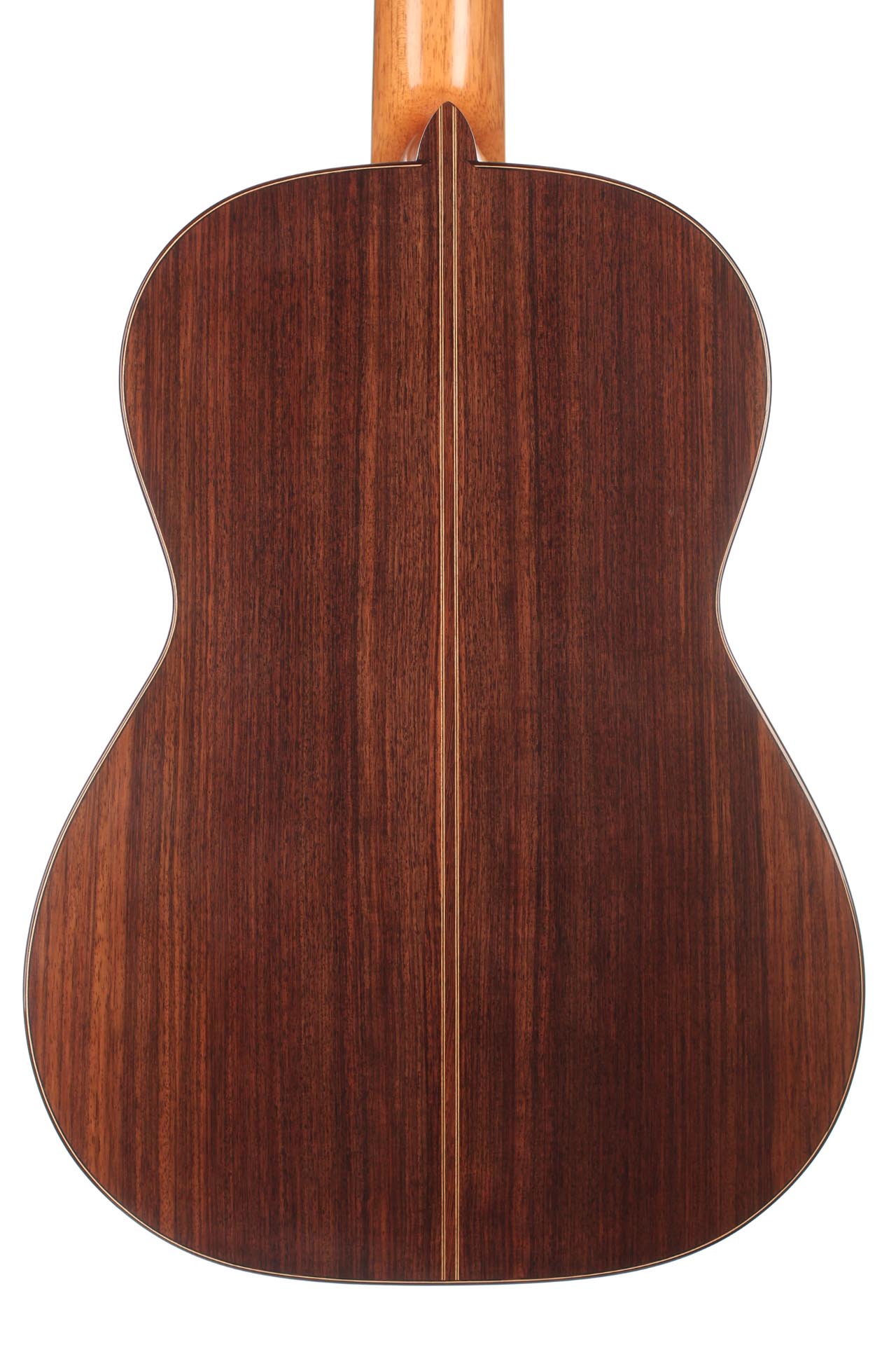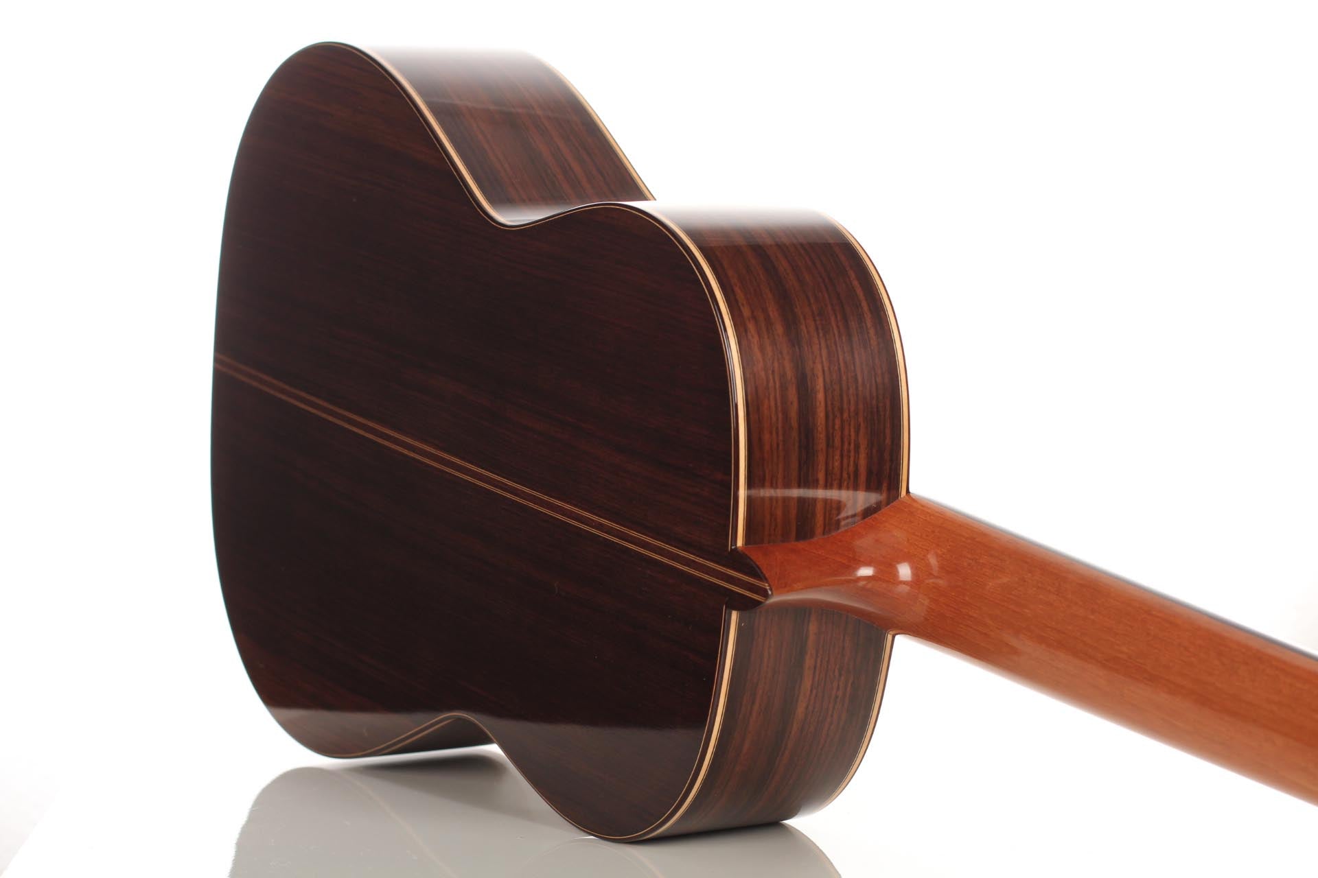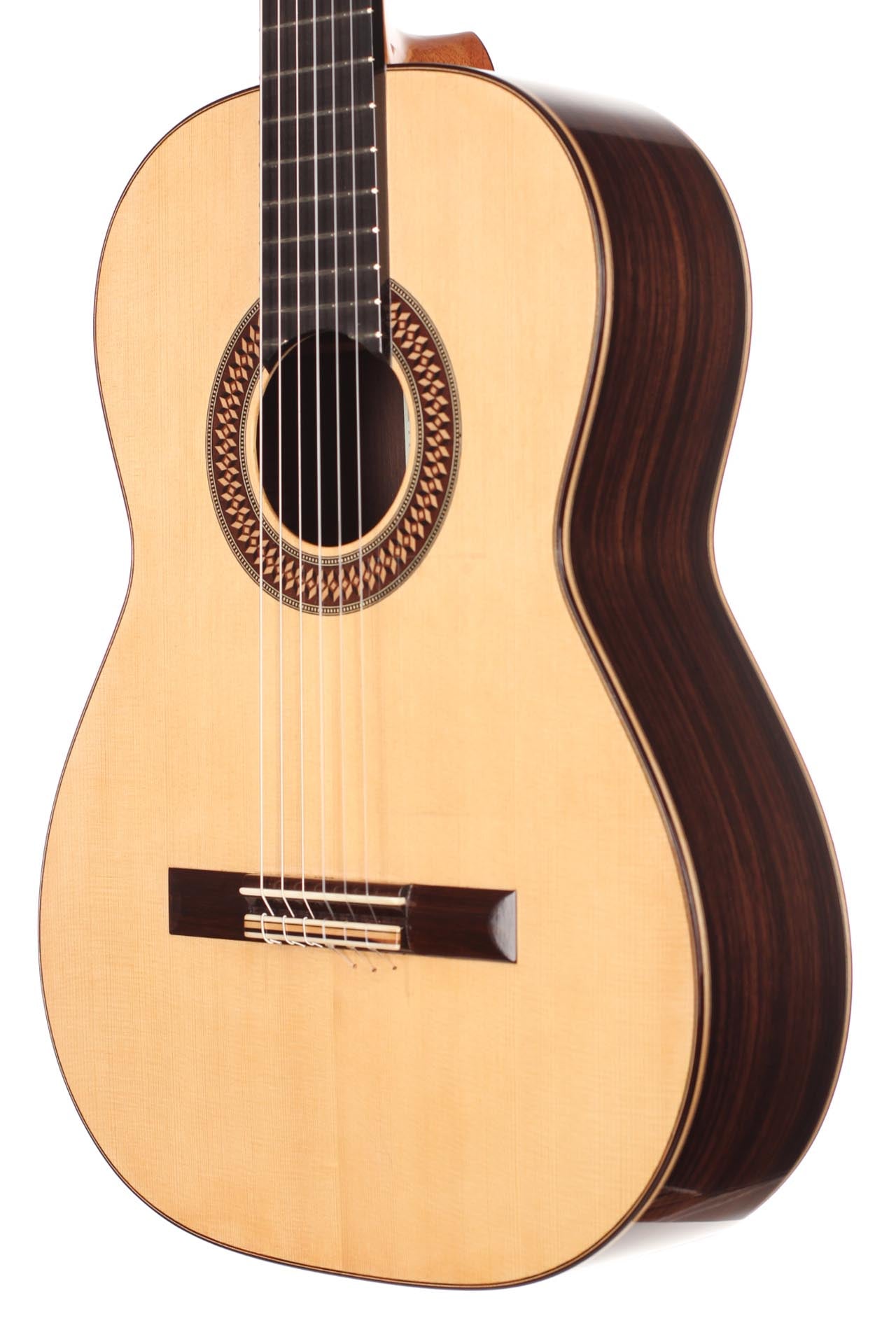 This 2015 concert model is in absolute mint condition. The book-matched spruce top is thinly worked and has a very good response. The Indian rosewood back and sides give to the guitar a great sustain and projection. A lot of marquetry details such as the bridge inlay, the rosette and the head-plate have been thoroughly thought-after and give modern and refined character to the instrument. It is overall a fine guitar with a great value for price.  A hard-shell case is included.