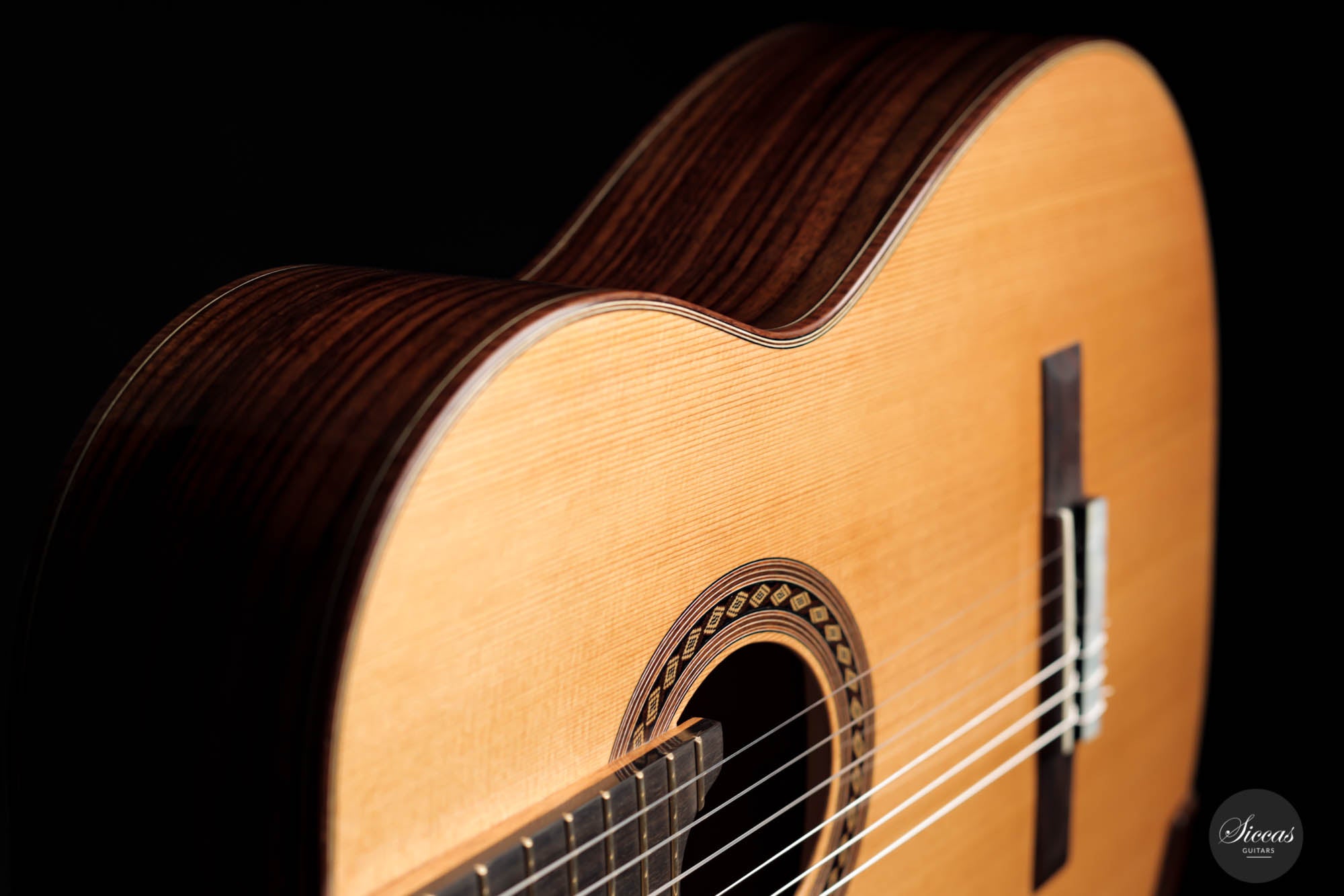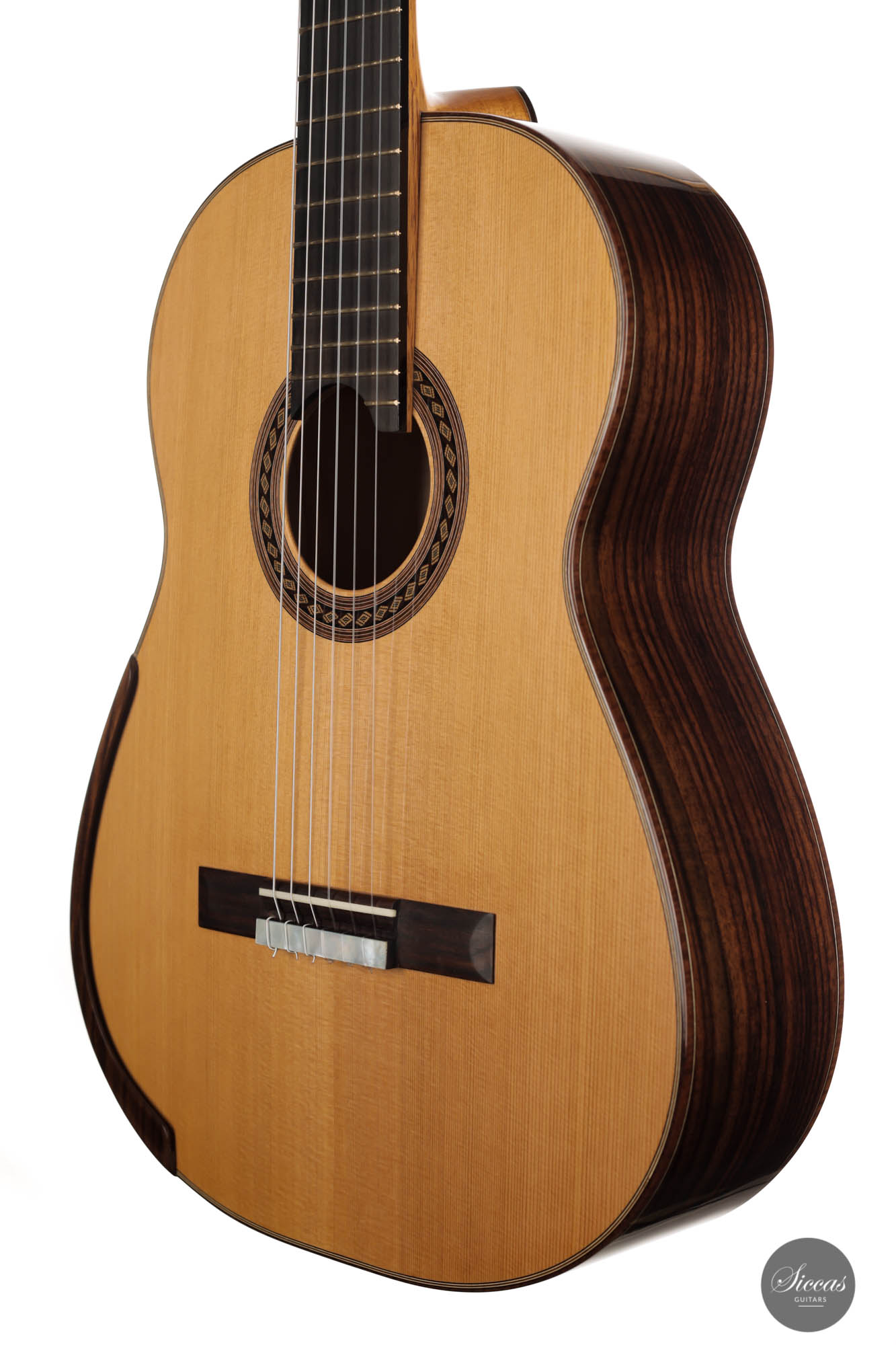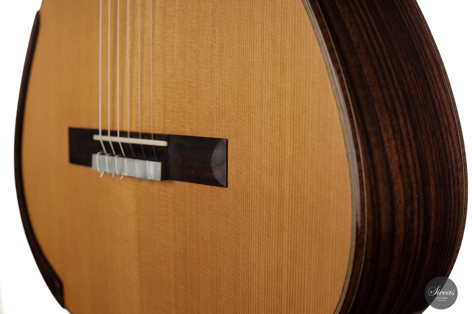 This guitar, named "Sophie", has a Canadian Western Red Cedar double top, with East Indian back and sides. The back and sides are doubled with Canadian Maple, increasing stability and producing more clarity in the sound. The bindings are made of Flamed Katalox, which is enhanced by the French Polished shellac finish. The sound is mighty, with great separation, clarity, and balance. Thanks to the fantastic playability offered by the comfortable neck, this guitar plays by itself and makes left-hand gymnastics effortless. Sophie has a 650 mm scale length, a 53mm nut, and Gotoh Premium Tuners