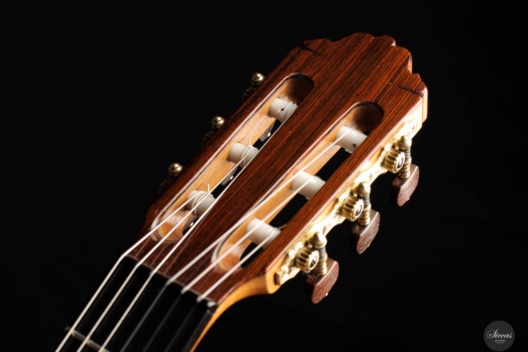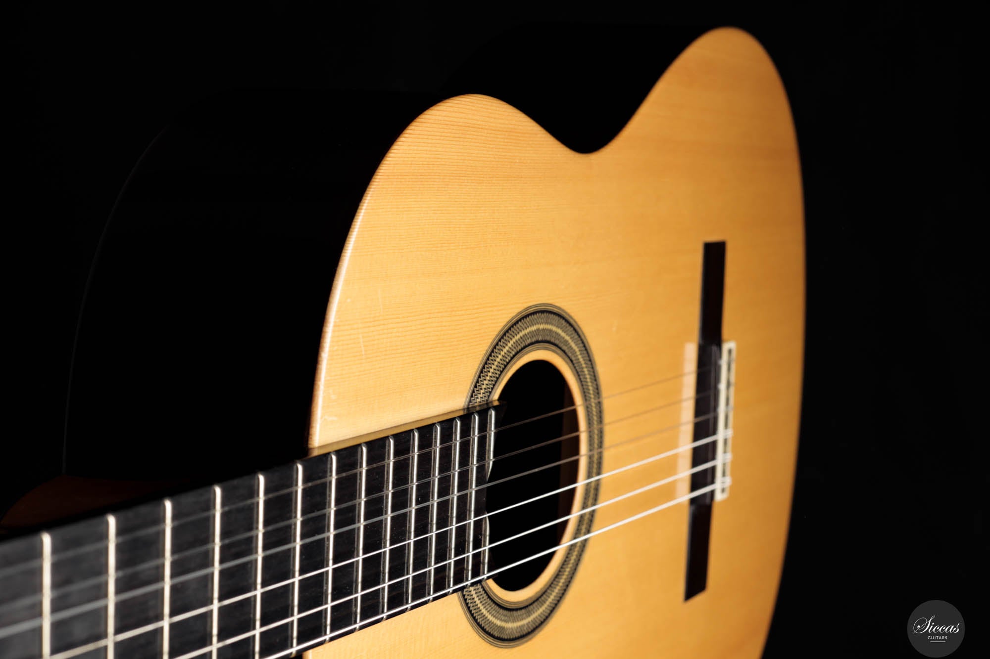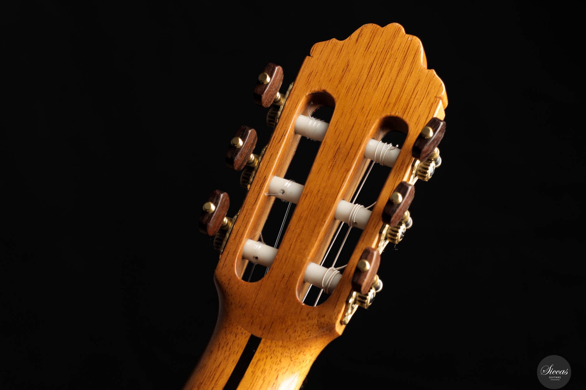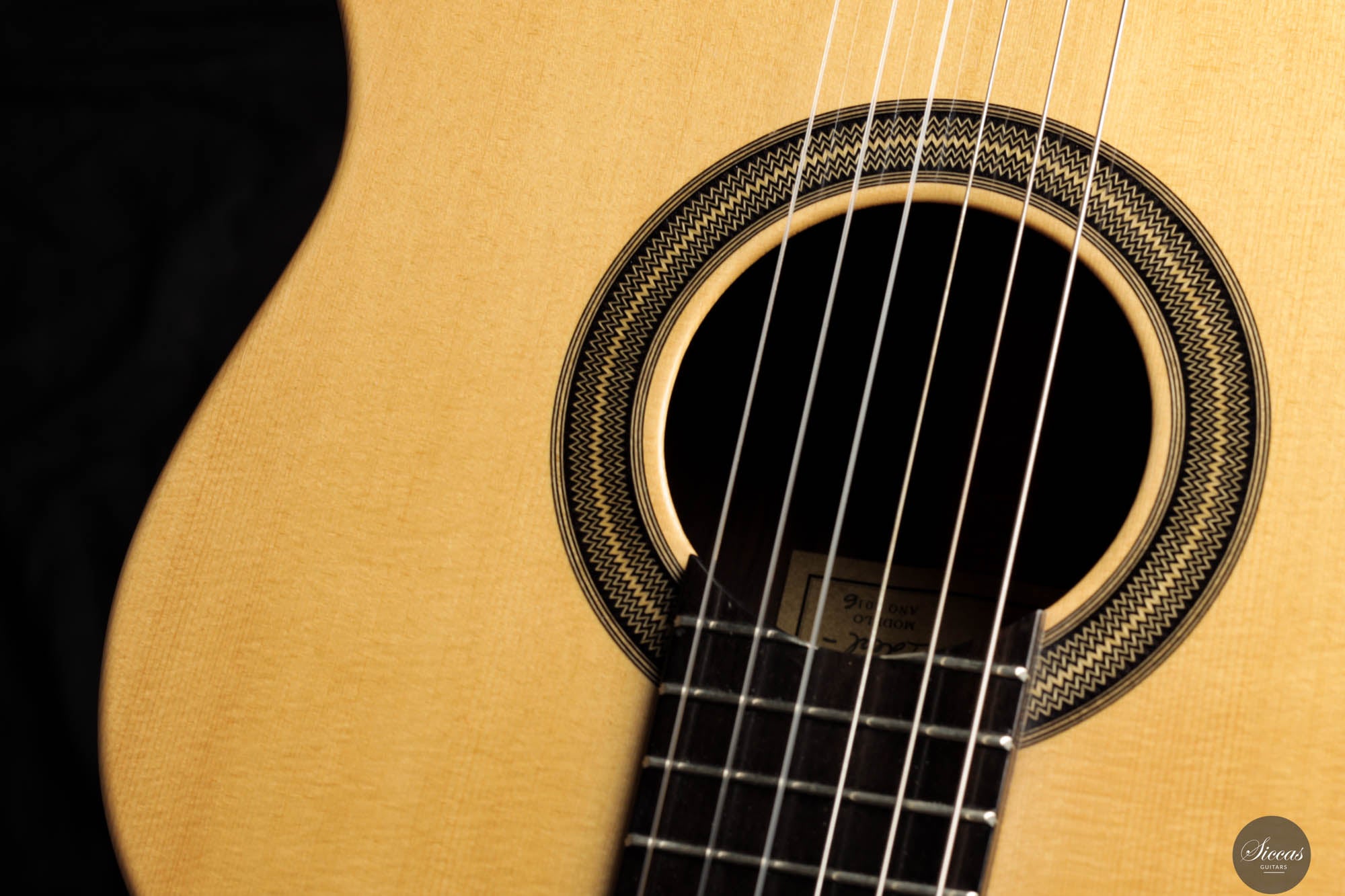 Diese Gitarre erinnert zwar in Ton und Qualität an die geschätzte Bernabe Especial, sticht jedoch durch ihr schlichtes Design und Paulino Bernabes innovativen Ansatz zur Klangverbesserung hervor. Indem er alle nicht wesentlichen Elemente wegließ, konzentrierte sich Bernabe ausschließlich auf die Verbesserung des Klangs. Er setzte Techniken ein, wie das Entfernen von Füllmaterialien und das Neugestalten der Art und Weise, wie Decke, Boden und Zargen verbunden werden. Die abgeschrägten Kanten der Schalldecke verbessern sowohl den Komfort als auch die Akustik. Die einzigartige Konstruktionstechnik, bei der Decke und Boden direkt an die Zargen ohne Bindungen angebracht werden, beeindruckt nicht nur aus der Sicht eines Konstrukteurs, sondern erhöht auch deutlich die Vibration, Resonanz und den Sustain der Gitarre. Diese Gitarre, in sehr gutem Zustand mit minimalen Gebrauchsspuren, beeindruckt mit ihrer kraftvollen Projektion und intensivierten spanischen Charakteristik.