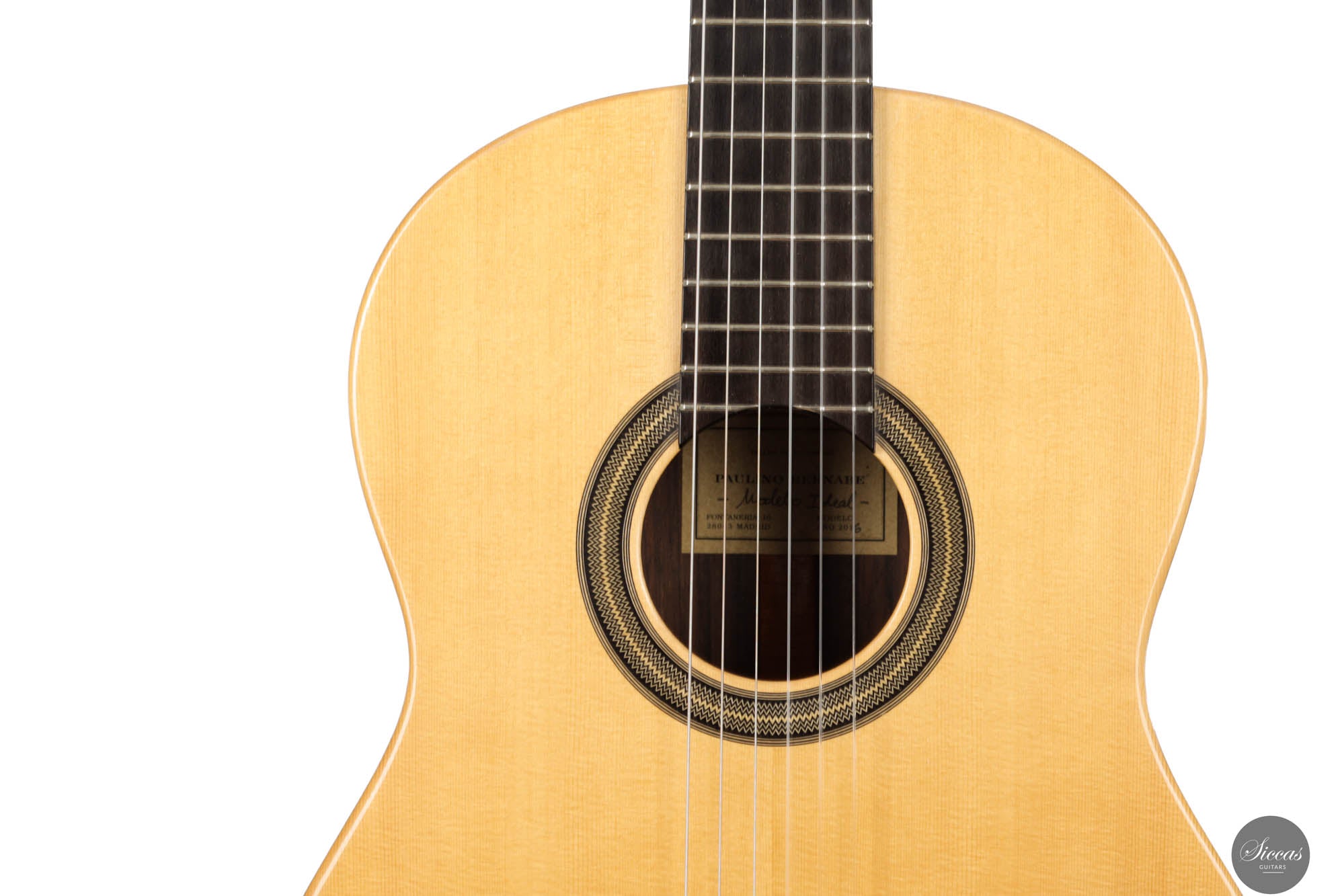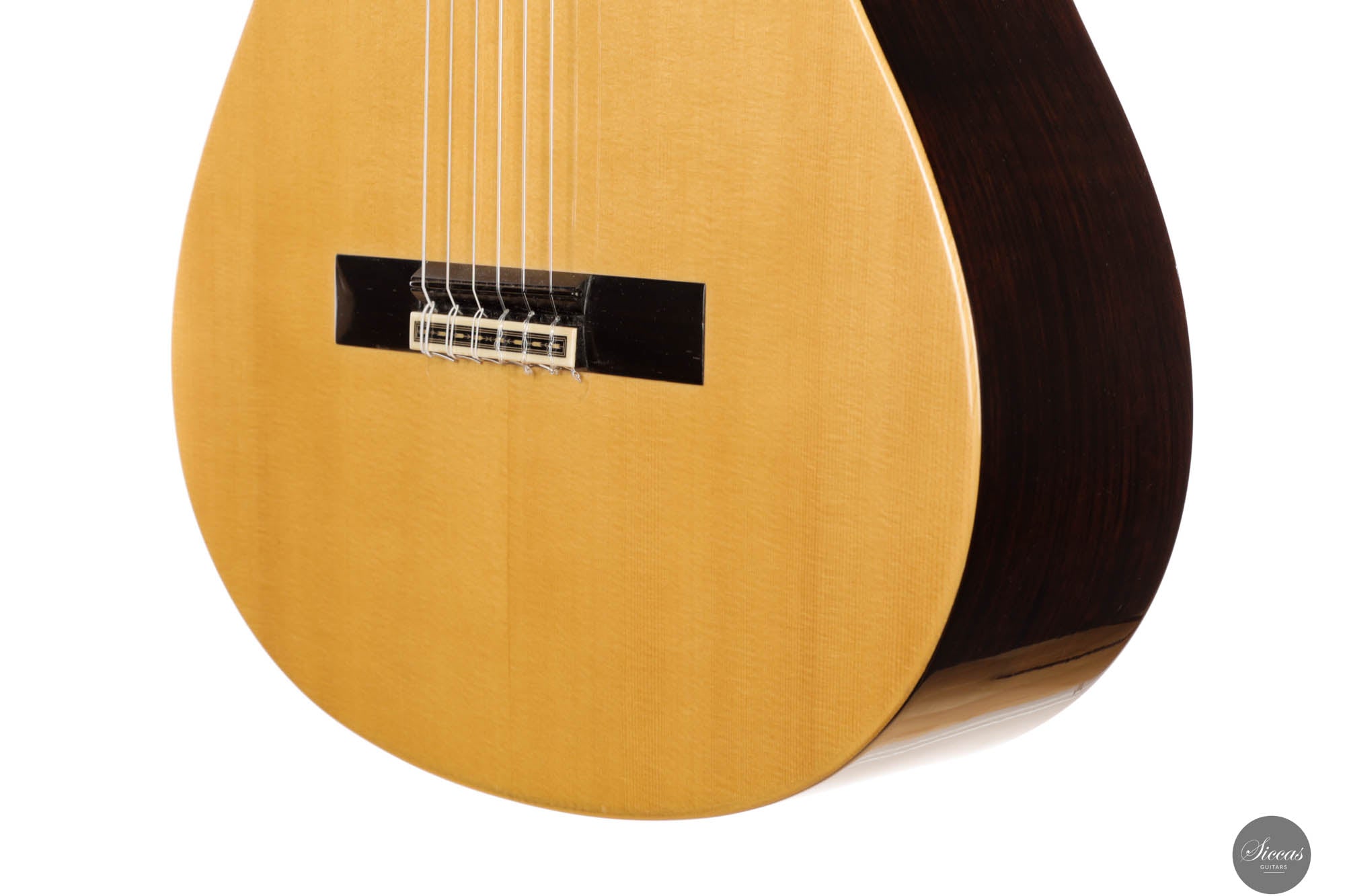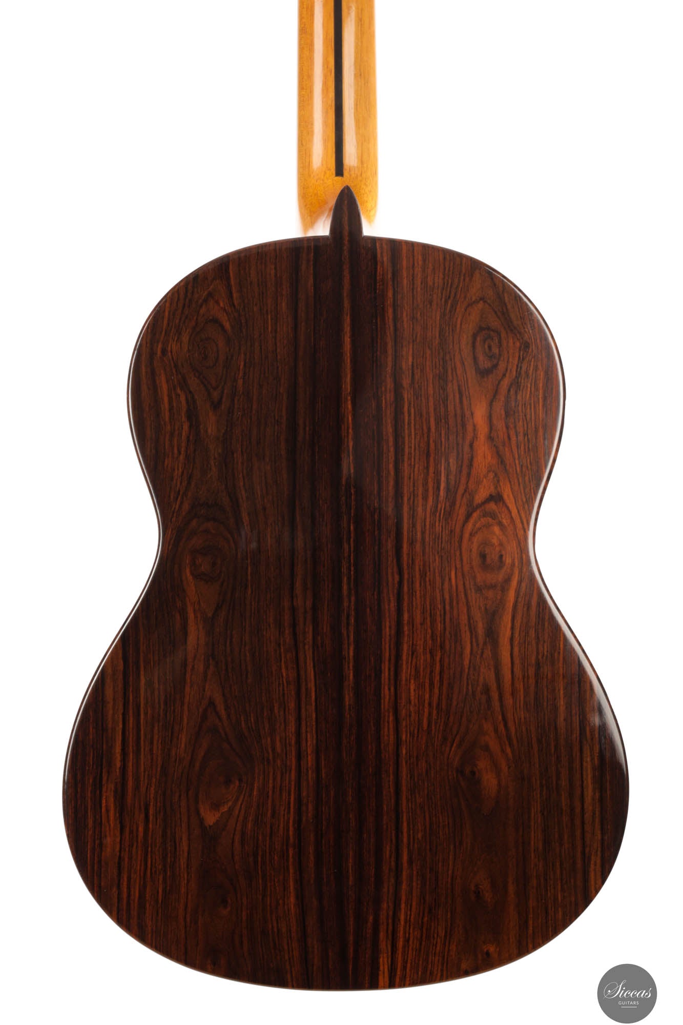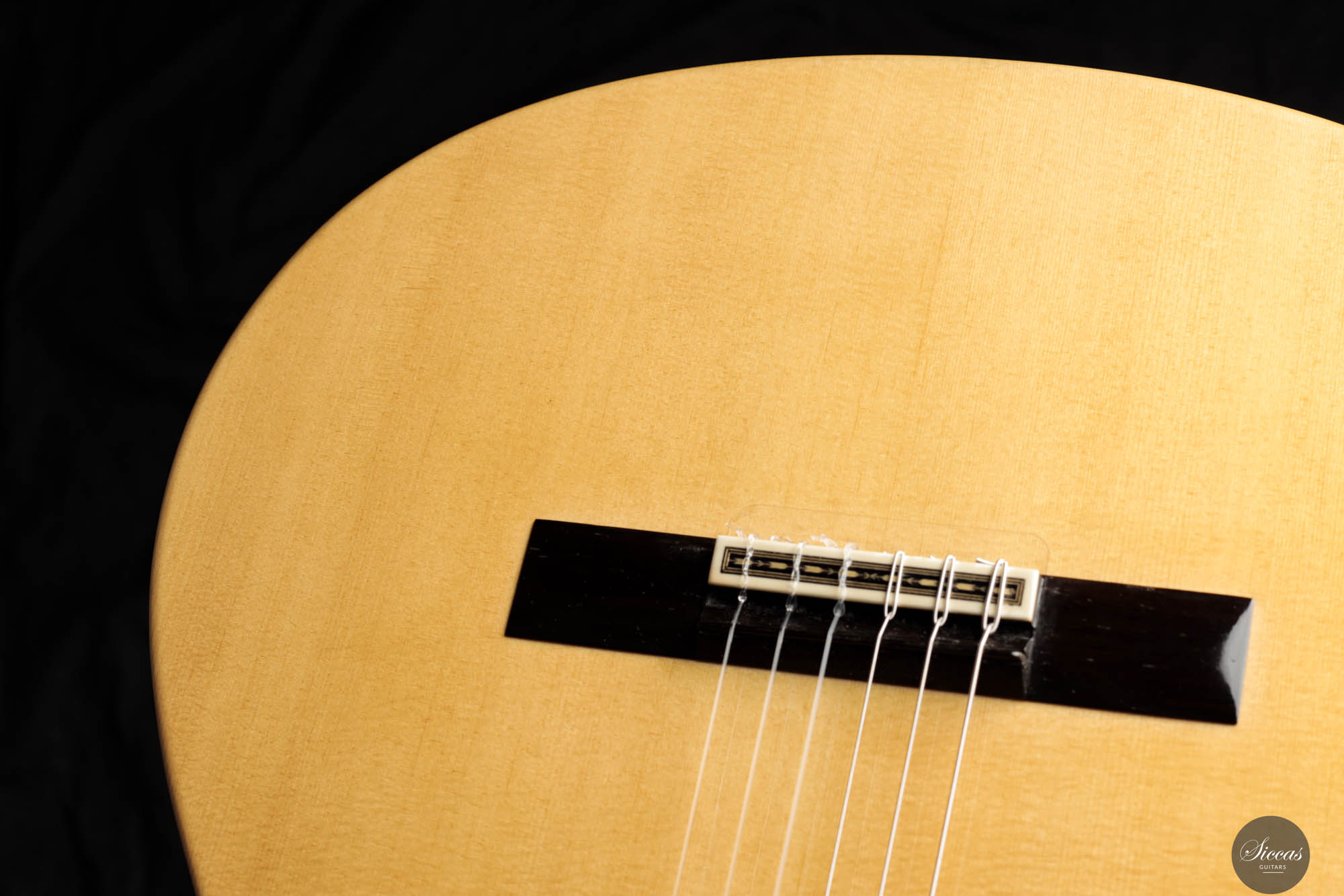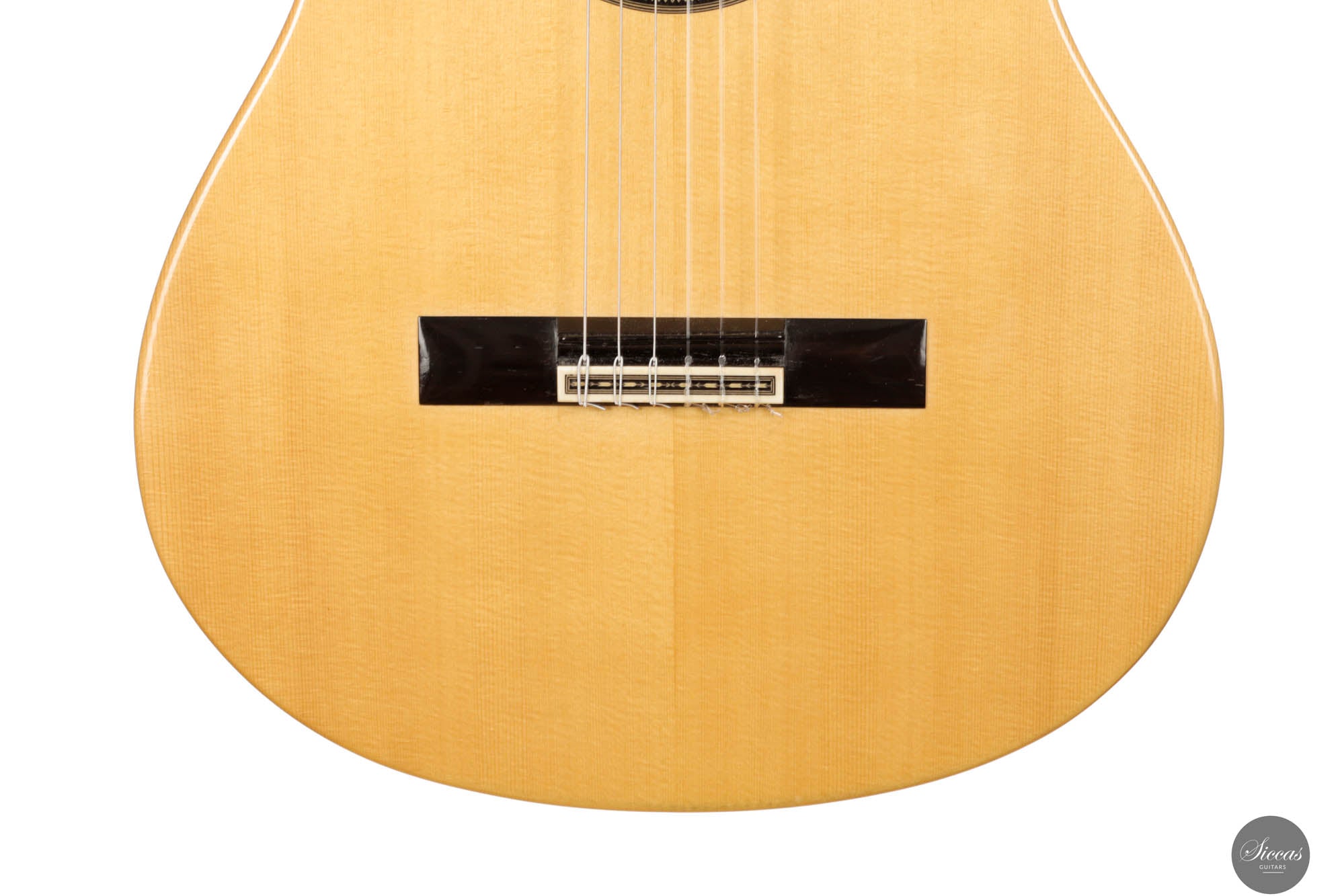 Diese Gitarre erinnert zwar in Ton und Qualität an die geschätzte Bernabe Especial, sticht jedoch durch ihr schlichtes Design und Paulino Bernabes innovativen Ansatz zur Klangverbesserung hervor. Indem er alle nicht wesentlichen Elemente wegließ, konzentrierte sich Bernabe ausschließlich auf die Verbesserung des Klangs. Er setzte Techniken ein, wie das Entfernen von Füllmaterialien und das Neugestalten der Art und Weise, wie Decke, Boden und Zargen verbunden werden. Die abgeschrägten Kanten der Schalldecke verbessern sowohl den Komfort als auch die Akustik. Die einzigartige Konstruktionstechnik, bei der Decke und Boden direkt an die Zargen ohne Bindungen angebracht werden, beeindruckt nicht nur aus der Sicht eines Konstrukteurs, sondern erhöht auch deutlich die Vibration, Resonanz und den Sustain der Gitarre. Diese Gitarre, in sehr gutem Zustand mit minimalen Gebrauchsspuren, beeindruckt mit ihrer kraftvollen Projektion und intensivierten spanischen Charakteristik.