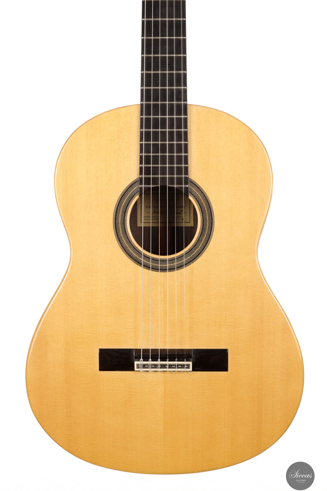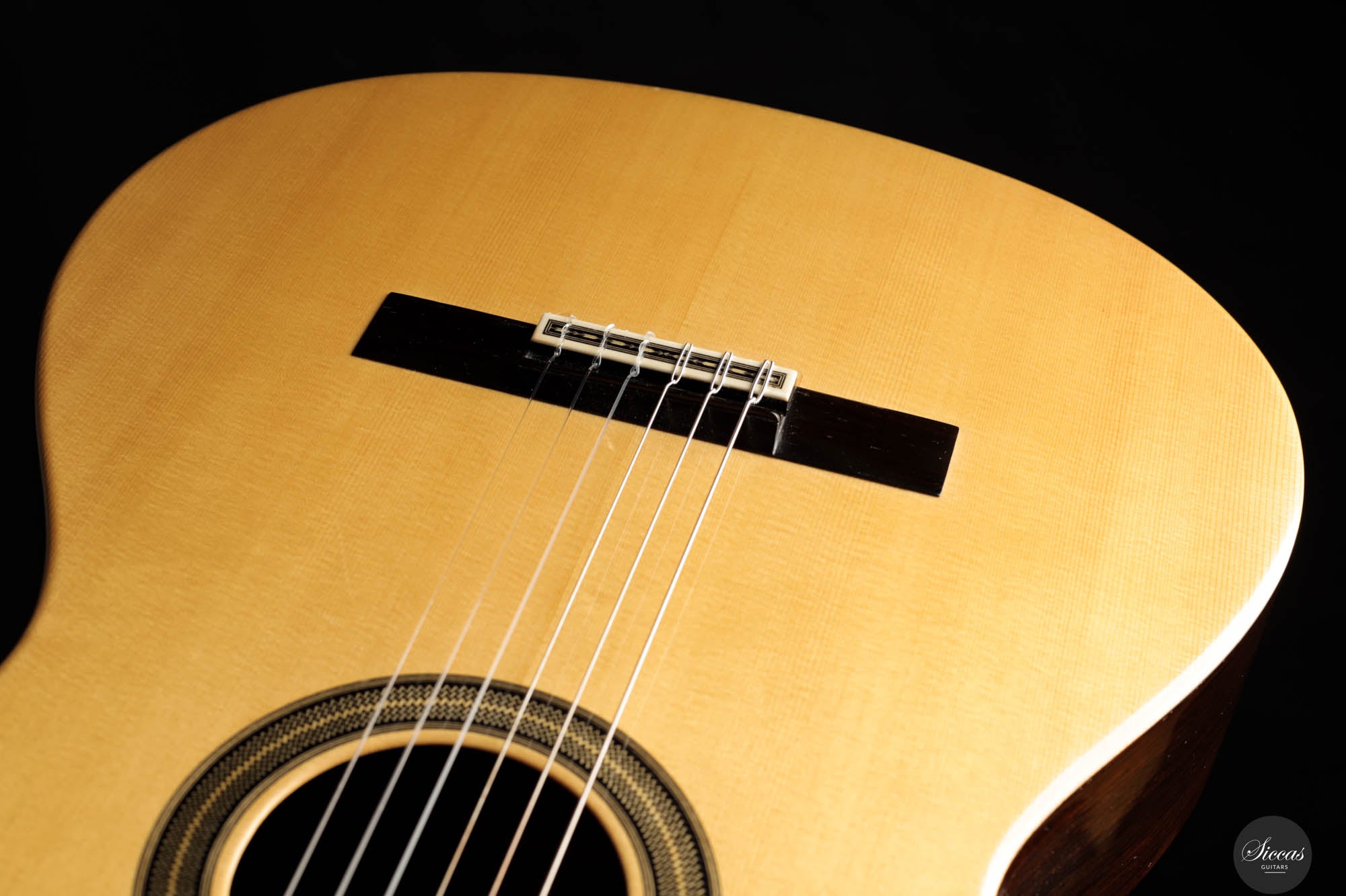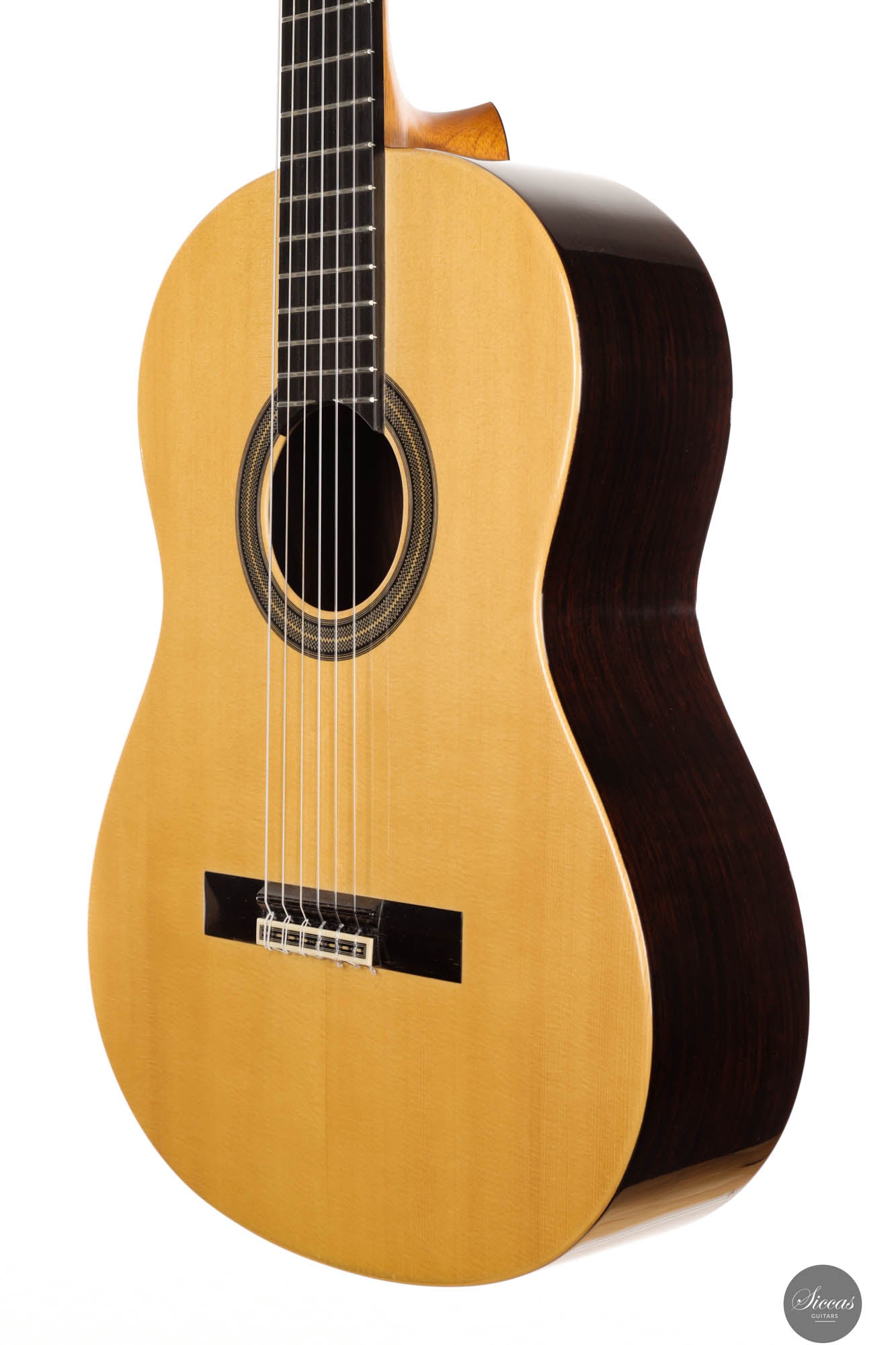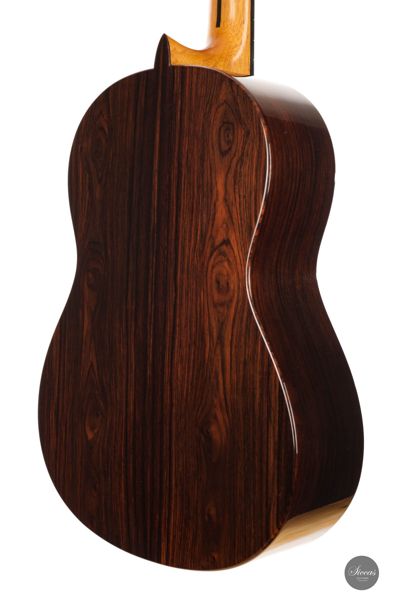 Diese Gitarre erinnert zwar in Ton und Qualität an die geschätzte Bernabe Especial, sticht jedoch durch ihr schlichtes Design und Paulino Bernabes innovativen Ansatz zur Klangverbesserung hervor. Indem er alle nicht wesentlichen Elemente wegließ, konzentrierte sich Bernabe ausschließlich auf die Verbesserung des Klangs. Er setzte Techniken ein, wie das Entfernen von Füllmaterialien und das Neugestalten der Art und Weise, wie Decke, Boden und Zargen verbunden werden. Die abgeschrägten Kanten der Schalldecke verbessern sowohl den Komfort als auch die Akustik. Die einzigartige Konstruktionstechnik, bei der Decke und Boden direkt an die Zargen ohne Bindungen angebracht werden, beeindruckt nicht nur aus der Sicht eines Konstrukteurs, sondern erhöht auch deutlich die Vibration, Resonanz und den Sustain der Gitarre. Diese Gitarre, in sehr gutem Zustand mit minimalen Gebrauchsspuren, beeindruckt mit ihrer kraftvollen Projektion und intensivierten spanischen Charakteristik.