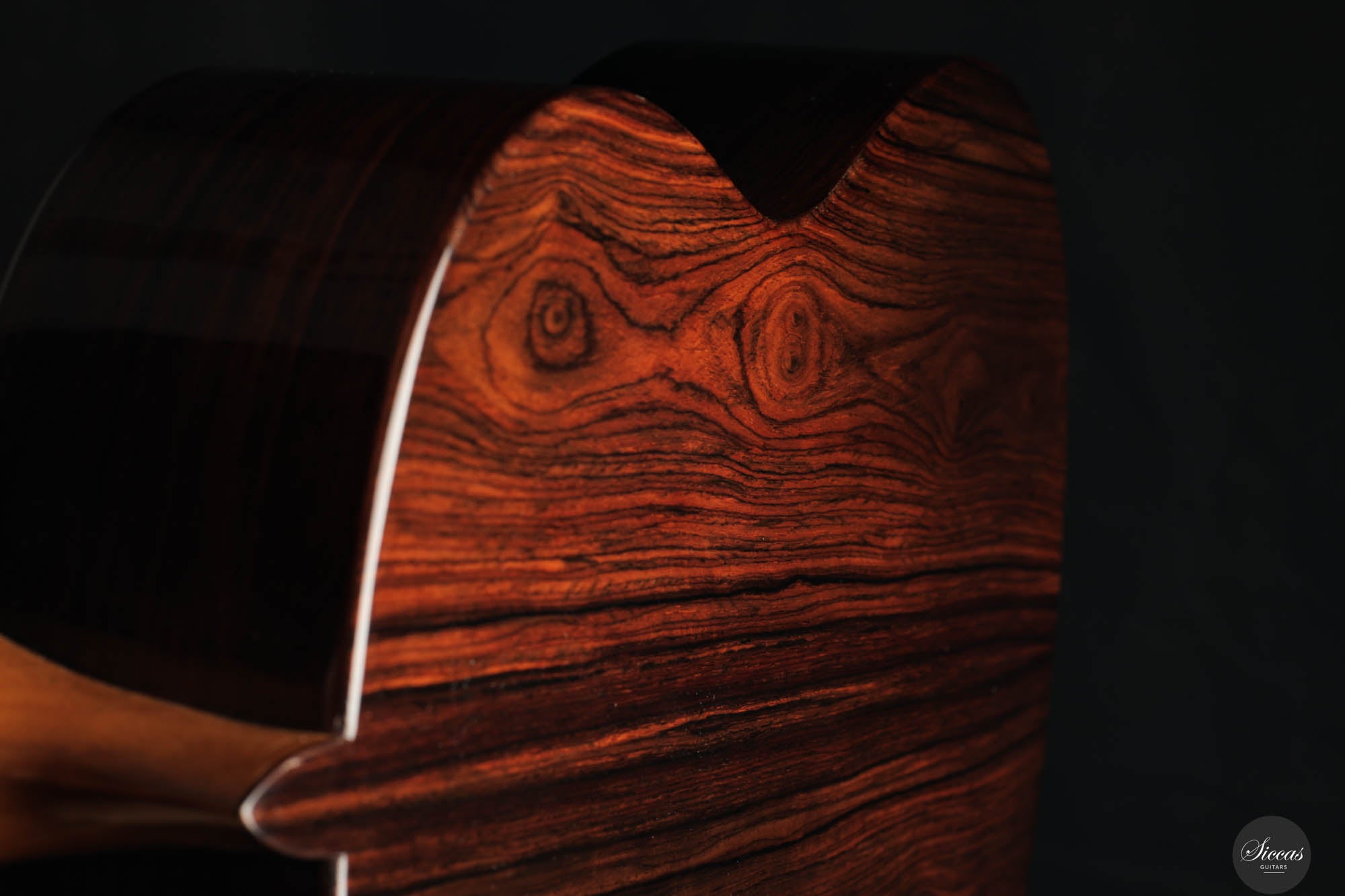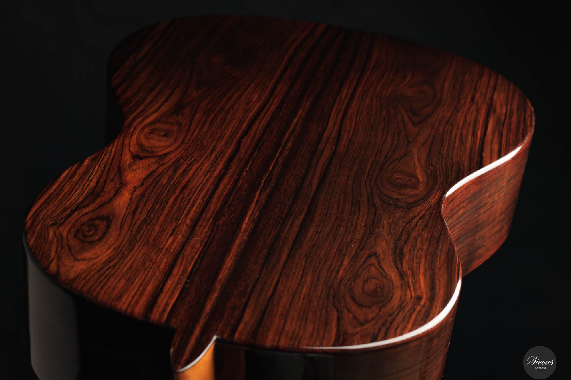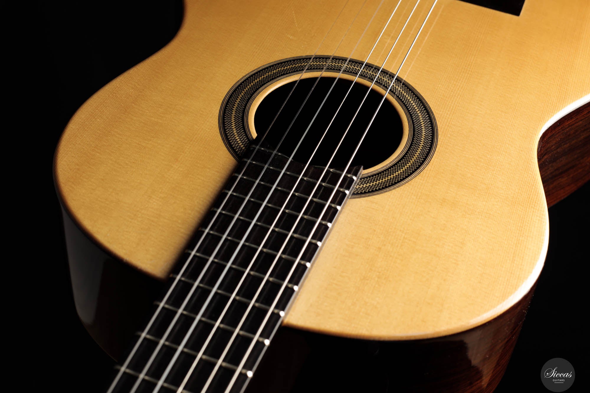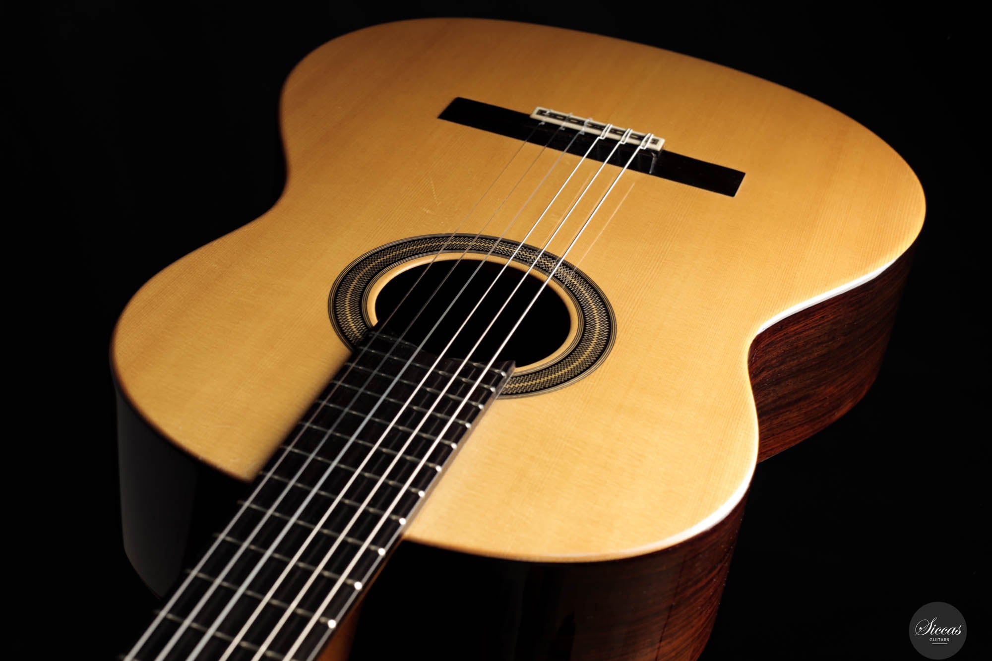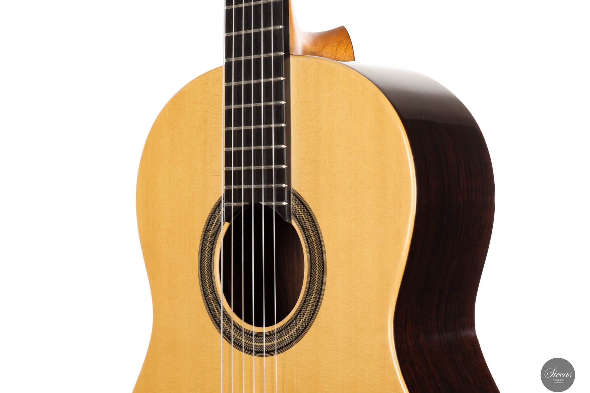 Diese Gitarre erinnert zwar in Ton und Qualität an die geschätzte Bernabe Especial, sticht jedoch durch ihr schlichtes Design und Paulino Bernabes innovativen Ansatz zur Klangverbesserung hervor. Indem er alle nicht wesentlichen Elemente wegließ, konzentrierte sich Bernabe ausschließlich auf die Verbesserung des Klangs. Er setzte Techniken ein, wie das Entfernen von Füllmaterialien und das Neugestalten der Art und Weise, wie Decke, Boden und Zargen verbunden werden. Die abgeschrägten Kanten der Schalldecke verbessern sowohl den Komfort als auch die Akustik. Die einzigartige Konstruktionstechnik, bei der Decke und Boden direkt an die Zargen ohne Bindungen angebracht werden, beeindruckt nicht nur aus der Sicht eines Konstrukteurs, sondern erhöht auch deutlich die Vibration, Resonanz und den Sustain der Gitarre. Diese Gitarre, in sehr gutem Zustand mit minimalen Gebrauchsspuren, beeindruckt mit ihrer kraftvollen Projektion und intensivierten spanischen Charakteristik.
