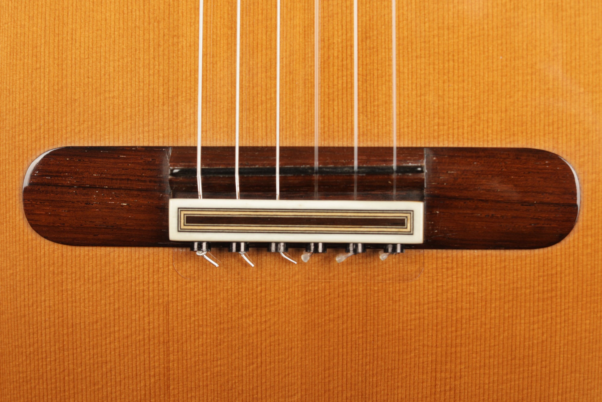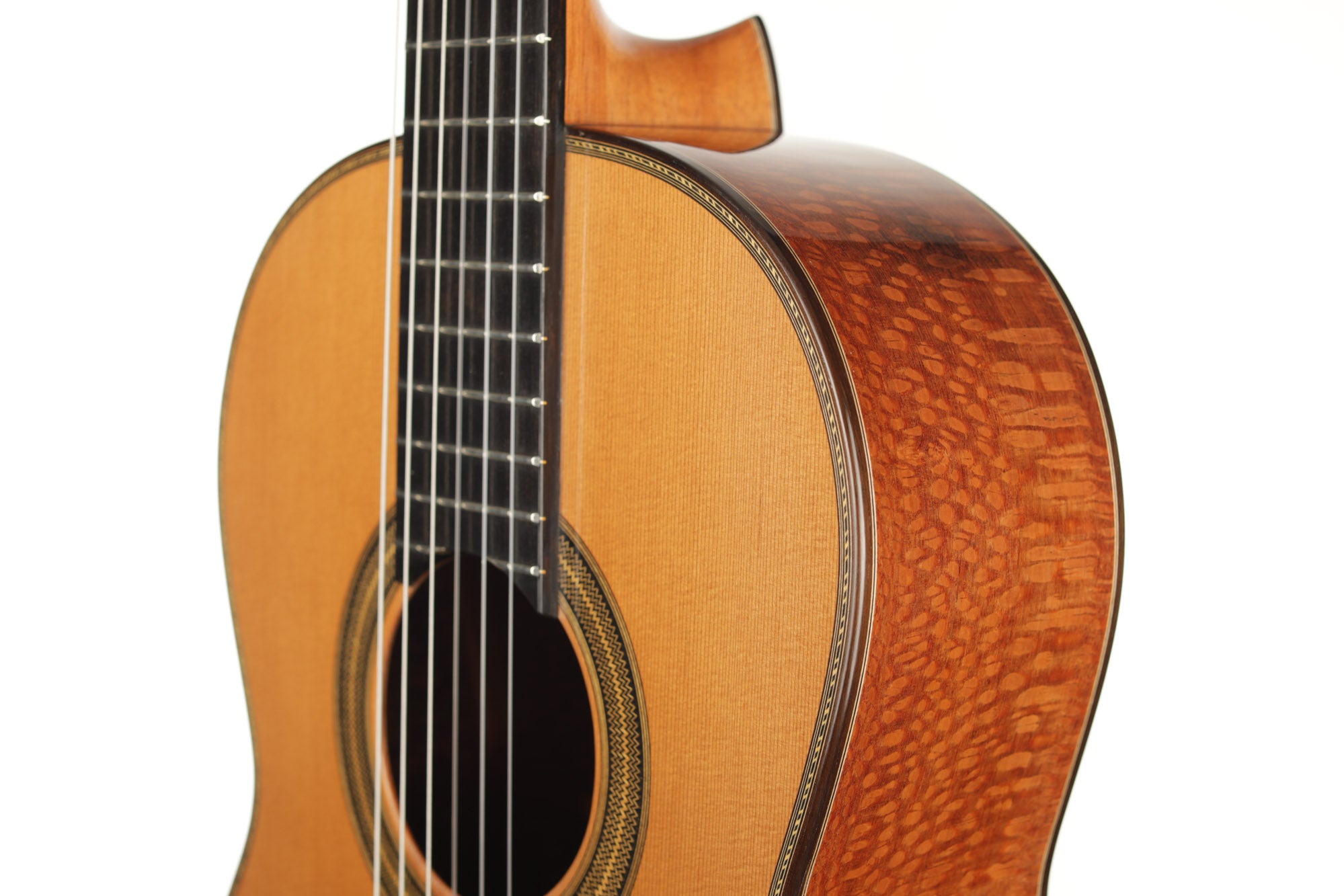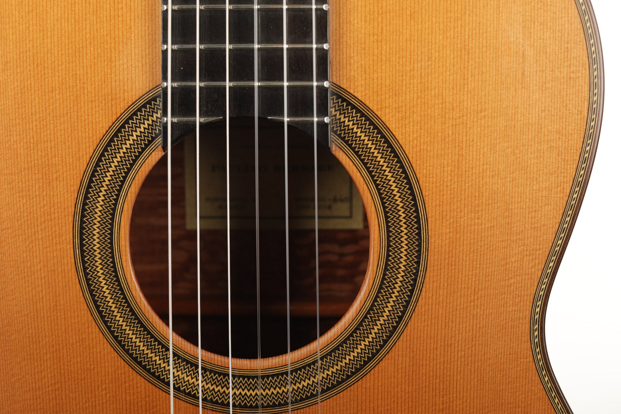 This beautifully decorated model by Paulino Bernabé is slightly smaller bodied than his other models. It results in a guitar with a lovely 1920s styled shape reminding of the original José Ramirez I guitars. The rounded bridge and black bone saddle also confirm this antique style, which perfectly matches the incredibly smooth tone and gentle playability of this delicate instrument.