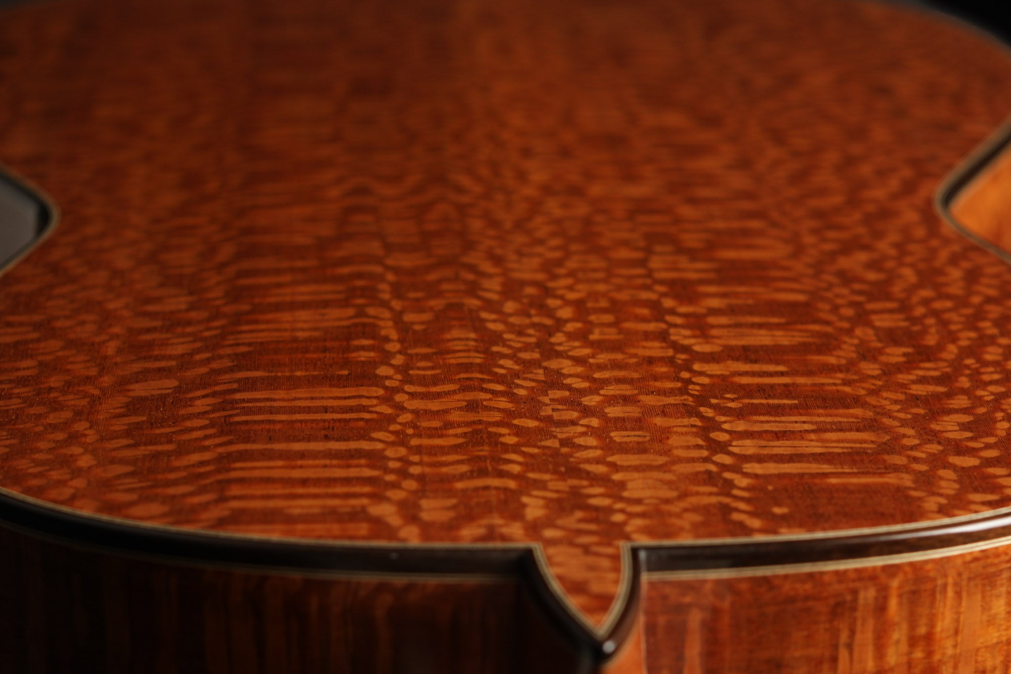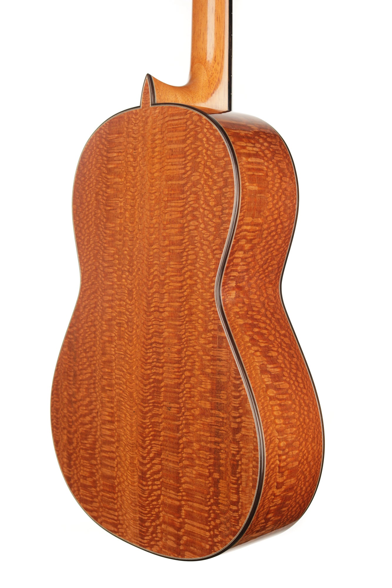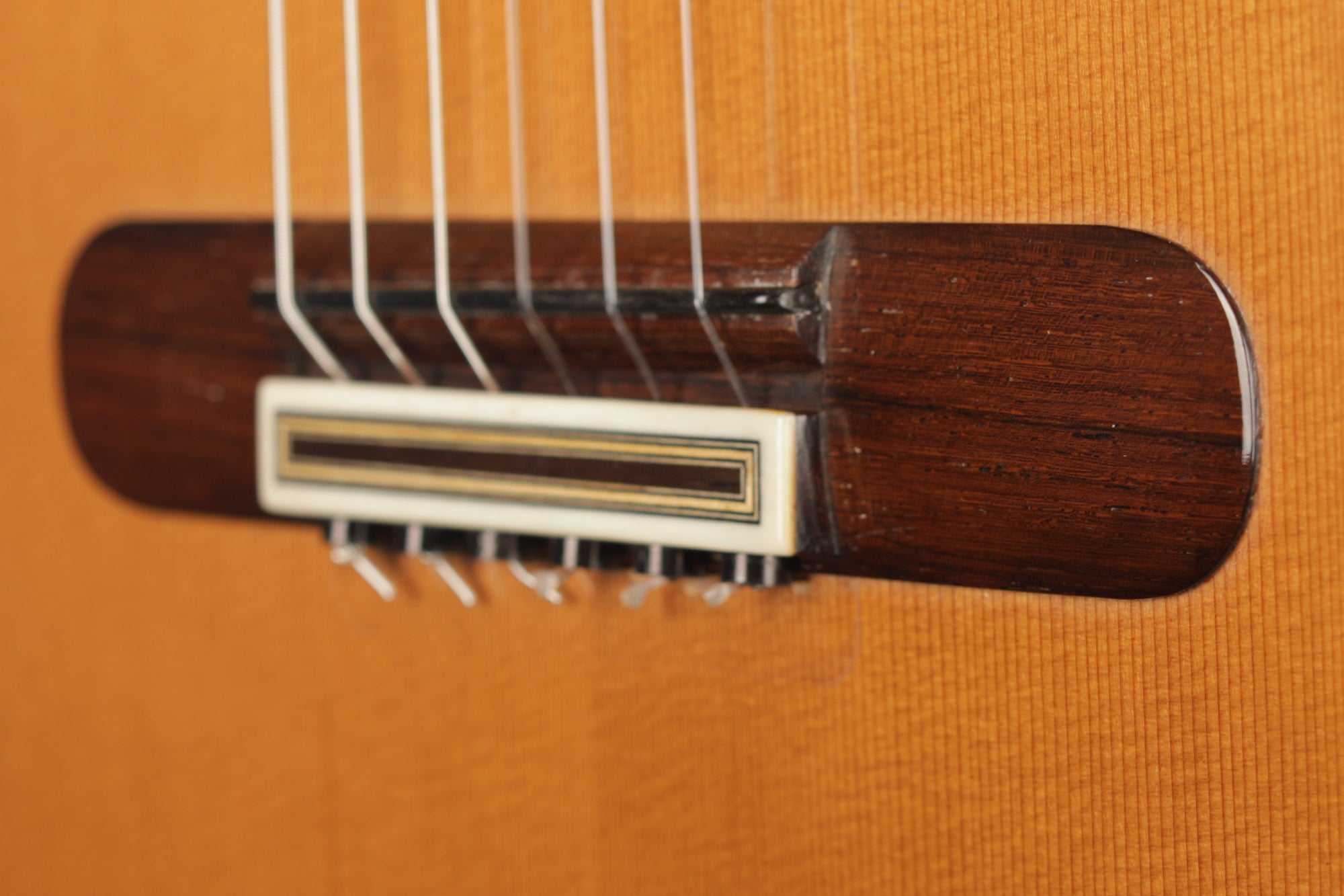 This beautifully decorated model by Paulino Bernabé is slightly smaller bodied than his other models. It results in a guitar with a lovely 1920s styled shape reminding of the original José Ramirez I guitars. The rounded bridge and black bone saddle also confirm this antique style, which perfectly matches the incredibly smooth tone and gentle playability of this delicate instrument.