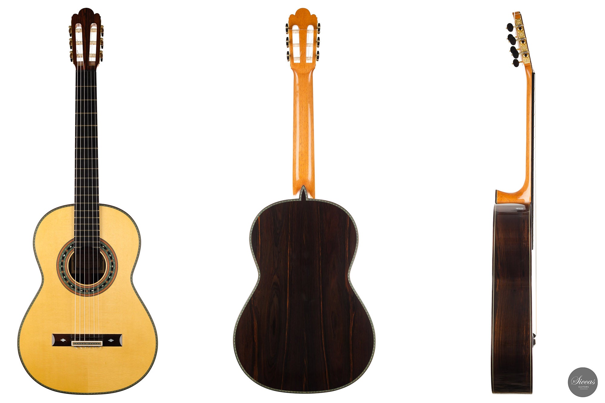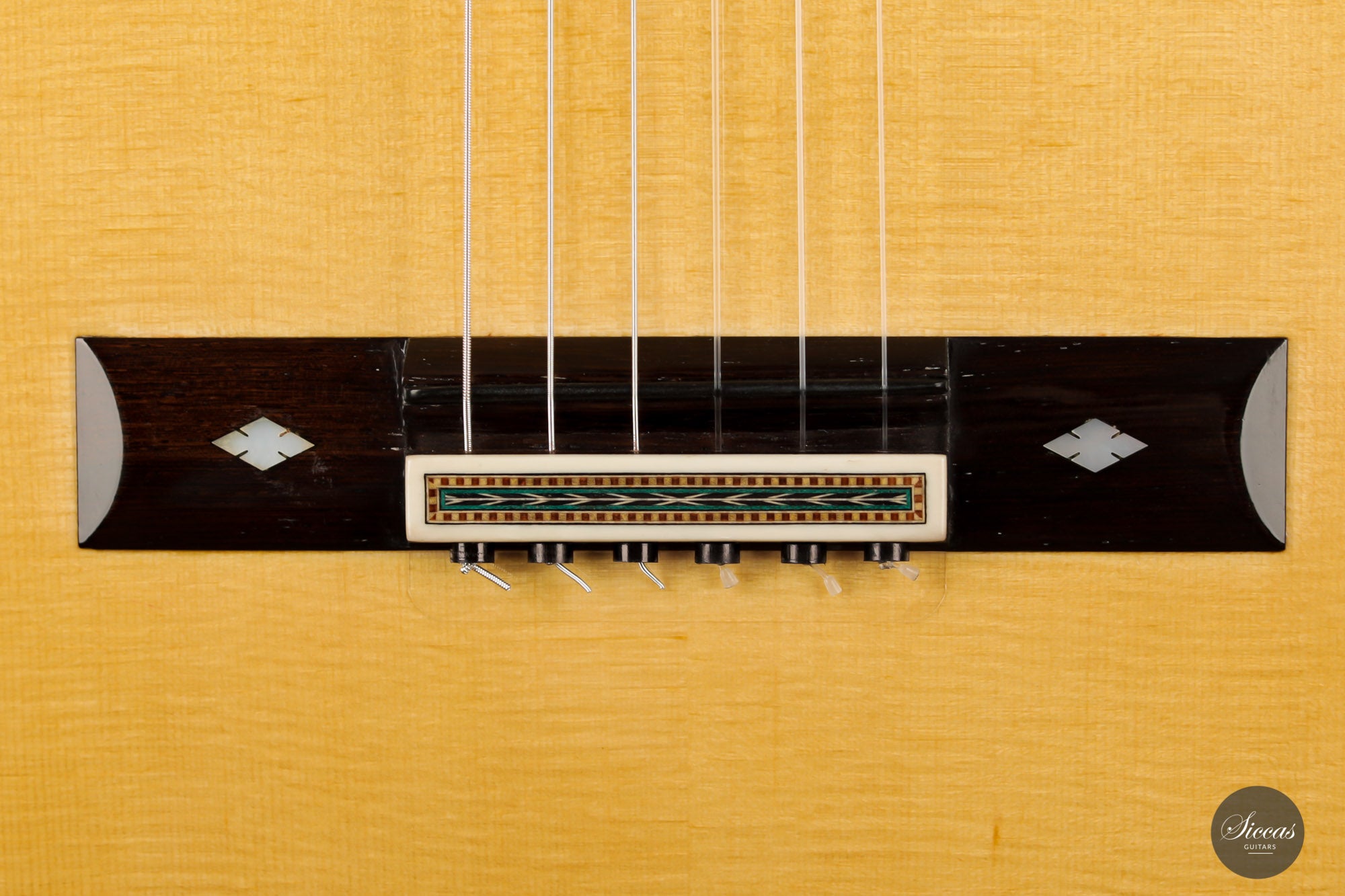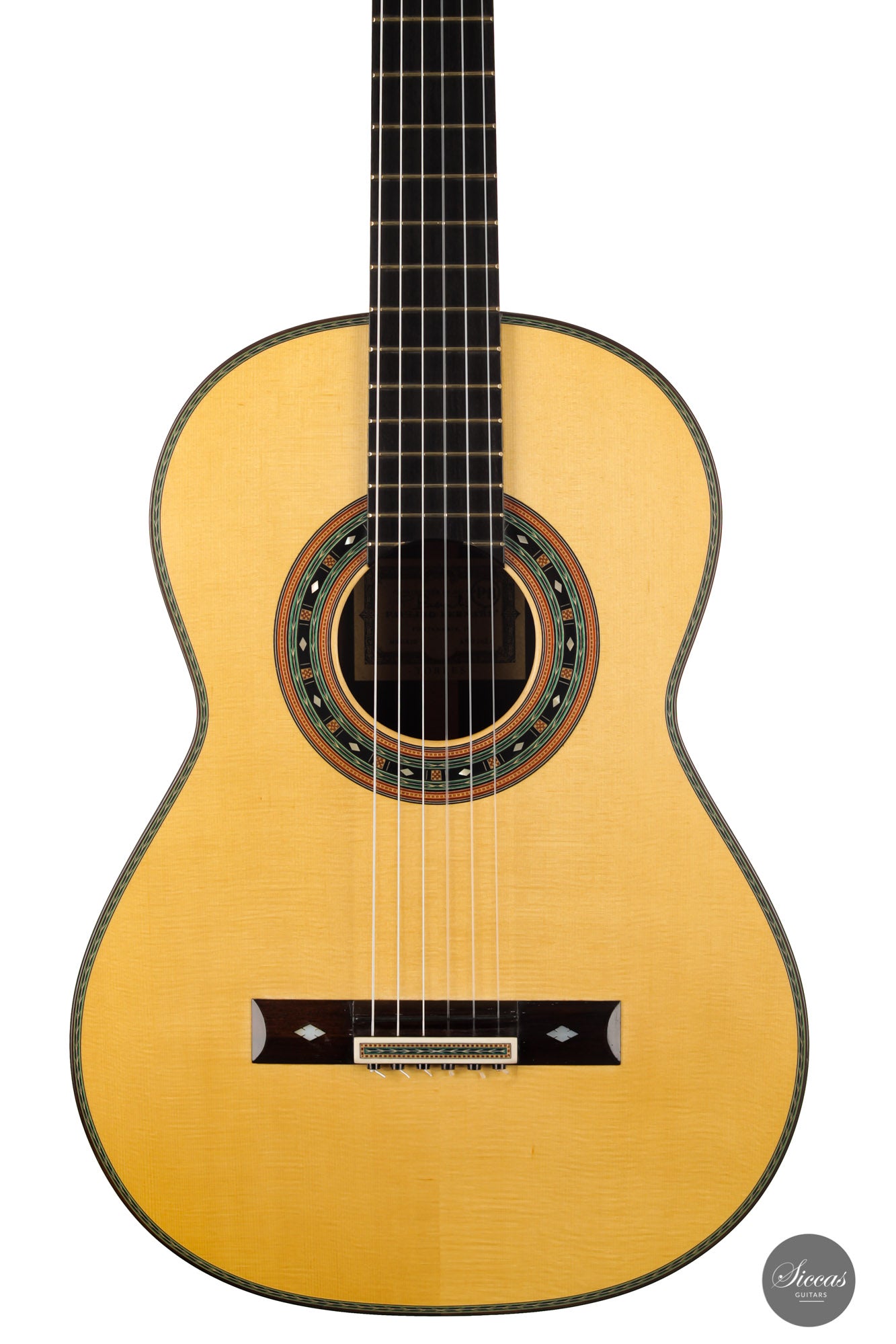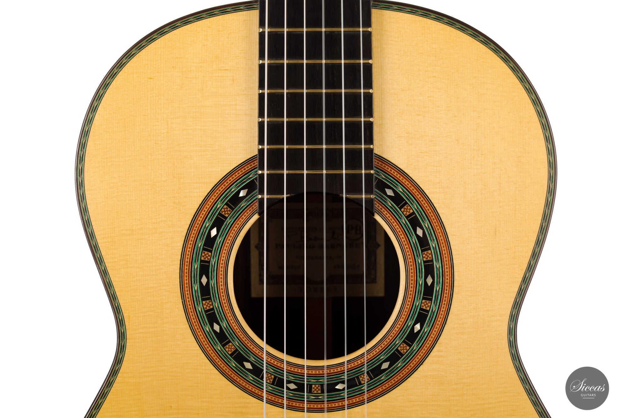The sound of this guitar is spontaneous and playful, very warm, and singing. There is a strong personality in the treble, displaying a very round and Spanish sound. Basses are deep and make a great room for powerful and velvety midrange tones. It is a very easy guitar to play thanks to its slightly shorter scale, and a real delight to the ear for both the guitarist and the audience.