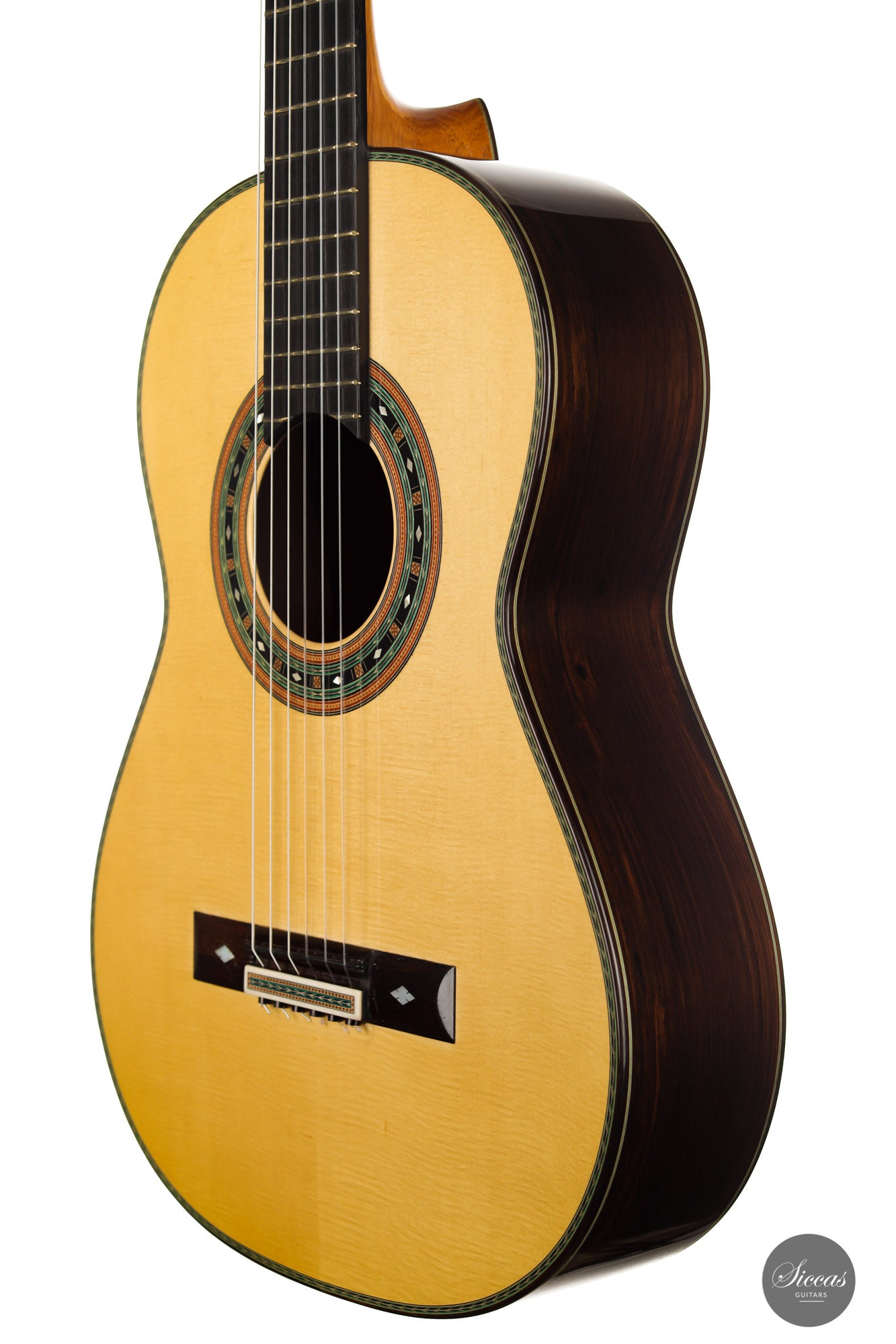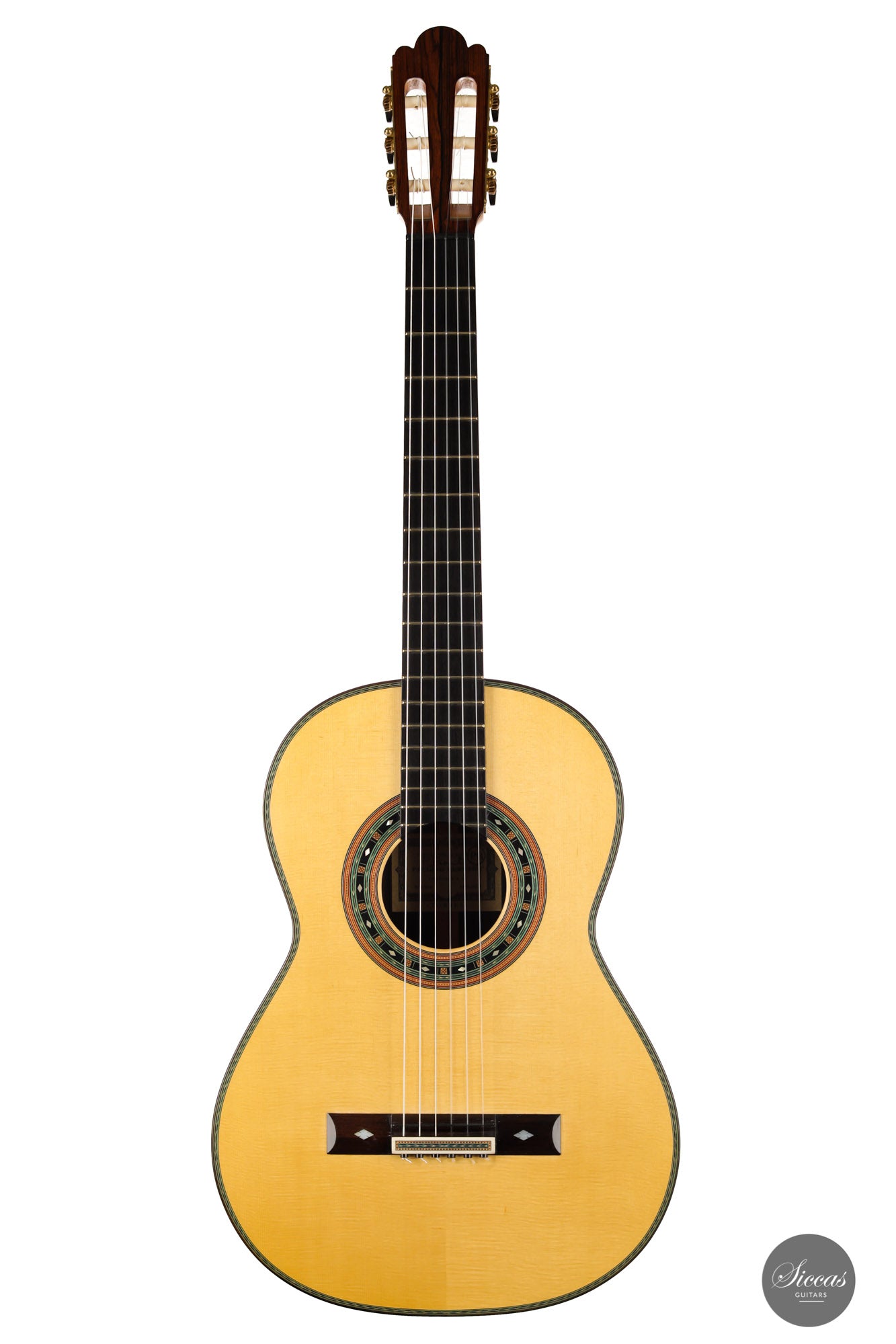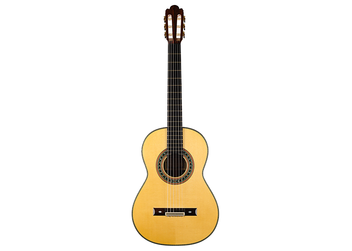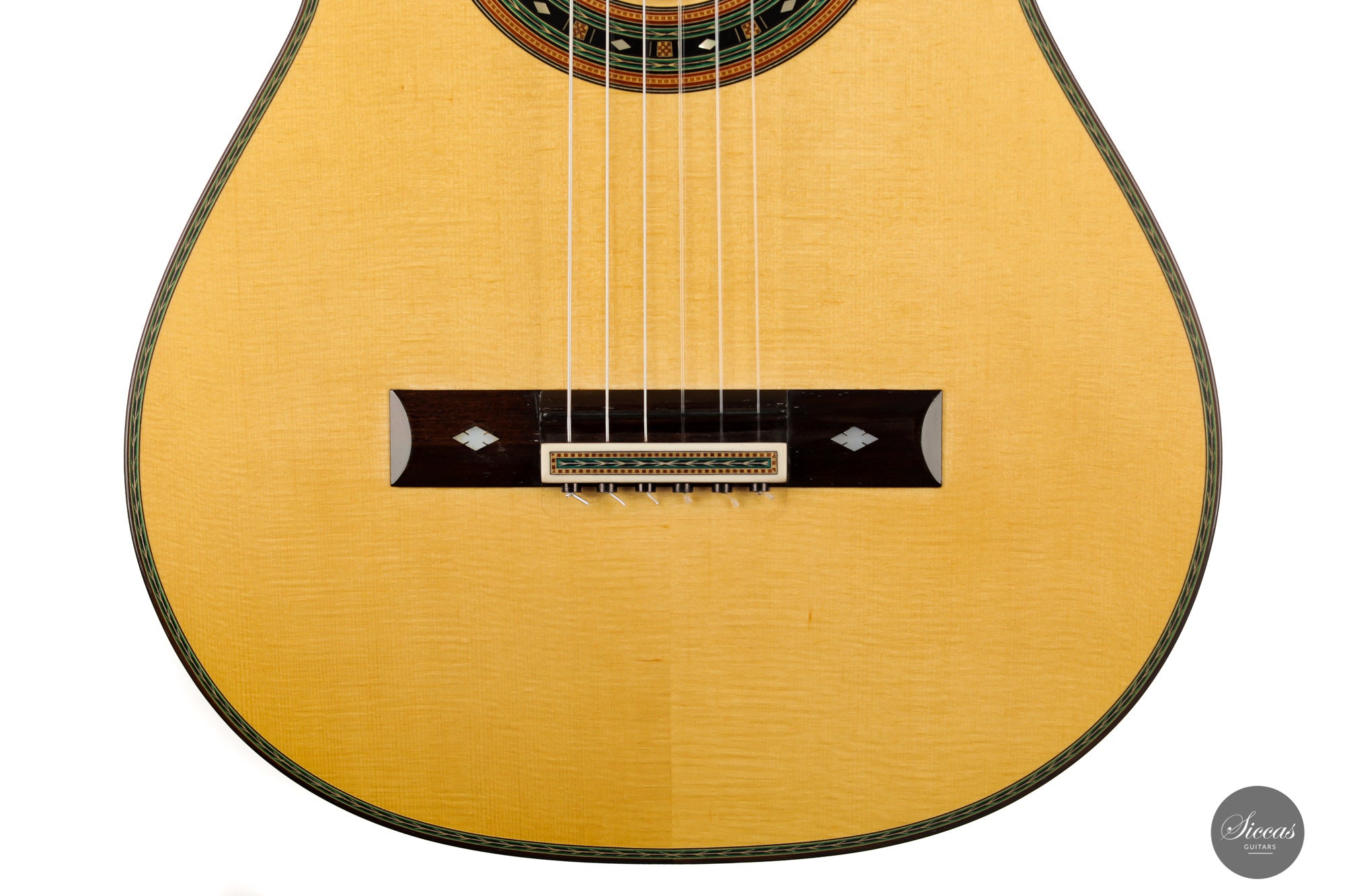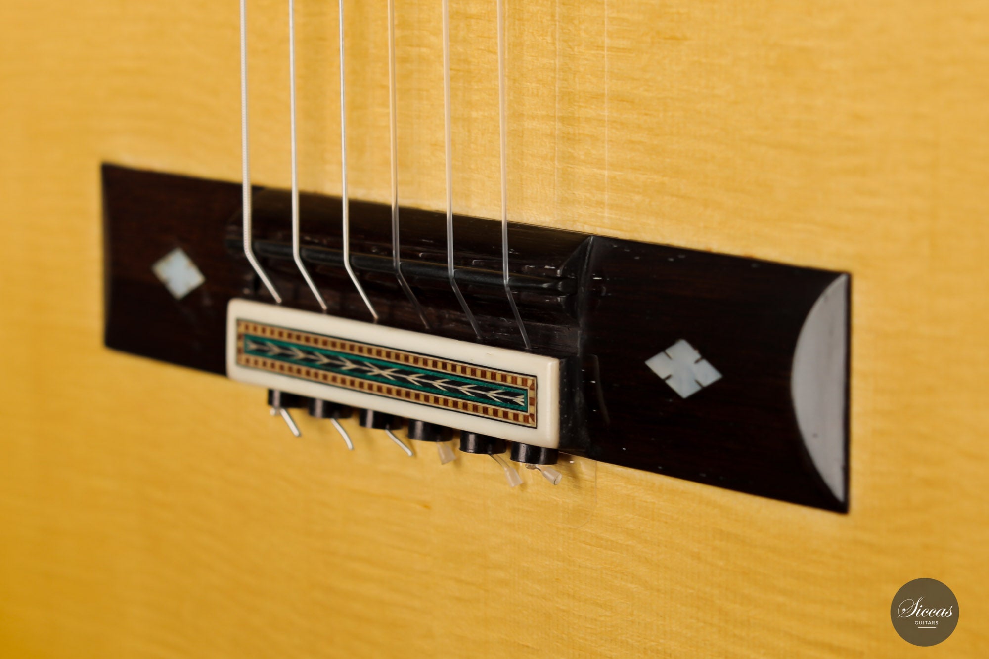 The sound of this guitar is spontaneous and playful, very warm, and singing. There is a strong personality in the treble, displaying a very round and Spanish sound. Basses are deep and make a great room for powerful and velvety midrange tones. It is a very easy guitar to play thanks to its slightly shorter scale, and a real delight to the ear for both the guitarist and the audience.