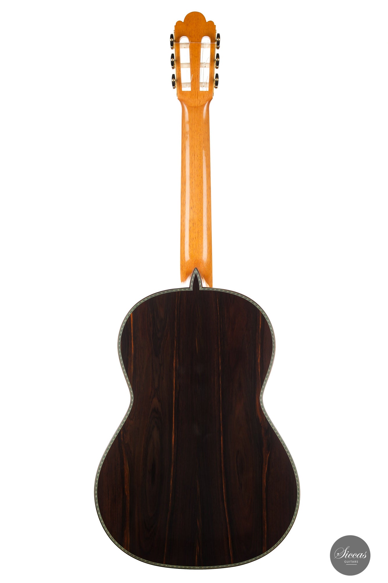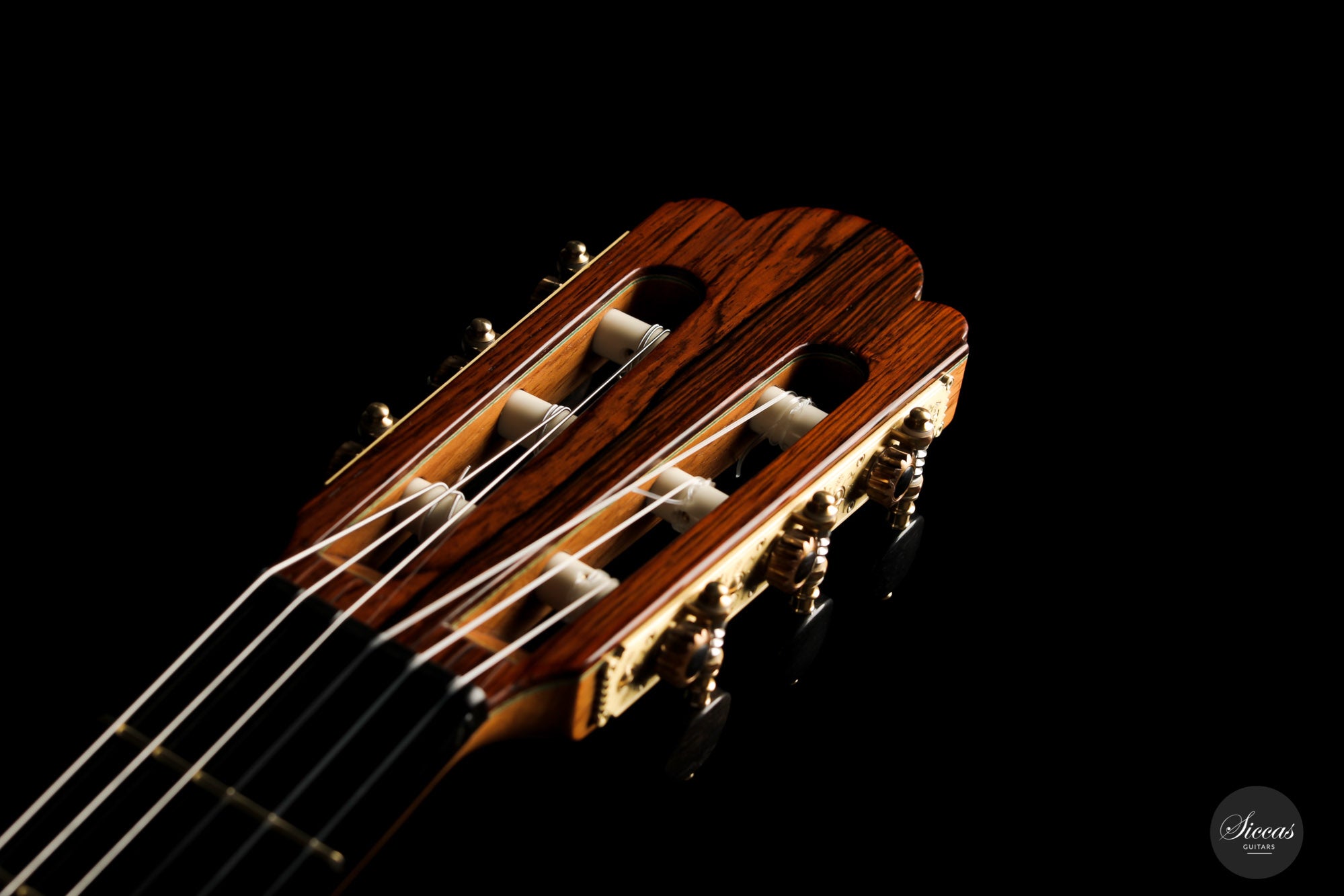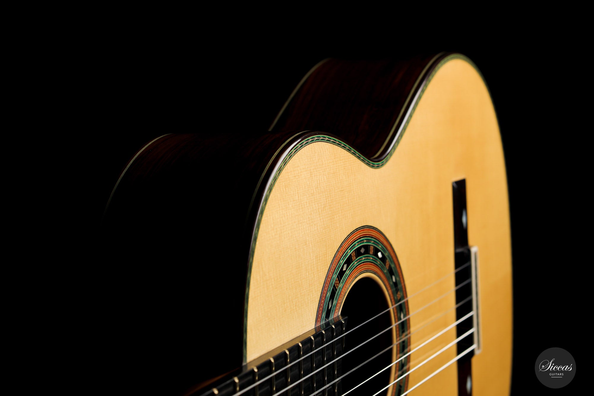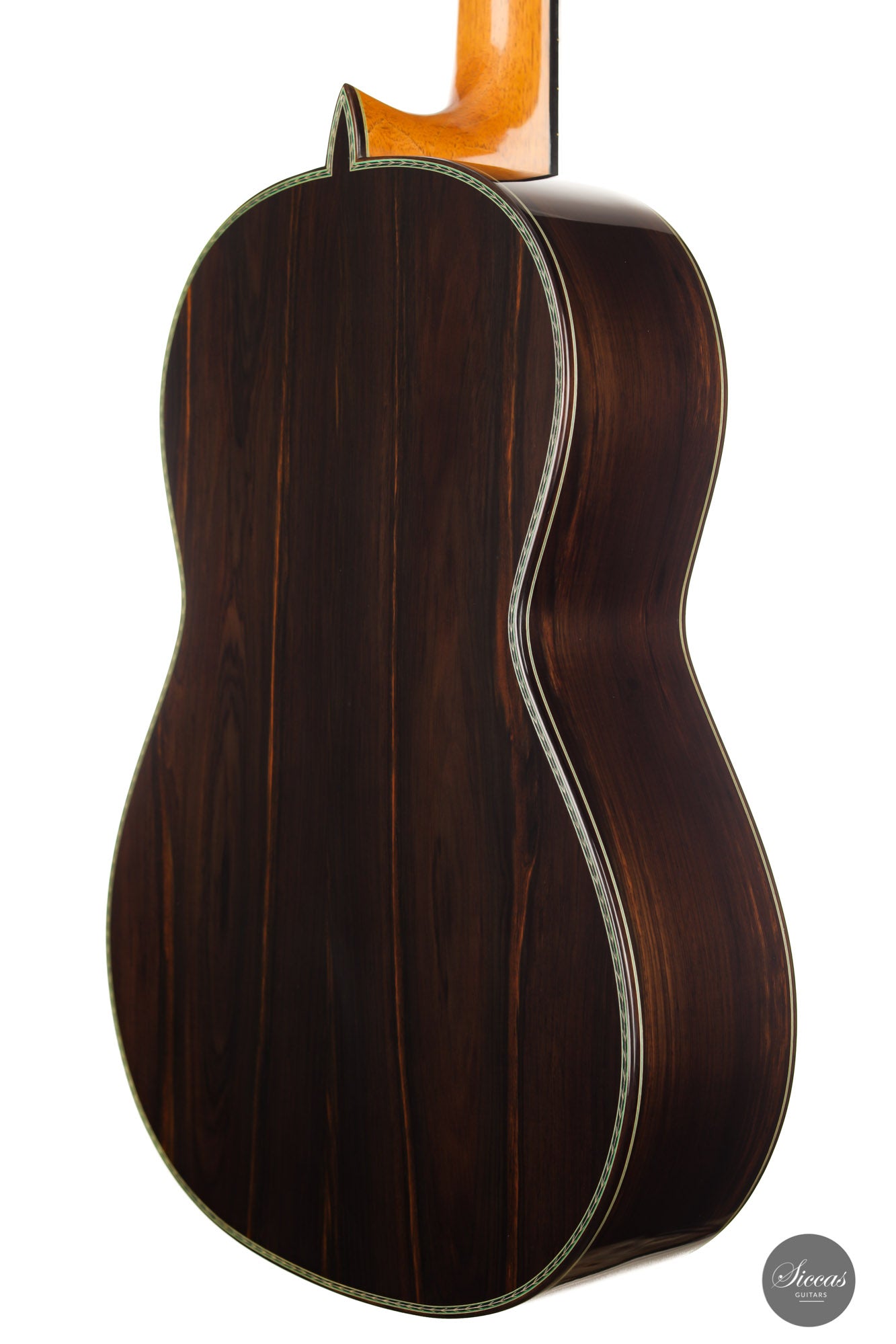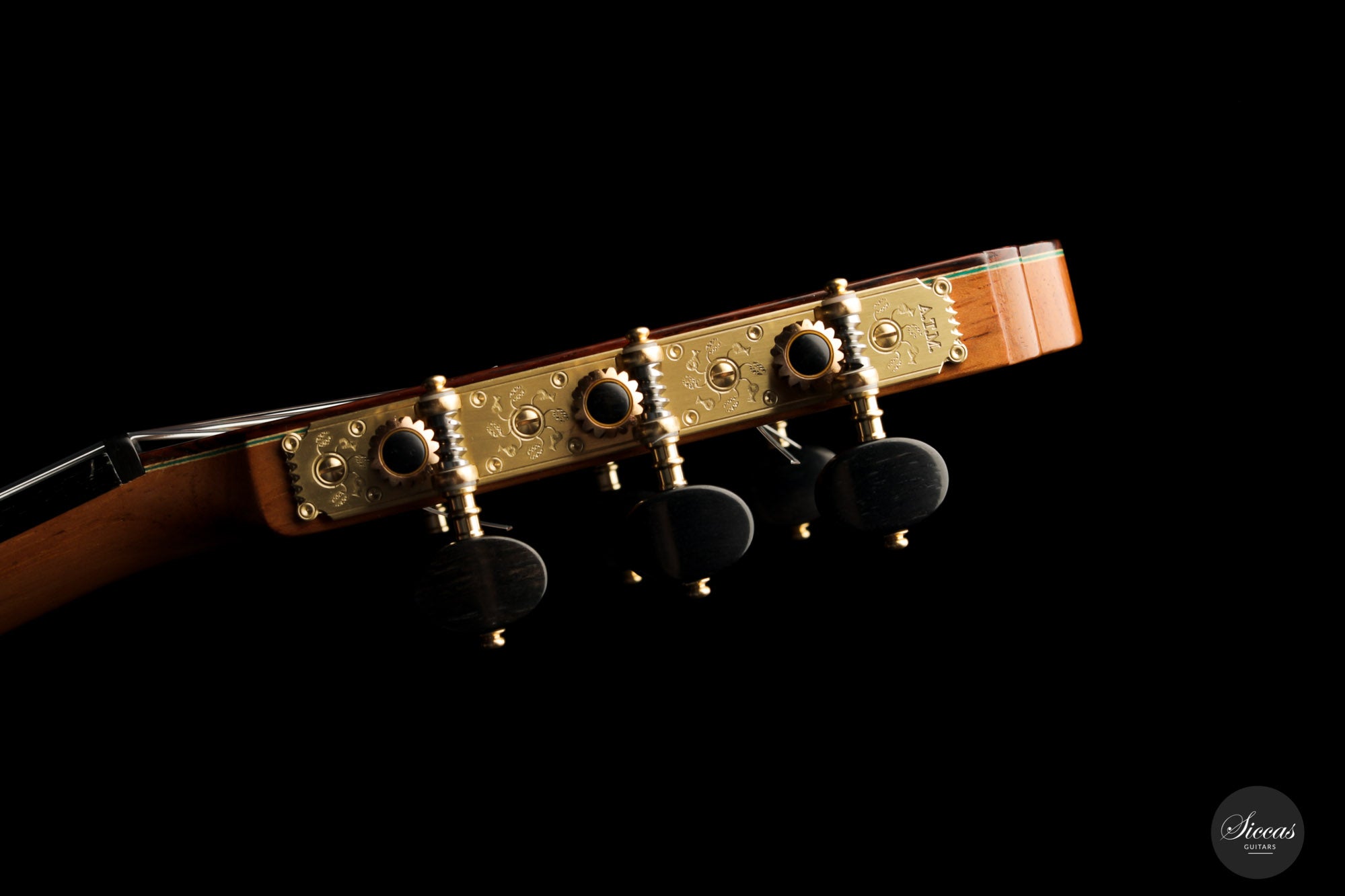 The sound of this guitar is spontaneous and playful, very warm, and singing. There is a strong personality in the treble, displaying a very round and Spanish sound. Basses are deep and make a great room for powerful and velvety midrange tones. It is a very easy guitar to play thanks to its slightly shorter scale, and a real delight to the ear for both the guitarist and the audience.