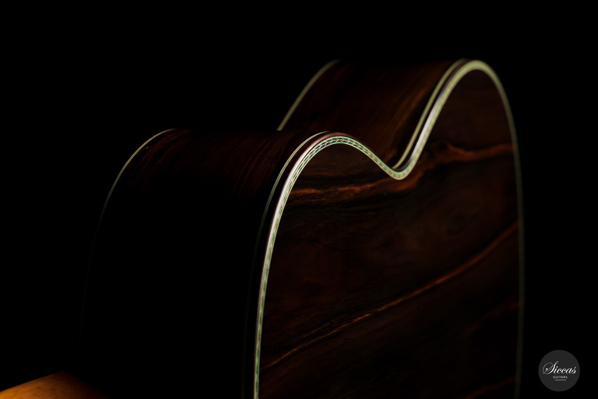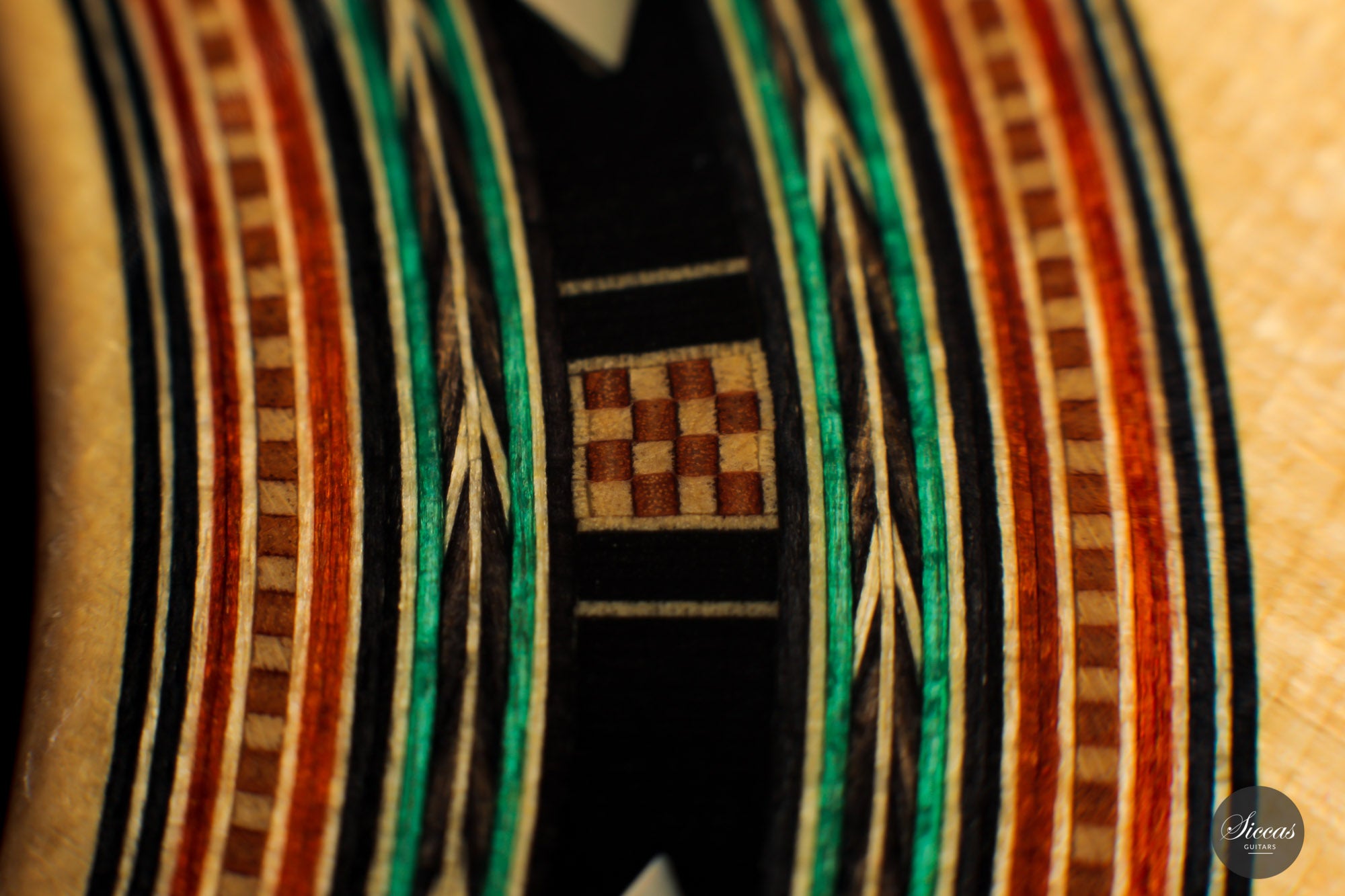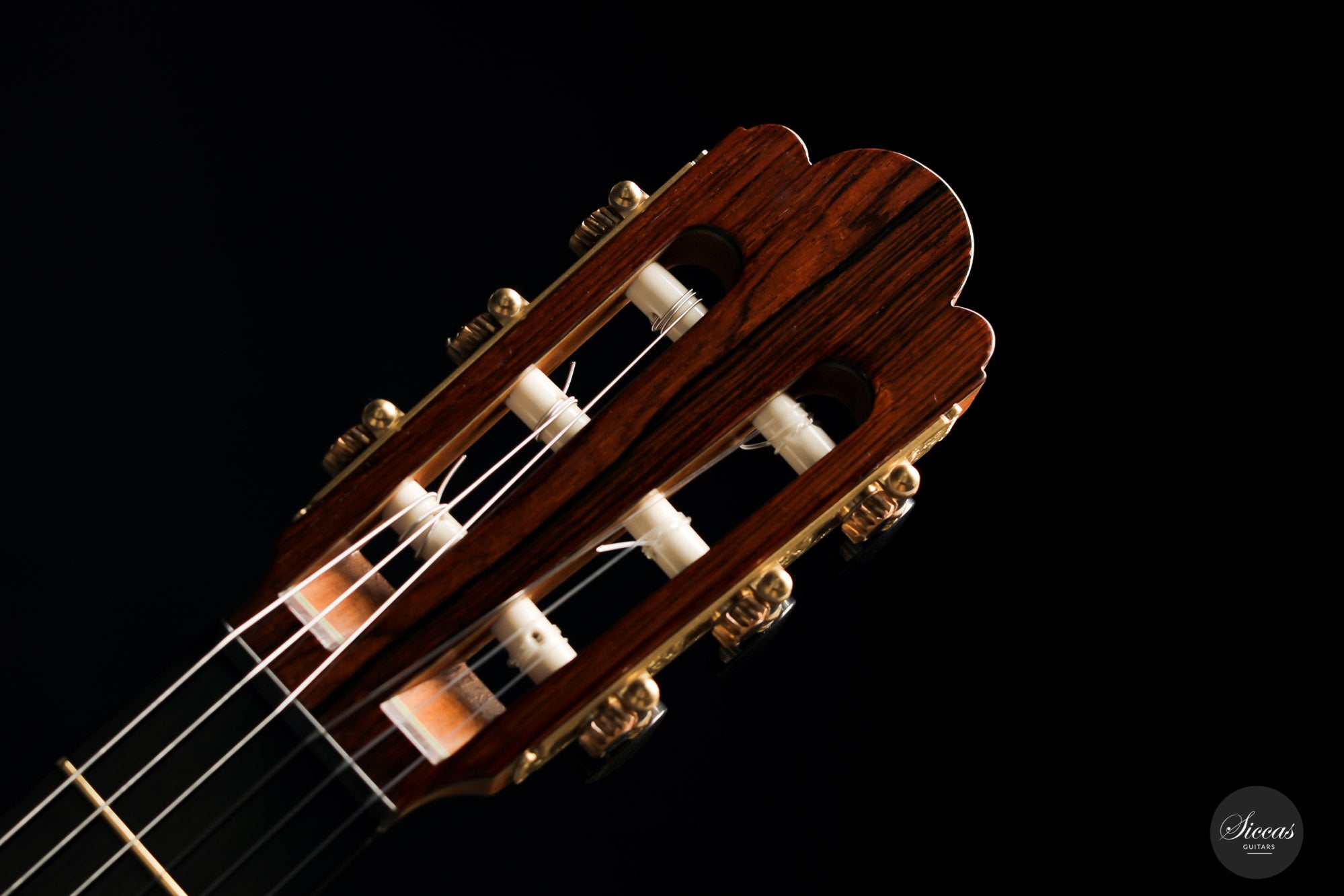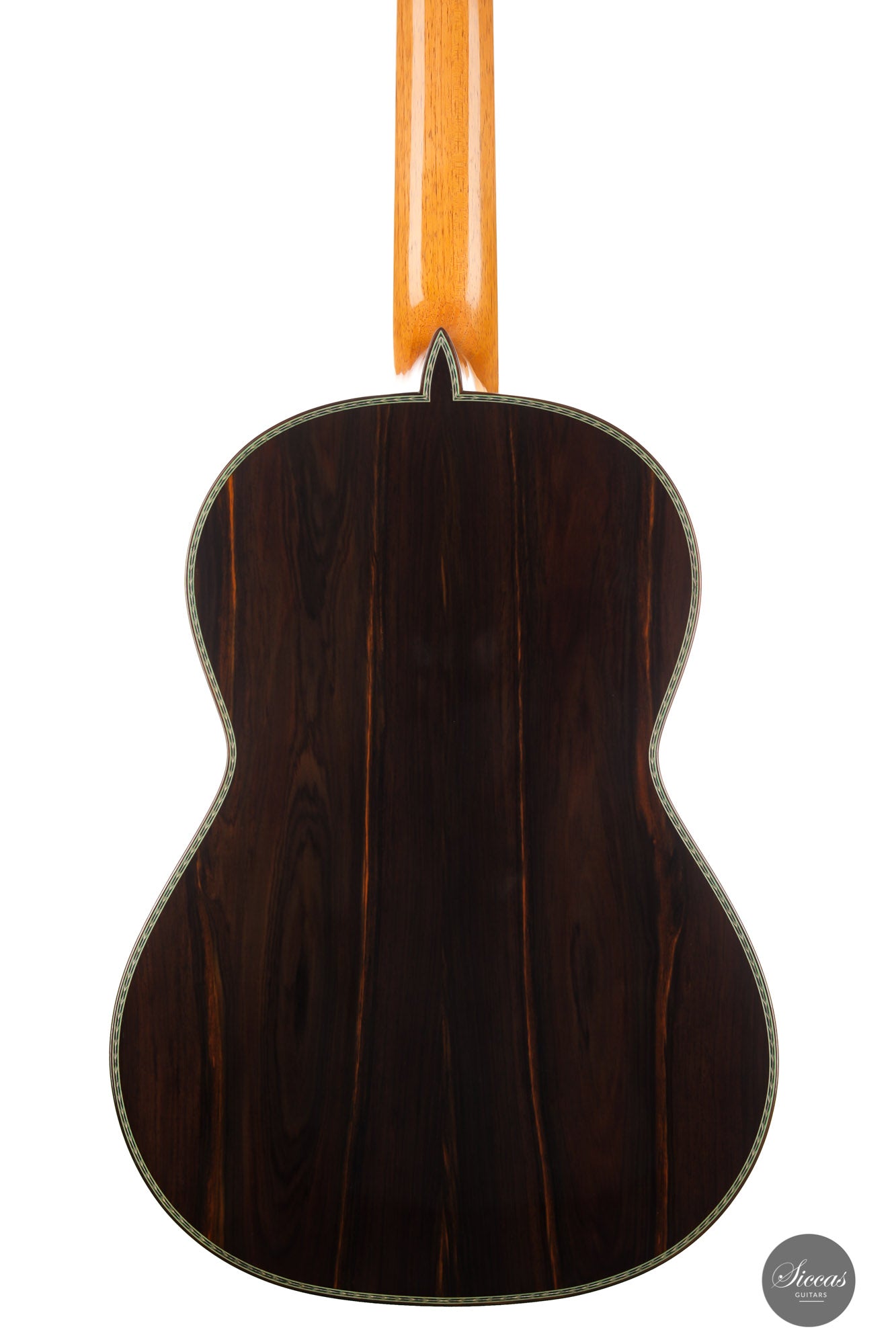 The sound of this guitar is spontaneous and playful, very warm, and singing. There is a strong personality in the treble, displaying a very round and Spanish sound. Basses are deep and make a great room for powerful and velvety midrange tones. It is a very easy guitar to play thanks to its slightly shorter scale, and a real delight to the ear for both the guitarist and the audience.