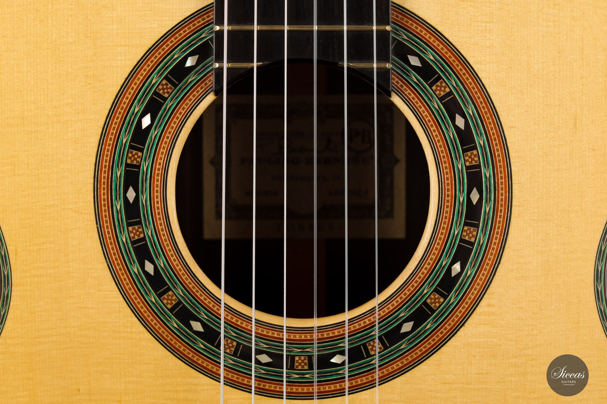 This superb Torres model guitar is signed on the label by Paulino Bernabé Jr. It is a beautiful tribute to the father of the classical guitar, Don Antonio de Torres, and this highly collectible instrument is a true masterpiece. It is interesting to note that Paulino Bernabé owns two Antonio de Torres guitars, including an 1864 Torres that was a strong inspiration for this model. The latter features the characteristic three-lobed head as well as a slightly narrower body. In addition, this instrument has a 645mm scale, slightly shorter than the standard 650mm, which Antonio de Torres regularly used. Beyond these construction details, this guitar has rich marquetry, with many nods to the master’s guitars, such as the mother-of-pearl inclusions on the bridge and the rosette, and the use of checkerboard mosaic and herringbone. Finally, the Alessi tuning machines are replicas of the original “Jerom” often used by Torres.
