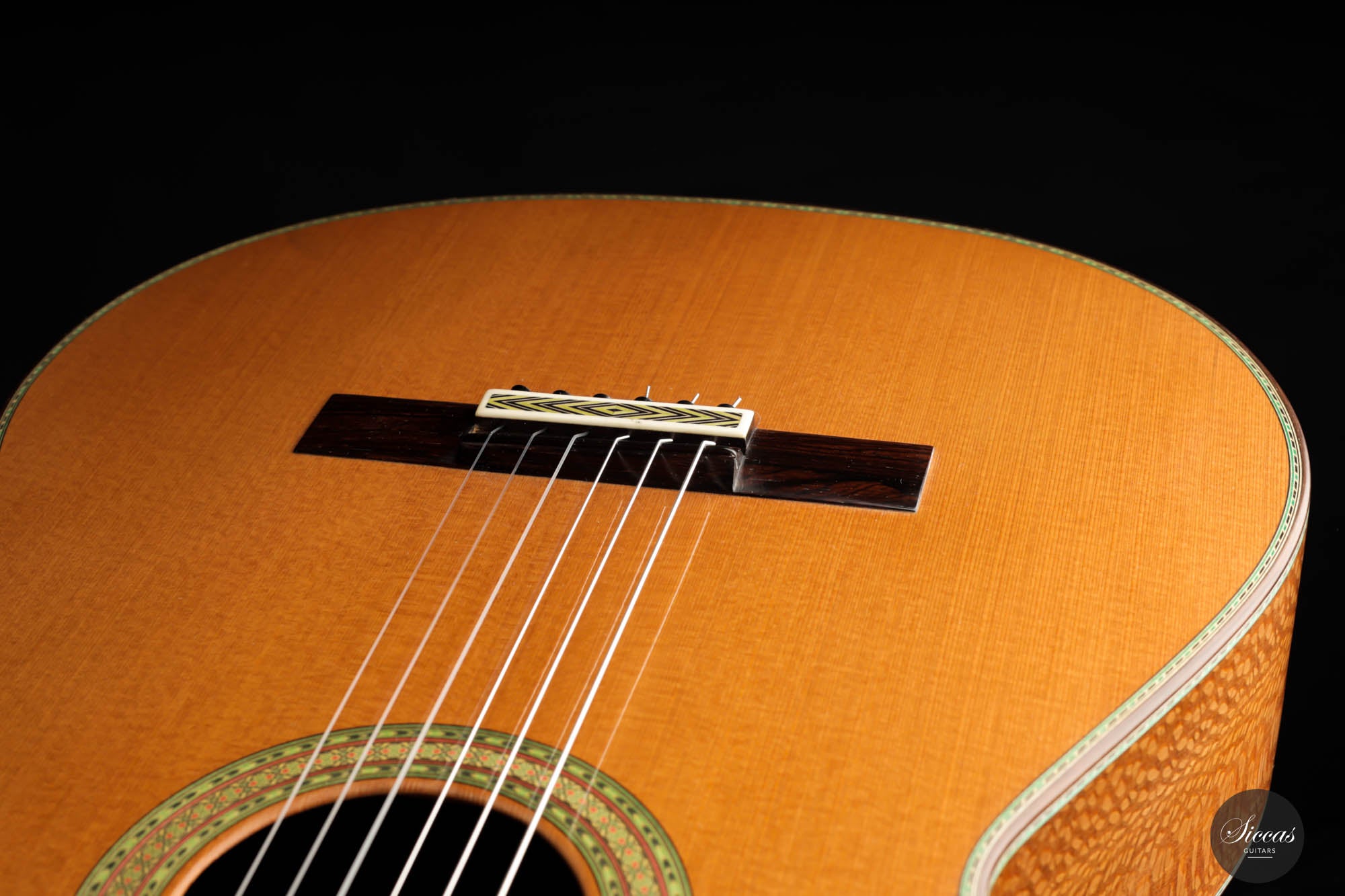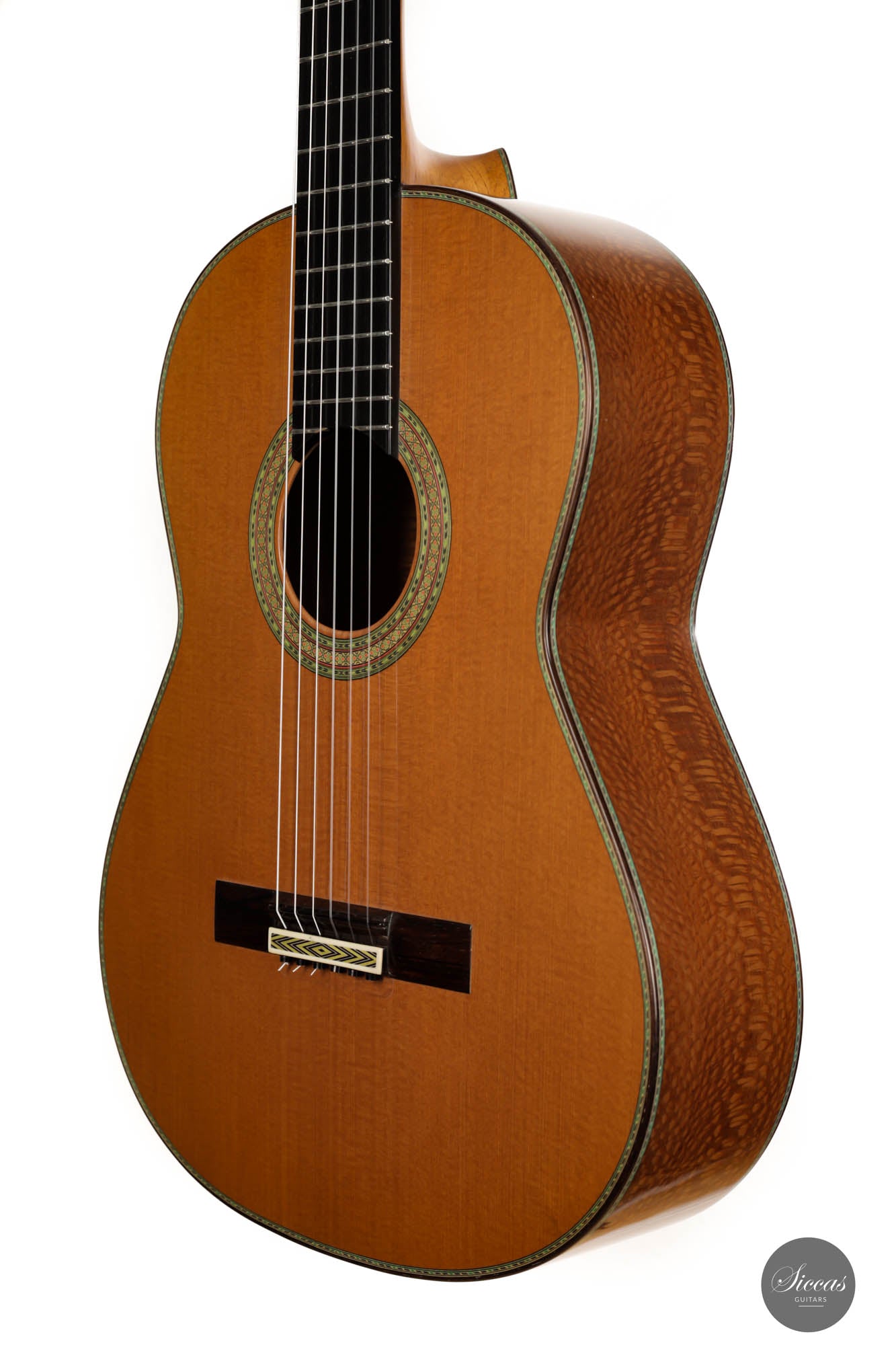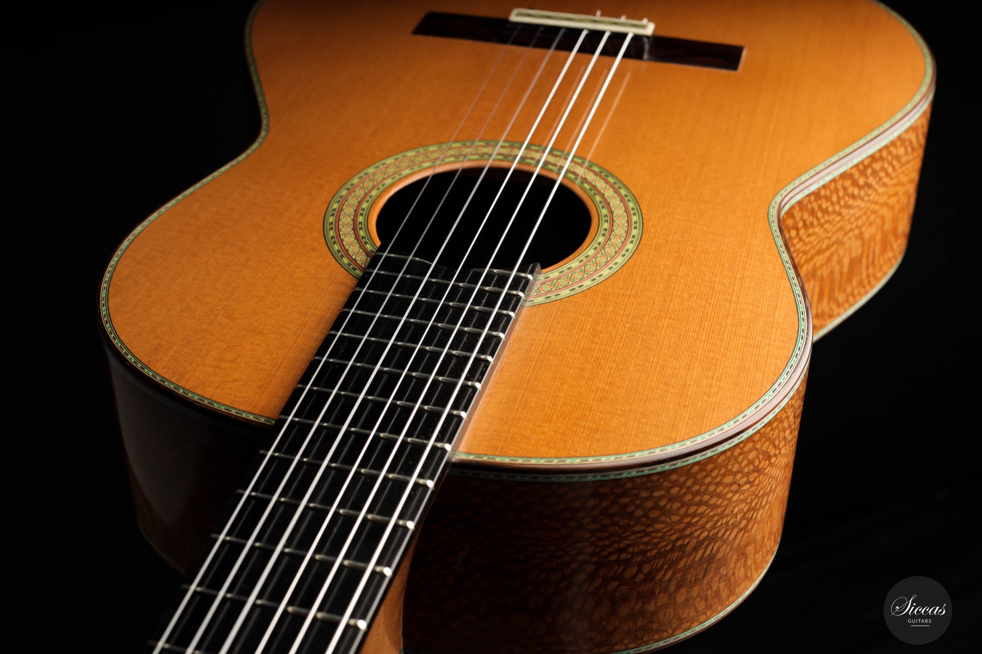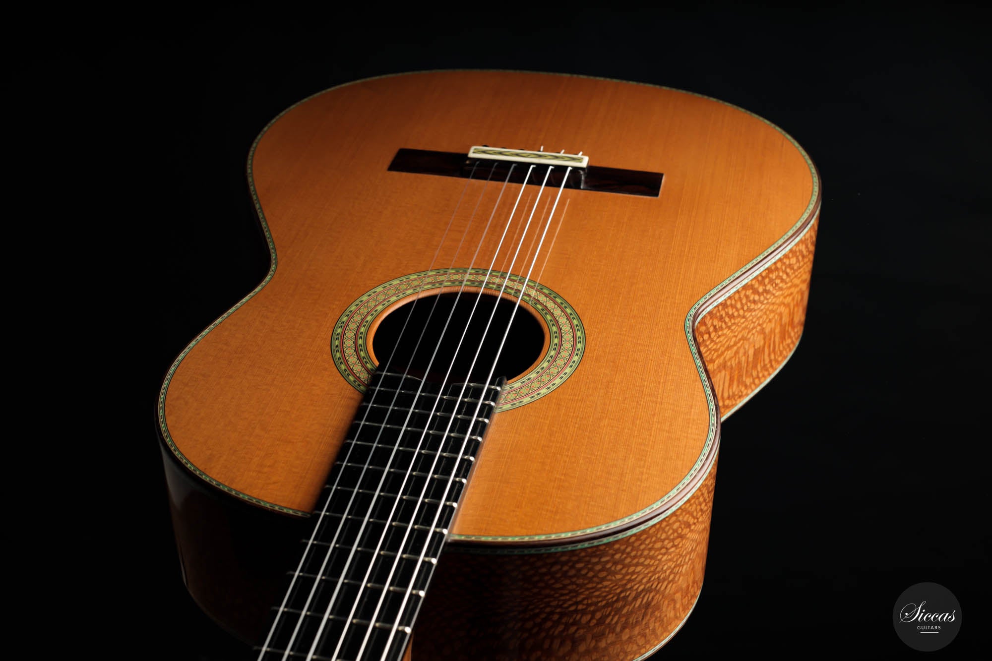 This third guitar of the Colección series features a stunning Louro Preto back and sides with fabulous patterns. It is an absolute dream to look at and the dark, reddish cedar top not only gives this guitar an outstanding artful appearance, but also perfectly matches the warm and mysterious timbre of this fine instrument.As a modern Spanish guitar, it fulfils all the requirements of a fine concert instrument, such as a great sound volume and easy playability.