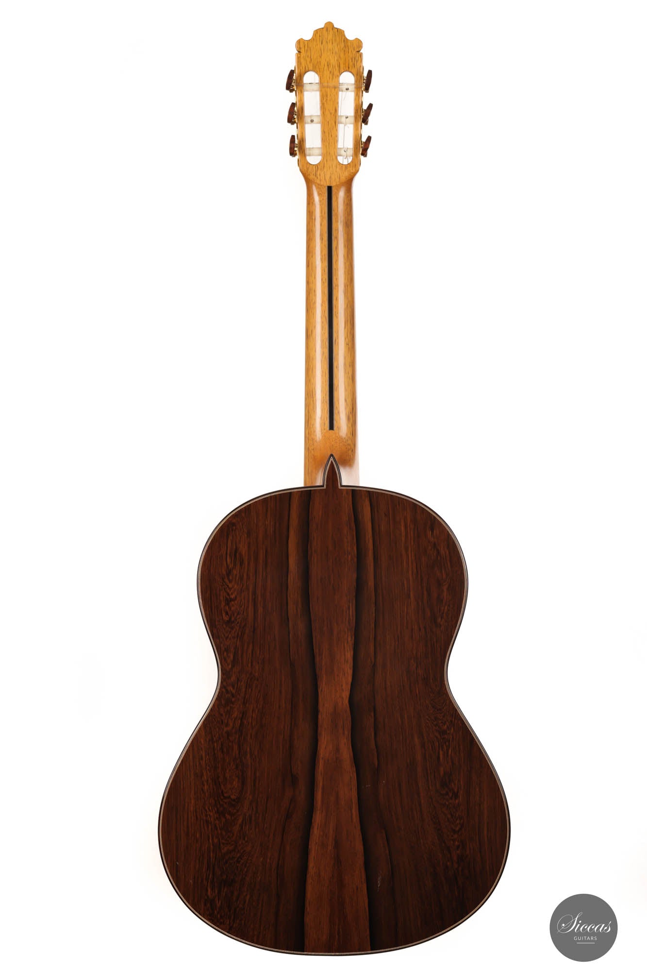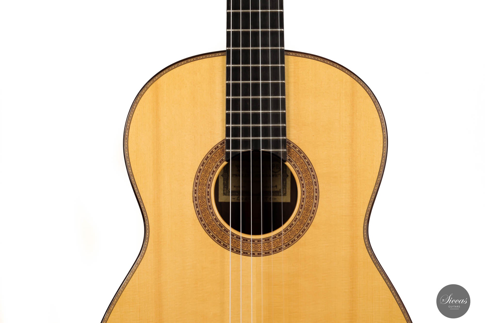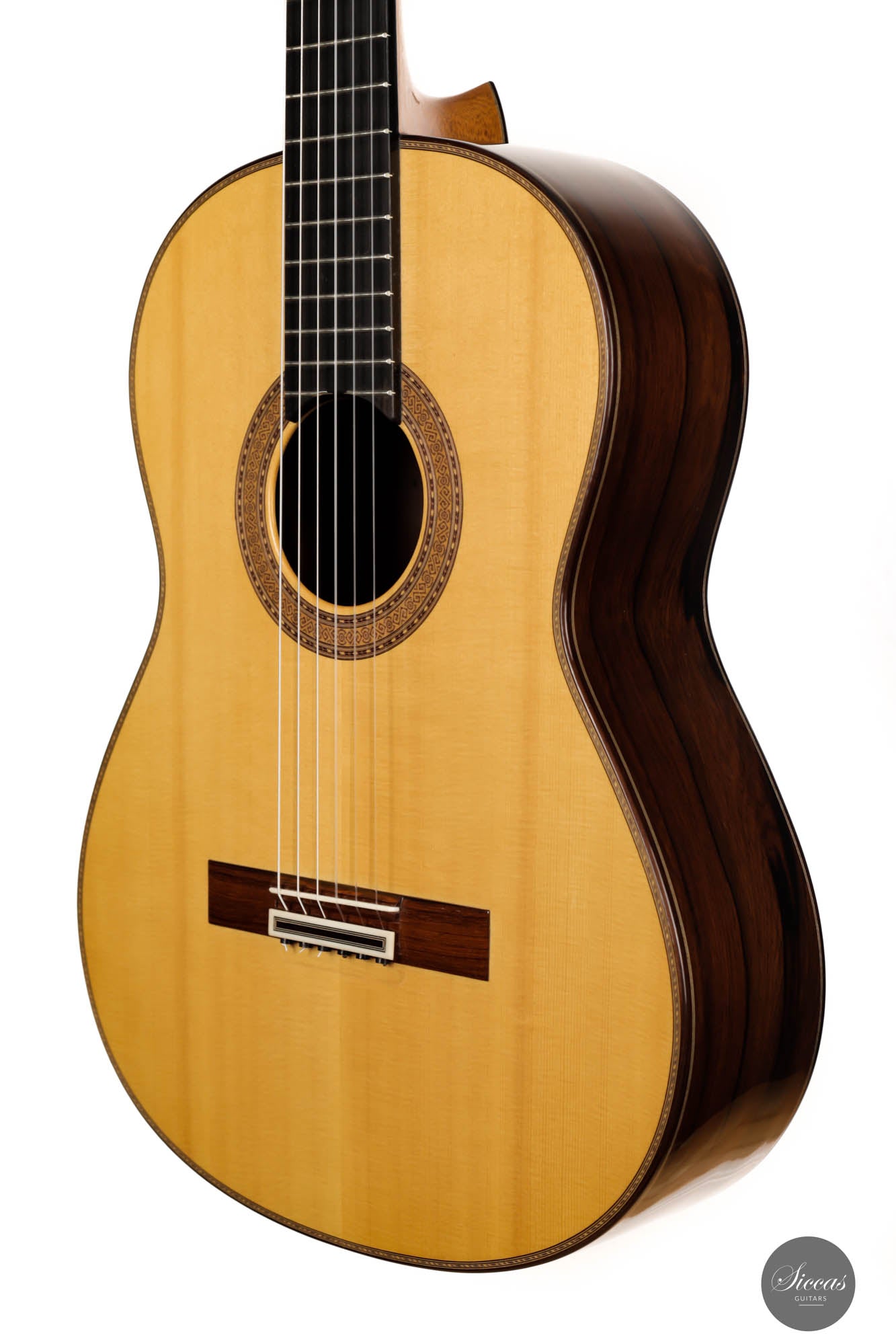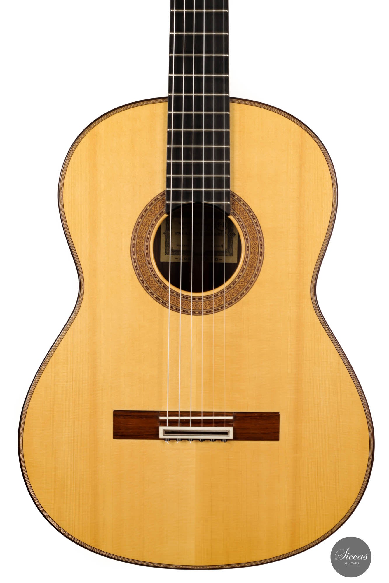 The Paulino Bernabé Concierto guitar model from 2019 is a remarkable instrument designed for the professional guitar player who seeks high-quality sound and projection for concert performances. This guitar boasts an impressive volume and projection, making it ideal for filling large venues with its clear, refined, and balanced tone that boasts a long bell-like sustain. The guitar's voice is immensely satisfying, offering a wide range of sound colors, dynamic possibilities, and generous resonance that make it a truly expressive instrument. In addition to its exceptional sound quality, the craftsmanship and choice of materials make this guitar a stunning visual work of art. The spruce top is gorgeously matched with the back and sides made of superb Madagascar rosewood, offering an alluring harmony of colors and patterns that exude sophistication and elegance. This pre-loved instrument is in excellent condition, with only several superficial playing marks, providing an excellent opportunity for guitar enthusiasts to own a great Madrid-style guitar at a very attractive price.