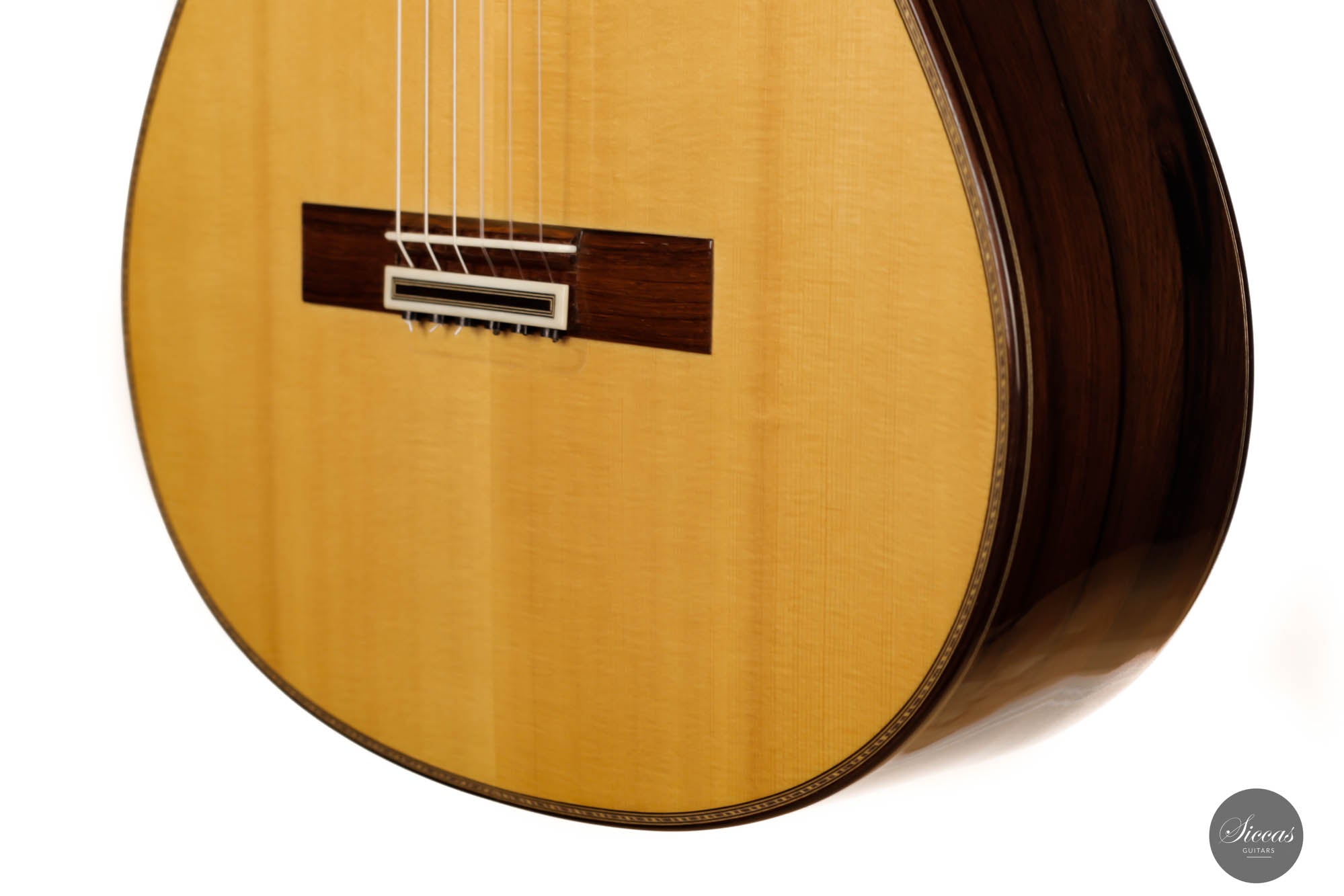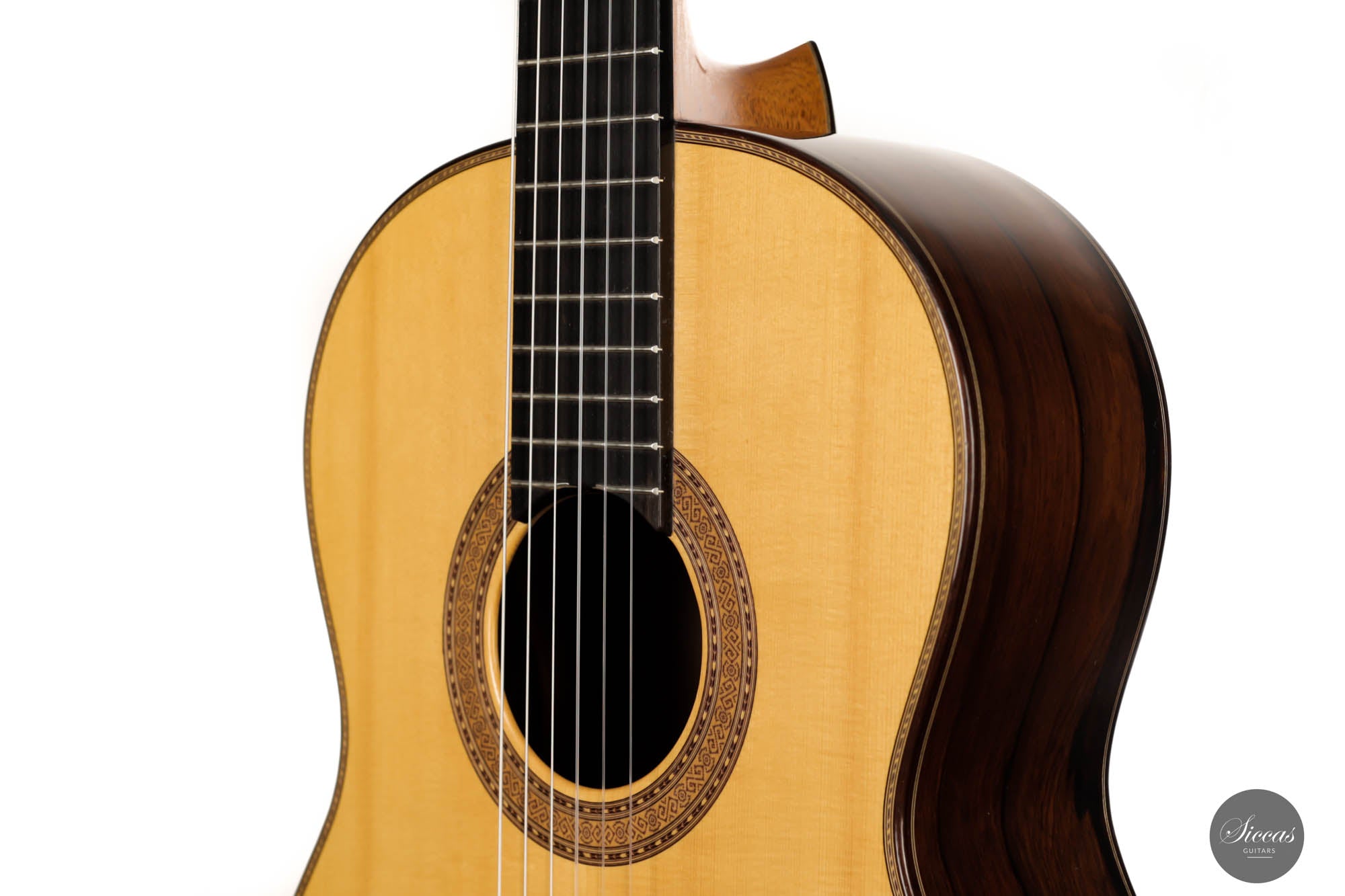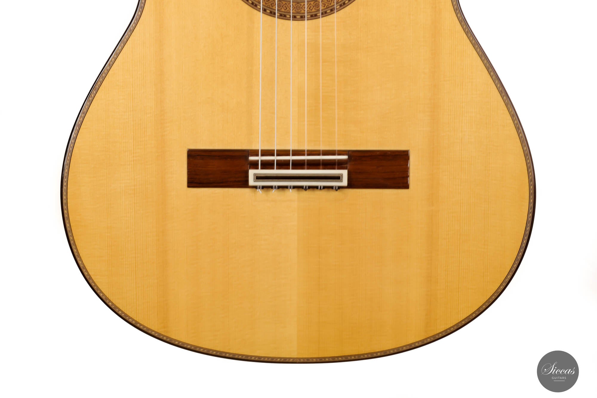 The Paulino Bernabé Concierto guitar model from 2019 is a remarkable instrument designed for the professional guitar player who seeks high-quality sound and projection for concert performances. This guitar boasts an impressive volume and projection, making it ideal for filling large venues with its clear, refined, and balanced tone that boasts a long bell-like sustain. The guitar's voice is immensely satisfying, offering a wide range of sound colors, dynamic possibilities, and generous resonance that make it a truly expressive instrument. In addition to its exceptional sound quality, the craftsmanship and choice of materials make this guitar a stunning visual work of art. The spruce top is gorgeously matched with the back and sides made of superb Madagascar rosewood, offering an alluring harmony of colors and patterns that exude sophistication and elegance. This pre-loved instrument is in excellent condition, with only several superficial playing marks, providing an excellent opportunity for guitar enthusiasts to own a great Madrid-style guitar at a very attractive price.