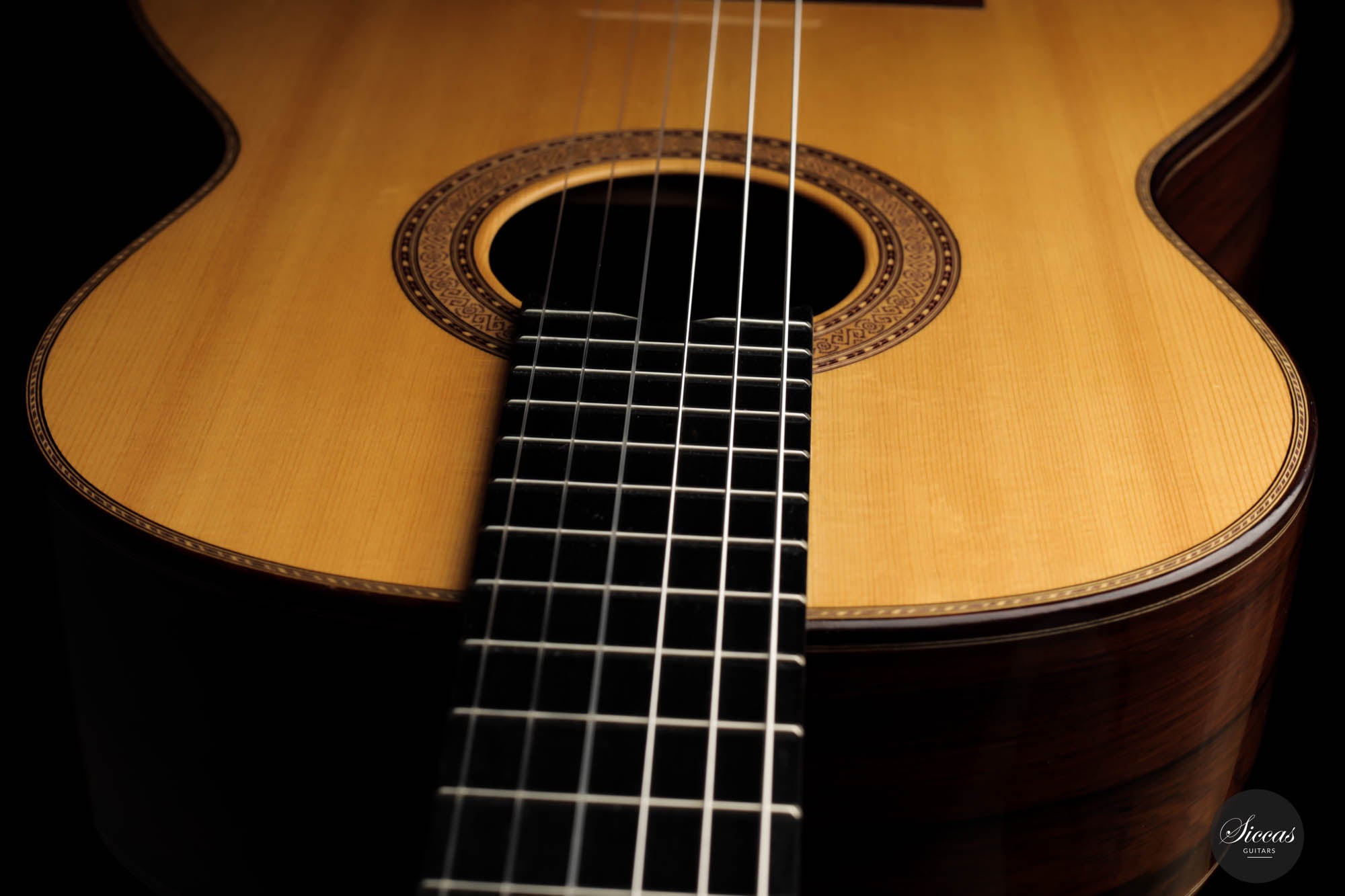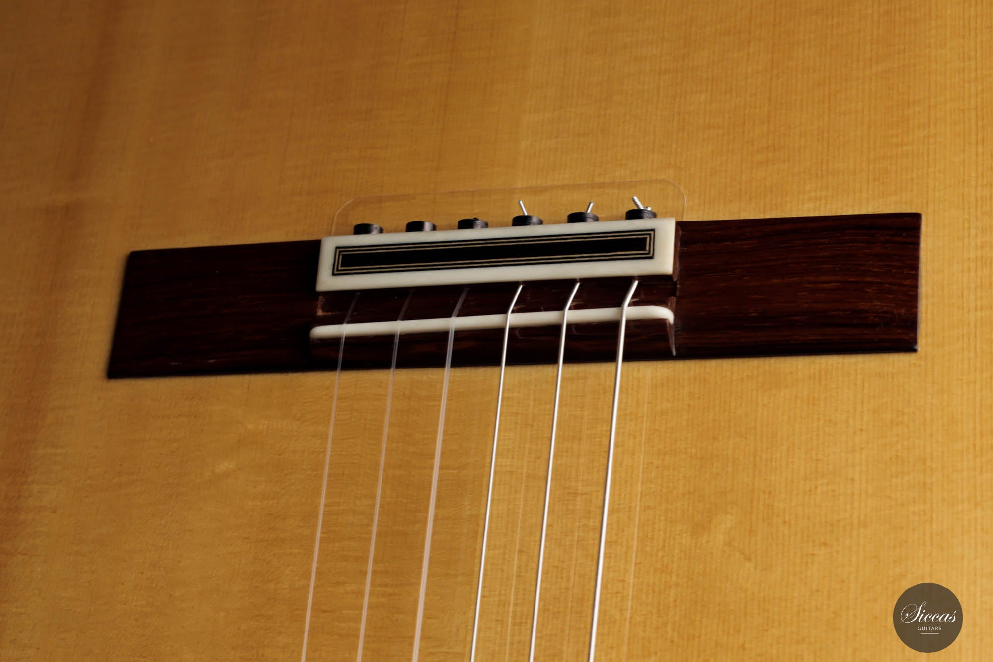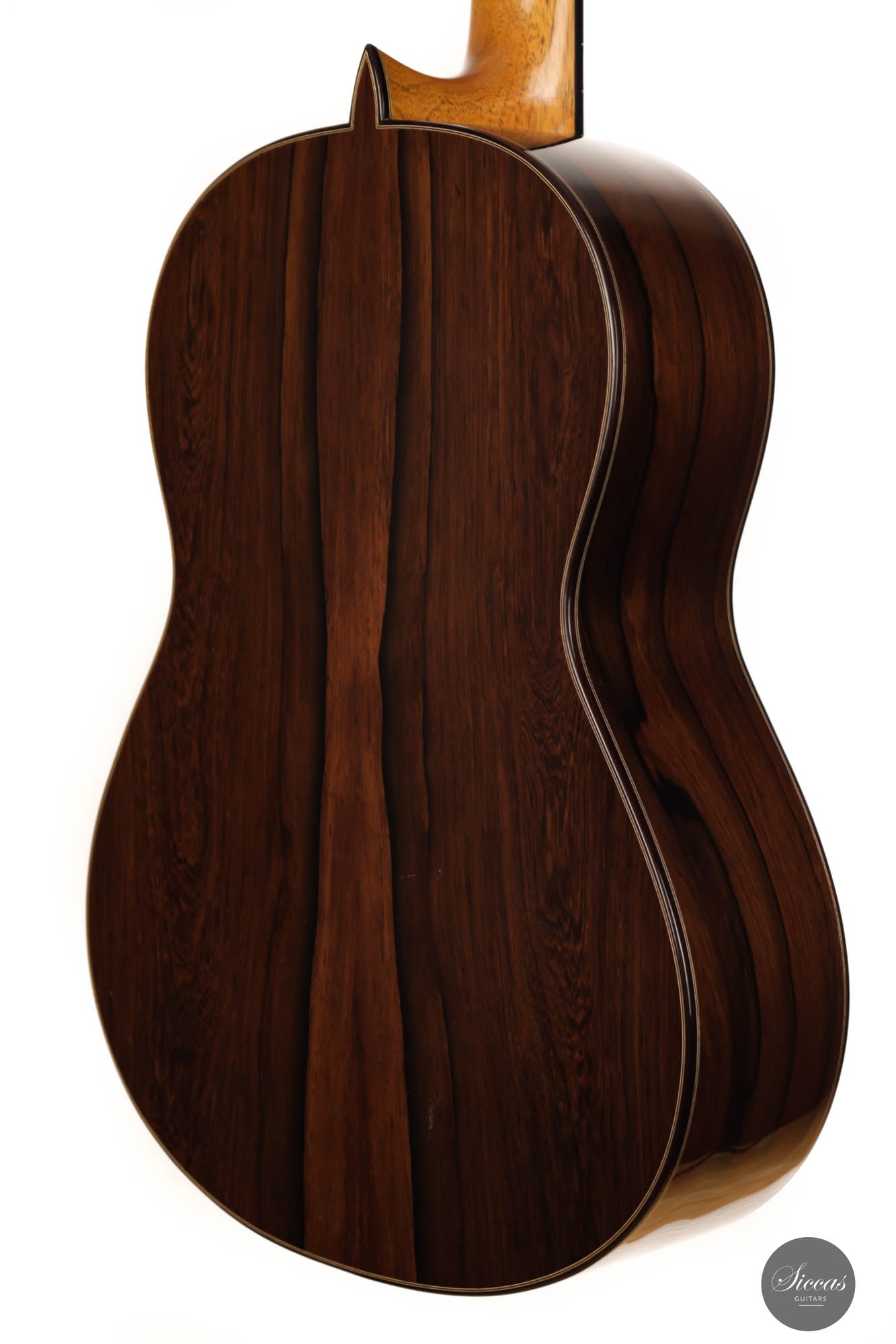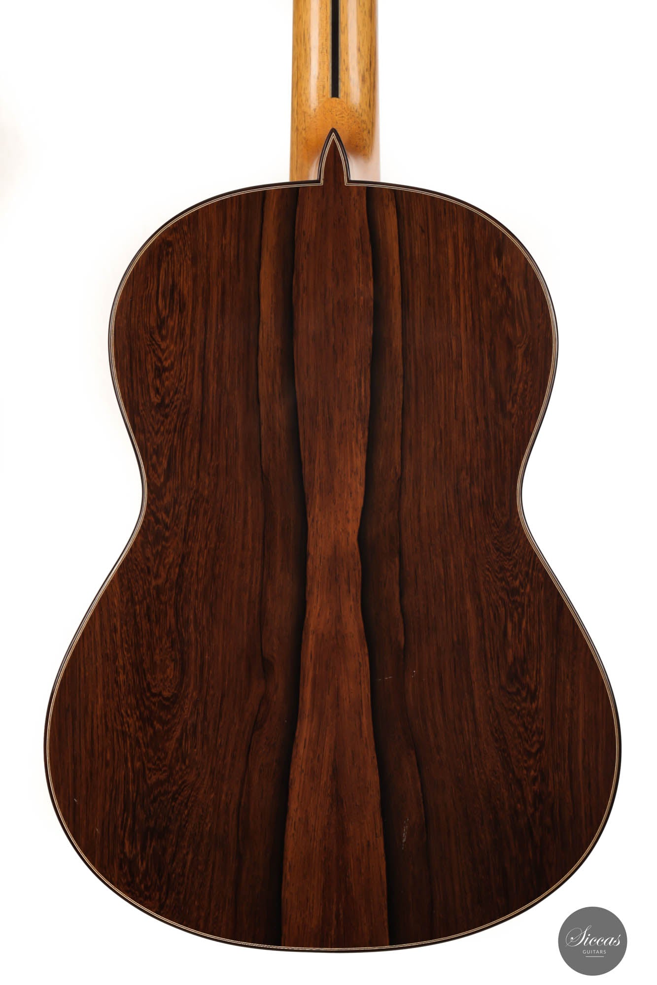 The Paulino Bernabé Concierto guitar model from 2019 is a remarkable instrument designed for the professional guitar player who seeks high-quality sound and projection for concert performances. This guitar boasts an impressive volume and projection, making it ideal for filling large venues with its clear, refined, and balanced tone that boasts a long bell-like sustain. The guitar's voice is immensely satisfying, offering a wide range of sound colors, dynamic possibilities, and generous resonance that make it a truly expressive instrument. In addition to its exceptional sound quality, the craftsmanship and choice of materials make this guitar a stunning visual work of art. The spruce top is gorgeously matched with the back and sides made of superb Madagascar rosewood, offering an alluring harmony of colors and patterns that exude sophistication and elegance. This pre-loved instrument is in excellent condition, with only several superficial playing marks, providing an excellent opportunity for guitar enthusiasts to own a great Madrid-style guitar at a very attractive price.