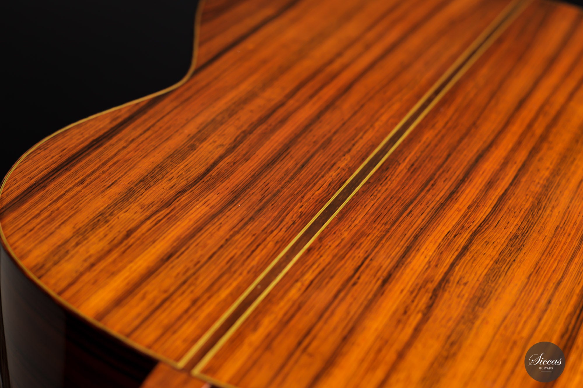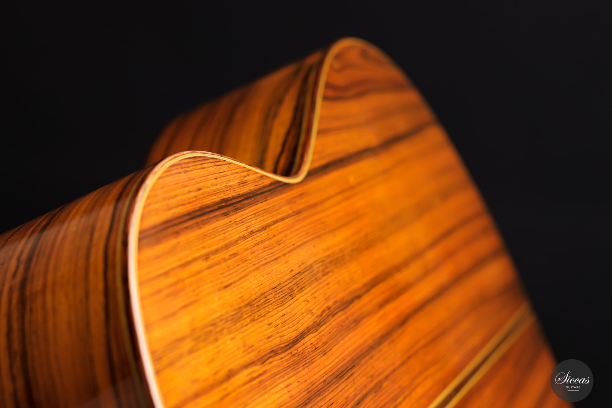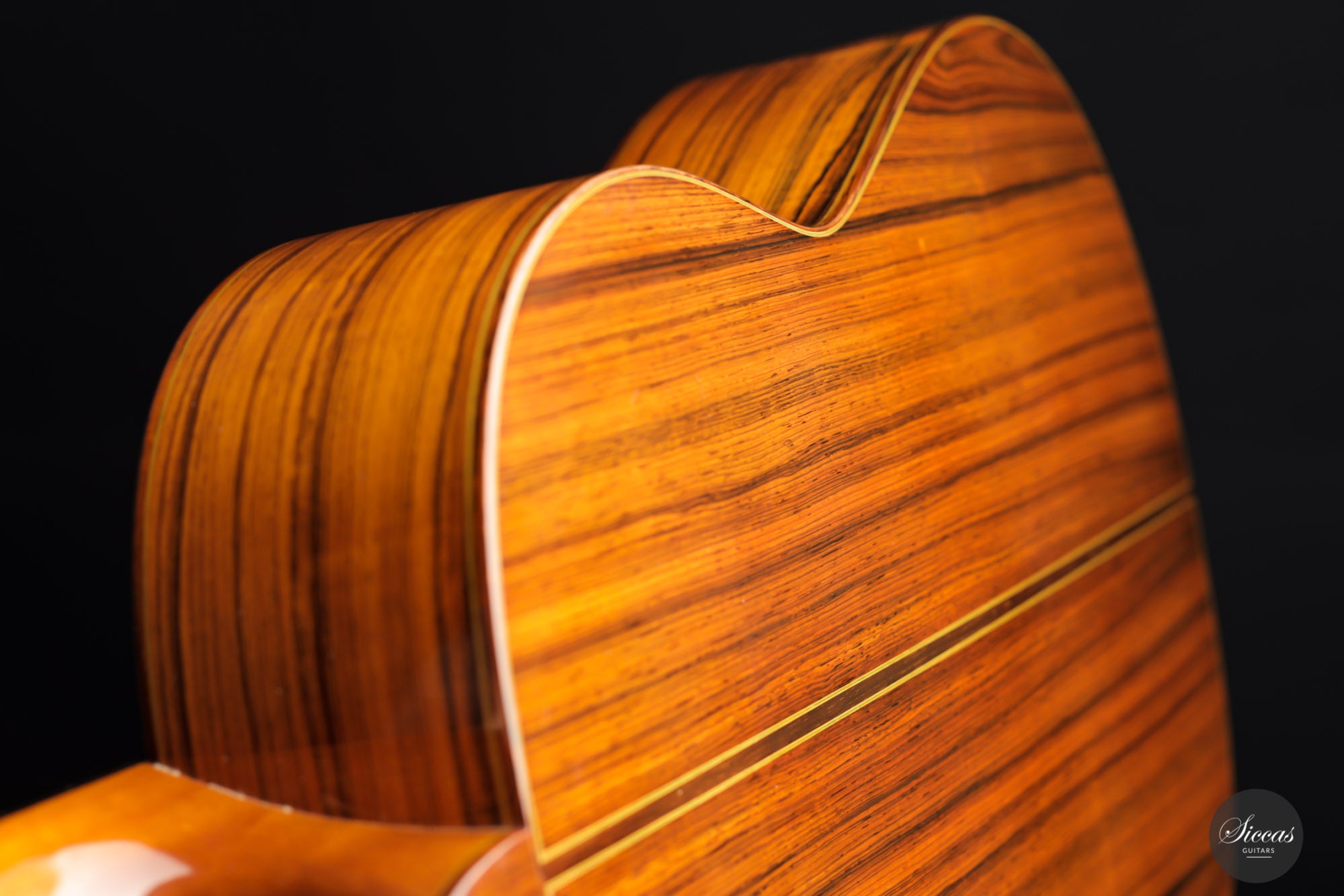 Diese eindrucksvolle Gitarre wurde von Paulino Bernabé Sr. gebaut, als er noch allein in seiner Werkstatt arbeitete. Sie ist ein hinreißendes Exemplar und ein faszinierendes Gesamtkunstwerk. Der Zustand der Gitarre ist bemerkenswert, denn sie weist nur geringe Gebrauchsspuren im Lack auf. Der Boden und die Zargen sind aus wunderschönem Rio-Palisander (CITES-zertifiziert) gefertigt und zeigen raffinierte, parallel verlaufende orange-schwarze Maserungen auf.