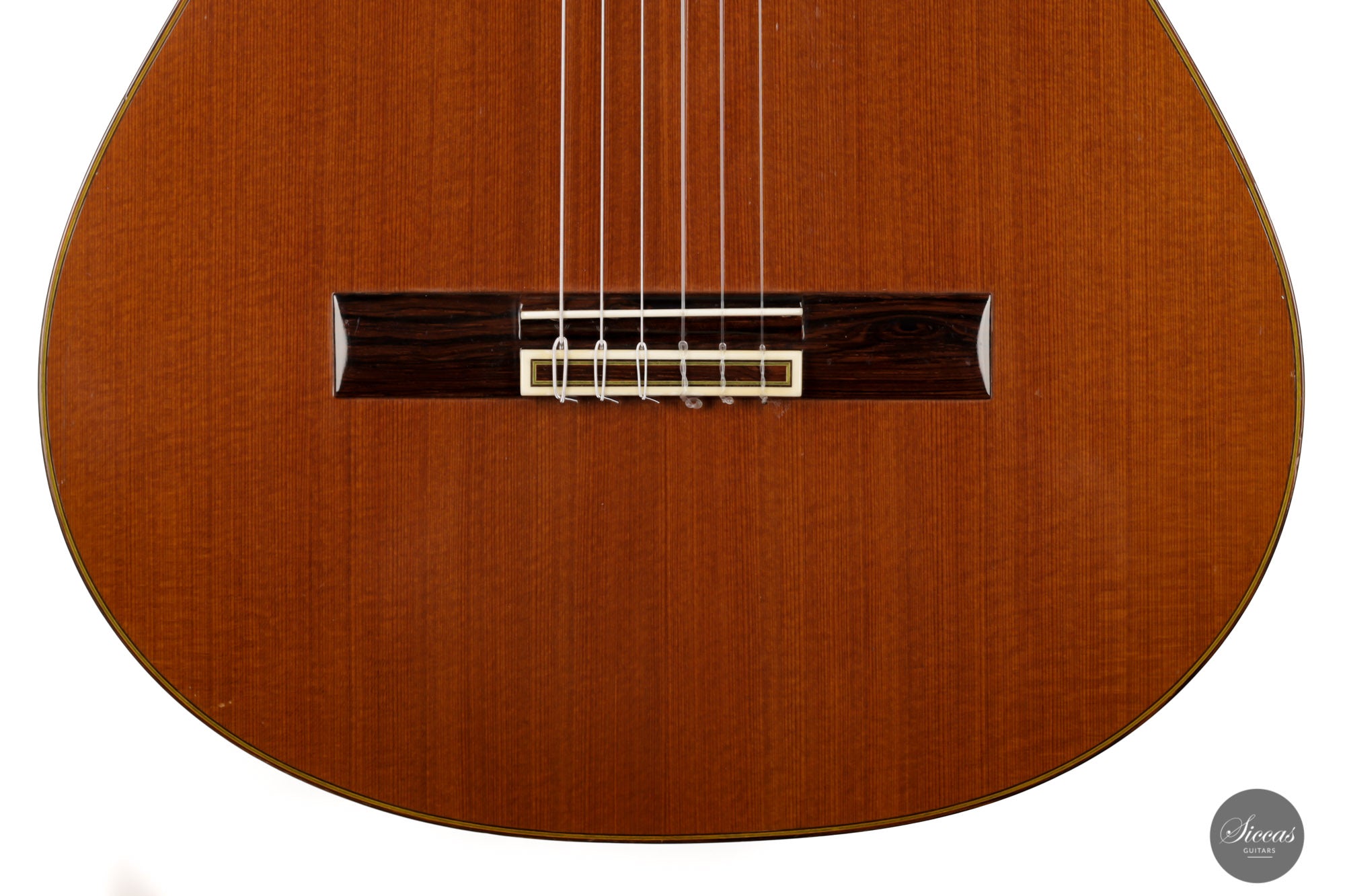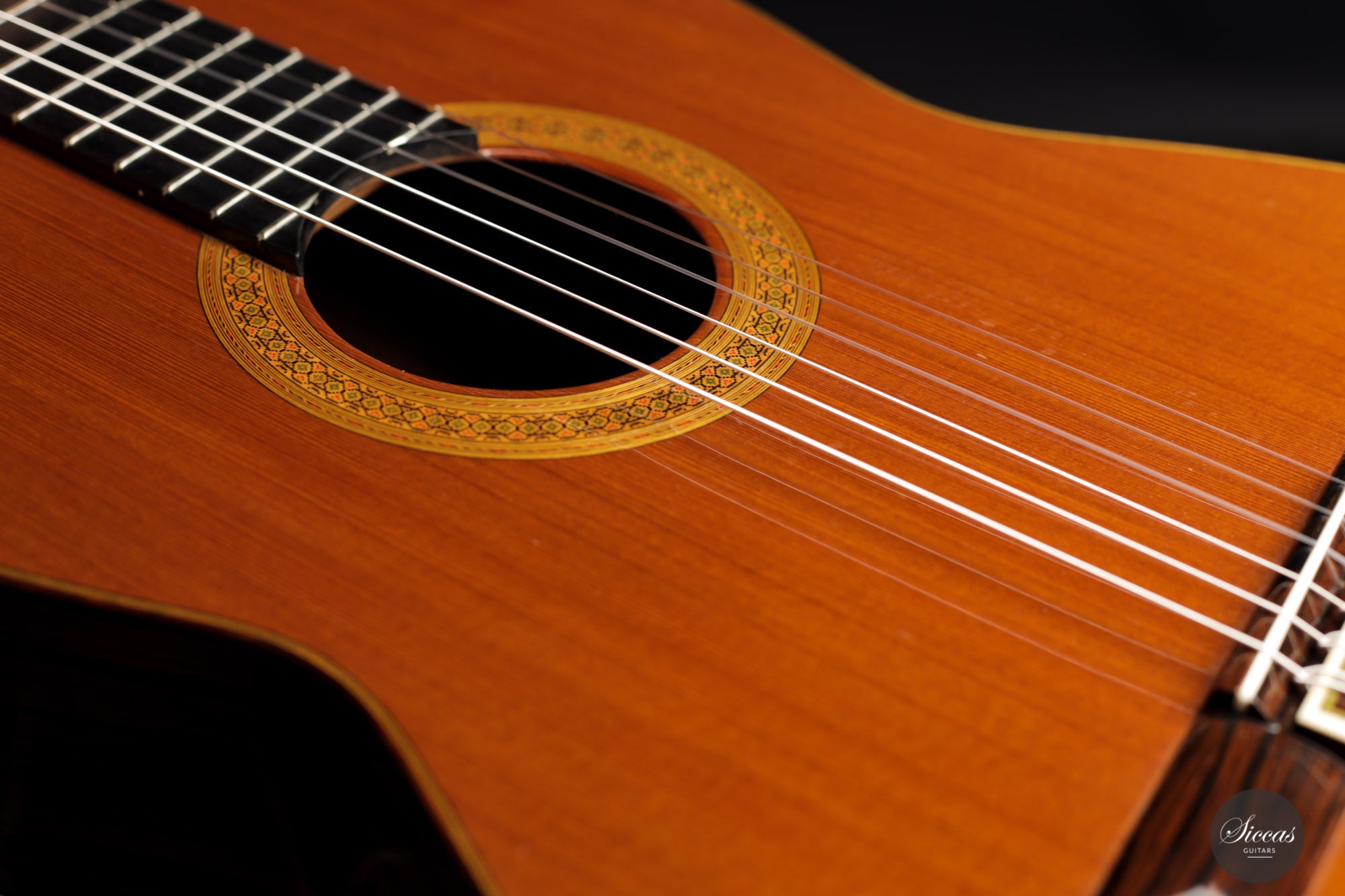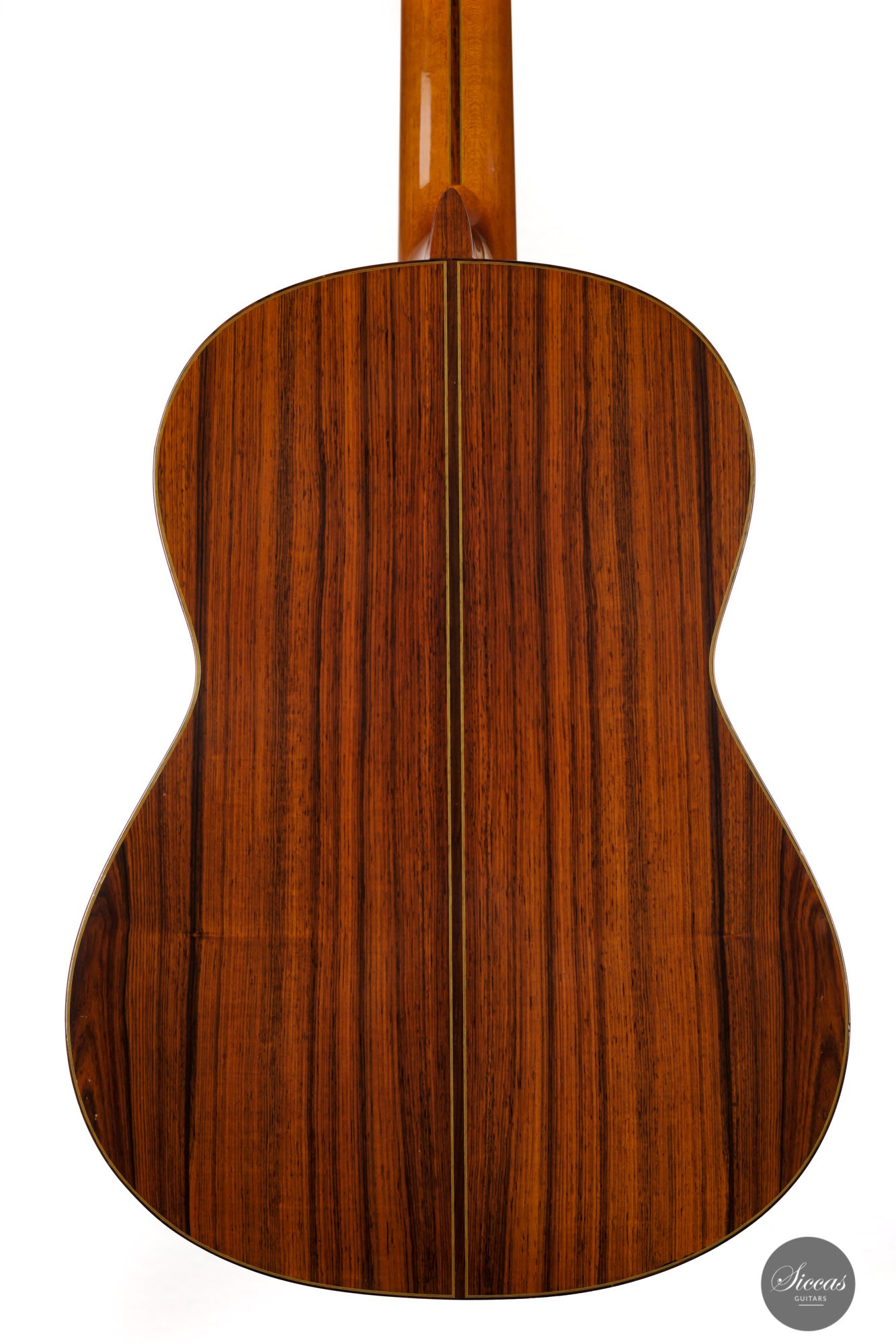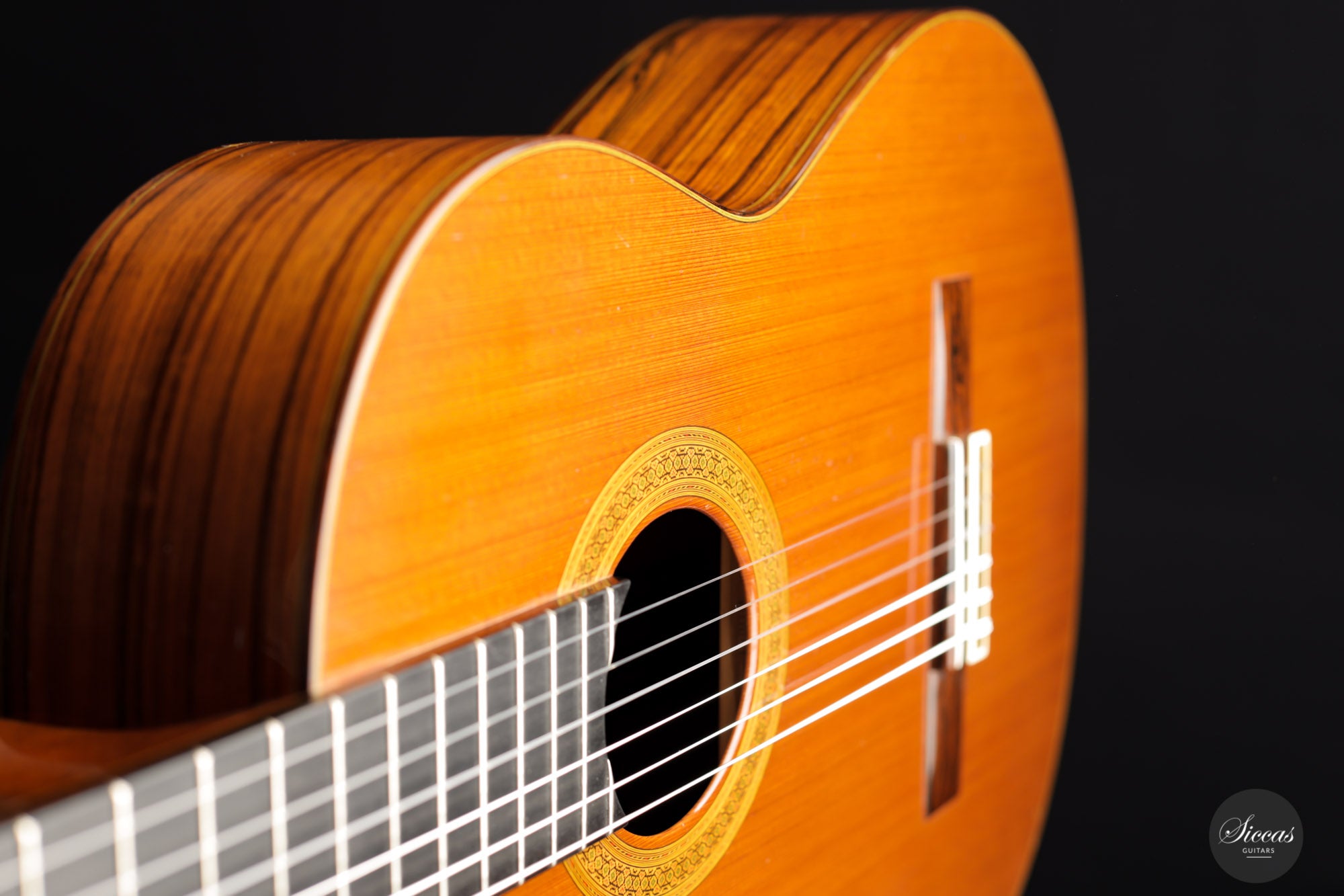 Das Instrument wurde 1977 gebaut und die Decke besitzt im Inneren das ausgefeilte Bernabé-Beleistungsmuster mit einem Fächer aus drei Leisten, zwei V-Streben und einer schrägen Leiste auf der Diskantseite auf. Darüber hinaus hat Paulino Bernabé Sr. eine Verstärkung unter dem Steg angebracht, die bei diesem Instrument vom Meister handsigniert ist. Zedernholz und Rio-Palisander (CITES-zertifiziert) ist eine klassische Kombination, die Paulino Bernabé meisterhaft umgesetzt hat. Das Ergebnis ist eine Gitarre, die Wärme, Kraft und Sustain in sich vereint und ein zeitloses Meisterwerk der spanischen Gitarrenbaukunst darstellt.