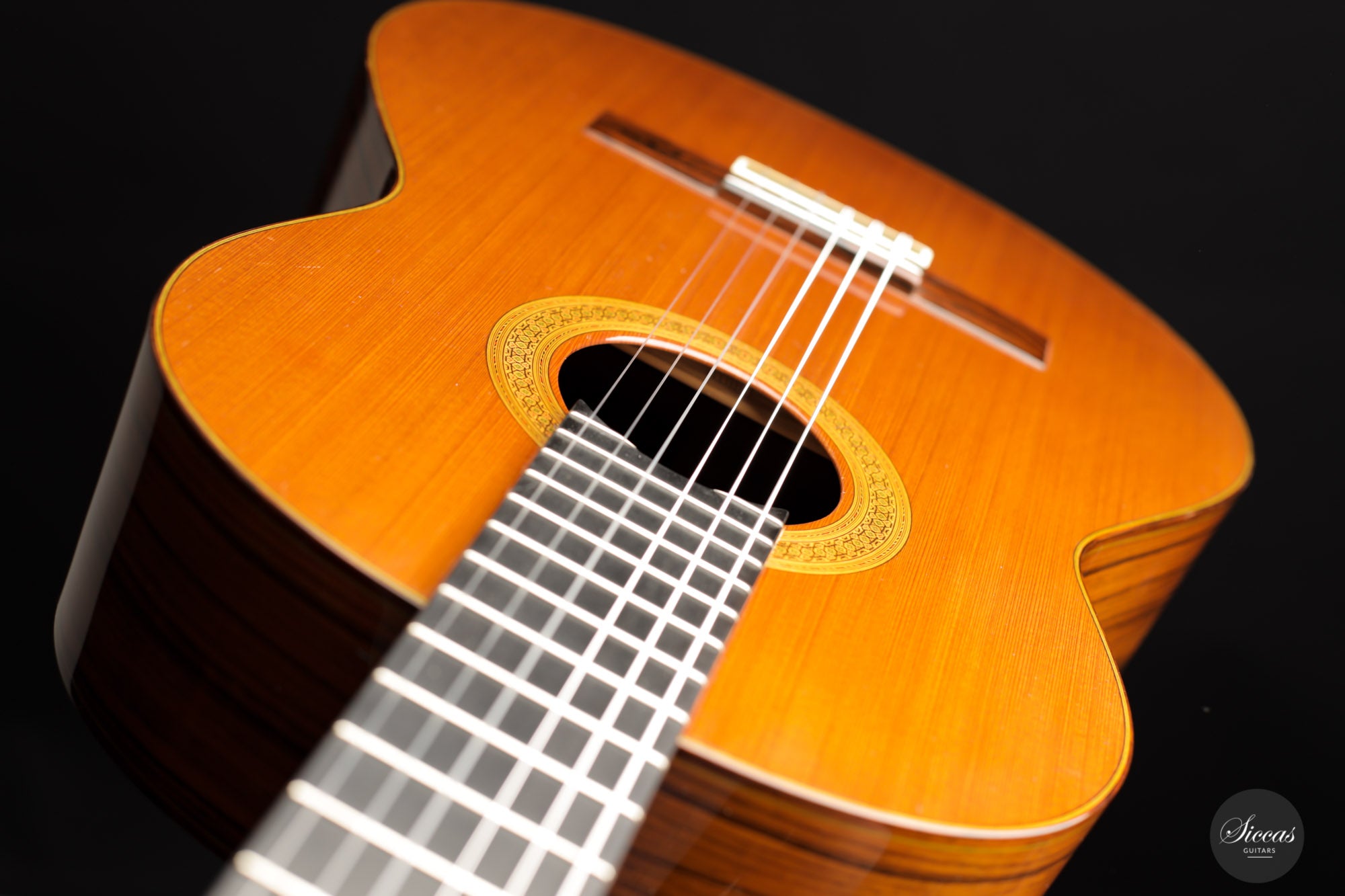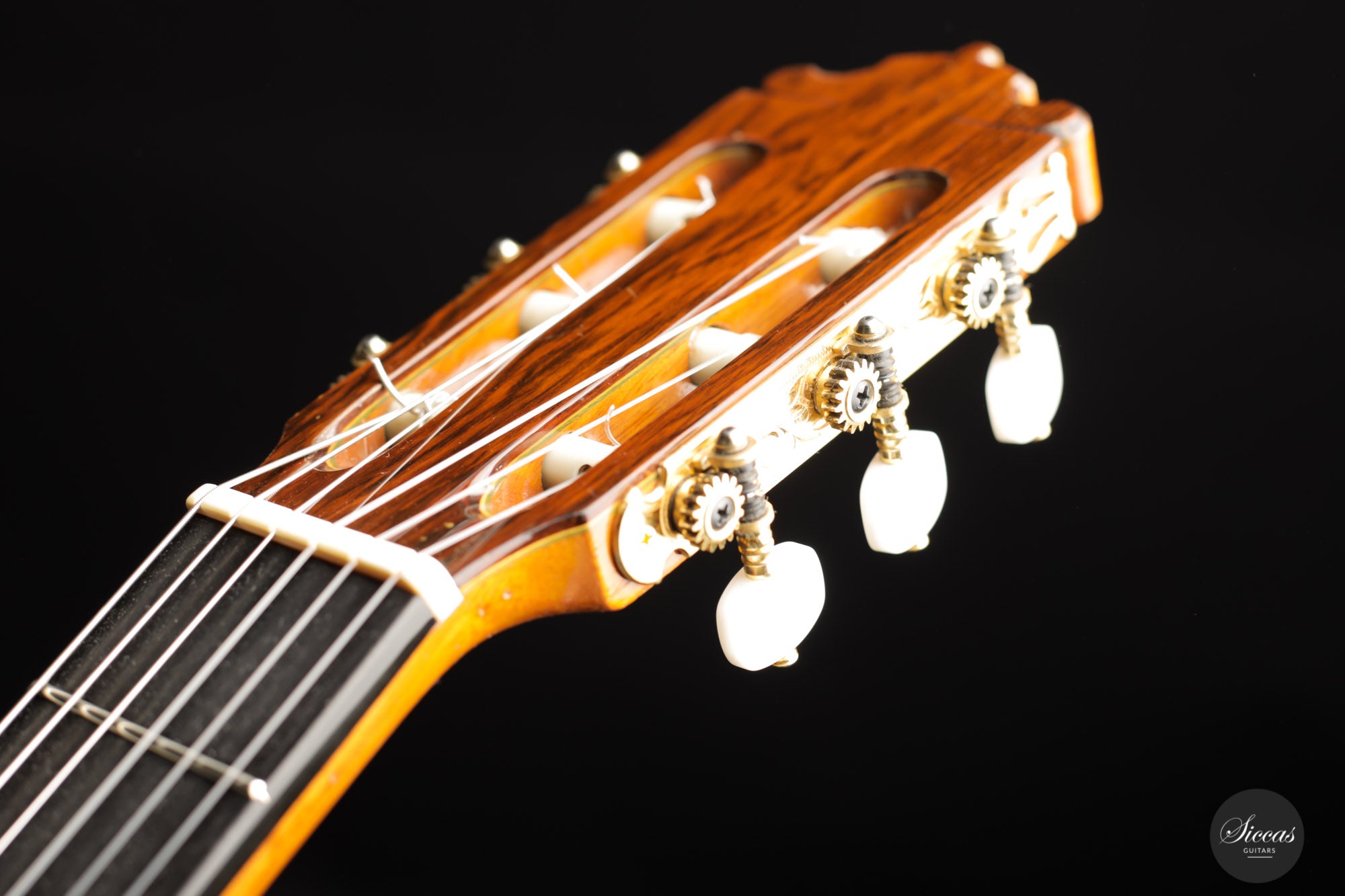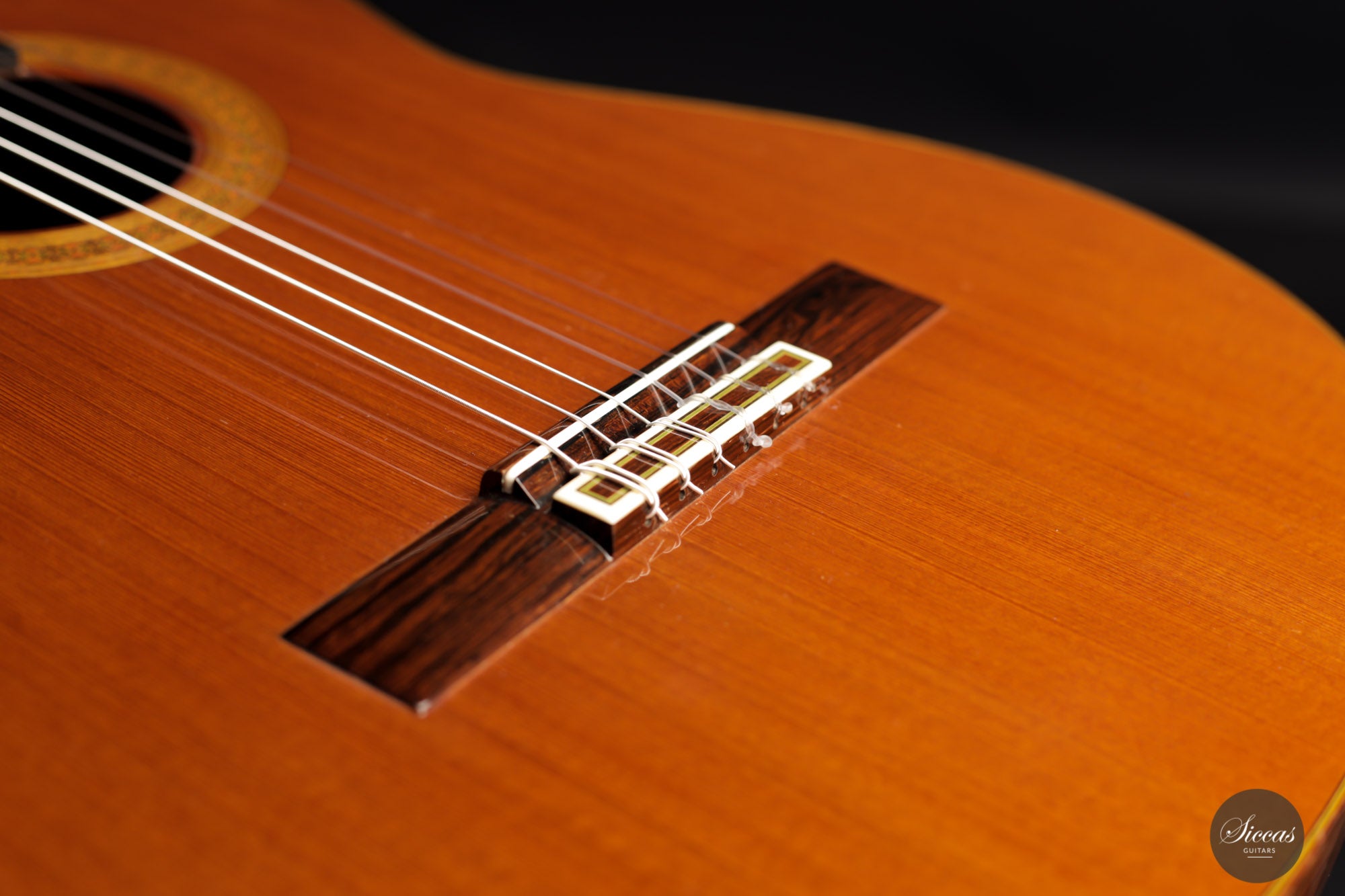 Das Instrument wurde 1977 gebaut und die Decke besitzt im Inneren das ausgefeilte Bernabé-Beleistungsmuster mit einem Fächer aus drei Leisten, zwei V-Streben und einer schrägen Leiste auf der Diskantseite auf. Darüber hinaus hat Paulino Bernabé Sr. eine Verstärkung unter dem Steg angebracht, die bei diesem Instrument vom Meister handsigniert ist. Zedernholz und Rio-Palisander (CITES-zertifiziert) ist eine klassische Kombination, die Paulino Bernabé meisterhaft umgesetzt hat. Das Ergebnis ist eine Gitarre, die Wärme, Kraft und Sustain in sich vereint und ein zeitloses Meisterwerk der spanischen Gitarrenbaukunst darstellt.