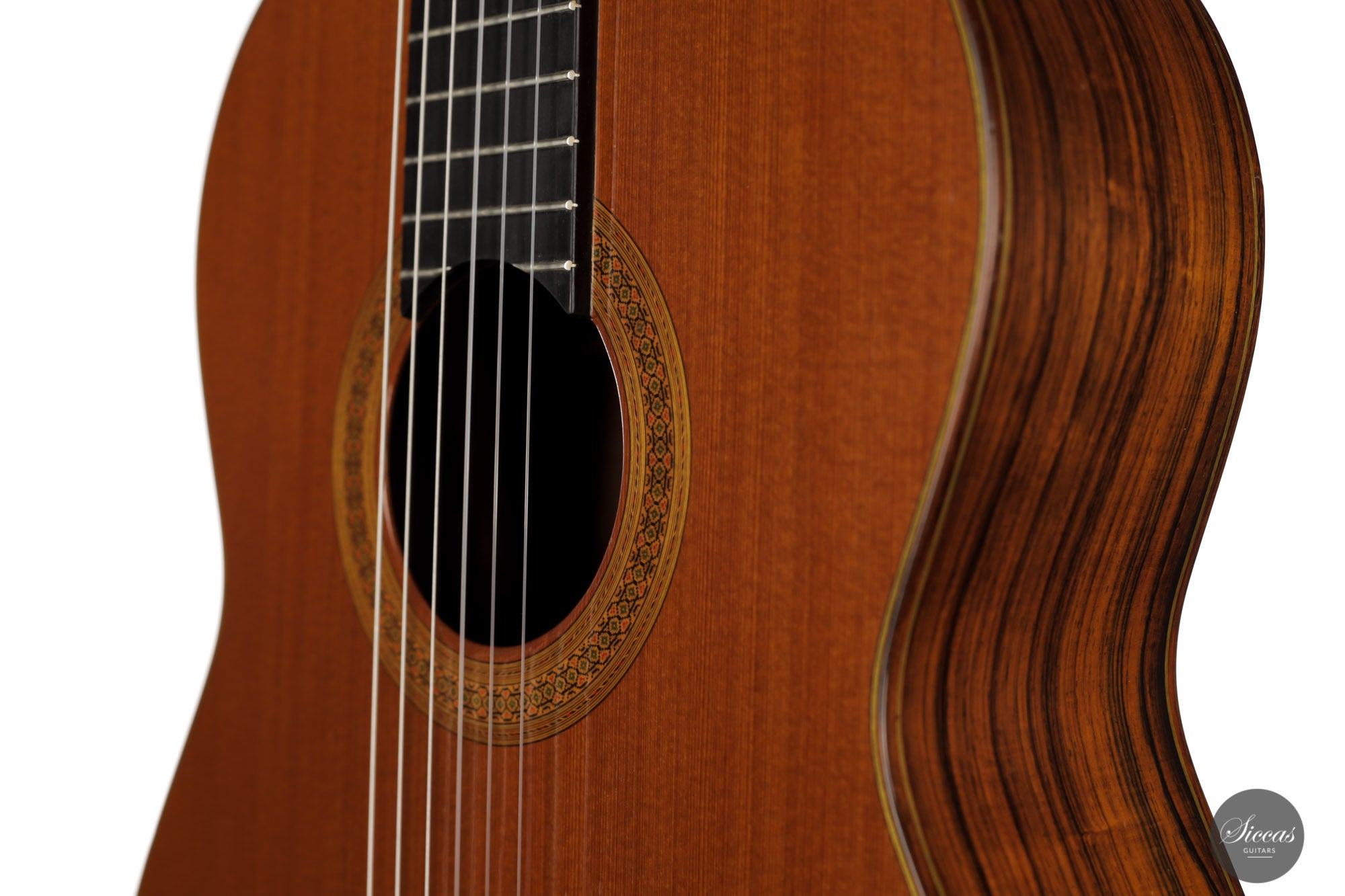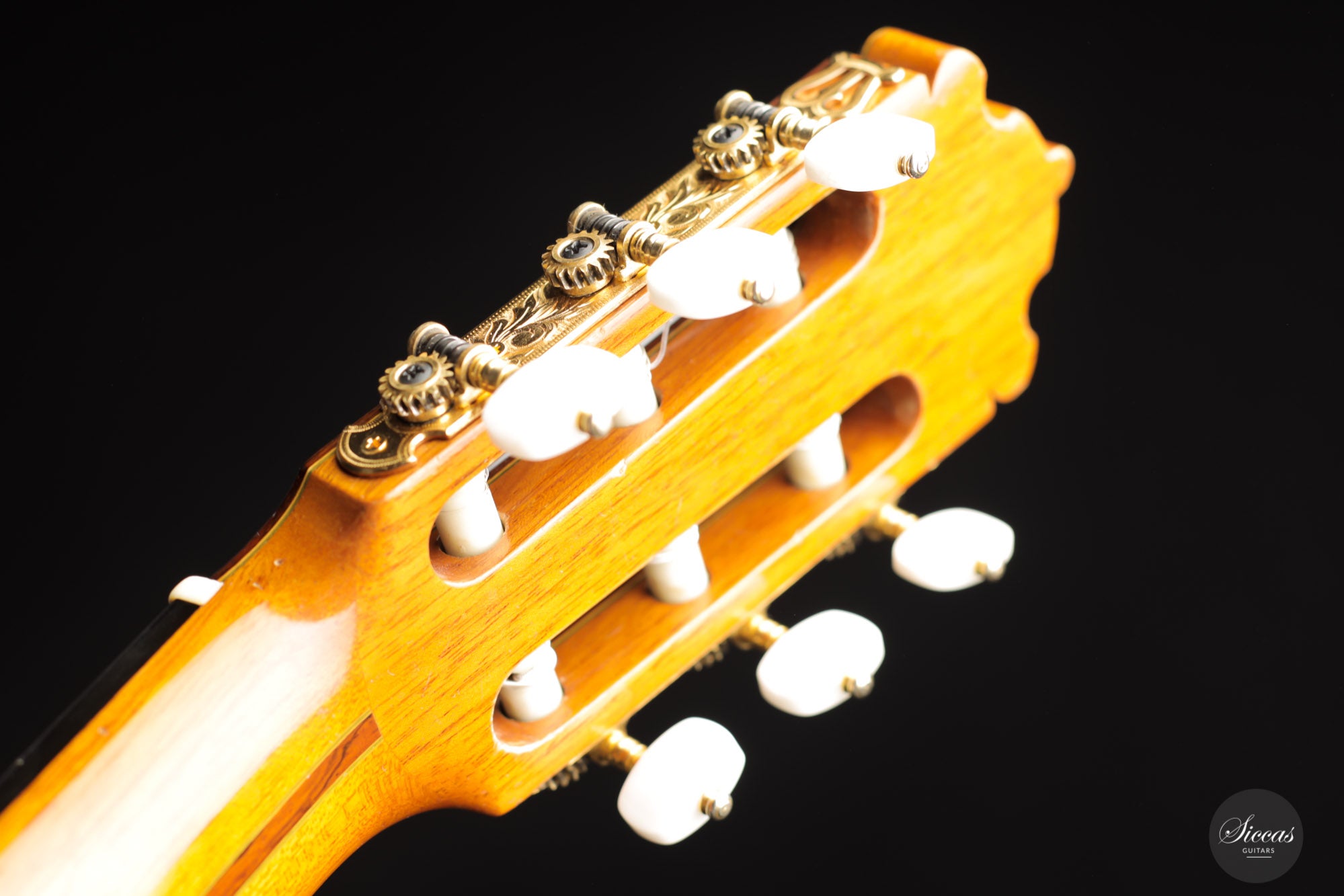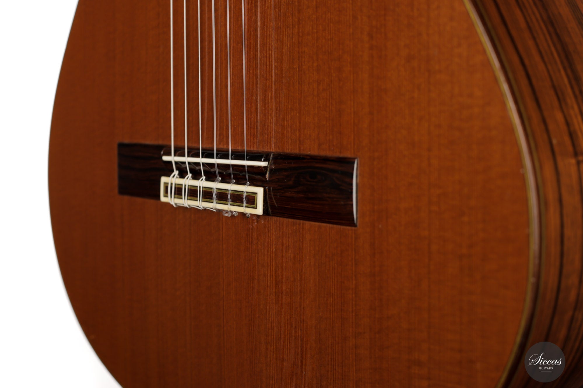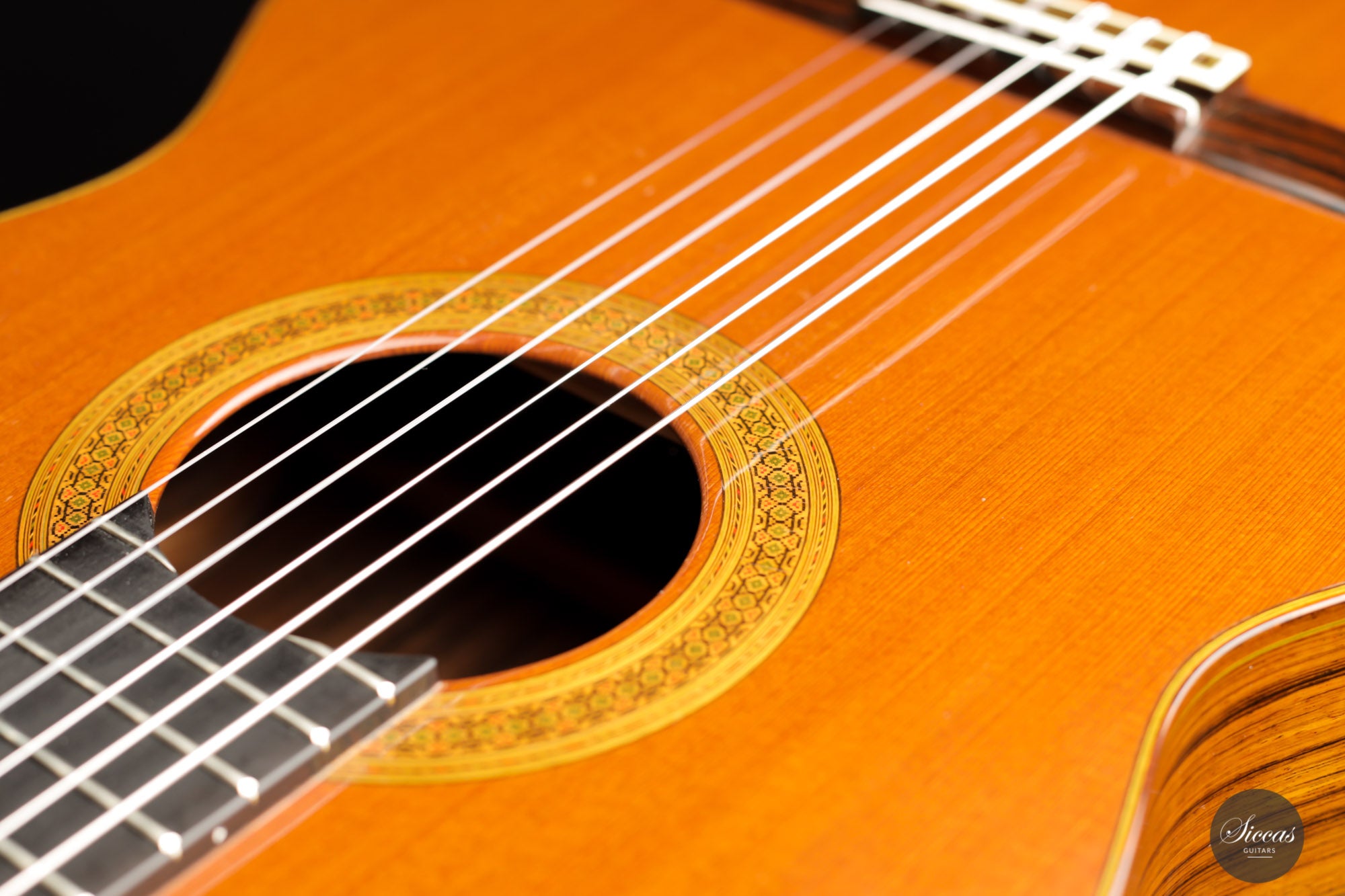 Das Instrument wurde 1977 gebaut und die Decke besitzt im Inneren das ausgefeilte Bernabé-Beleistungsmuster mit einem Fächer aus drei Leisten, zwei V-Streben und einer schrägen Leiste auf der Diskantseite auf. Darüber hinaus hat Paulino Bernabé Sr. eine Verstärkung unter dem Steg angebracht, die bei diesem Instrument vom Meister handsigniert ist. Zedernholz und Rio-Palisander (CITES-zertifiziert) ist eine klassische Kombination, die Paulino Bernabé meisterhaft umgesetzt hat. Das Ergebnis ist eine Gitarre, die Wärme, Kraft und Sustain in sich vereint und ein zeitloses Meisterwerk der spanischen Gitarrenbaukunst darstellt.