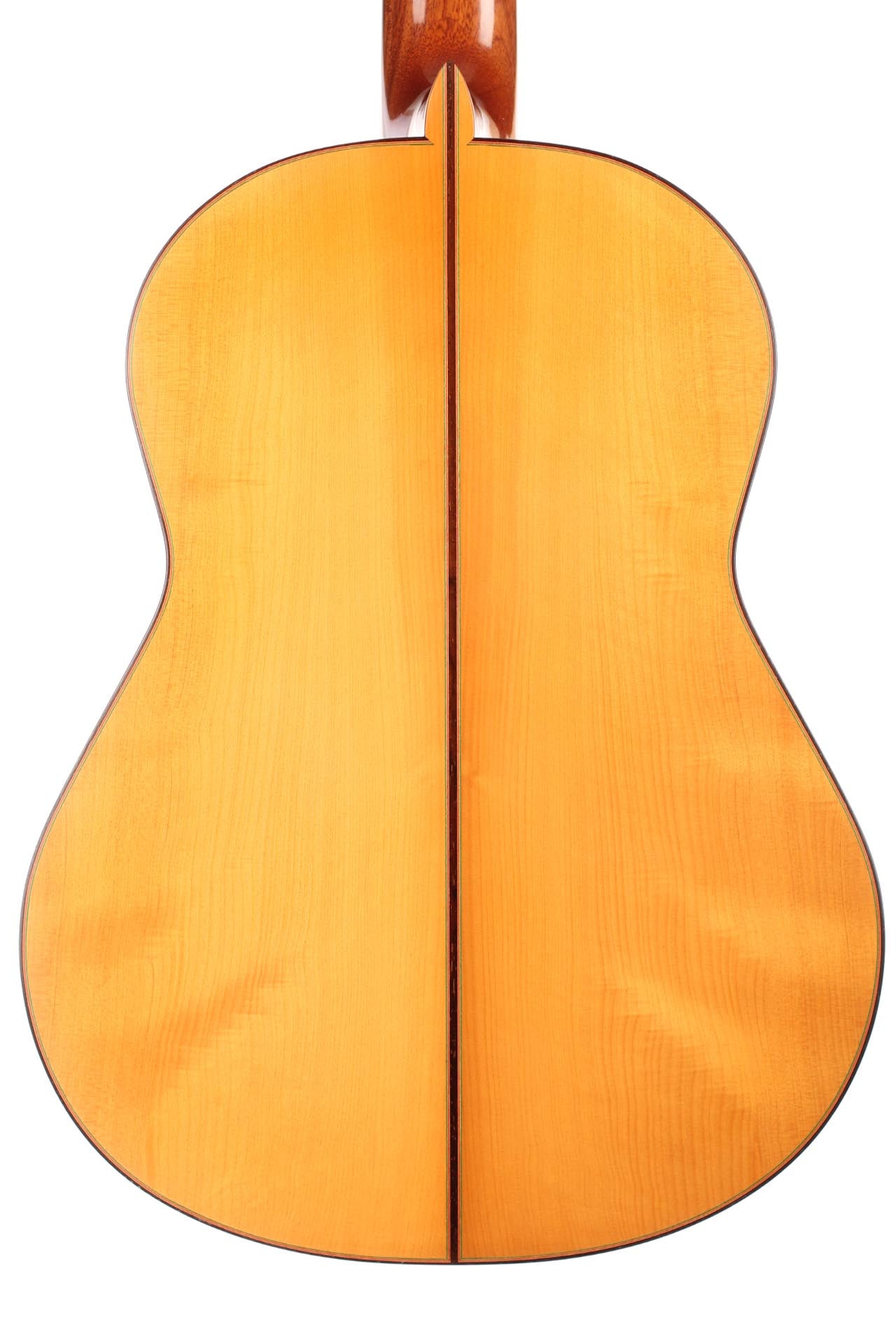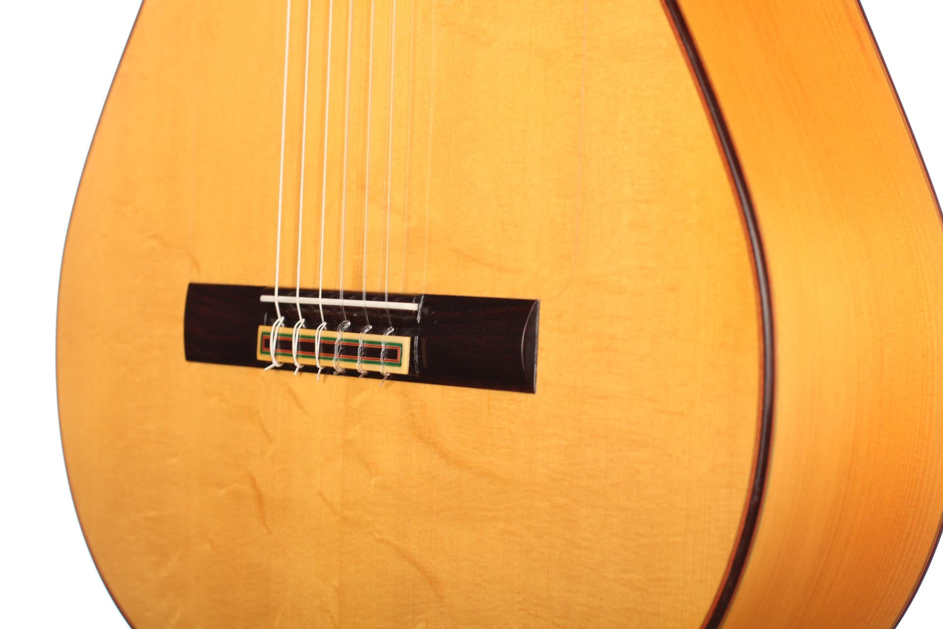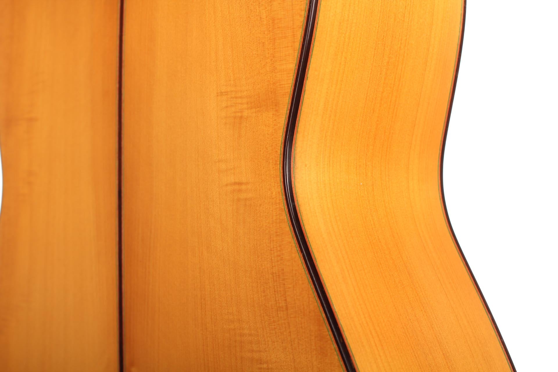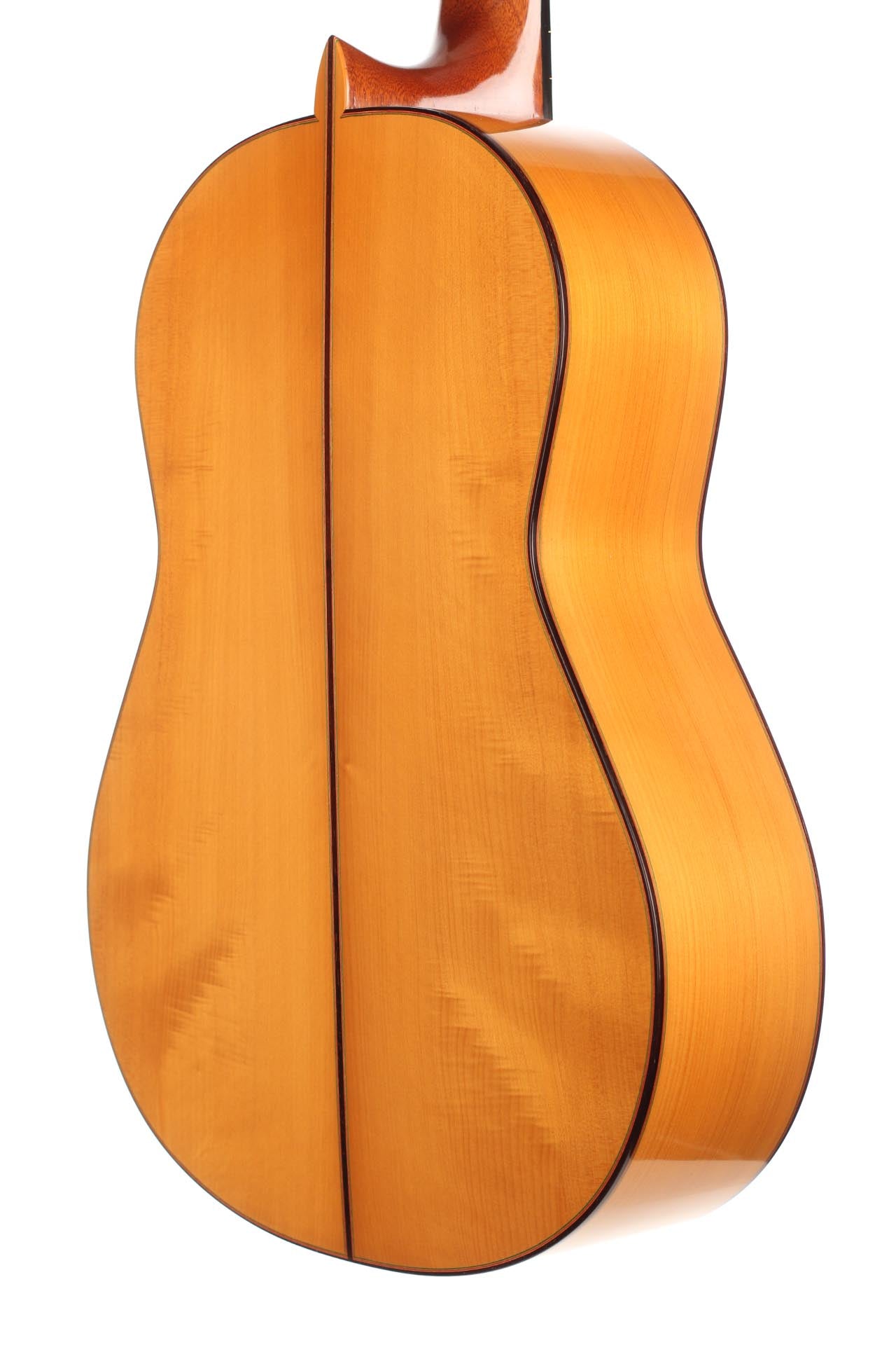 The top is made of German spruce with an outlined grain, straight and smooth, that endorse its exceptional quality. The back and sides are made of cypress, whose beauty and quality are simply perfect. The sound of this guitar is really surprising. A very special flamenco timbre with a strong personality and a very mature tone. The tuners are made by Alessi. A hard-shell case is included. This guitar is Cites-free (CF).