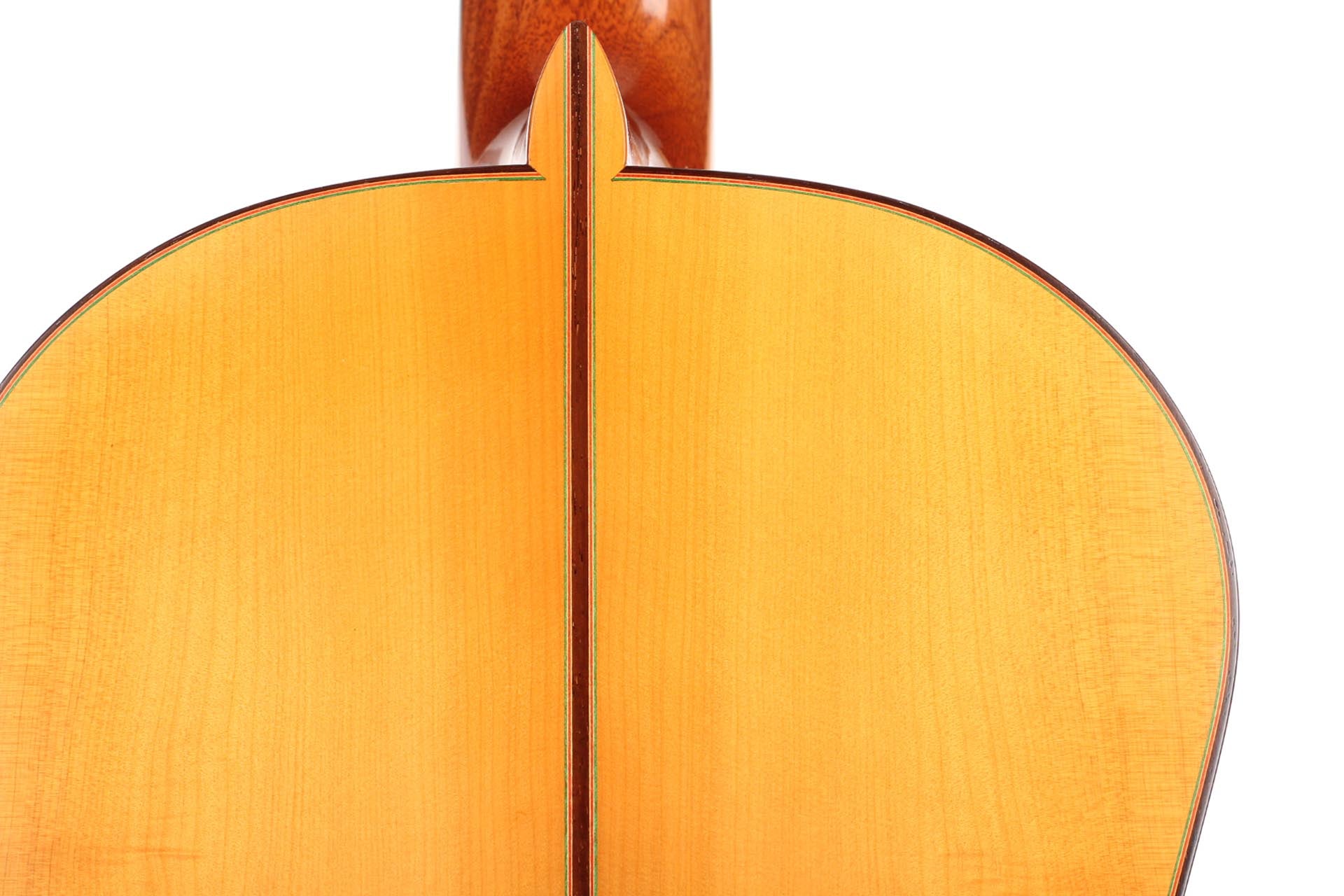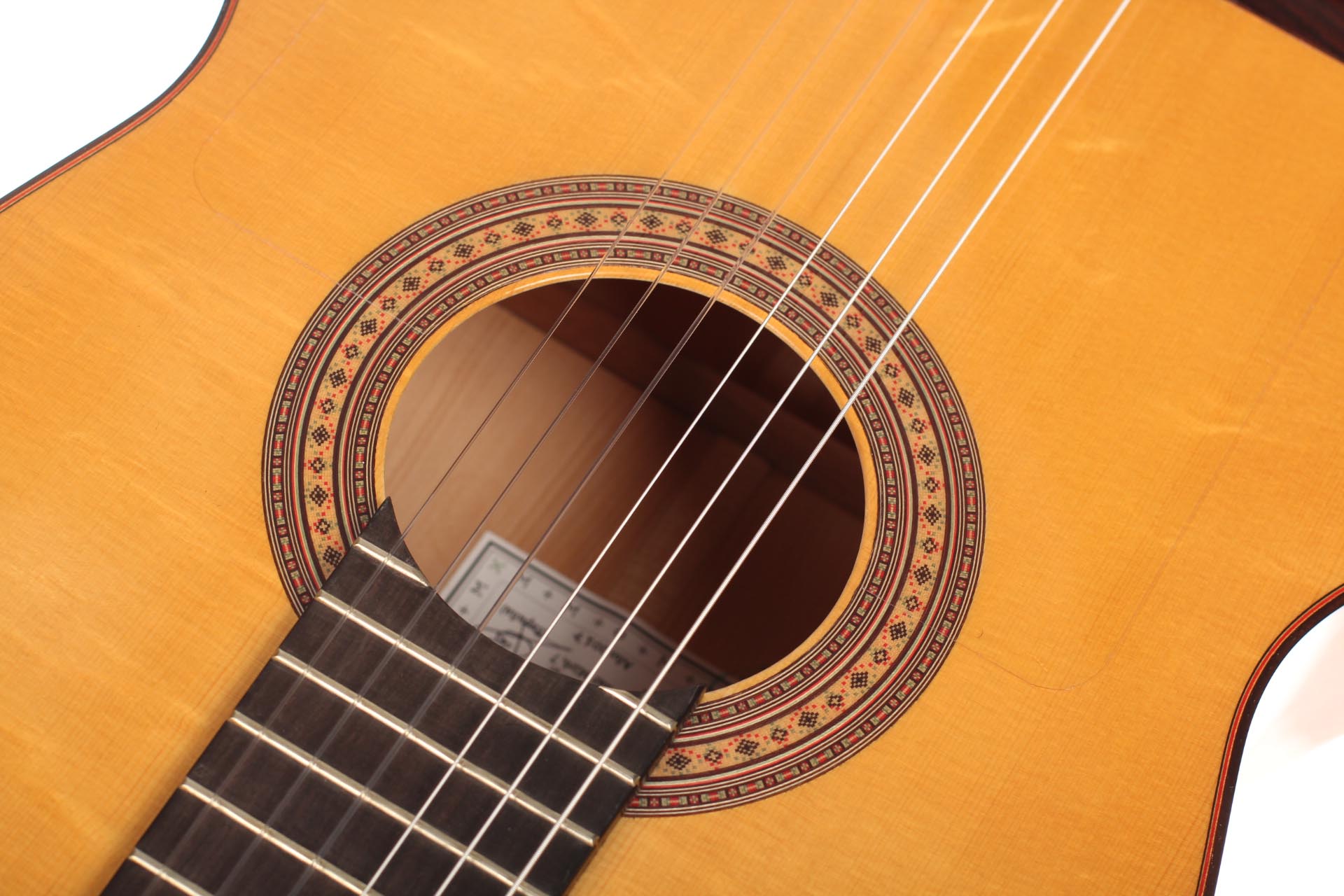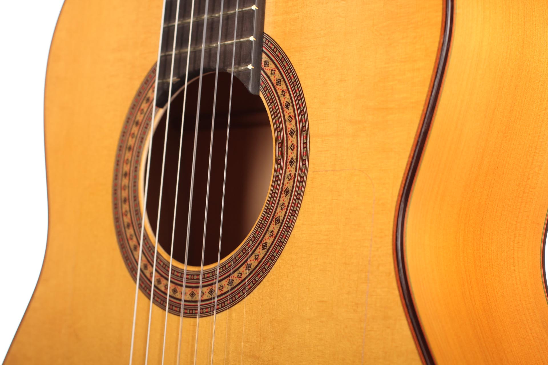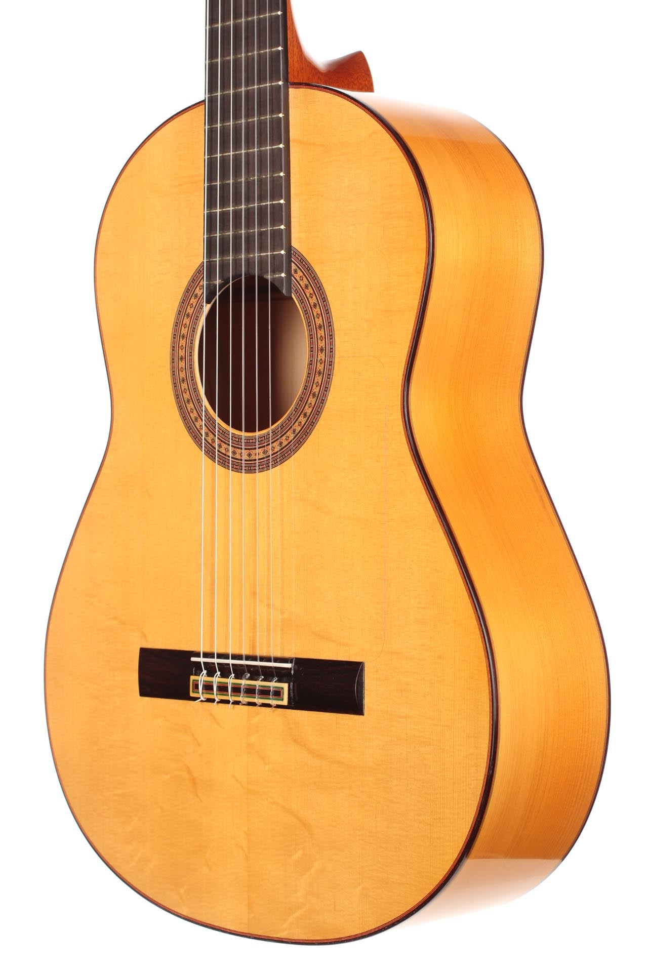 The top is made of German spruce with an outlined grain, straight and smooth, that endorse its exceptional quality. The back and sides are made of cypress, whose beauty and quality are simply perfect. The sound of this guitar is really surprising. A very special flamenco timbre with a strong personality and a very mature tone. The tuners are made by Alessi. A hard-shell case is included. This guitar is Cites-free (CF).