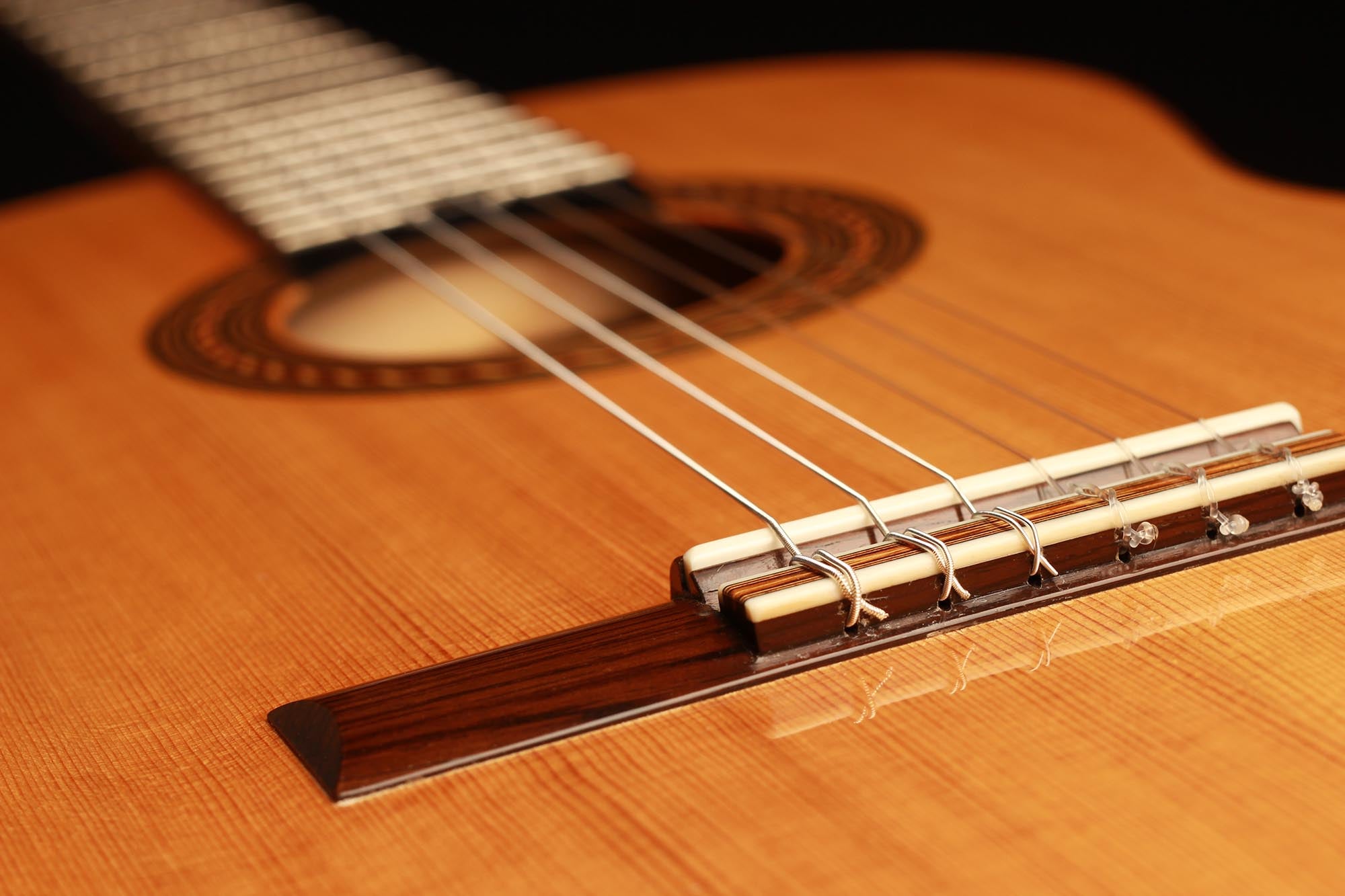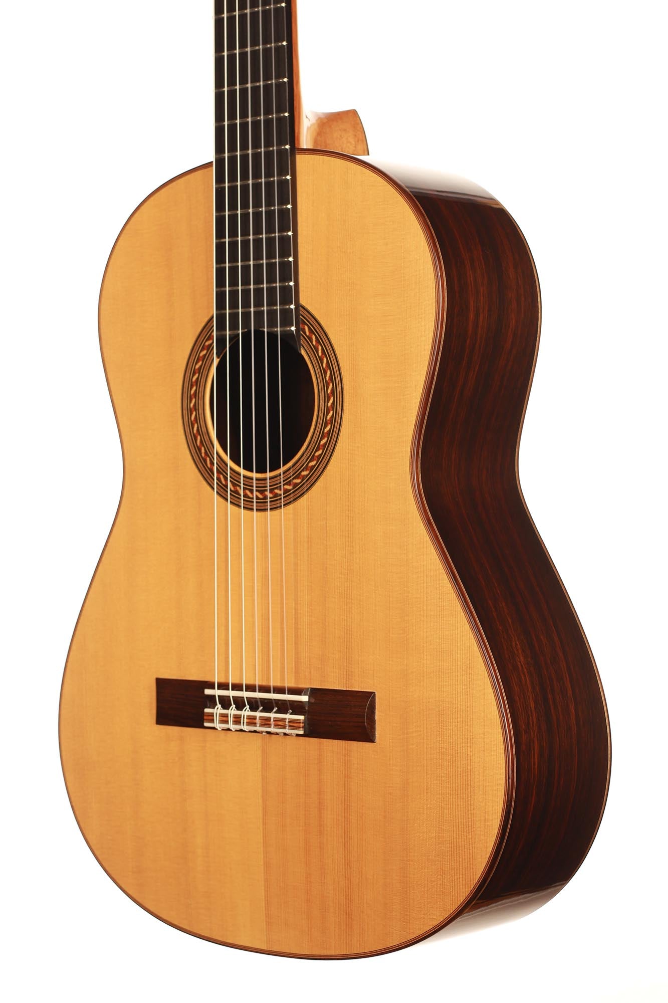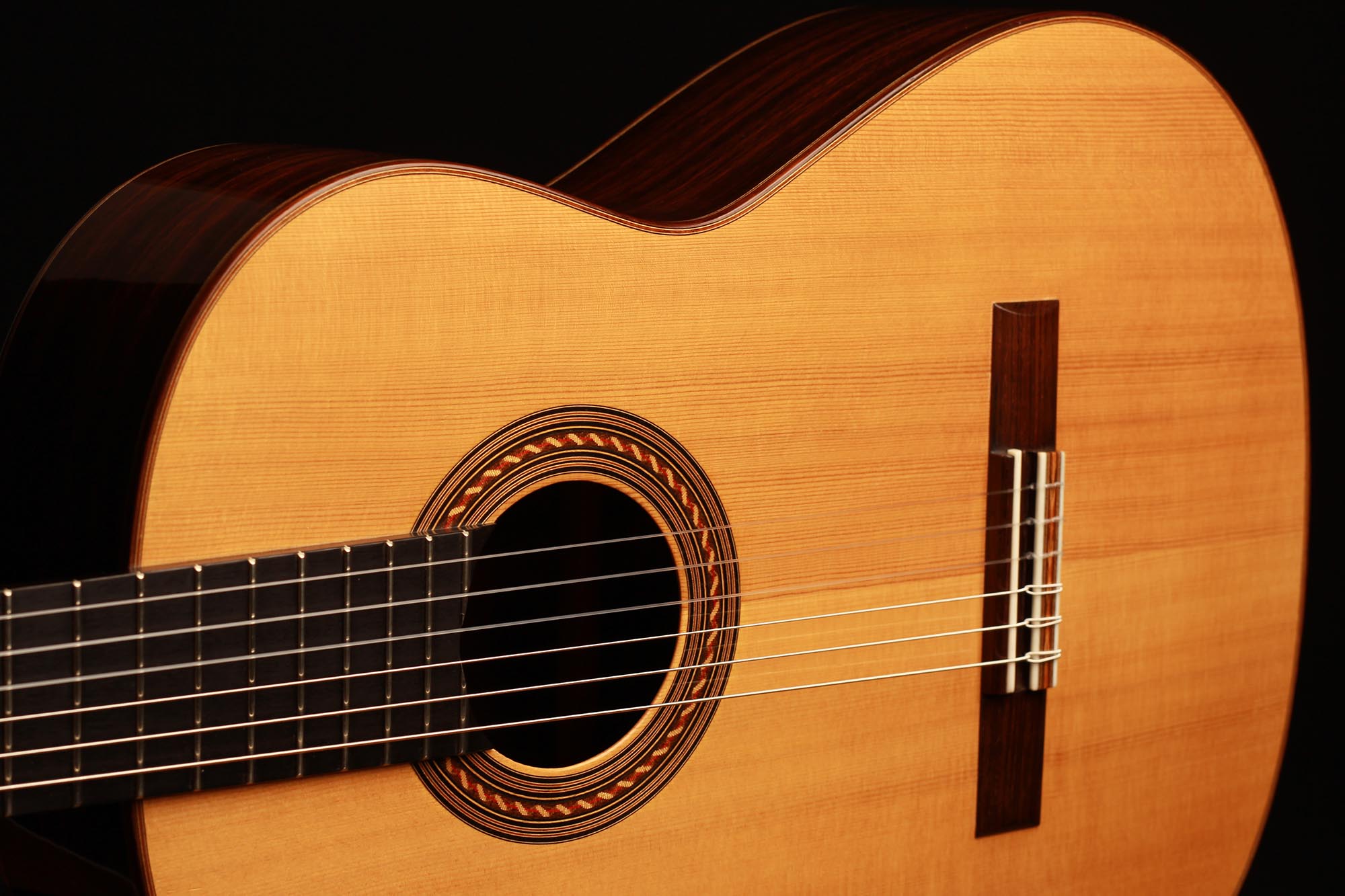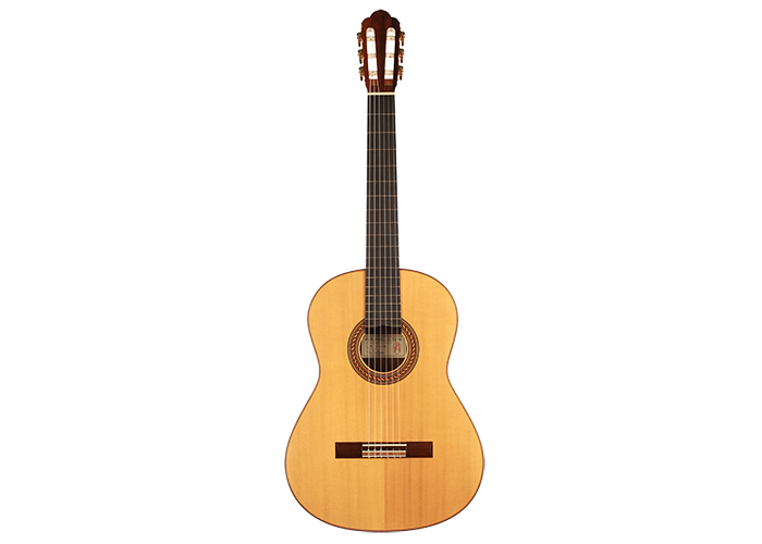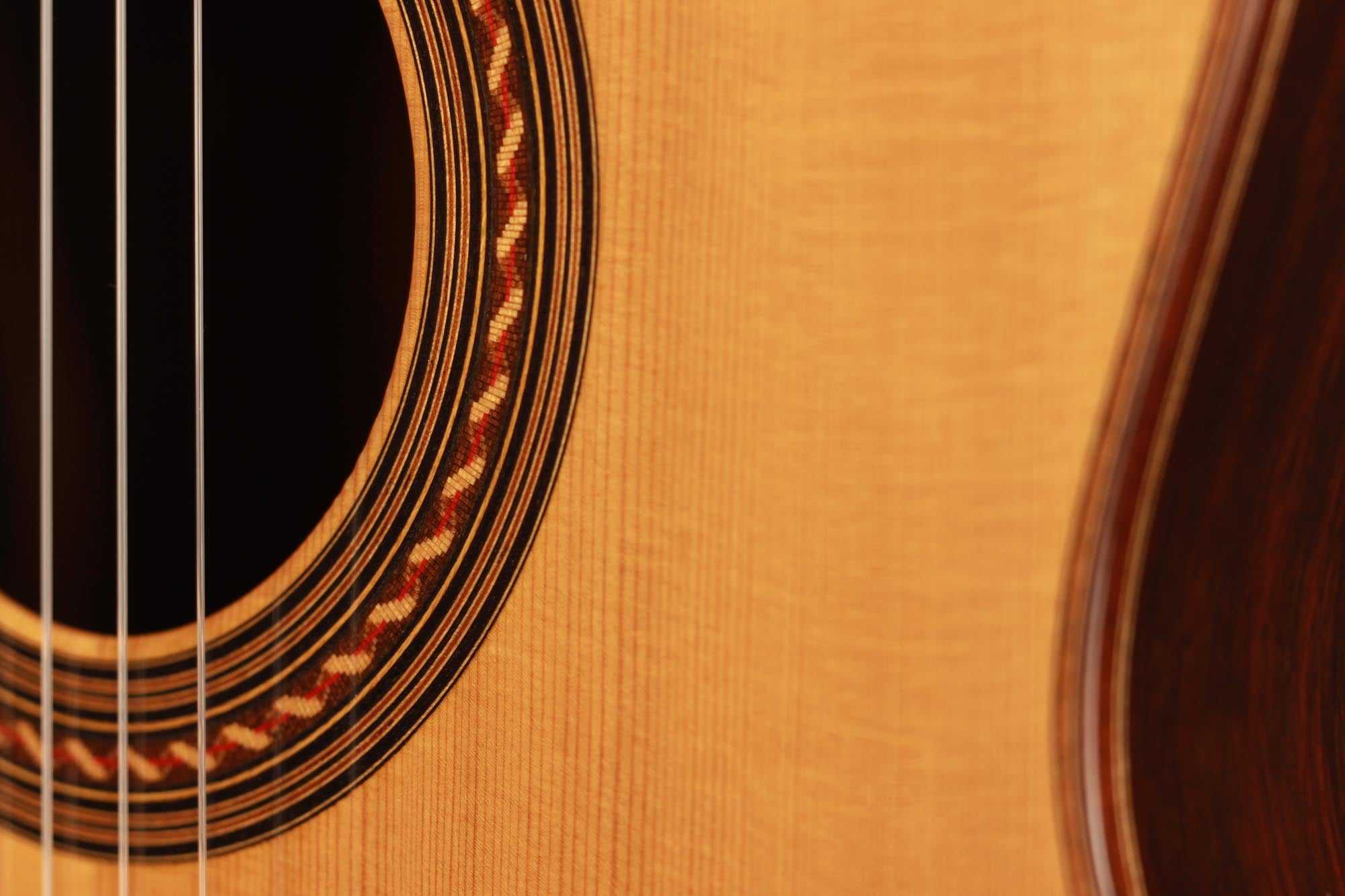 Dieses Instrument wurde 2002 gebaut und hat lediglich zwei reparierte Risse, einen auf der Decke und einen auf der Zarge, die beide fachmännisch repariert und fast nicht sichtbar sind. Es handelt sich um eine traditionelle Gitarre mit einer dünnen Fichtendecke und einem "Bouchet Balken" unter dem Steg. Die Decke hat in den letzten Jahren eine fantastische Farbe bekommen und auch der Klang hatte Zeit zu reifen. Tiefe, kräftige Bässe unterstützen den brillanten Diskant und unterstreichen die Magie einer vollkommen offenen und ausgereiften Gitarre.