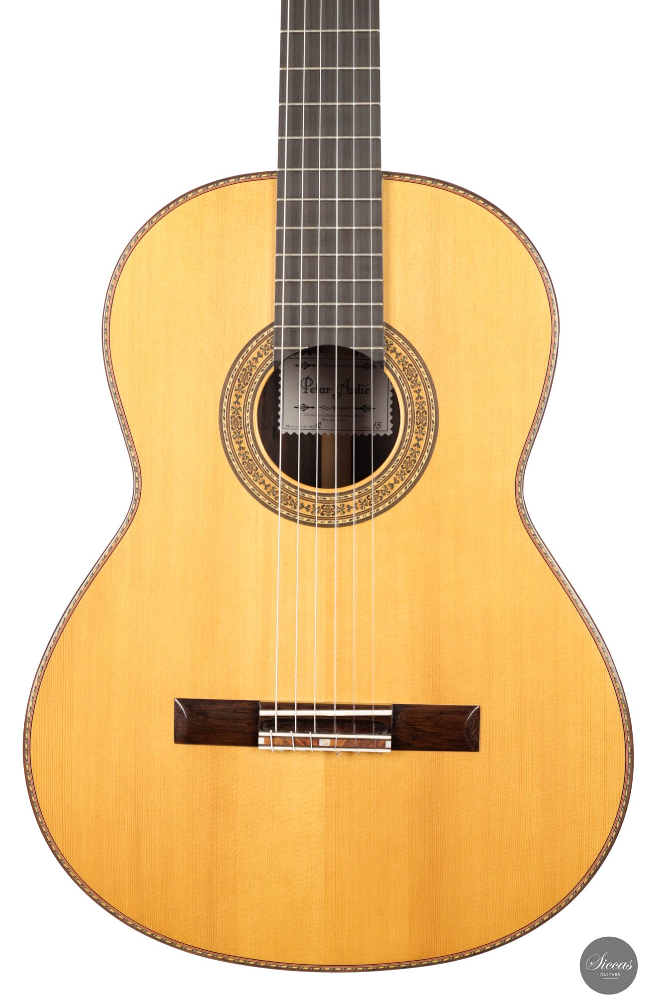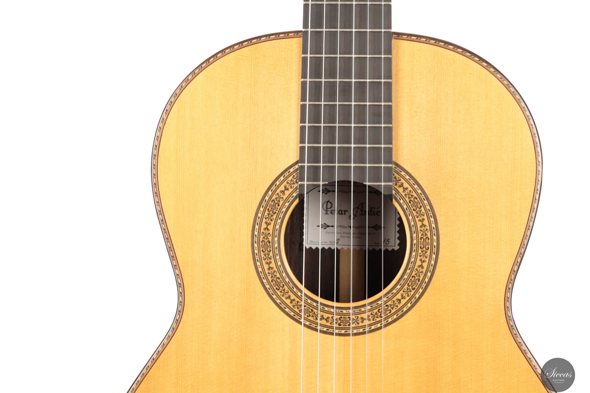The 2012 No. 15 guitar by the revered luthier Petar Antic represents a blend of artistry and legacy, brought to us directly by his son and maintained as a New Old Stock (NOS) item. This guitar, echoing Antic's dedication to superior craftsmanship, stands in pristine condition, a reflection of his commitment to quality. Featuring a spruce top complemented by six fan bracings, it offers a bell-like clarity and resonance that is both rare and captivating. Every aspect of its construction, from the intricately crafted ornaments to the finely tuned setup, demonstrates Antic's acute attention to detail, ensuring that the guitar is not only a joy to play but also comfortable for the musician.