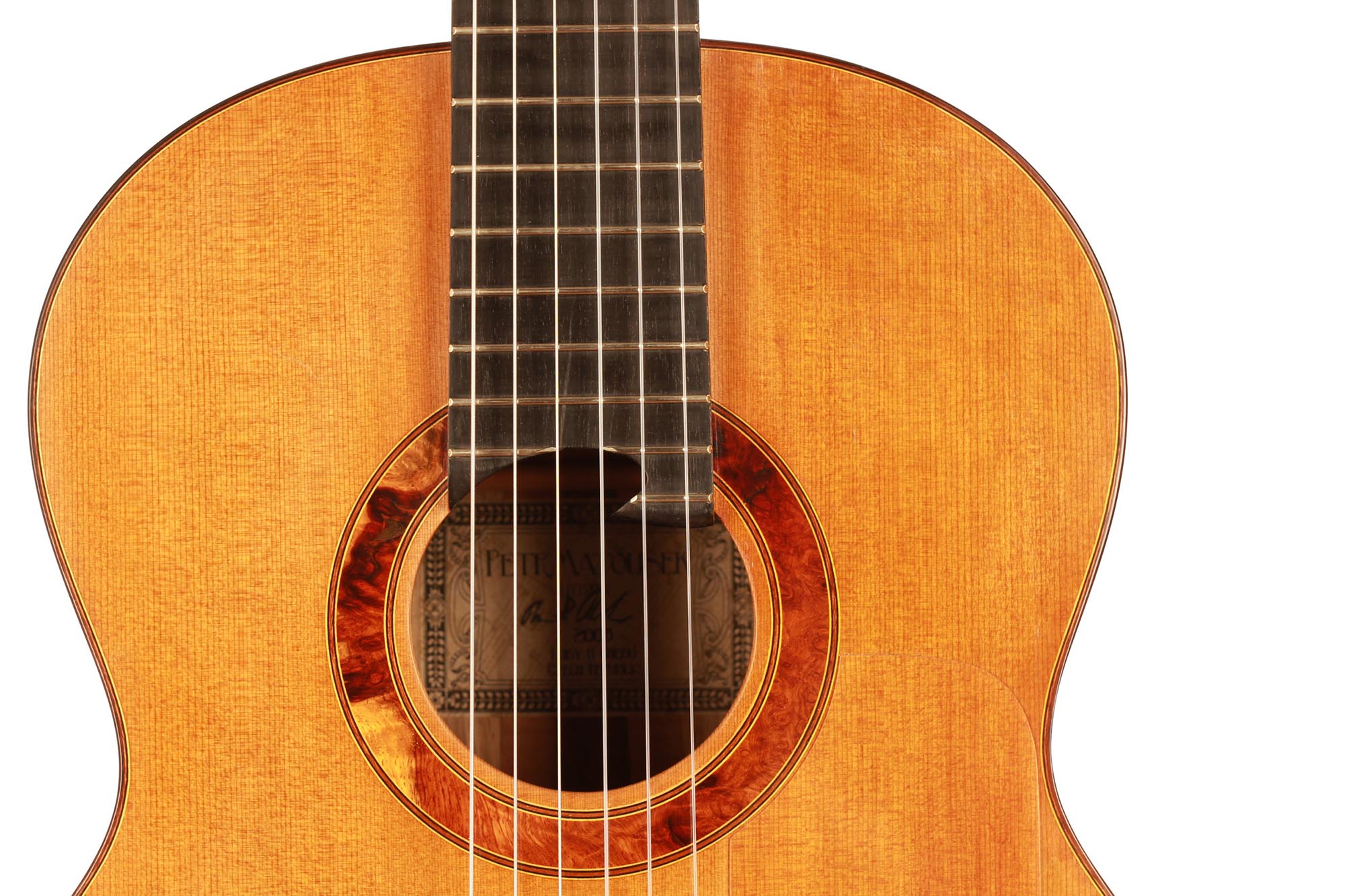 Petr Matoušek is one of the best-known luthiers from Czech Republic. His guitars are known to be of great workmanship and sound. Especially the double-top models have gained very good reputation for being best value for money. The same goes for this 2008 model. The guitar has a very fast response with great volume and projection. The playability for both left and right hand is very good and makes it a very comfortable instrument. This instrument has been played a lot in the past 10 years and since it also was used for modern music, the first thin double-top layer next to the sound hole got worn out.