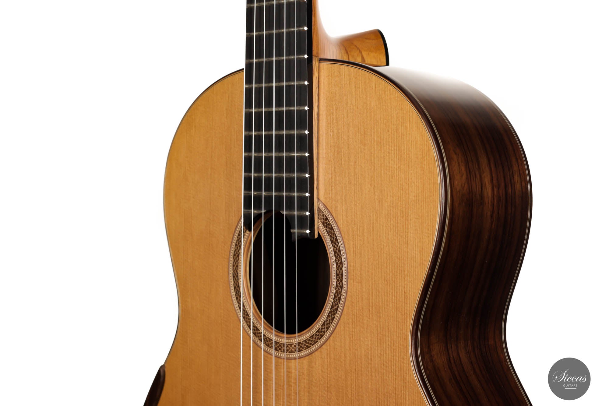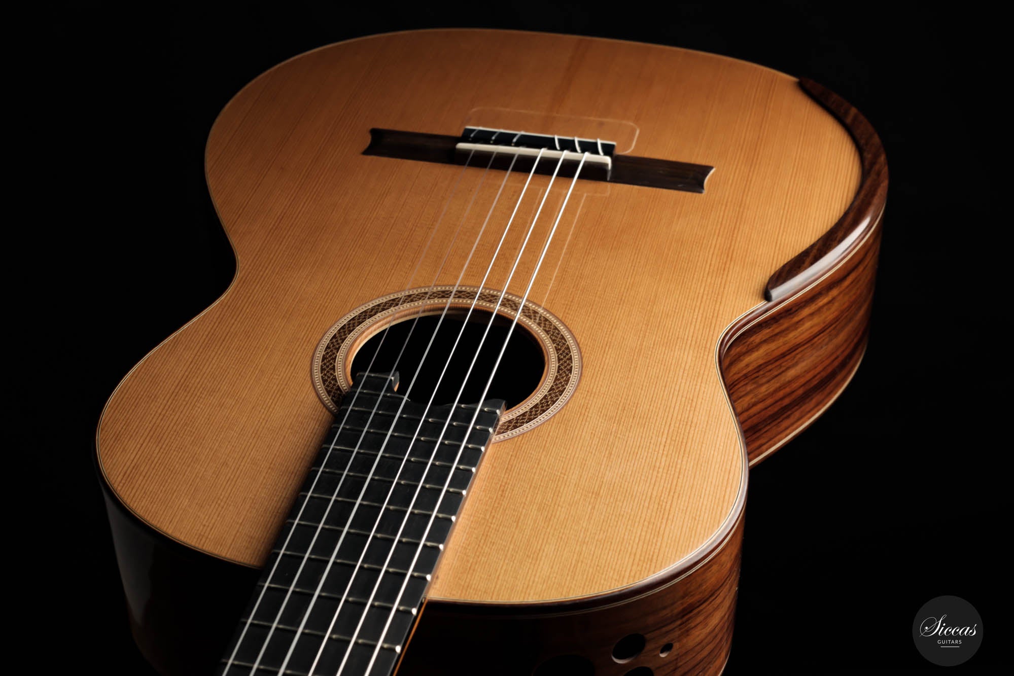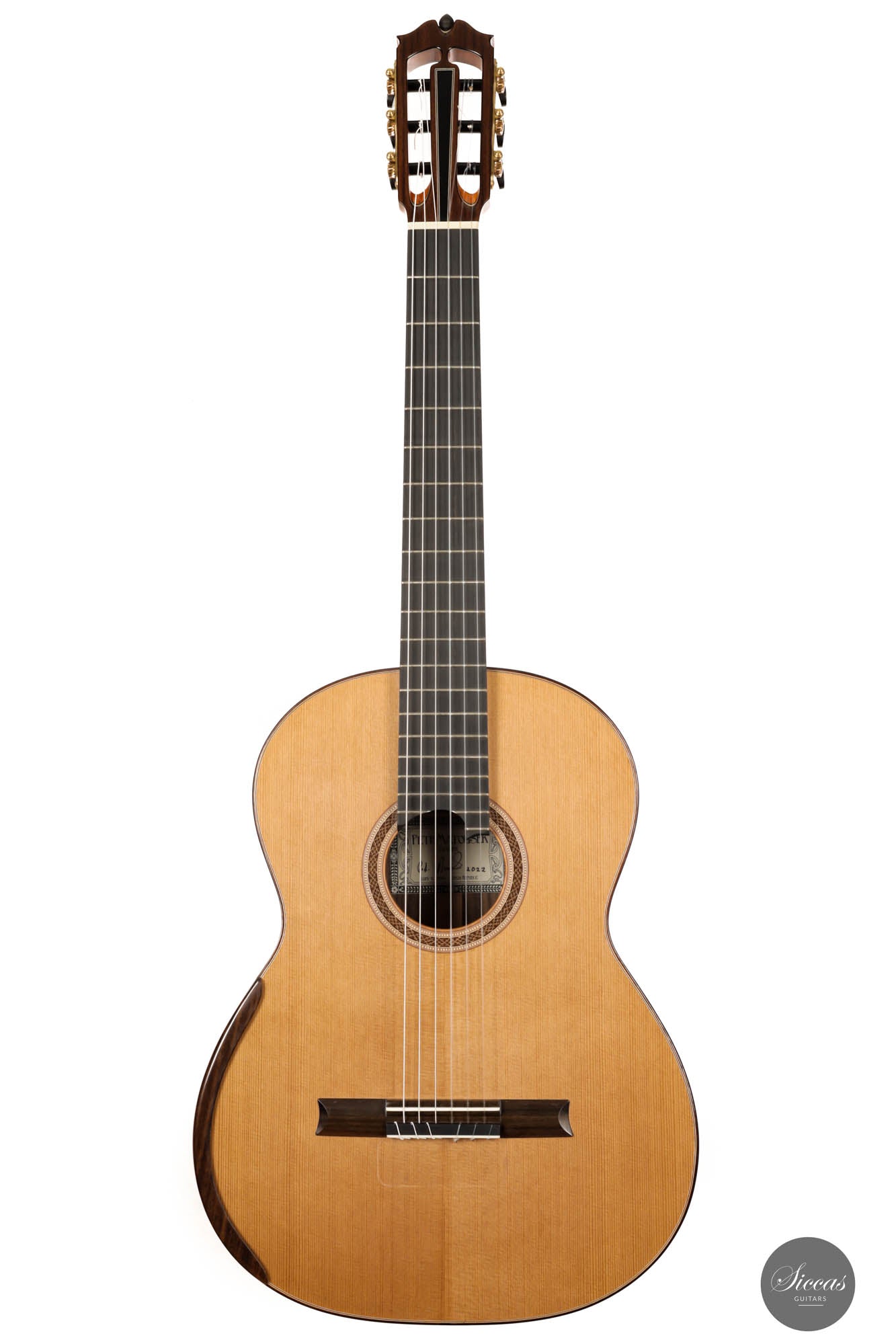 Concert artists widely play Petr Matousek's guitar throughout Europe. It is a concert guitar meant to be played regularly in concert settings. This brand-new guitar has a cedar double-top soundboard and Indian rosewood back and sides. Due to its double-top design, it possesses tremendous power to fulfill any concert situation. The 640 mm scale makes this easy-to-play guitar even more enjoyable, especially for those with smaller hands. This guitar's great overall "feel" is achieved by an ideal level of tension in the guitar, making it easy to play on the right hand. Acoustically, this instrument is a dream for all guitar players. The balance between the warm trebles and the deep basses allows the musician to explore many kinds of sounds one can imagine.