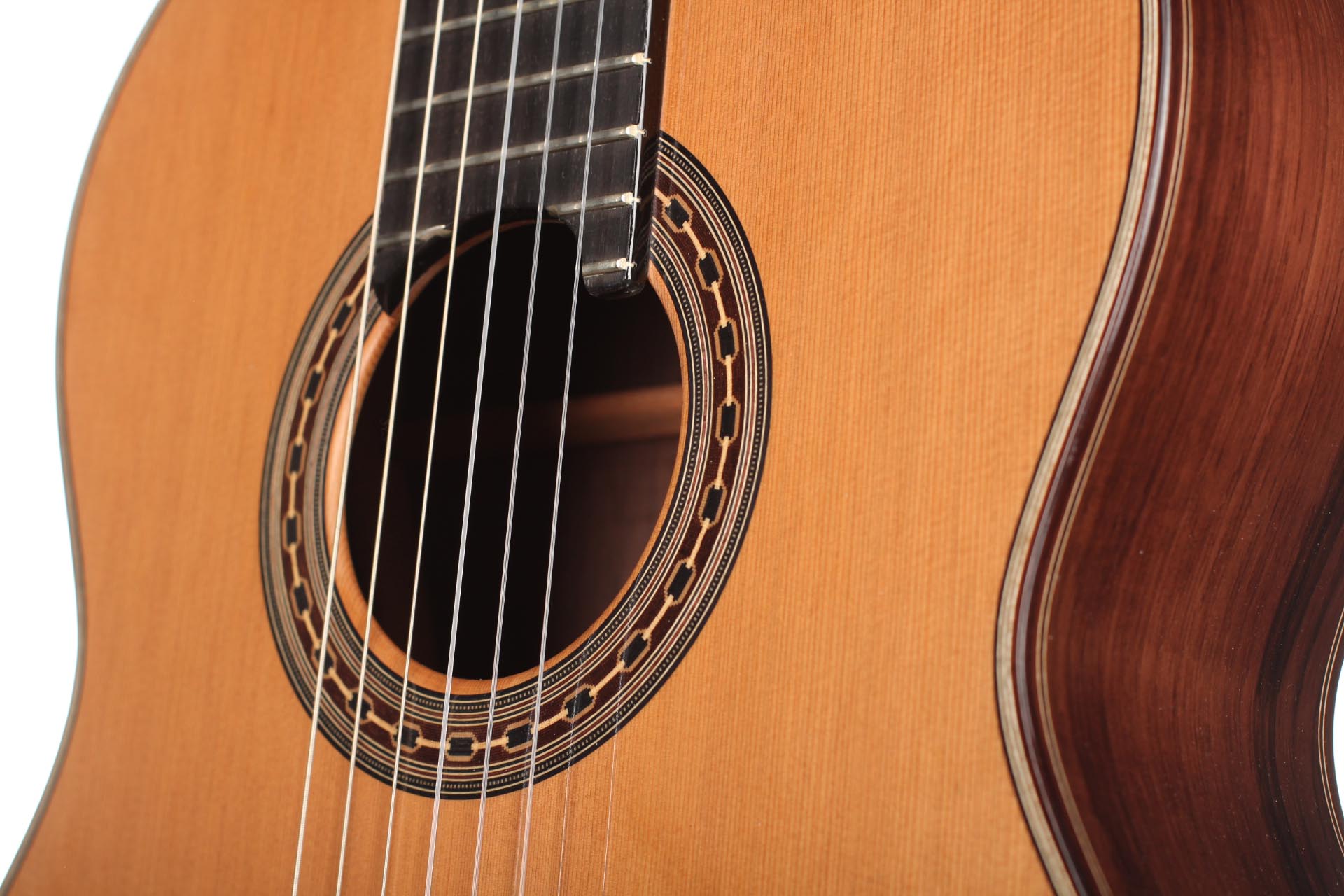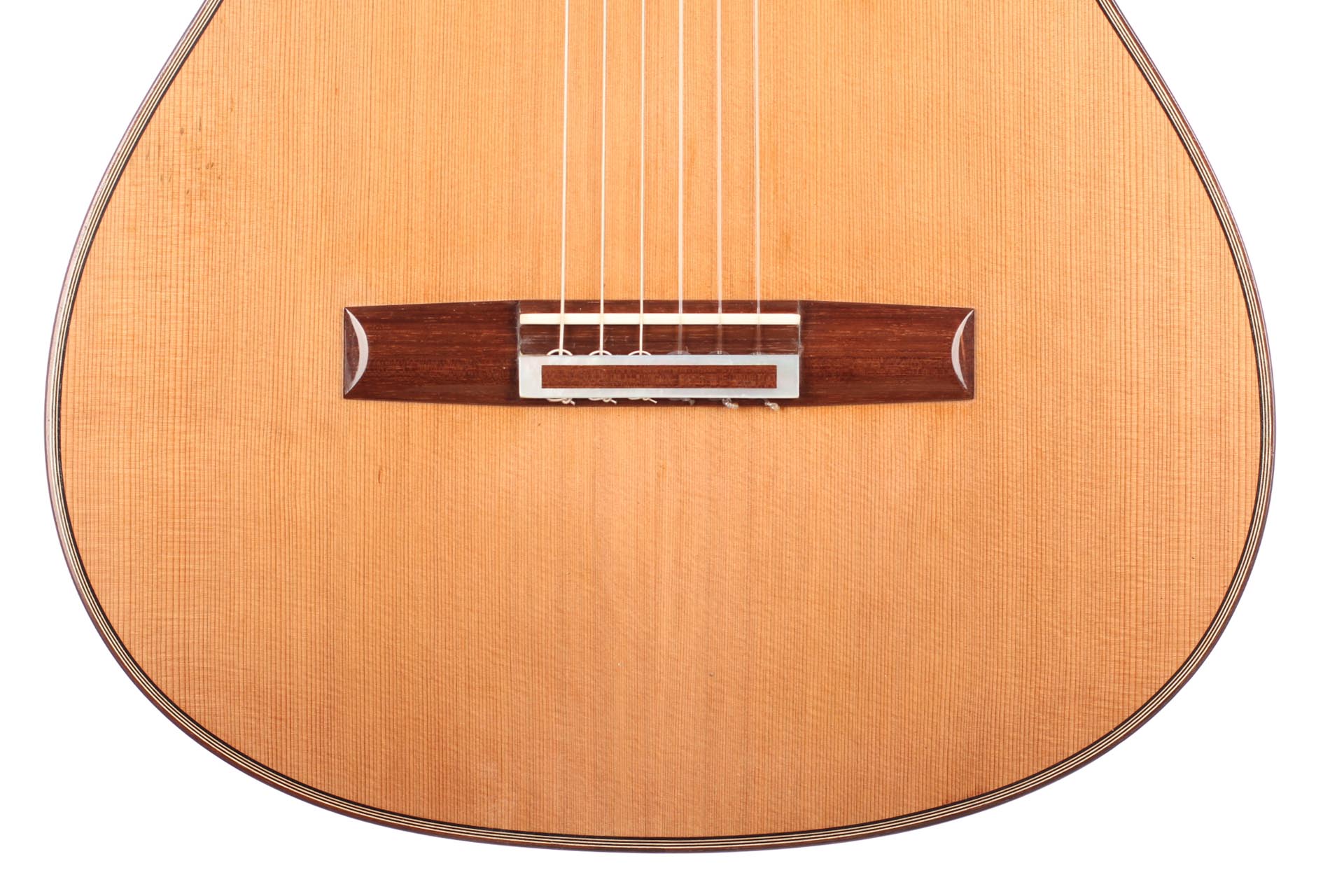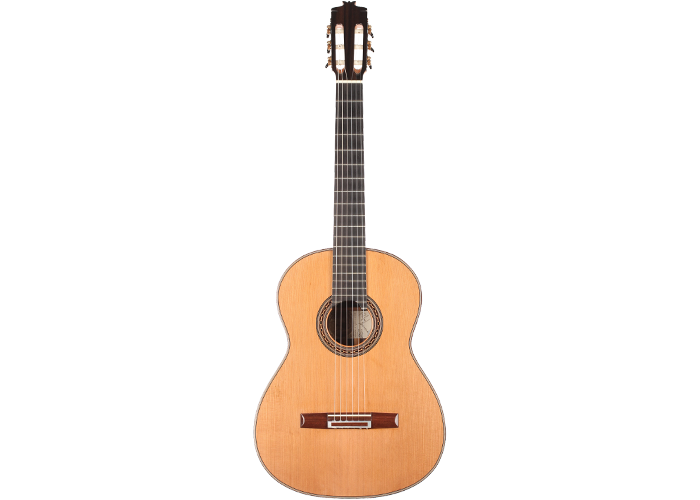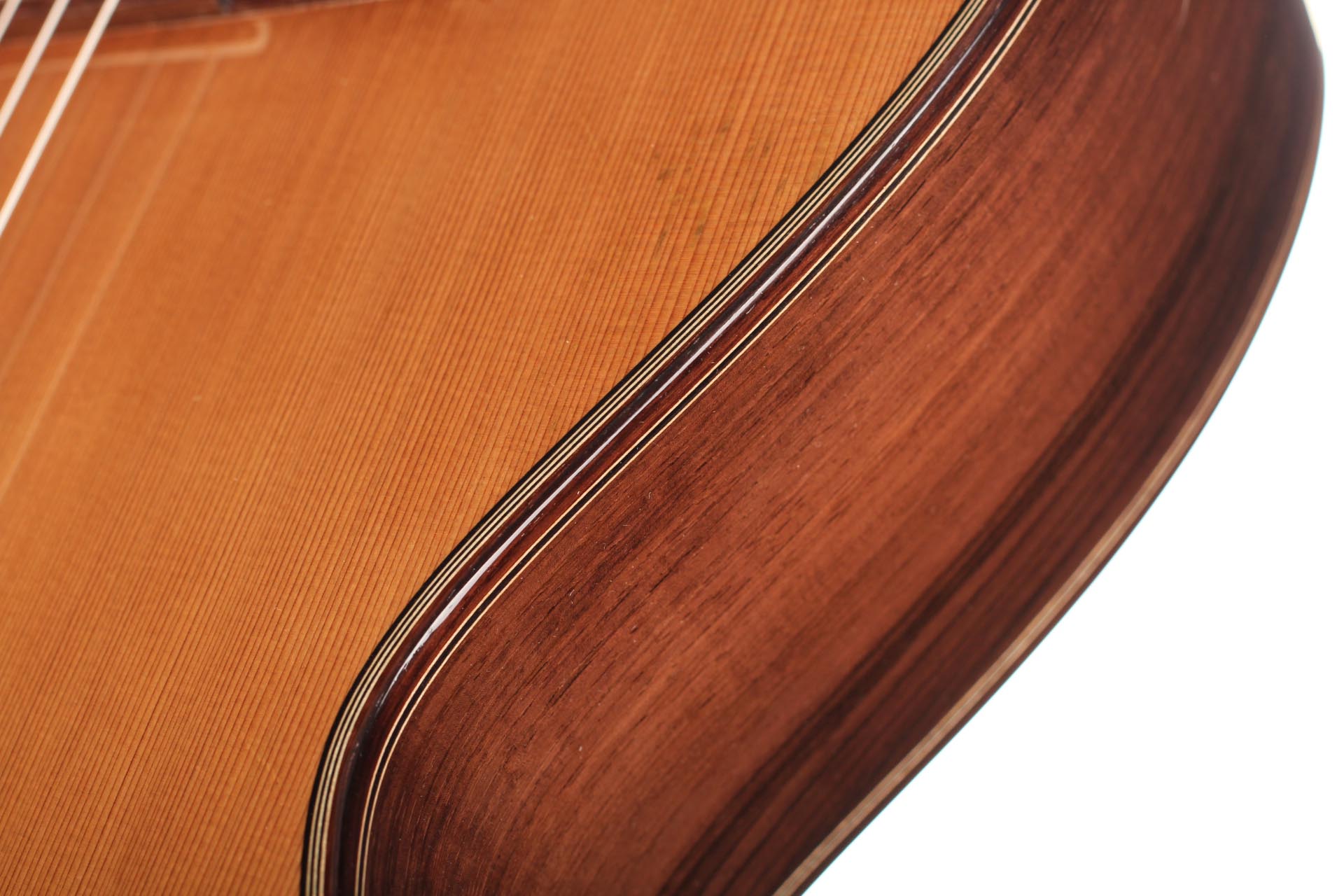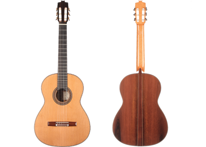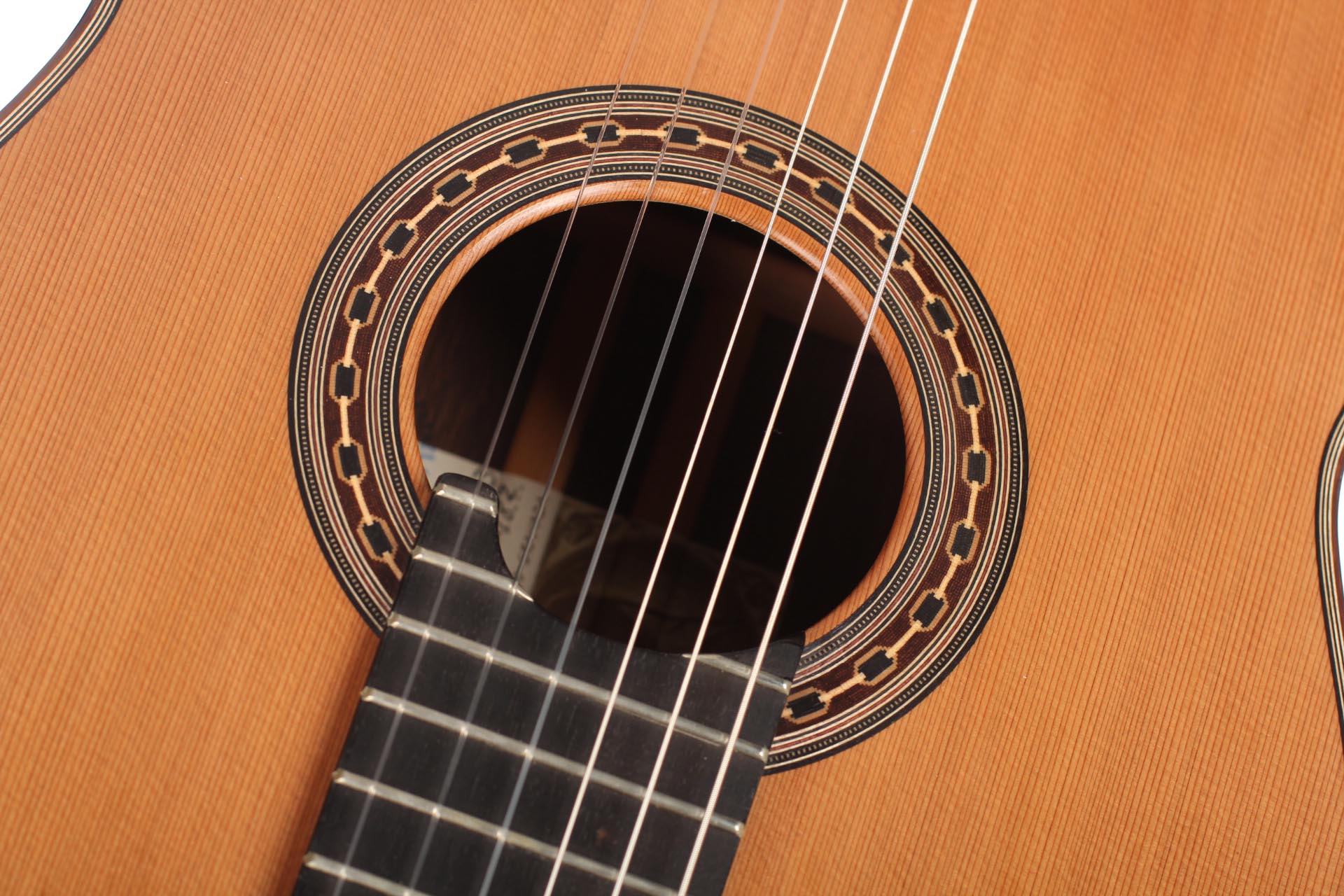 This instrument has a warm and full sound, allowing tragic dynamics and incredibly rich pianos. The guitar is very well balanced and the quality on the tone is constant all along the neck. From bass to treble, it is a generous guitar with plentiful of possibilities and a strong personality. All French-polished. A hard-shell case is included.