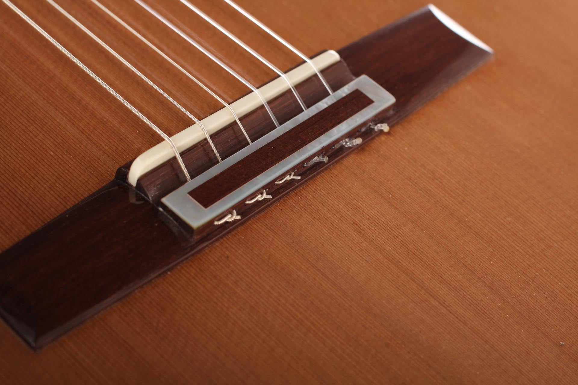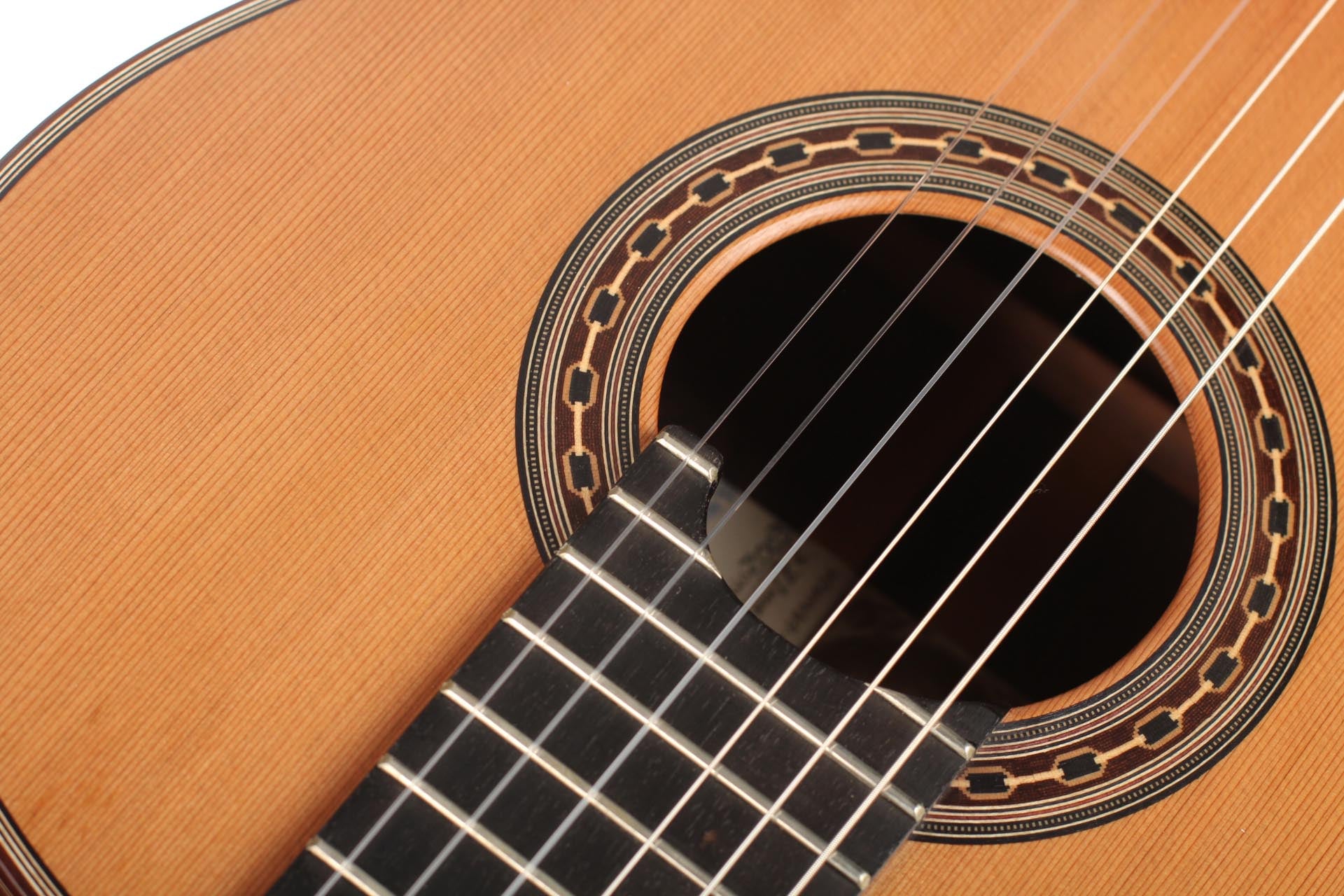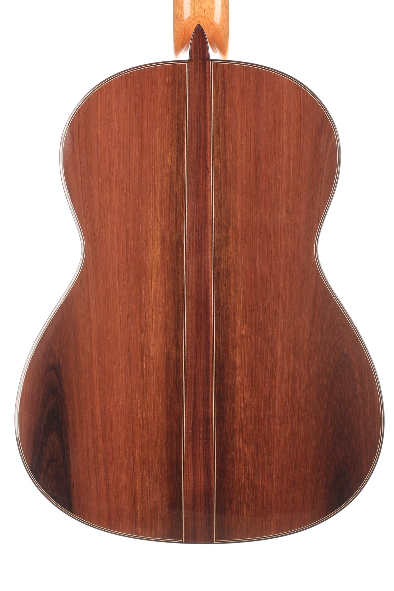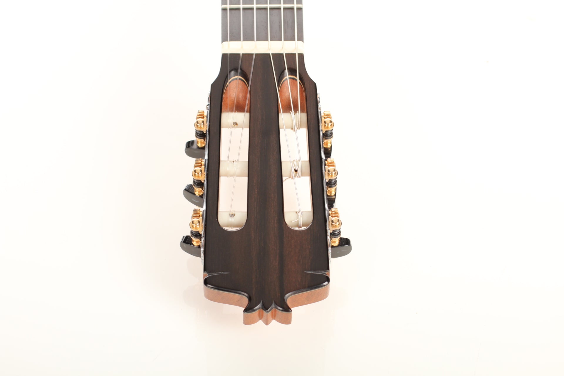 This instrument has a warm and full sound, allowing tragic dynamics and incredibly rich pianos. The guitar is very well balanced and the quality on the tone is constant all along the neck. From bass to treble, it is a generous guitar with plentiful of possibilities and a strong personality. All French-polished. A hard-shell case is included.