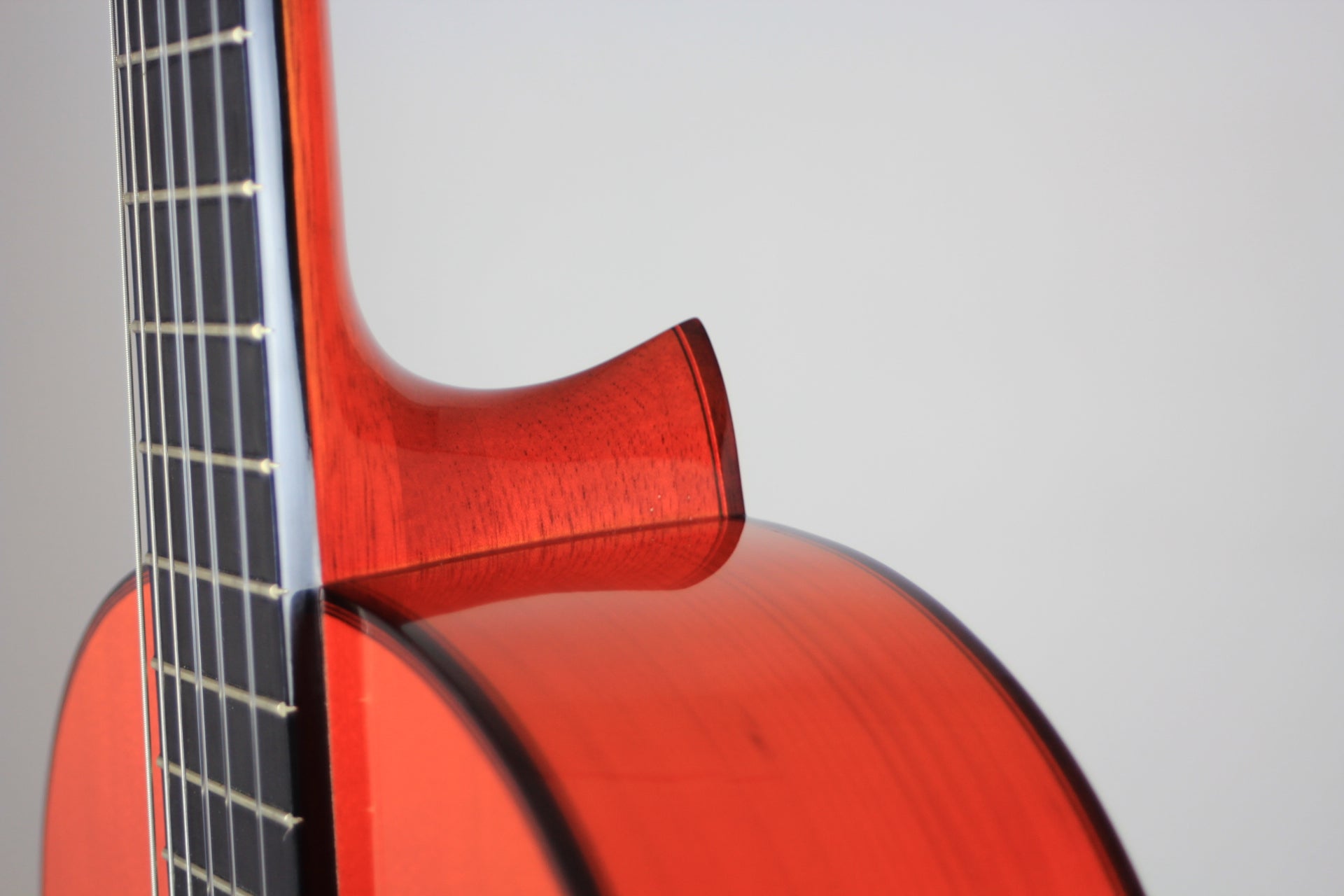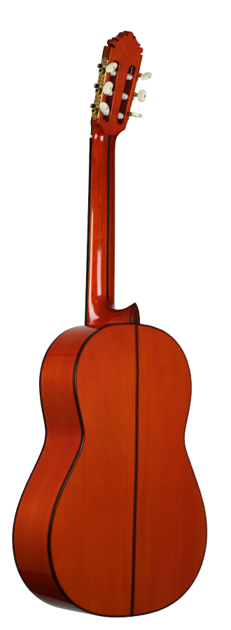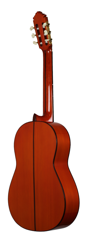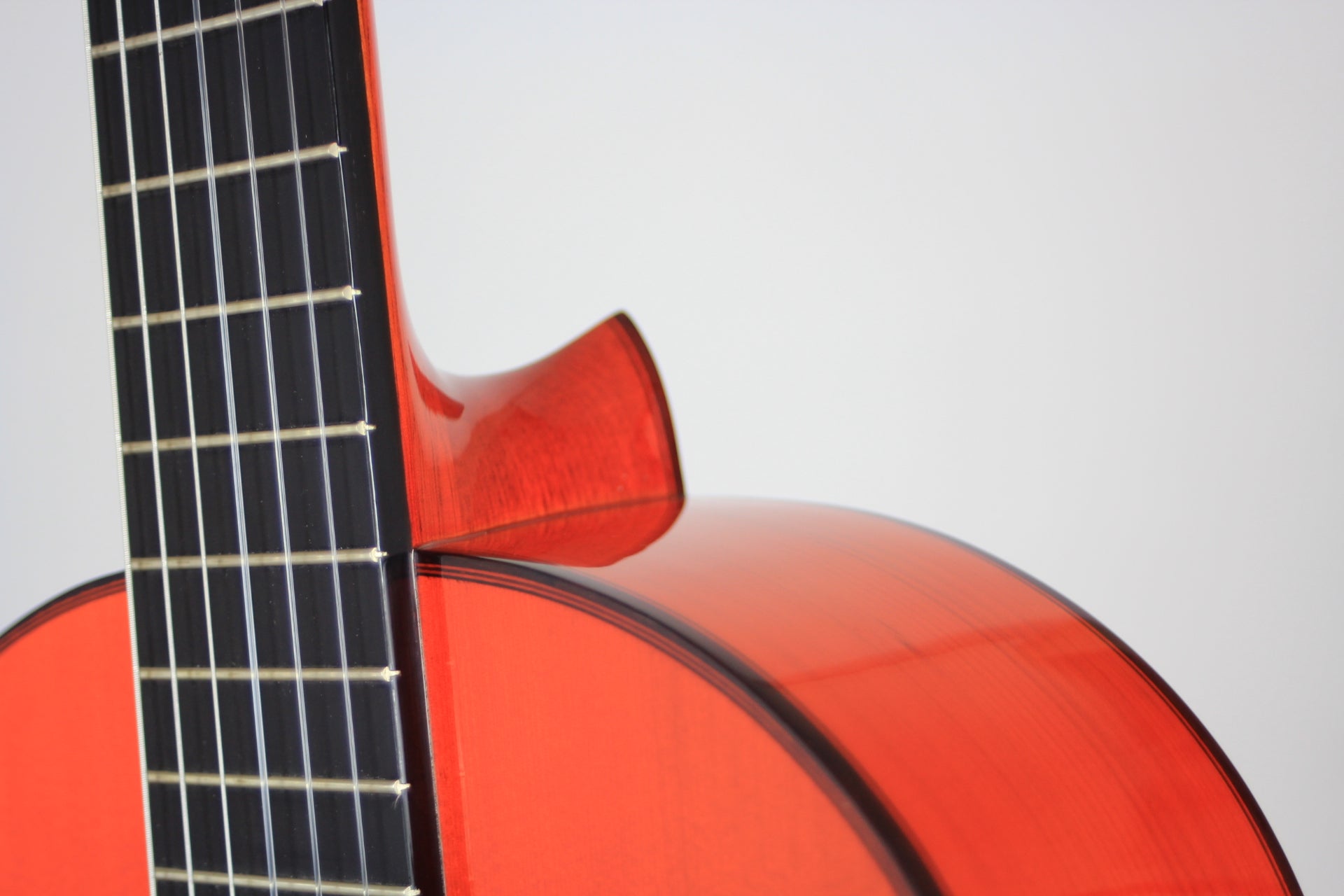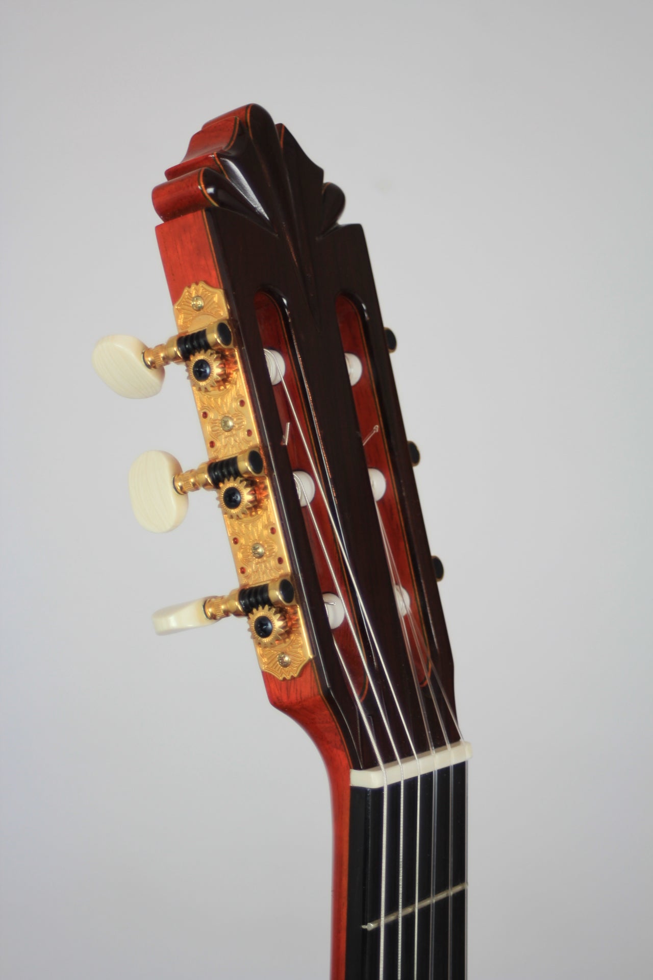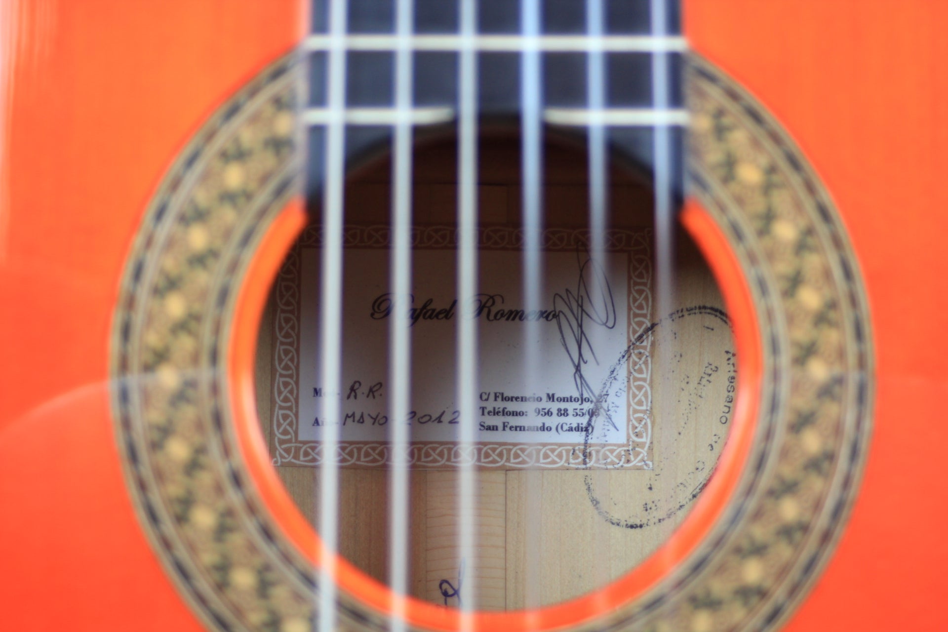 This flamenco guitar was built by Rafael Romero. His guitars are played by guitarists like Manuel and Juan Parilla, Moraito Chico. Rafael not only is a great guitar builder but he is also a great flamenco guitarist so that he can judge and understand easily what a player needs.
