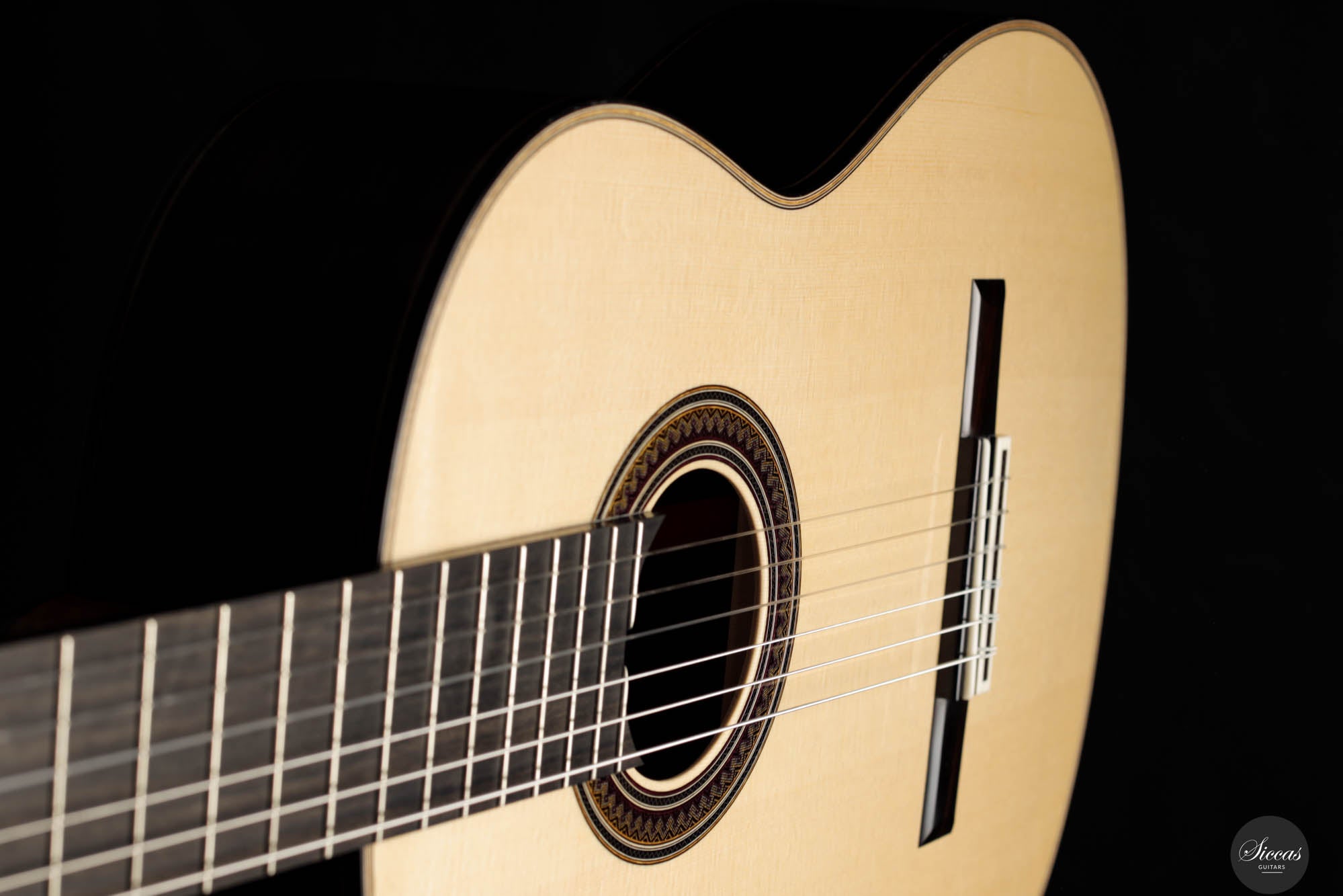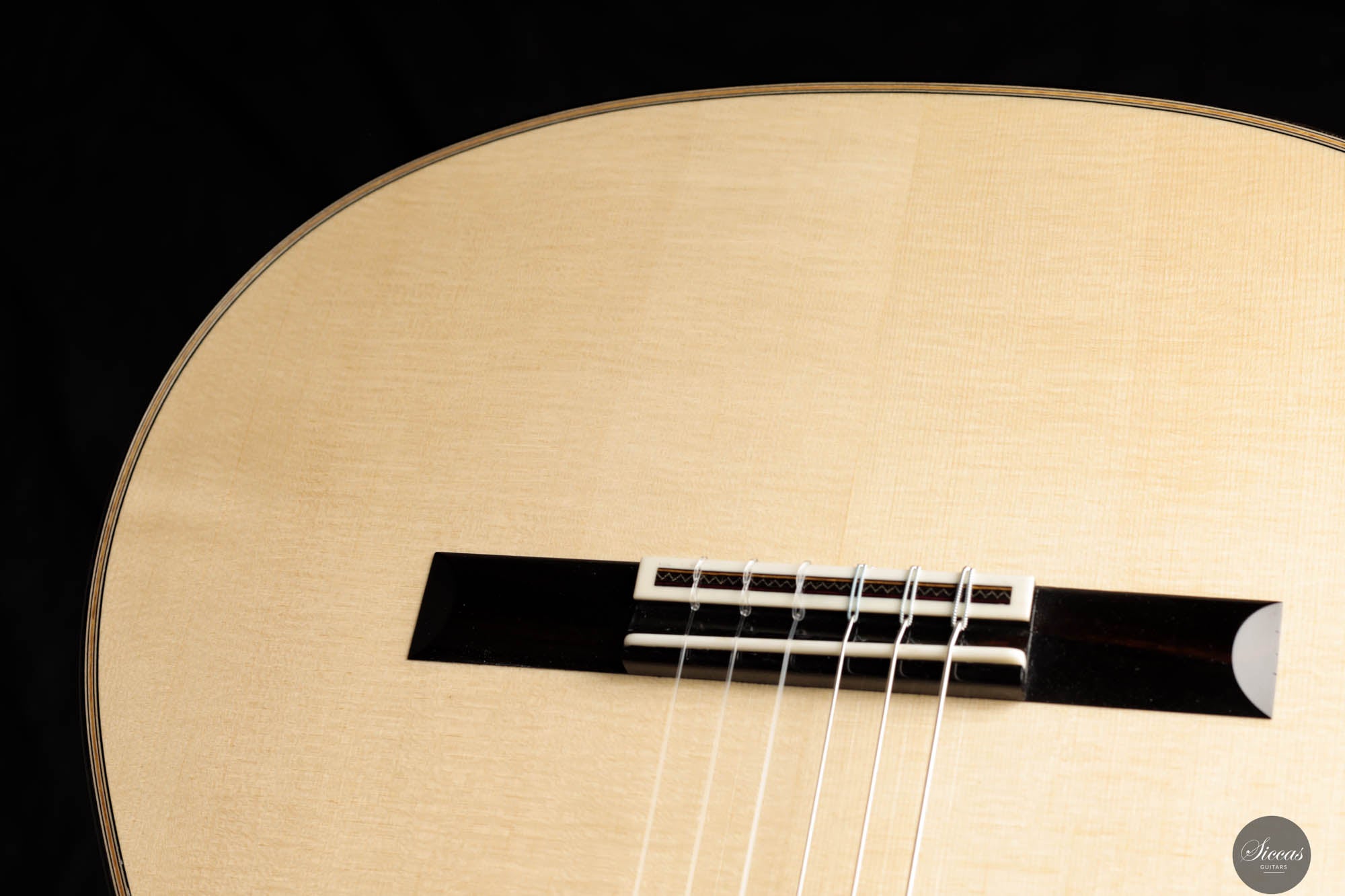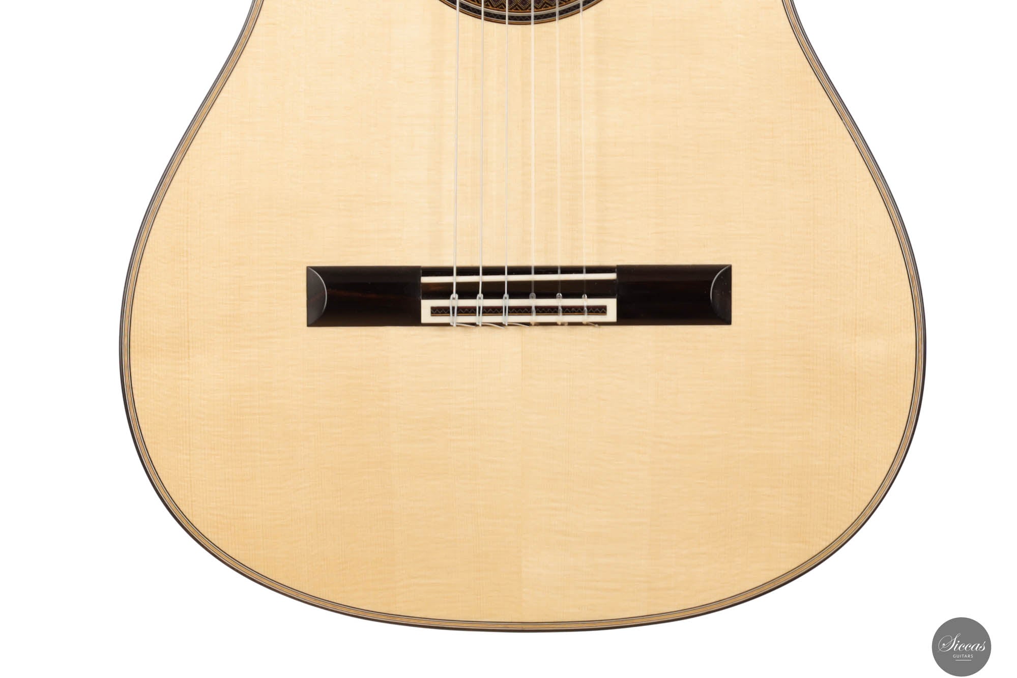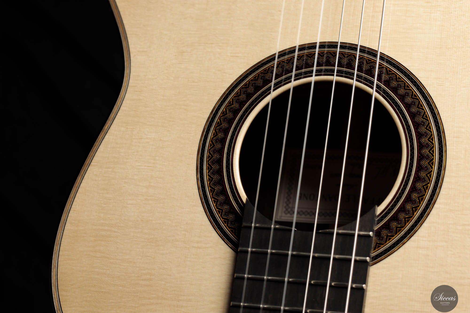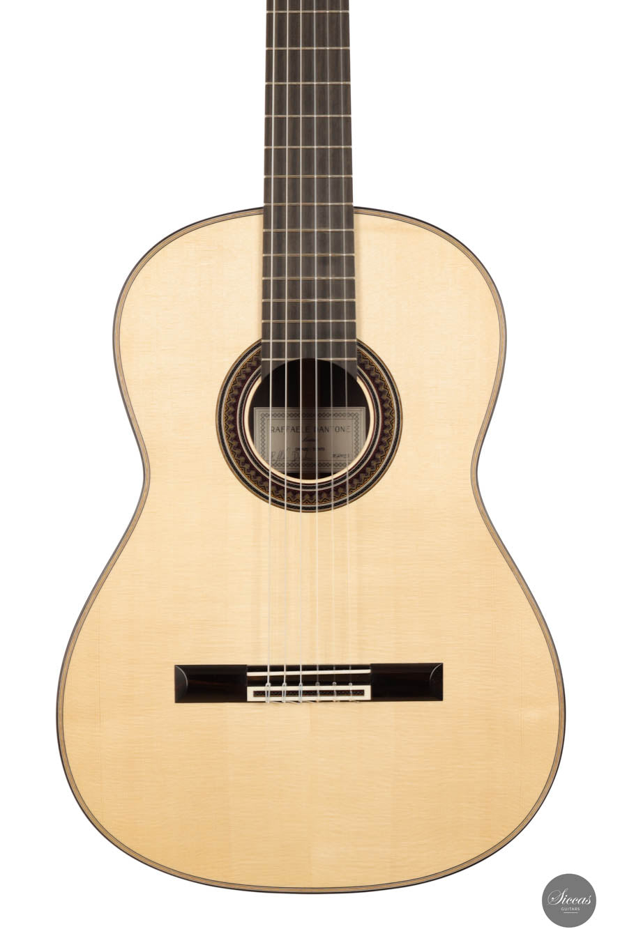 Wir freuen uns, die Arbeit von Raphaelle vorzustellen, einem jungen und immens talentierten Gitarrenbauer, dessen neueste Kreation, Gitarre Nr. 7, seine außergewöhnlichen Holzbearbeitungsfähigkeiten exemplifiziert. Dieses brandneue Instrument ist optisch beeindruckend und zeigt eine verfeinerte Handwerkskunst, die wirklich unübertroffen ist. Raphaelle hat sich von den traditionellen Fächerbeleistungen von Antonio de Torres inspirieren lassen, hat das Design jedoch durch Einbeziehung dickerer Seiten verbessert. Diese Modifikation trägt nicht nur zur strukturellen Integrität der Gitarre bei, sondern verbessert auch erheblich ihre Projektion. Die Akustik der Gitarre ist bemerkenswert, mit kristallklaren Höhen, die melodisch unter der Berührung des Spielers singen, ergänzt durch tiefe Bässe, die auf einer Hauptfrequenz von F# resonieren und eine robuste Grundlage für den Gesamtklang bieten. Diese Gitarre ist ein Zeugnis für Raphaelles Können und Potenzial, das unter der Anleitung des renommierten Gitarrenbauers Danielle Marrabello geschärft wurde, was sie in jeder Hinsicht zu einem wahrhaft schönen Instrument macht.