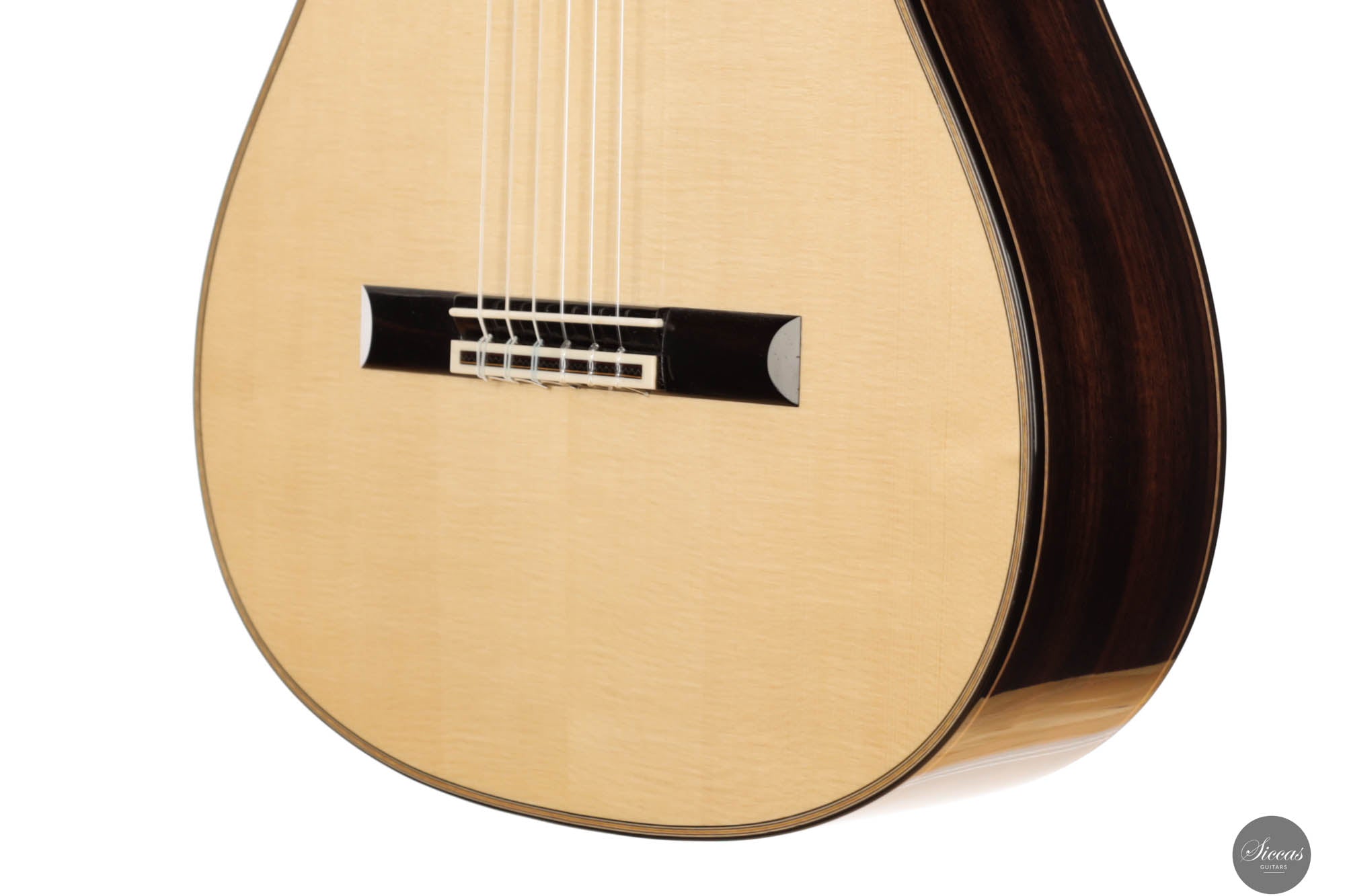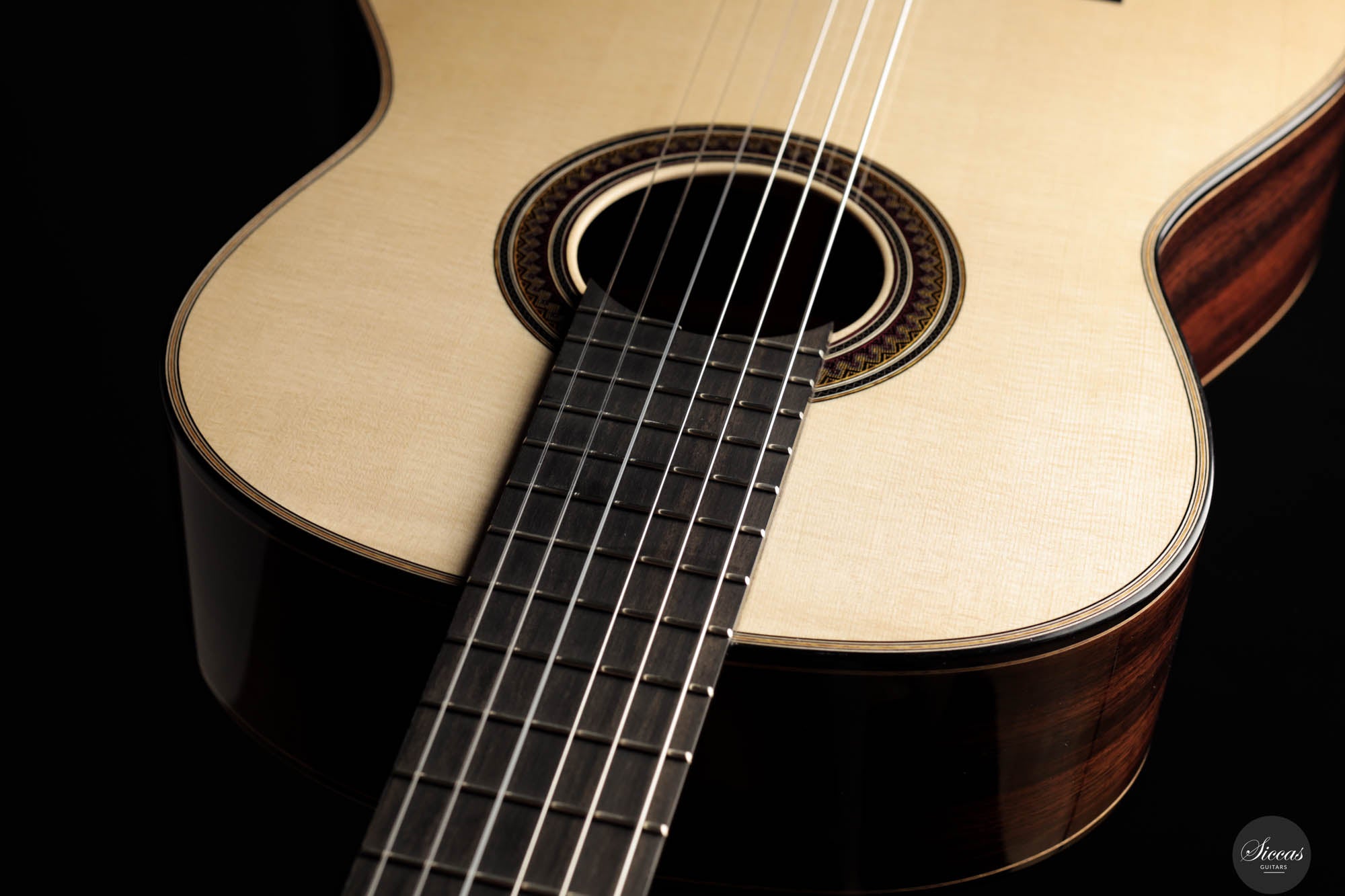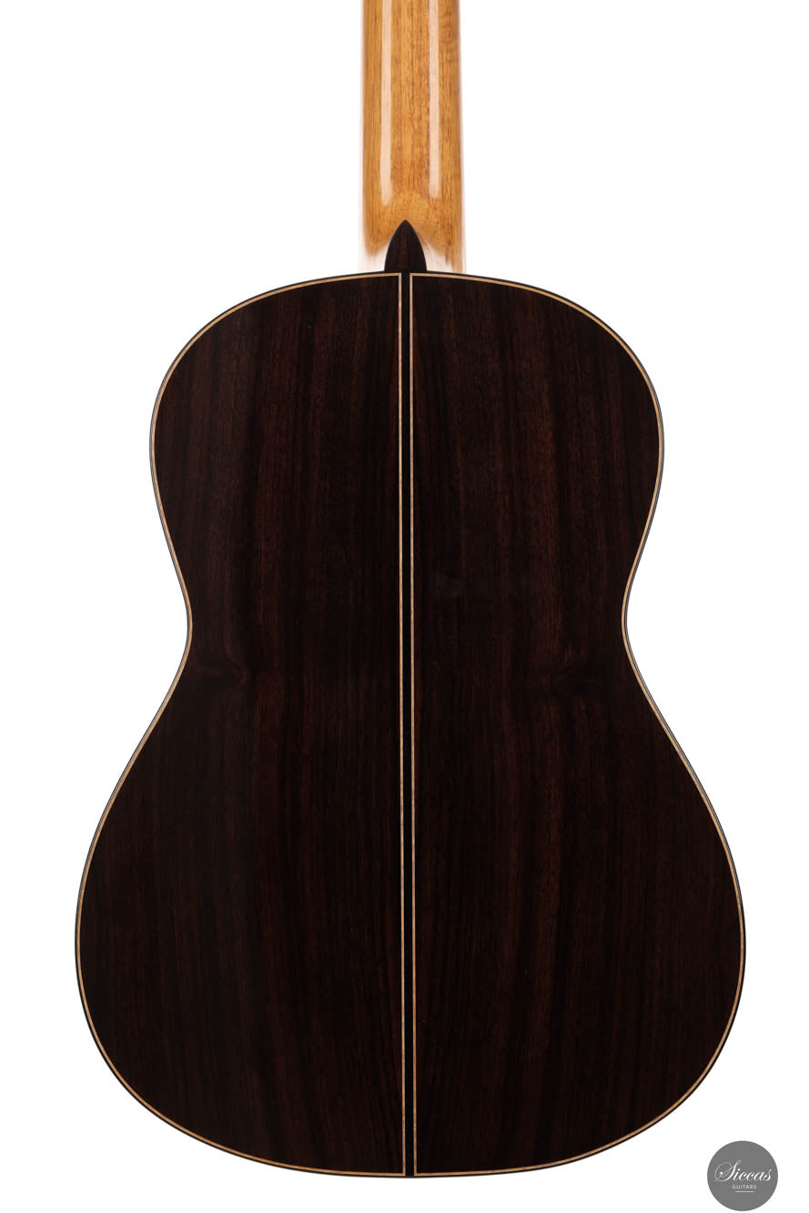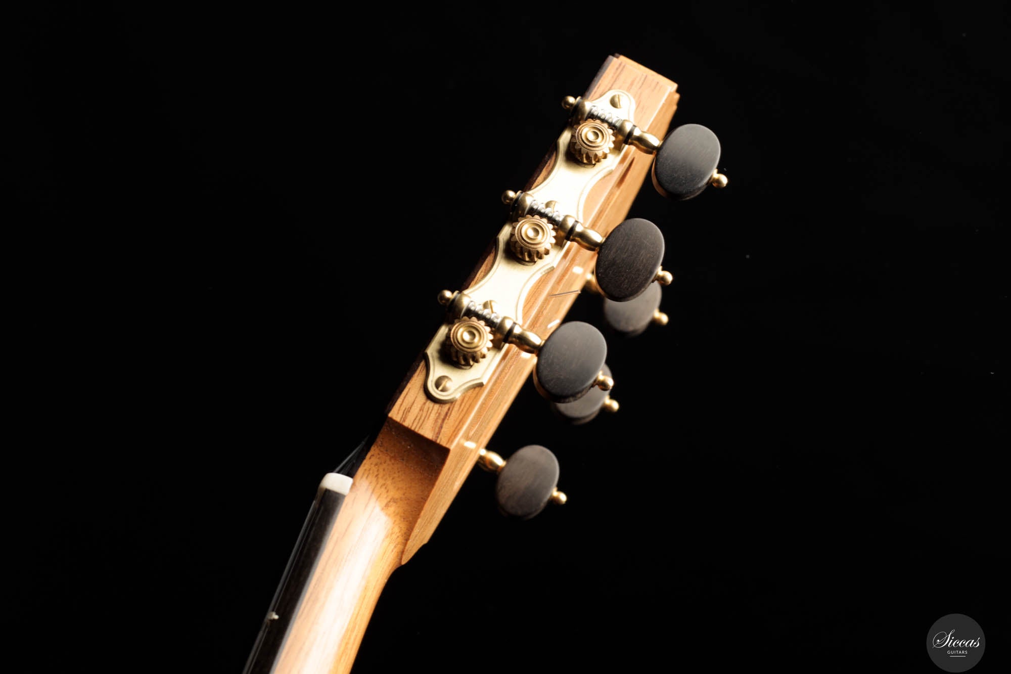 Wir freuen uns, die Arbeit von Raphaelle vorzustellen, einem jungen und immens talentierten Gitarrenbauer, dessen neueste Kreation, Gitarre Nr. 7, seine außergewöhnlichen Holzbearbeitungsfähigkeiten exemplifiziert. Dieses brandneue Instrument ist optisch beeindruckend und zeigt eine verfeinerte Handwerkskunst, die wirklich unübertroffen ist. Raphaelle hat sich von den traditionellen Fächerbeleistungen von Antonio de Torres inspirieren lassen, hat das Design jedoch durch Einbeziehung dickerer Seiten verbessert. Diese Modifikation trägt nicht nur zur strukturellen Integrität der Gitarre bei, sondern verbessert auch erheblich ihre Projektion. Die Akustik der Gitarre ist bemerkenswert, mit kristallklaren Höhen, die melodisch unter der Berührung des Spielers singen, ergänzt durch tiefe Bässe, die auf einer Hauptfrequenz von F# resonieren und eine robuste Grundlage für den Gesamtklang bieten. Diese Gitarre ist ein Zeugnis für Raphaelles Können und Potenzial, das unter der Anleitung des renommierten Gitarrenbauers Danielle Marrabello geschärft wurde, was sie in jeder Hinsicht zu einem wahrhaft schönen Instrument macht.