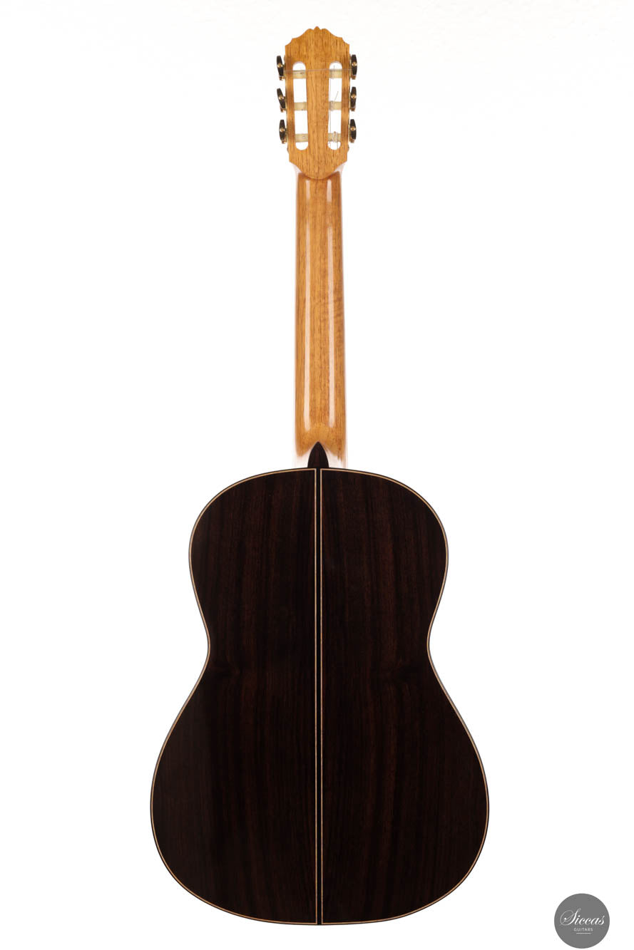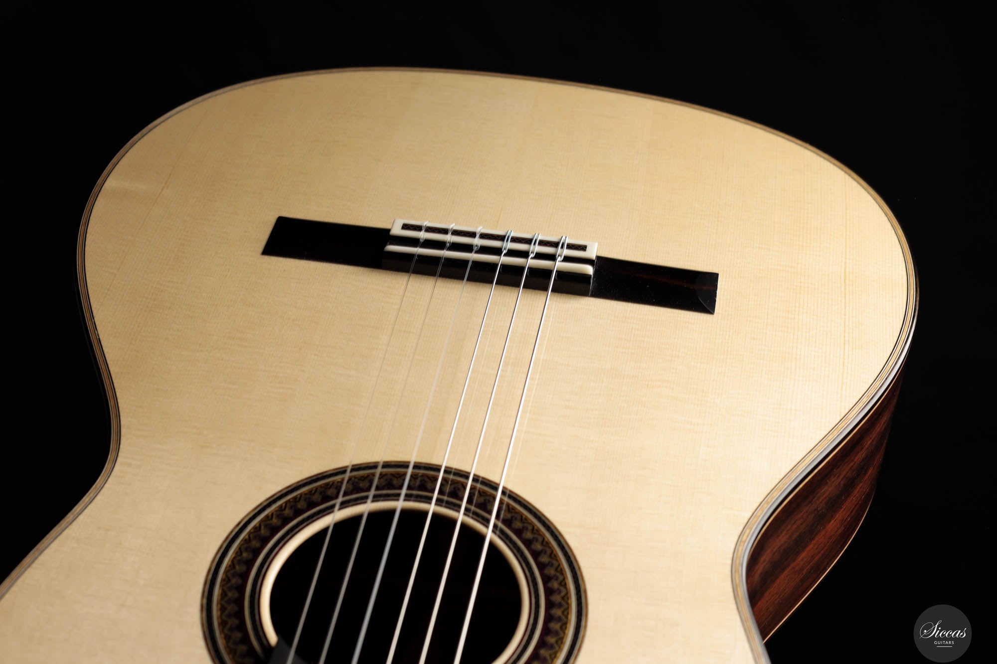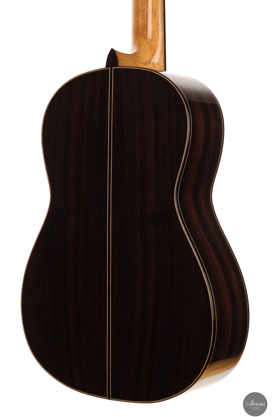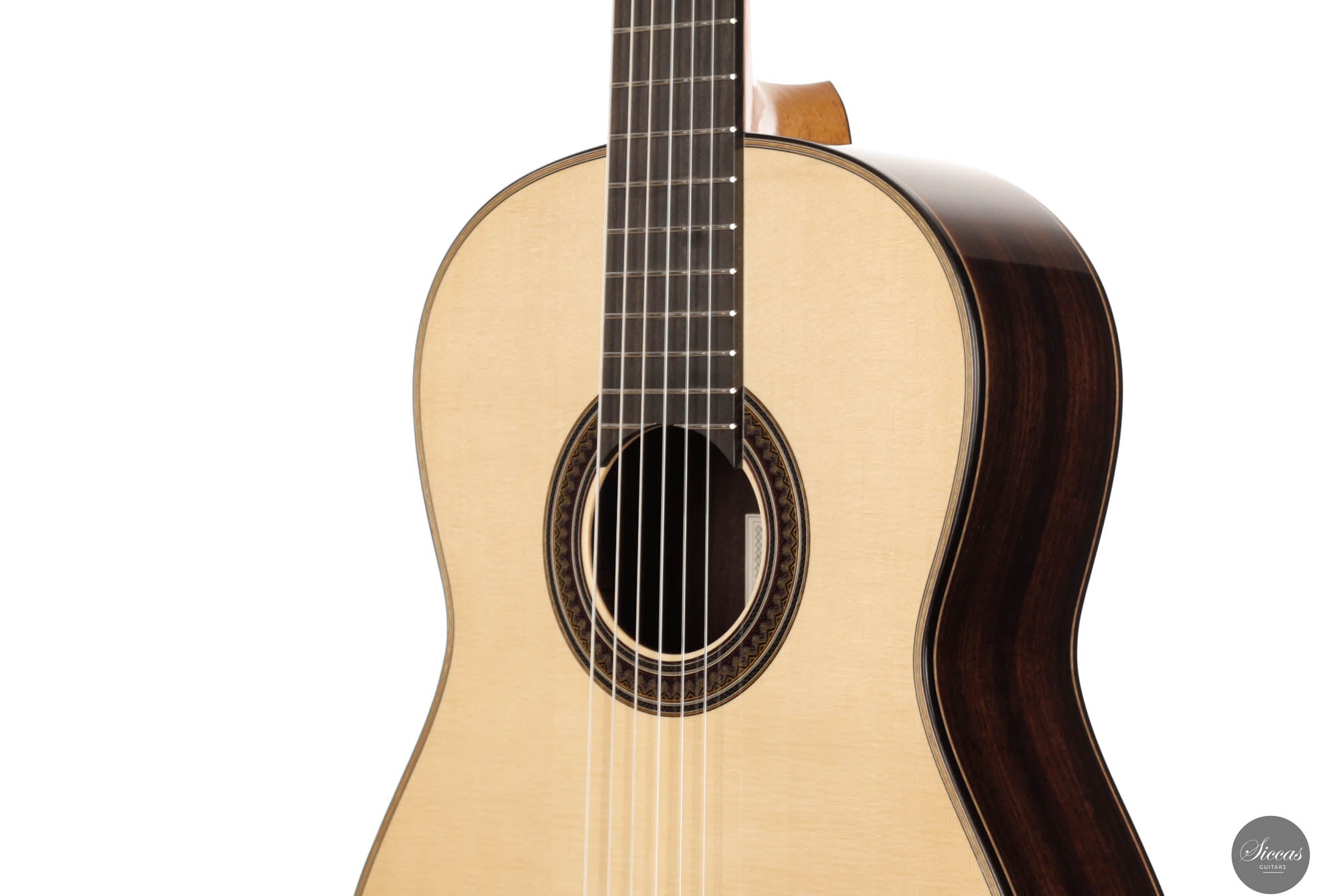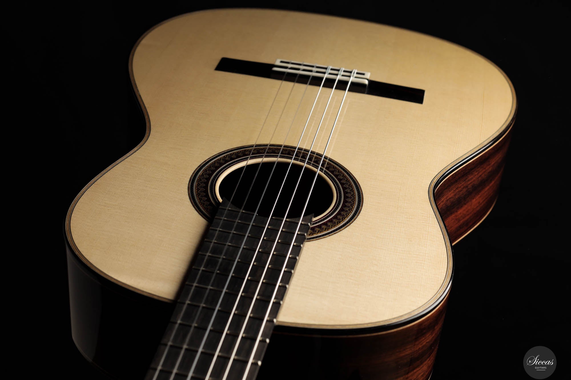 Wir freuen uns, die Arbeit von Raphaelle vorzustellen, einem jungen und immens talentierten Gitarrenbauer, dessen neueste Kreation, Gitarre Nr. 7, seine außergewöhnlichen Holzbearbeitungsfähigkeiten exemplifiziert. Dieses brandneue Instrument ist optisch beeindruckend und zeigt eine verfeinerte Handwerkskunst, die wirklich unübertroffen ist. Raphaelle hat sich von den traditionellen Fächerbeleistungen von Antonio de Torres inspirieren lassen, hat das Design jedoch durch Einbeziehung dickerer Seiten verbessert. Diese Modifikation trägt nicht nur zur strukturellen Integrität der Gitarre bei, sondern verbessert auch erheblich ihre Projektion. Die Akustik der Gitarre ist bemerkenswert, mit kristallklaren Höhen, die melodisch unter der Berührung des Spielers singen, ergänzt durch tiefe Bässe, die auf einer Hauptfrequenz von F# resonieren und eine robuste Grundlage für den Gesamtklang bieten. Diese Gitarre ist ein Zeugnis für Raphaelles Können und Potenzial, das unter der Anleitung des renommierten Gitarrenbauers Danielle Marrabello geschärft wurde, was sie in jeder Hinsicht zu einem wahrhaft schönen Instrument macht.