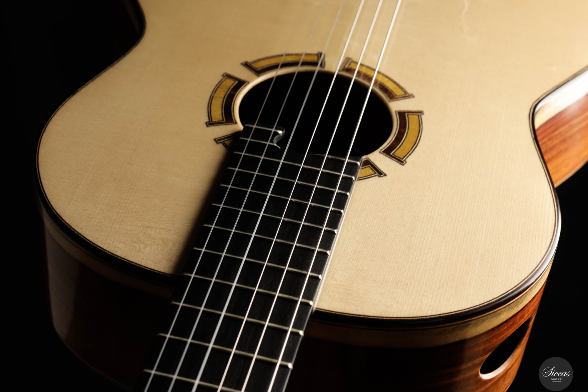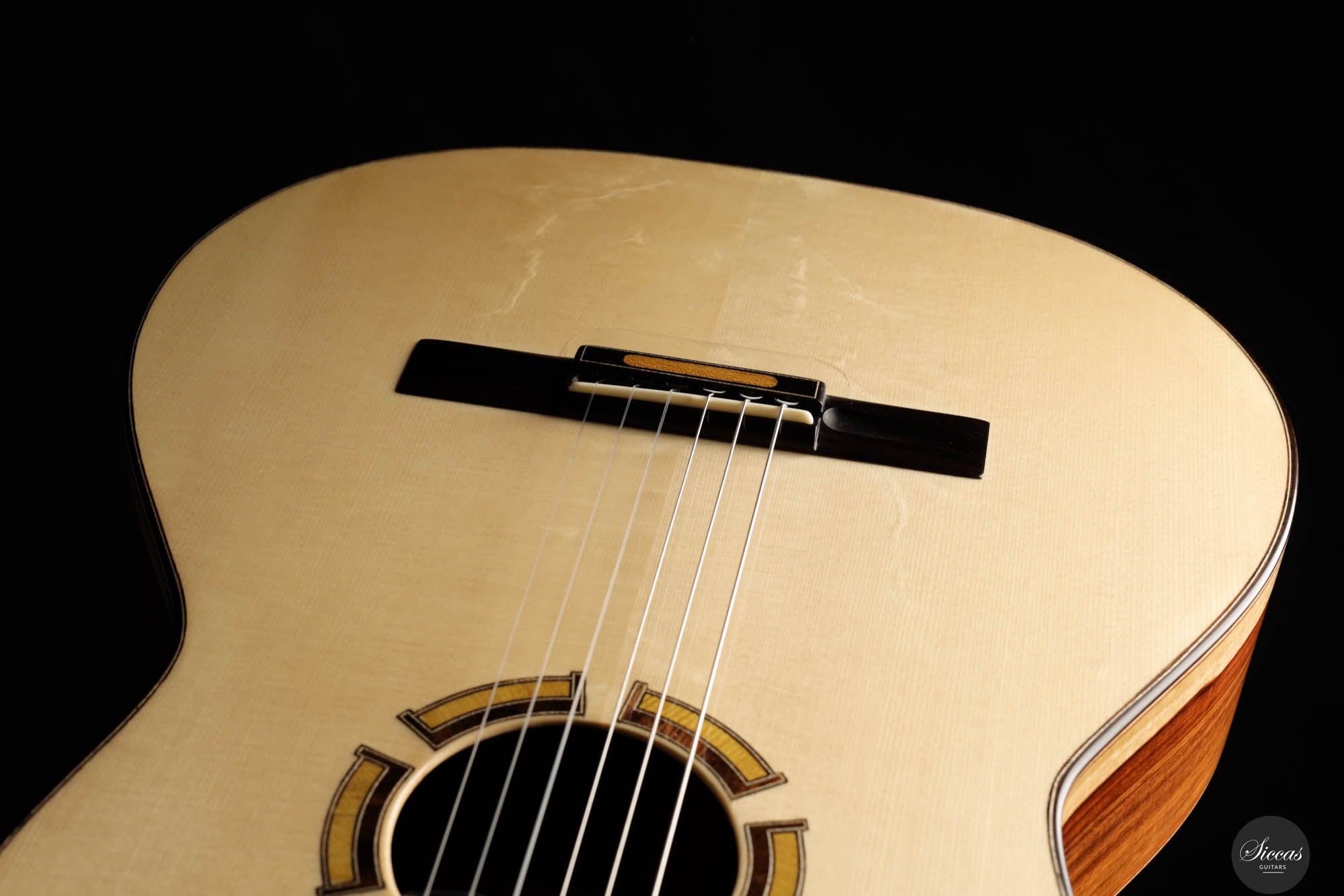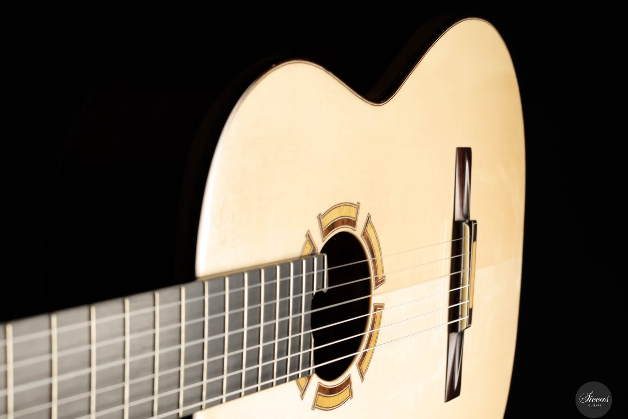 Die Gitarre Nr. 461 ist eine bemerkenswerte Konzertgitarre, die traditionelle Handwerkskunst mit modernen akustischen Weiterentwicklungen vereint. Mit einer wunderschönen Fichtendecke und Granadillo für Rücken und Zargen ist sie sowohl ein Genuss zu spielen als auch ein optisch beeindruckendes Instrument. Durch ein modernes Schallloch an der Seite wird die Lautstärke und Projektion verbessert, was sie ideal für Konzertauftritte in unterschiedlichsten Settings macht. Ihre Konstruktion spiegelt ein klares Engagement für Qualität wider und bietet Musikern eine vielseitige Option, die die Tiefe des traditionellen Tons mit den Vorteilen zeitgemäßer Innovationen kombiniert.