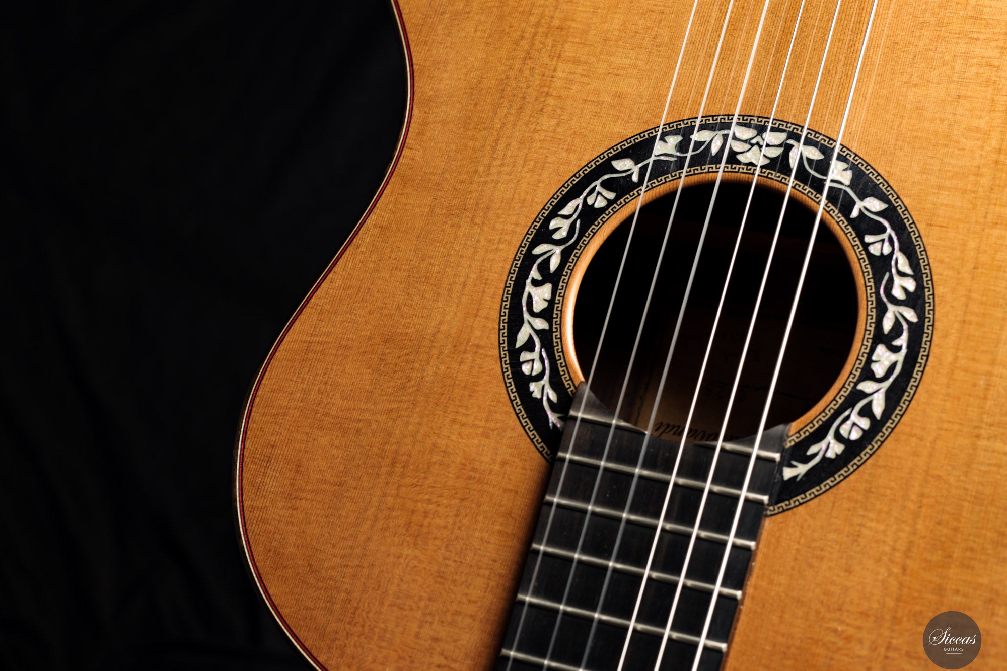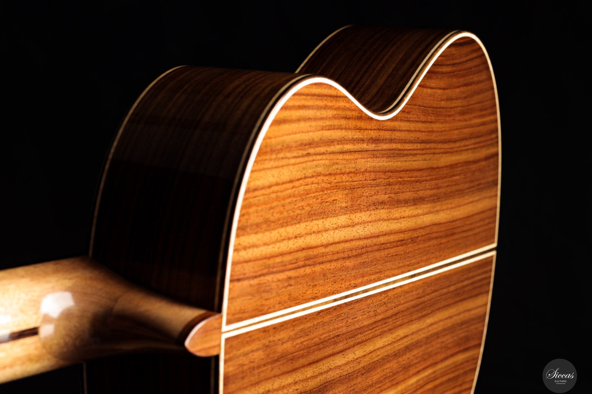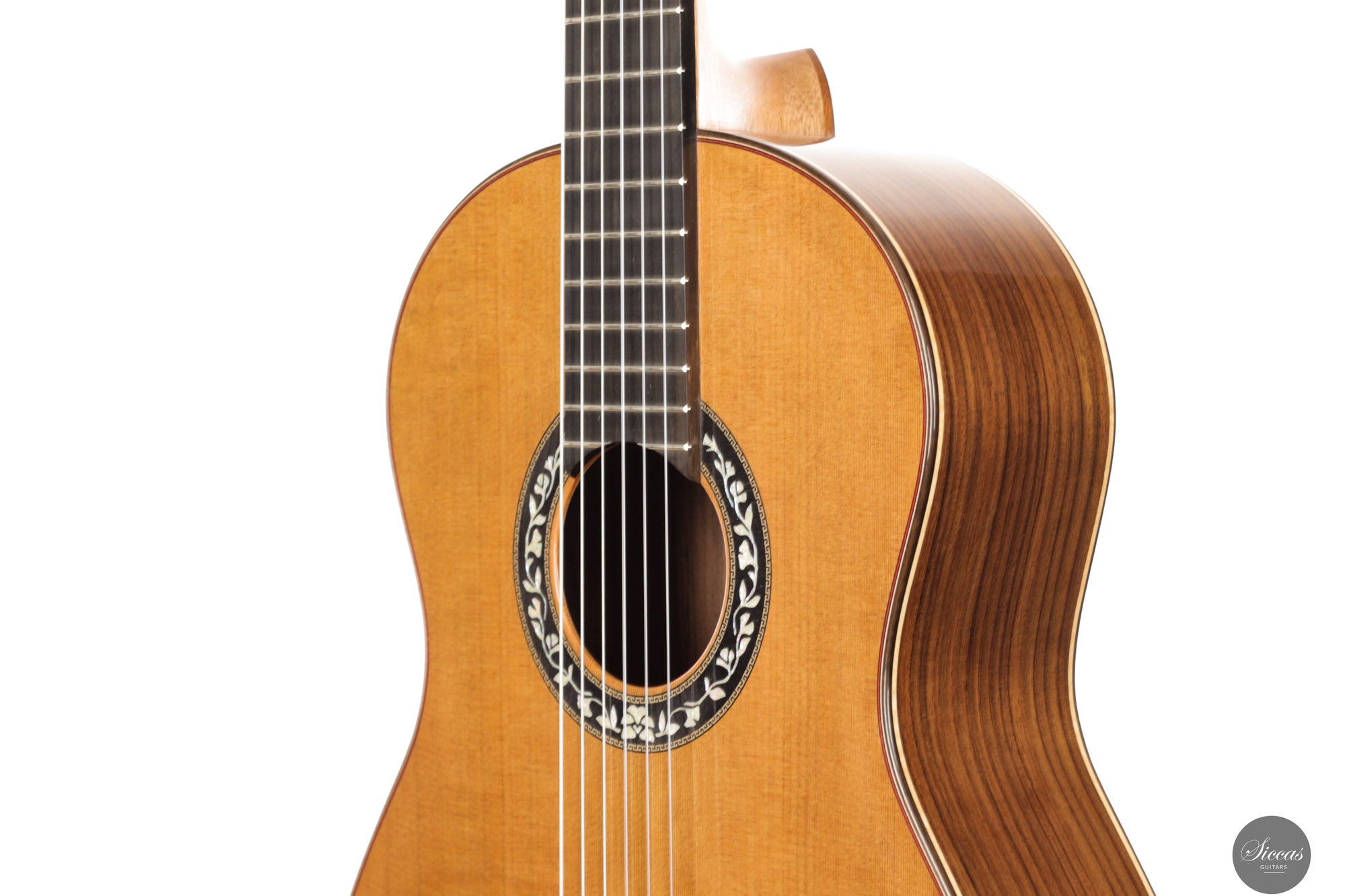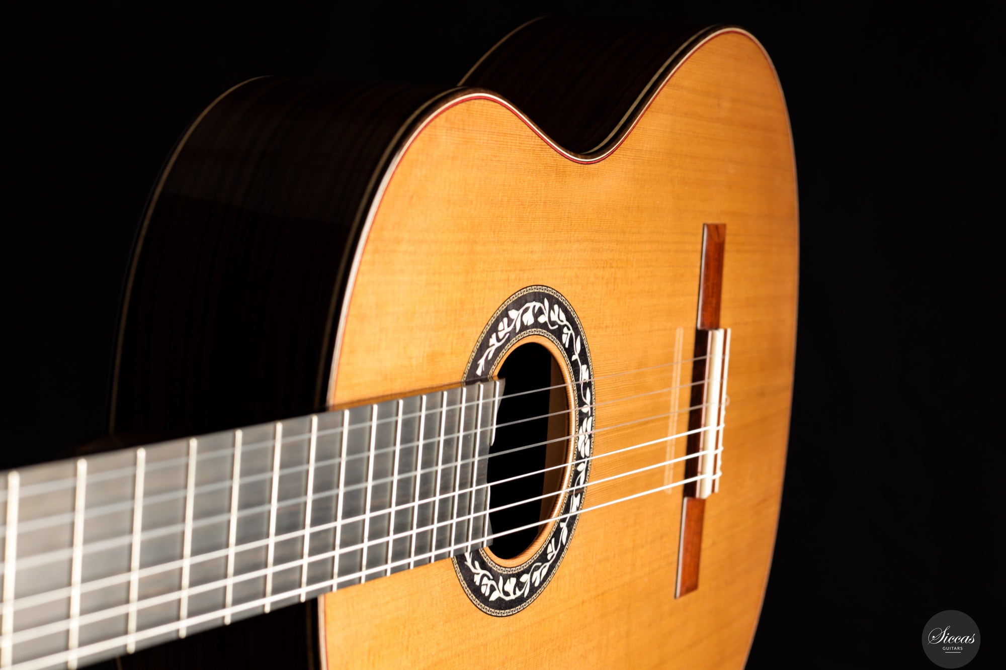 Die Decke wurde nach seiner eigenen Interpretation des Fächerbeleistungssystems gebaut, wobei auch Anregungen aus dem Gespräch mit Coriani eingeflossen sind. Eine florale Rosette mit Mosaikrahmung verleiht dem Instrument ein elegantes, feines Erscheinungsbild. Für die Stegeinlage wählte er ein besonders schönes Stück Madagaskar-Palisander, inspiriert von den klanglichen Eigenschaften dieses Holzes. Der Boden aus ostindischem Palisander wurde gezielt auf bestimmte Schwingungsmodi abgestimmt. Mit einer Eigenresonanz zwischen Fis und G bietet die Gitarre einen ausgewogenen, reaktionsfreudigen Klang mit klaren, tragenden Höhen und tiefen, wohlgeformten Bässen.
