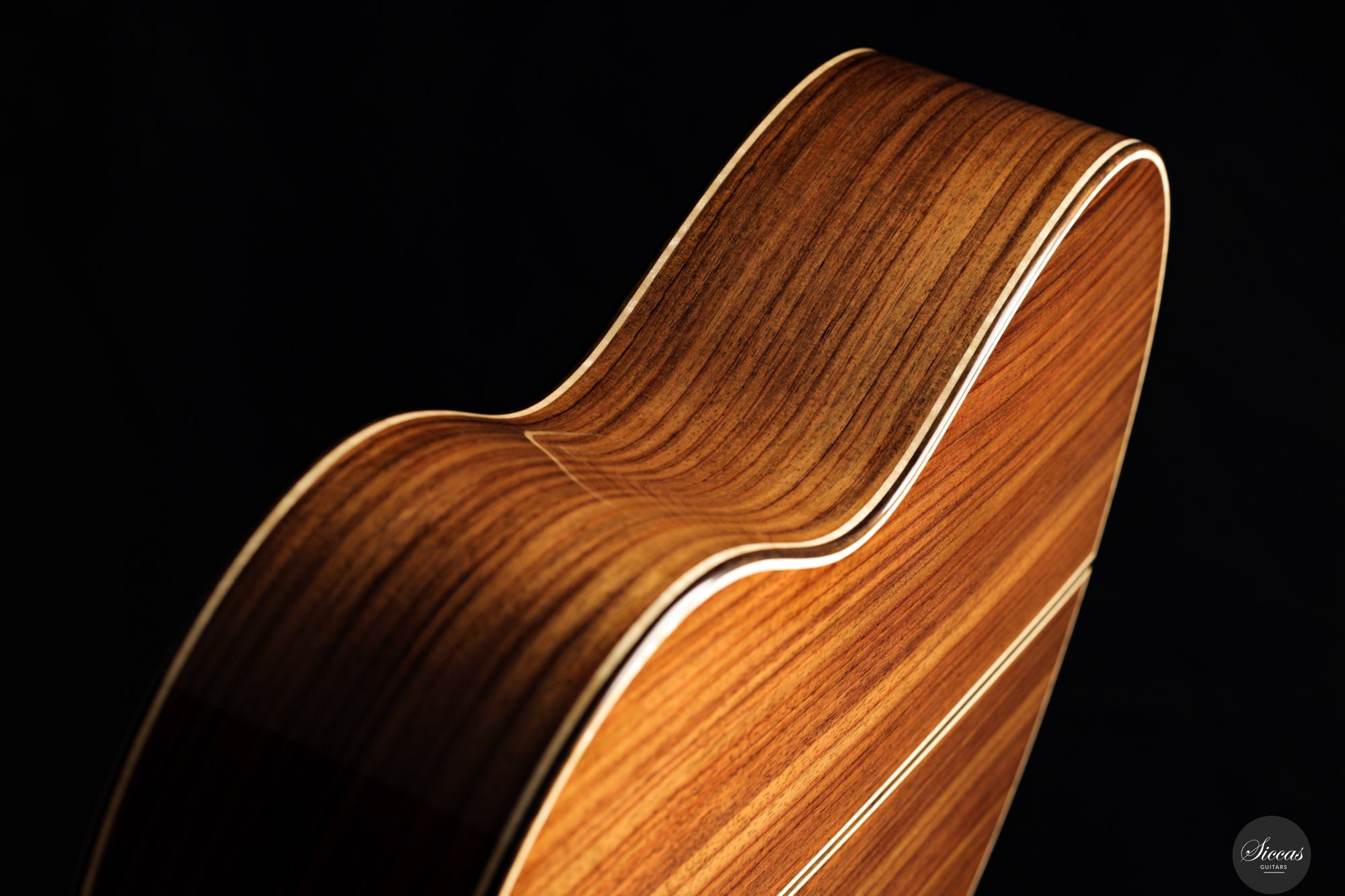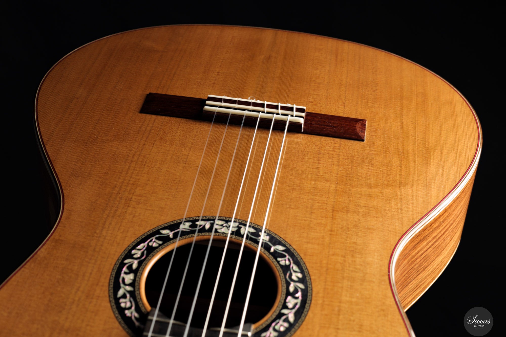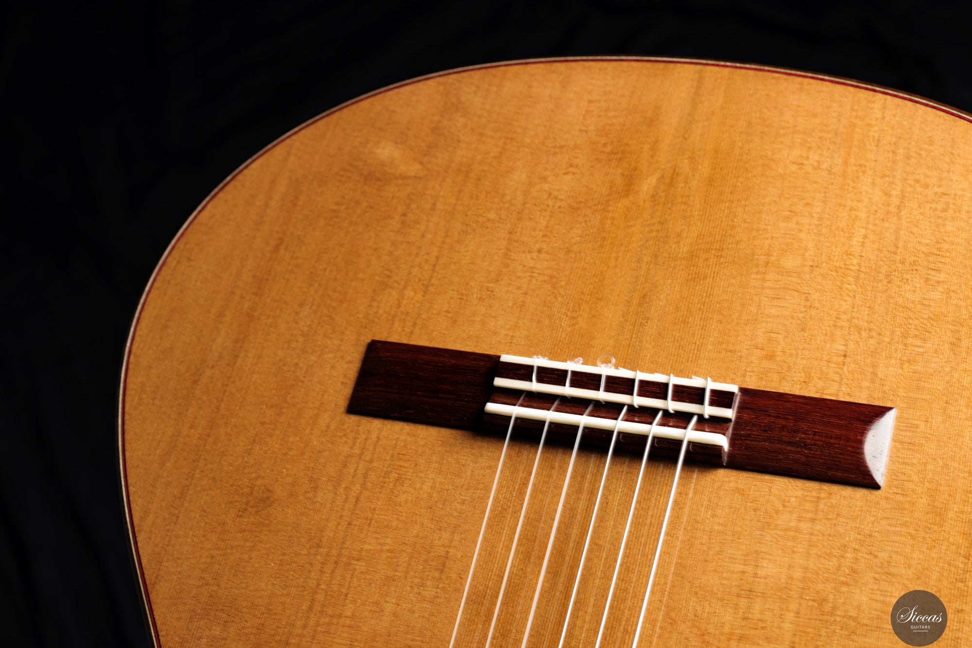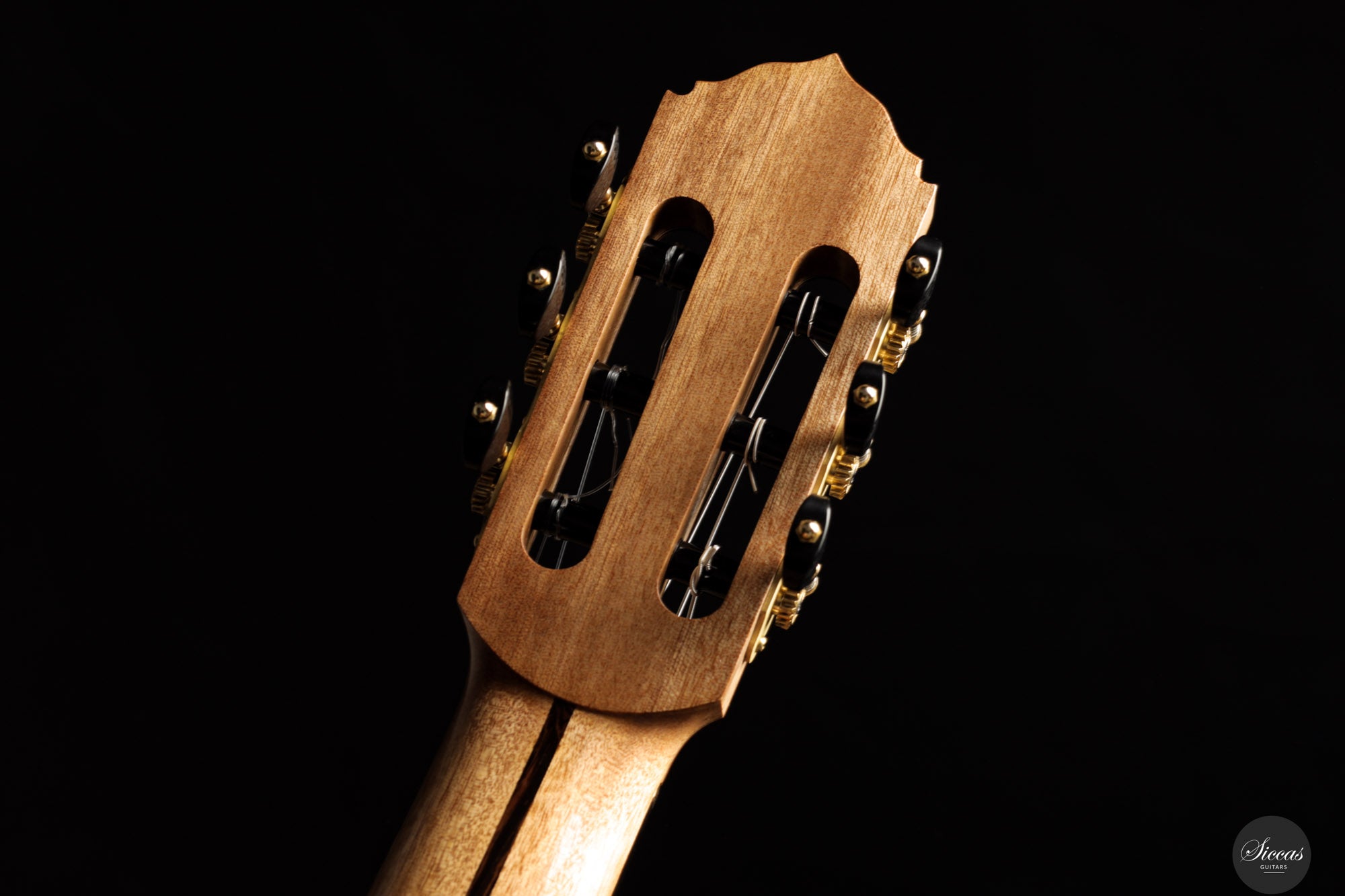 Die Decke wurde nach seiner eigenen Interpretation des Fächerbeleistungssystems gebaut, wobei auch Anregungen aus dem Gespräch mit Coriani eingeflossen sind. Eine florale Rosette mit Mosaikrahmung verleiht dem Instrument ein elegantes, feines Erscheinungsbild. Für die Stegeinlage wählte er ein besonders schönes Stück Madagaskar-Palisander, inspiriert von den klanglichen Eigenschaften dieses Holzes. Der Boden aus ostindischem Palisander wurde gezielt auf bestimmte Schwingungsmodi abgestimmt. Mit einer Eigenresonanz zwischen Fis und G bietet die Gitarre einen ausgewogenen, reaktionsfreudigen Klang mit klaren, tragenden Höhen und tiefen, wohlgeformten Bässen.