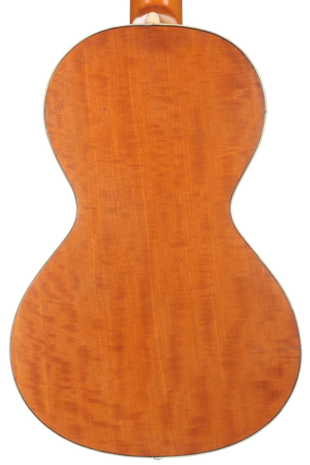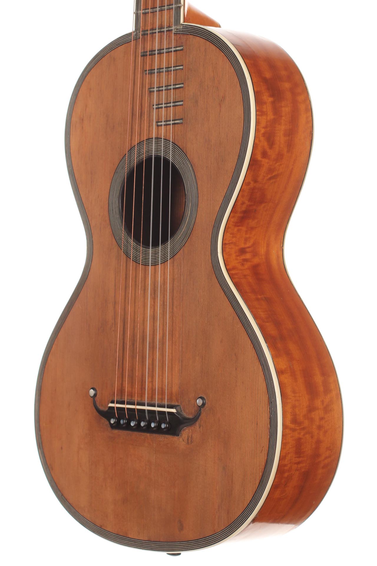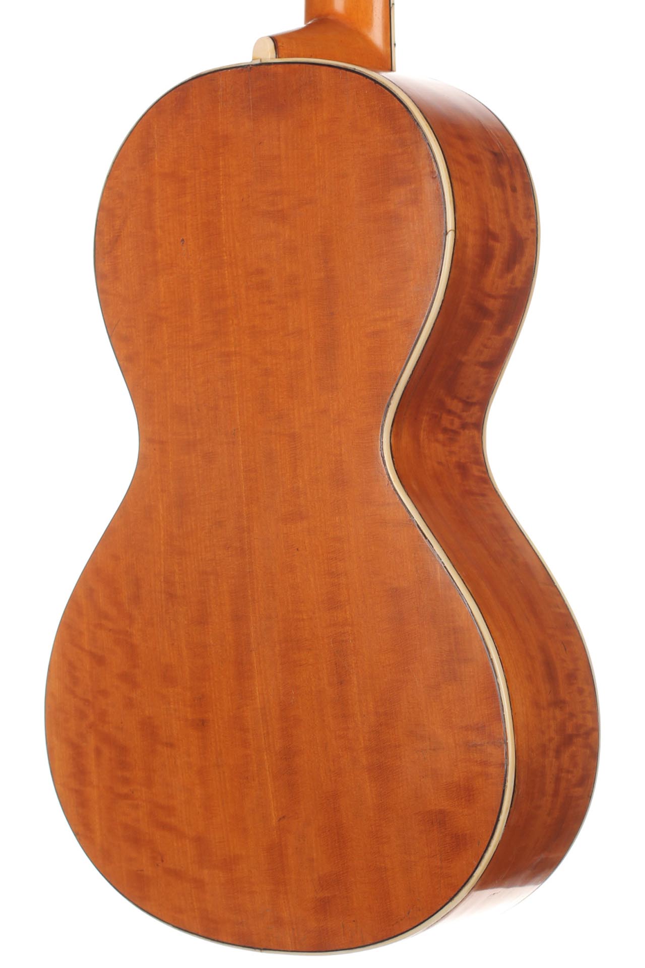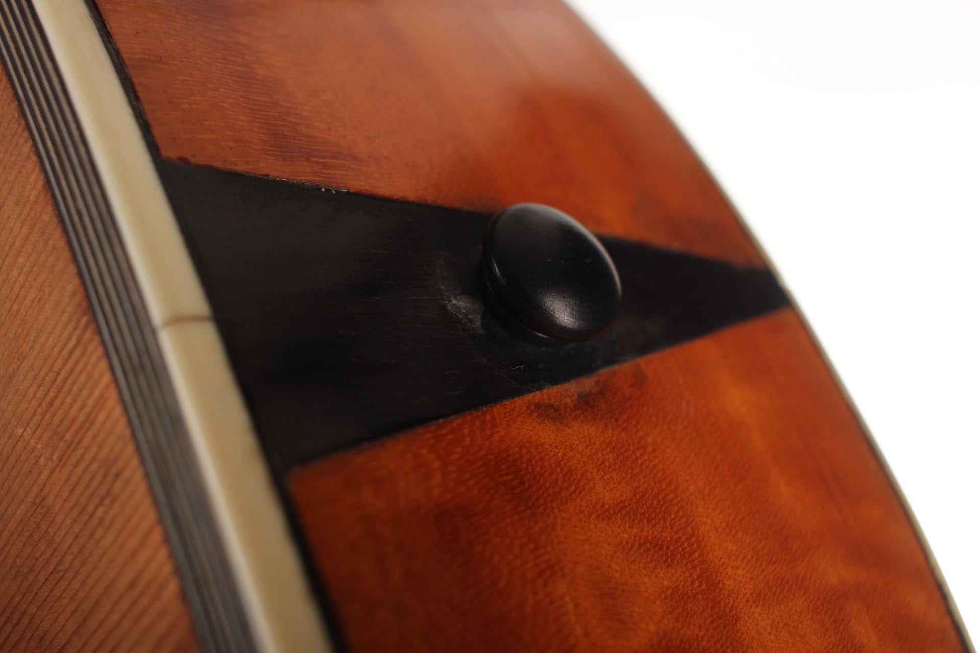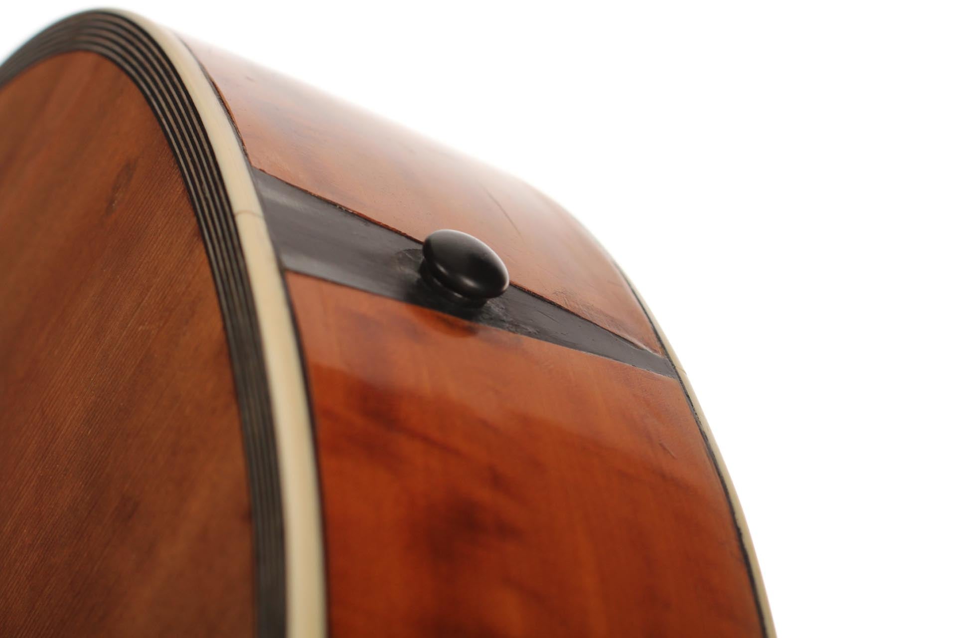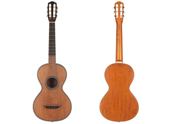 Seine Verbesserungen fanden durch intensive Kollaborationen mit berühmten Gitarristen wie Sor, Aguado, Carulli, Giuliani e Coste, statt. Im Jahr 1839 und 1844 gewann Lacôte Preise für seine Gitarren bei den "Expositions Universelles de Paris". Mit seiner Werkstatt war er öfters an verschiedene Orte umgezogen, aber immer im gleichen Viertel wo auch seine Kollegen arbeiteten und wo sich auch das Konservatorium befand. Um 1819 übernahm er die Werkstatt seines Kollegen Martin. Um 1823 arbeitete er in der "Rue Neuve St-Eustache" und um 1833 in der "Place des Victoires" wo er bis zum 15. April 1829 verblieb um danach in die "Rue de Richelieu" umzuziehen. Weitere Adressen lauten: - Rue de Gramont (ca. 1832) - Rue de Louvois (ca.1834) - Rue des Martyrs (ca. 1850-1868). Diese Gitarre von René Lacôte wurde für den Händler Bernardel im Jahre 1840 gebaut. Der Boden besteht aus Satinwood and ist mit Fichte laminiert. Die Zargen sind aus massivem Zitronenholz. Der Hals besteht aus massivem Ahorn. Die Meachniken sind aus der selben Zeit wurden jedoch ersetzt. Insgesamt befindet sich die Gitarre in sehr gutem Zustand.