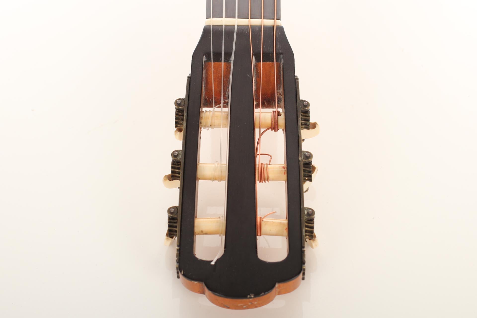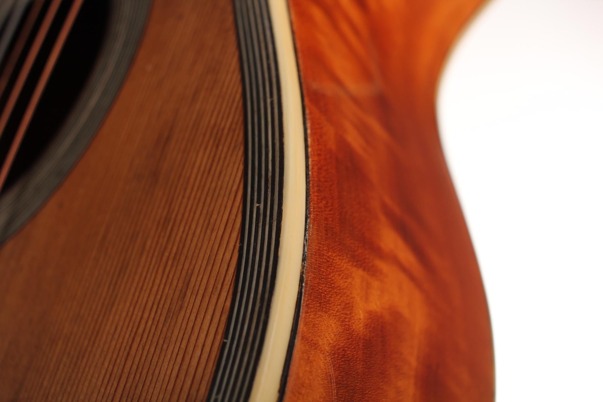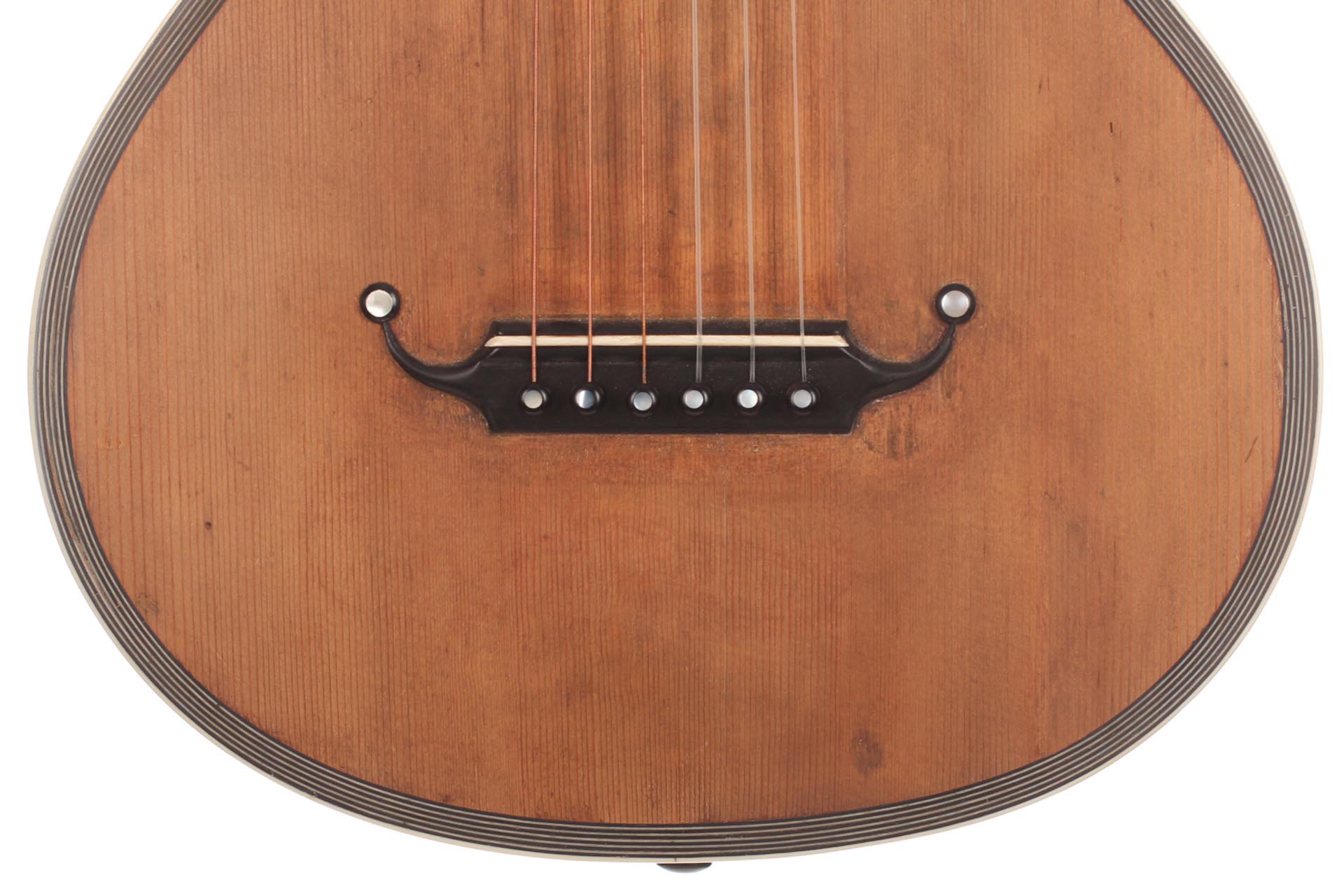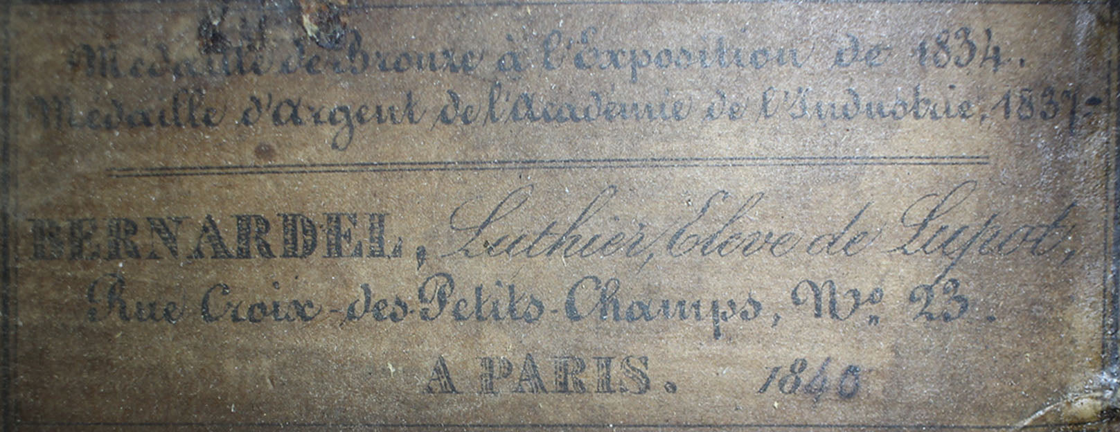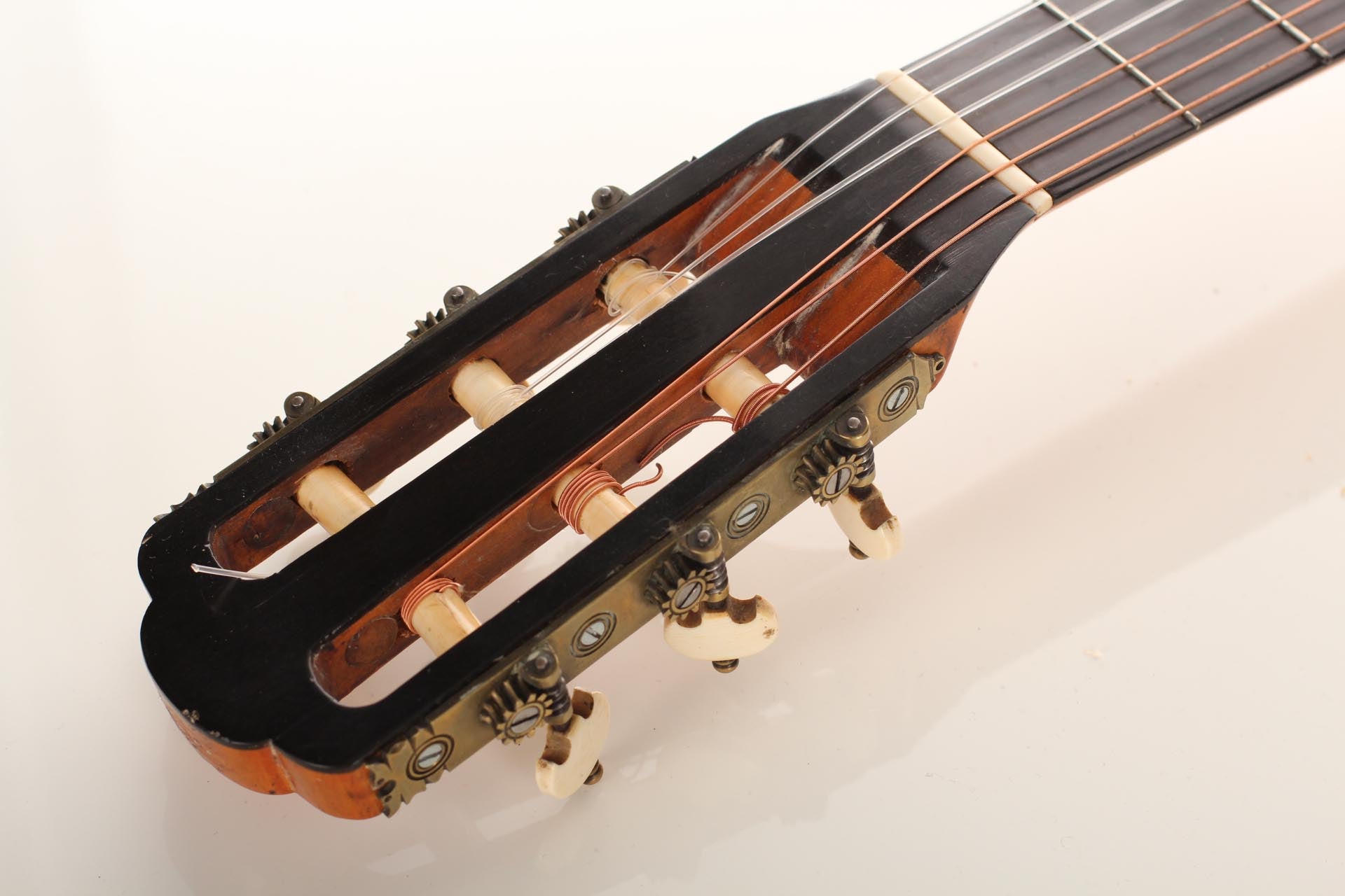 Seine Verbesserungen fanden durch intensive Kollaborationen mit berühmten Gitarristen wie Sor, Aguado, Carulli, Giuliani e Coste, statt. Im Jahr 1839 und 1844 gewann Lacôte Preise für seine Gitarren bei den "Expositions Universelles de Paris". Mit seiner Werkstatt war er öfters an verschiedene Orte umgezogen, aber immer im gleichen Viertel wo auch seine Kollegen arbeiteten und wo sich auch das Konservatorium befand. Um 1819 übernahm er die Werkstatt seines Kollegen Martin. Um 1823 arbeitete er in der "Rue Neuve St-Eustache" und um 1833 in der "Place des Victoires" wo er bis zum 15. April 1829 verblieb um danach in die "Rue de Richelieu" umzuziehen. Weitere Adressen lauten: - Rue de Gramont (ca. 1832) - Rue de Louvois (ca.1834) - Rue des Martyrs (ca. 1850-1868). Diese Gitarre von René Lacôte wurde für den Händler Bernardel im Jahre 1840 gebaut. Der Boden besteht aus Satinwood and ist mit Fichte laminiert. Die Zargen sind aus massivem Zitronenholz. Der Hals besteht aus massivem Ahorn. Die Meachniken sind aus der selben Zeit wurden jedoch ersetzt. Insgesamt befindet sich die Gitarre in sehr gutem Zustand.