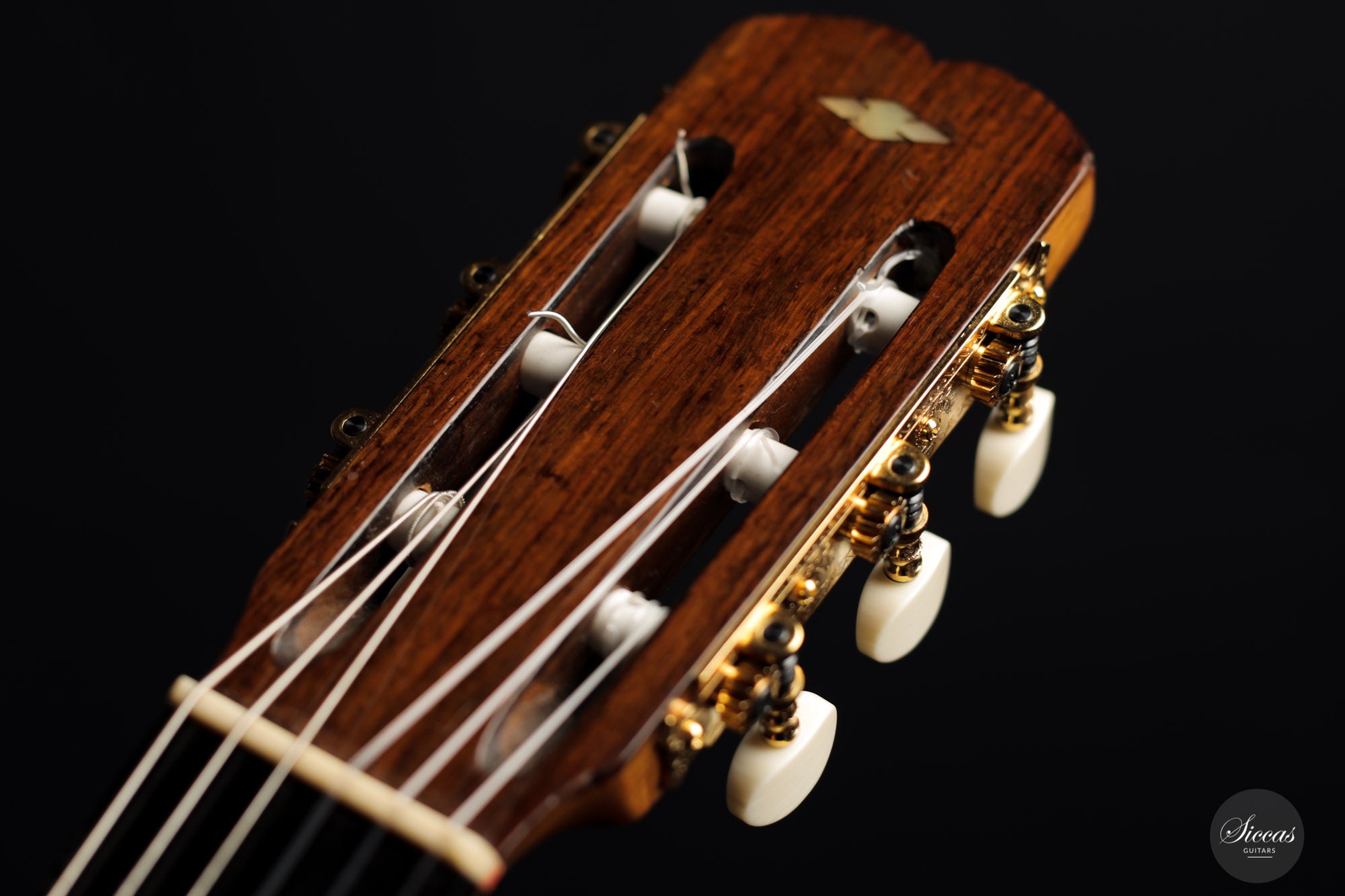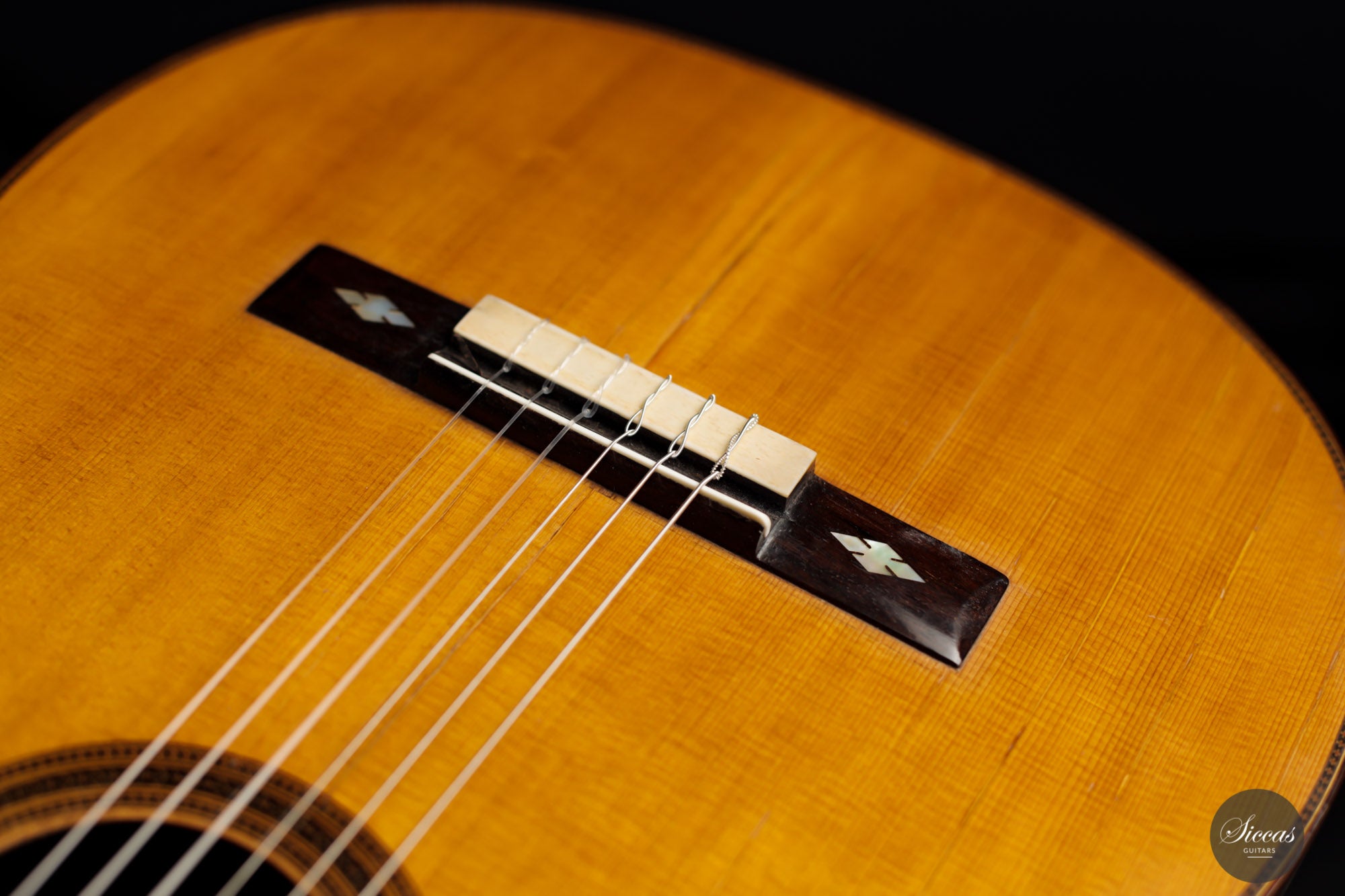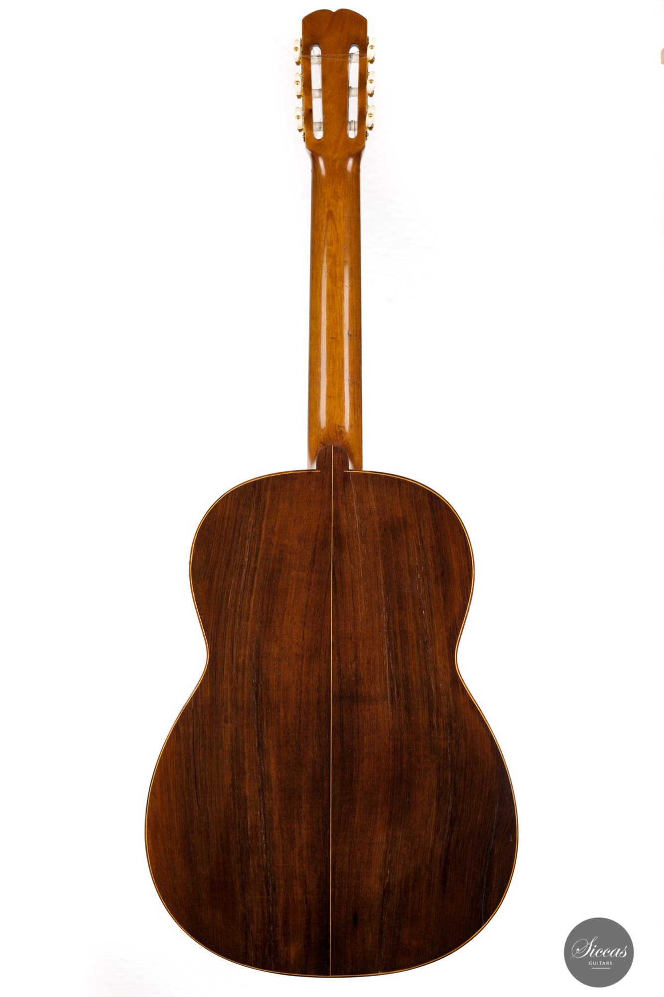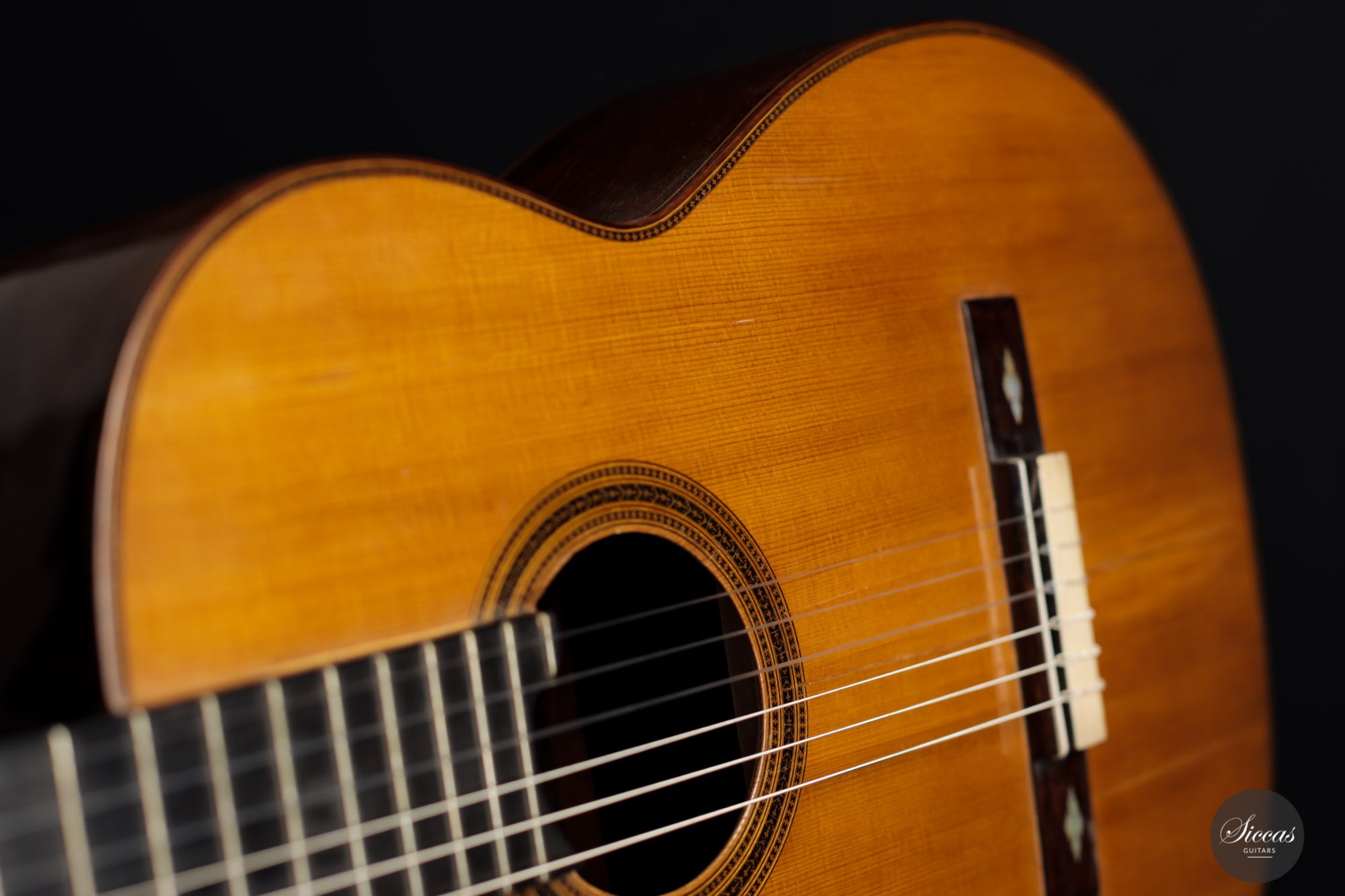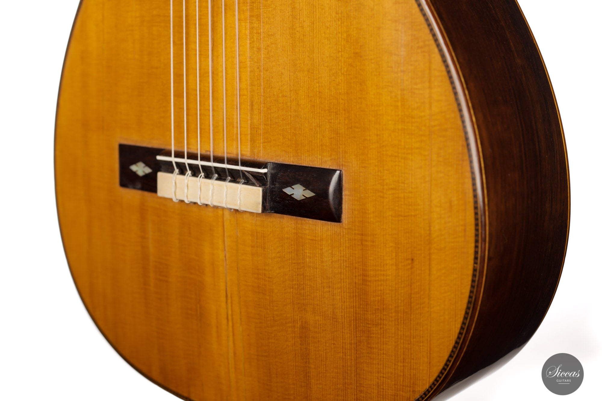 Diese Gitarre wurde von Ricardo Sanchis Nacher (1881-1960) gebaut und ist historisch gesehen hochinteressant, da sie gleichartig ist mit der letzten Gitarre, die Agustin Barrios von Ricardo Sanchis Nacher erwarb. Es ist ein wunderbares Instrument, das durch seine Ausgeglichenheit, einem schönen spanischen Ton, gute Bässe und Volumen charakterisiert ist. Die Gitarre wurde zwischen 1930 und 1940 gebaut. Sie hat eine Fichtendecke und der Boden sowie die Zargen sind aus feinstem Palisander. Der Kopf und der Steg sind mit Perlmutteinlagen verziert und eine reichlich verzierte Rosette ziert das Schallloch. Die Gitarre wurde sehr gut restauriert, sodass sein Ursprünglichkeit erhalten werden konnte. Die Mechaniken sind von Rubner.